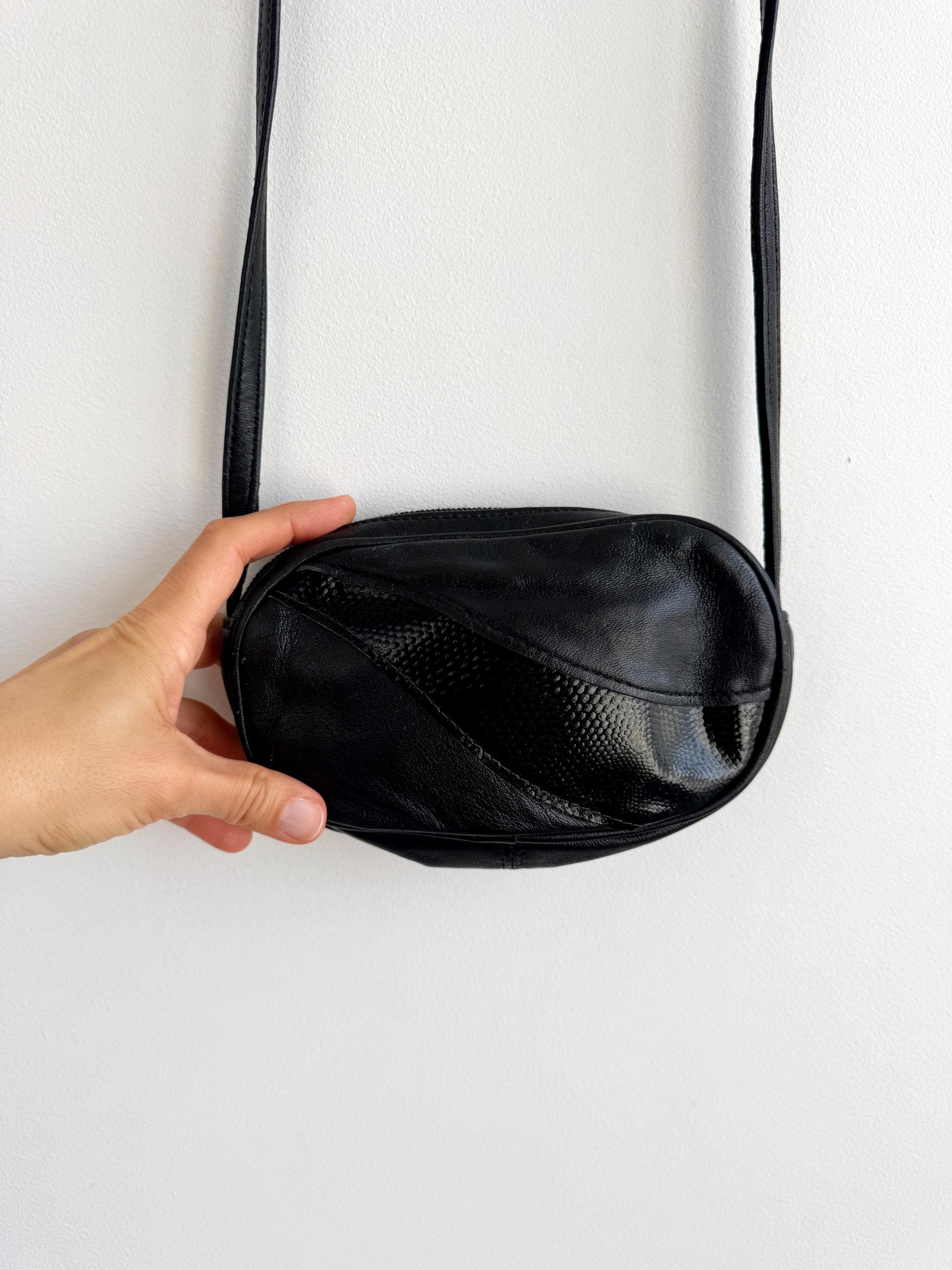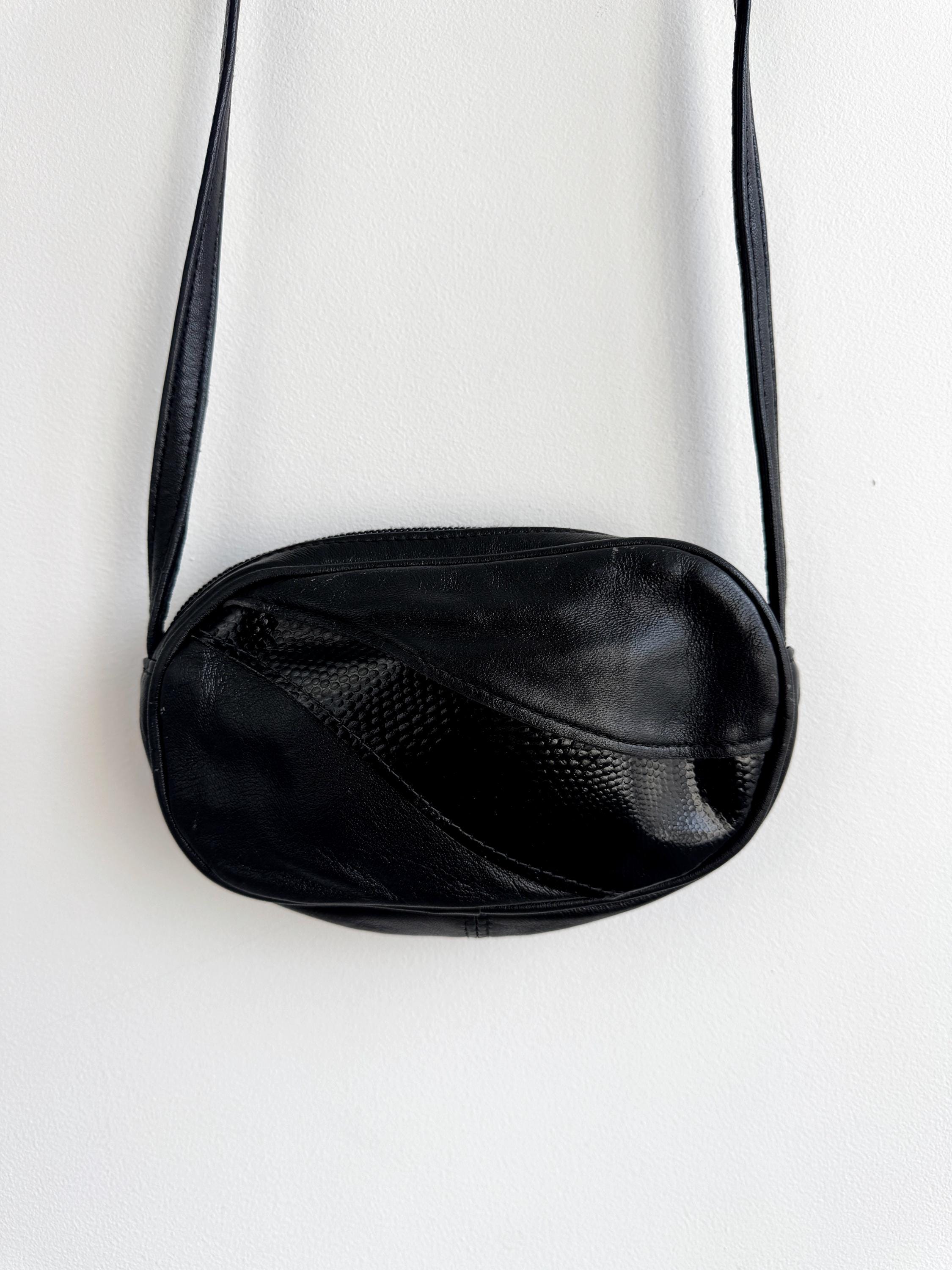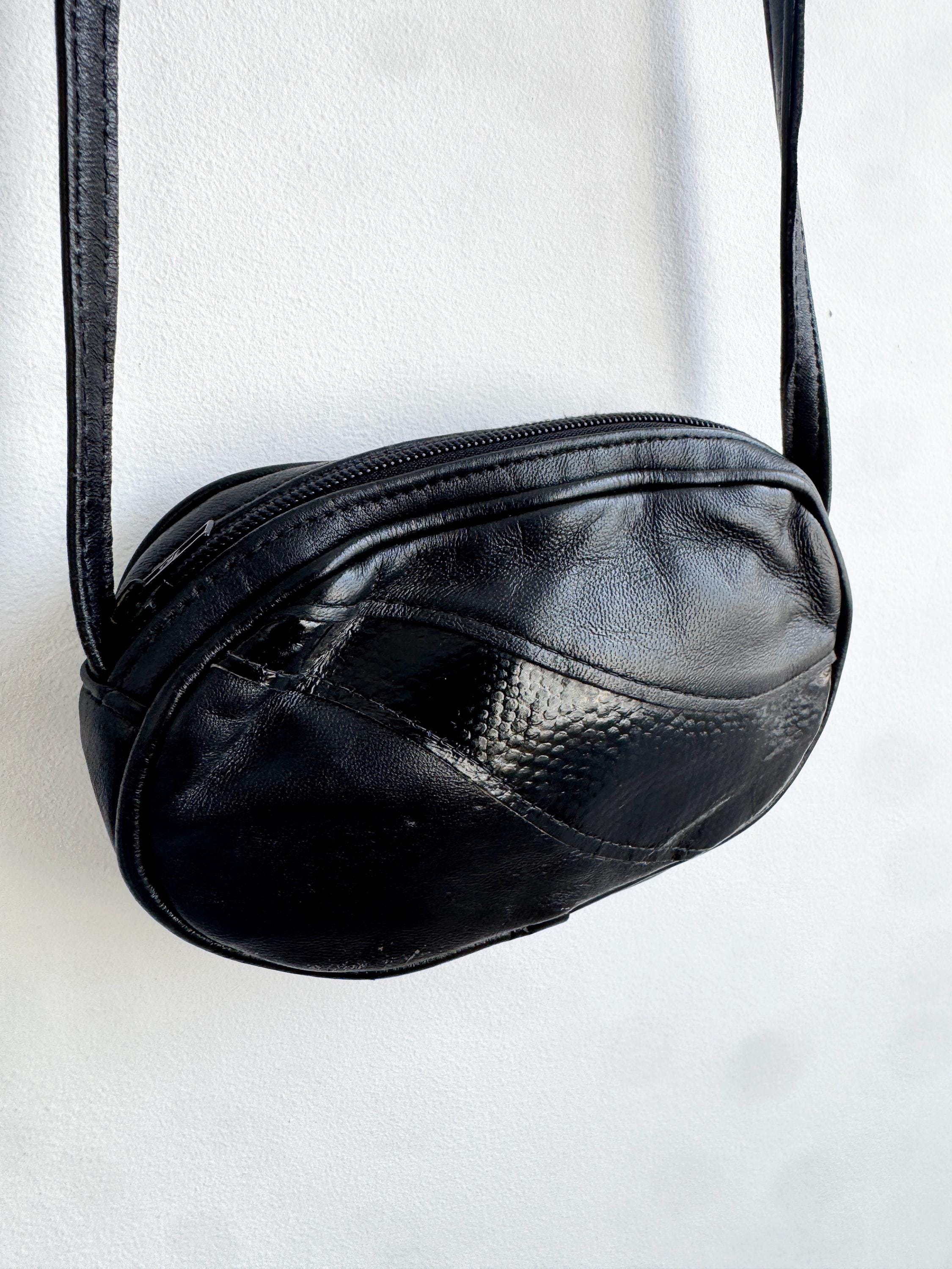 This classic black leather oval crossbody bag is a versatile staple for any vintage lover's wardrobe. Featuring a unique paneled design with a glossy faux-reptile accent, this small purse strikes the perfect balance between minimalist chic and subtle retro texture. Its compact, rounded silhouette makes it an ideal choice for carrying your essentials—phone, cards, and keys—while keeping your outfit streamlined.