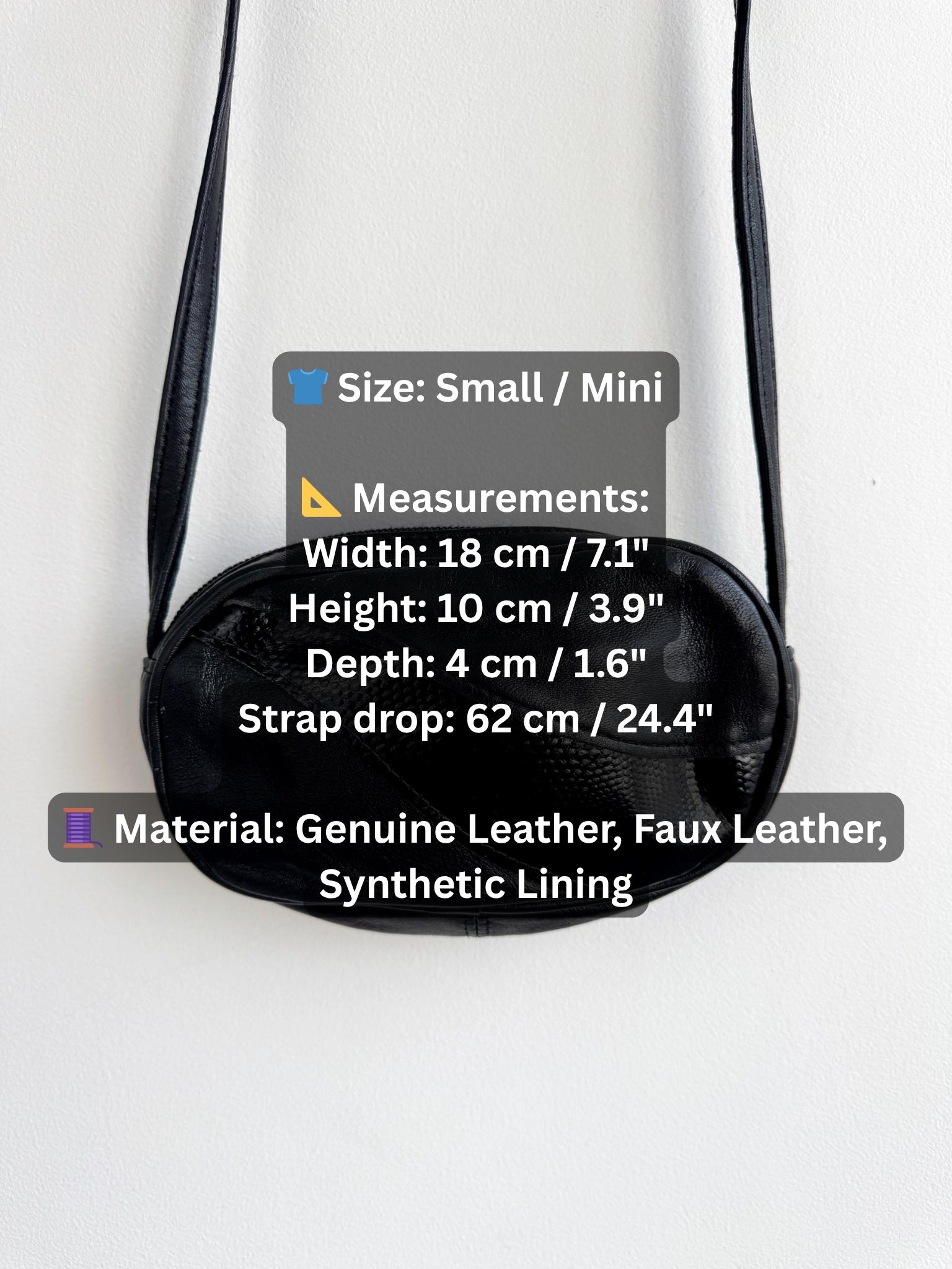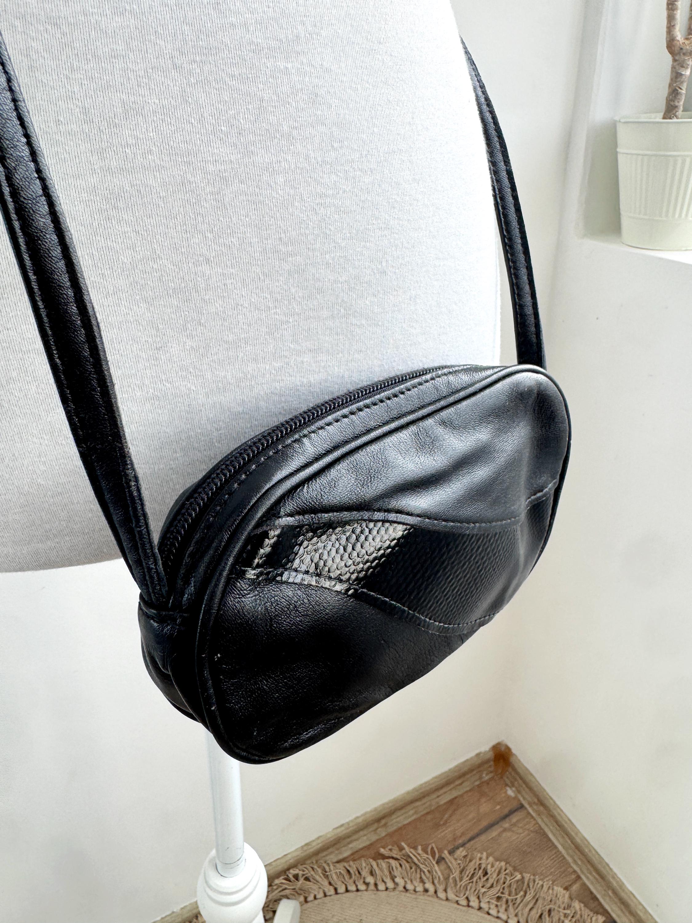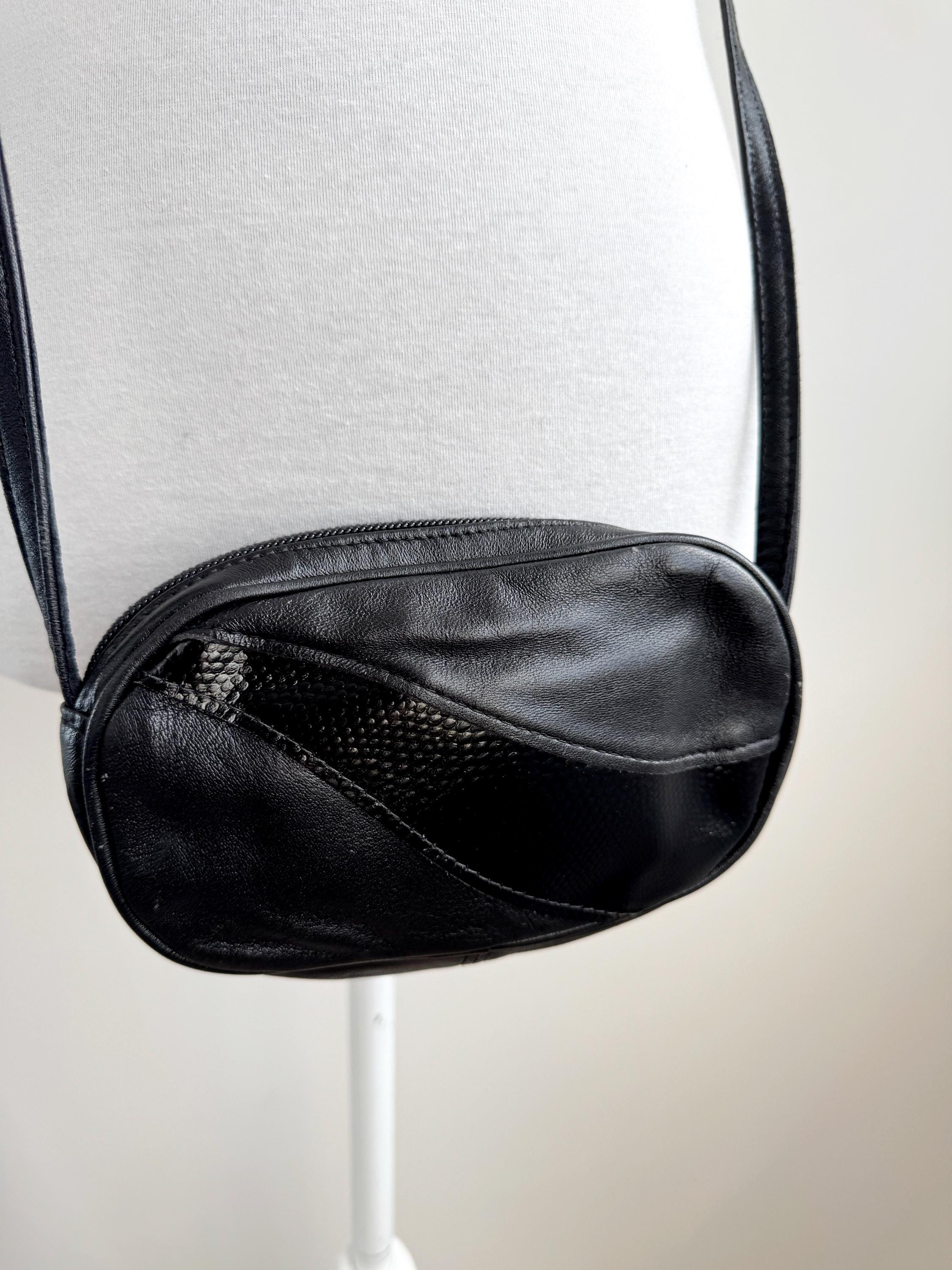 This classic black leather oval crossbody bag is a versatile staple for any vintage lover's wardrobe. Featuring a unique paneled design with a glossy faux-reptile accent, this small purse strikes the perfect balance between minimalist chic and subtle retro texture. Its compact, rounded silhouette makes it an ideal choice for carrying your essentials—phone, cards, and keys—while keeping your outfit streamlined.