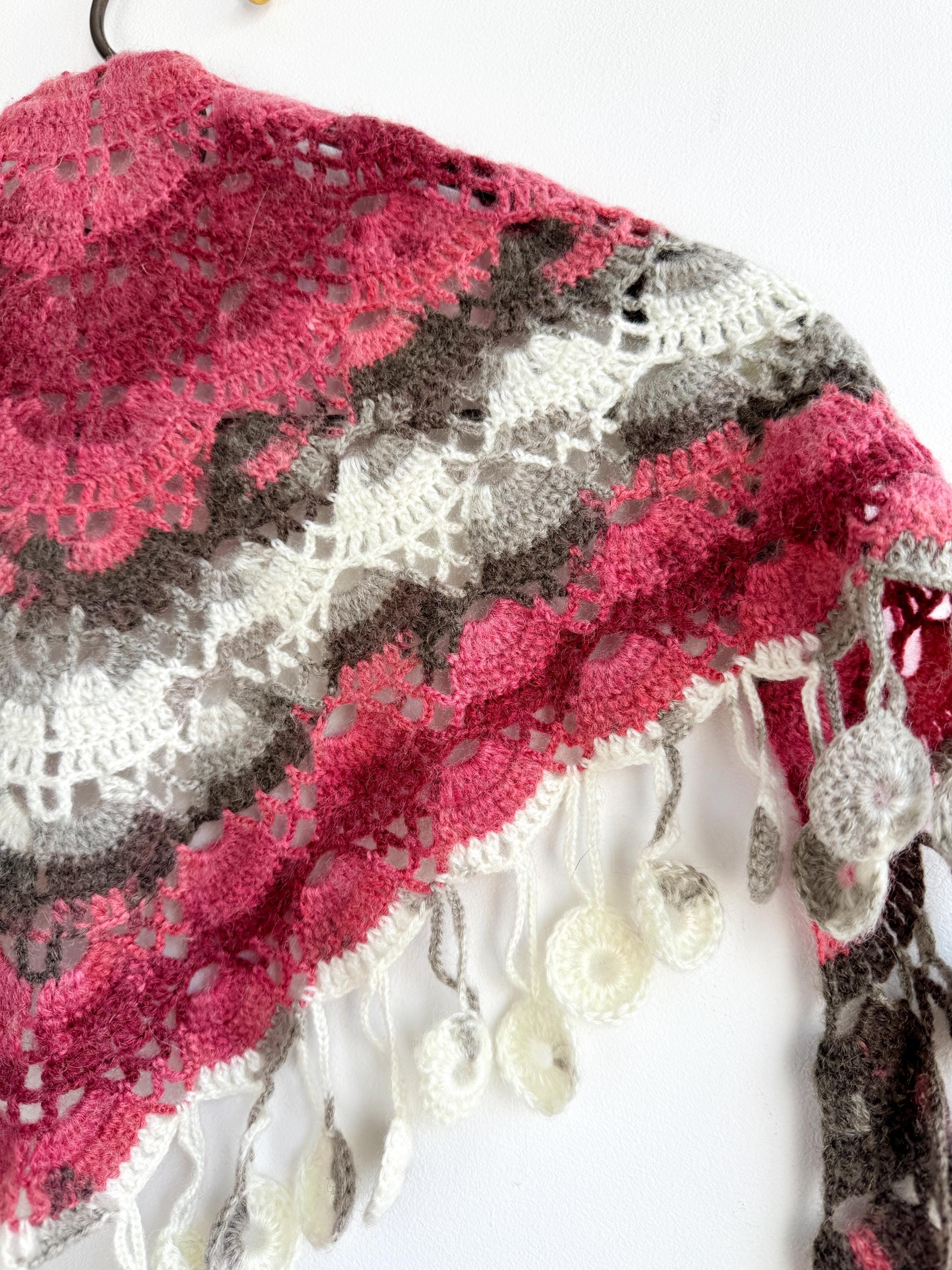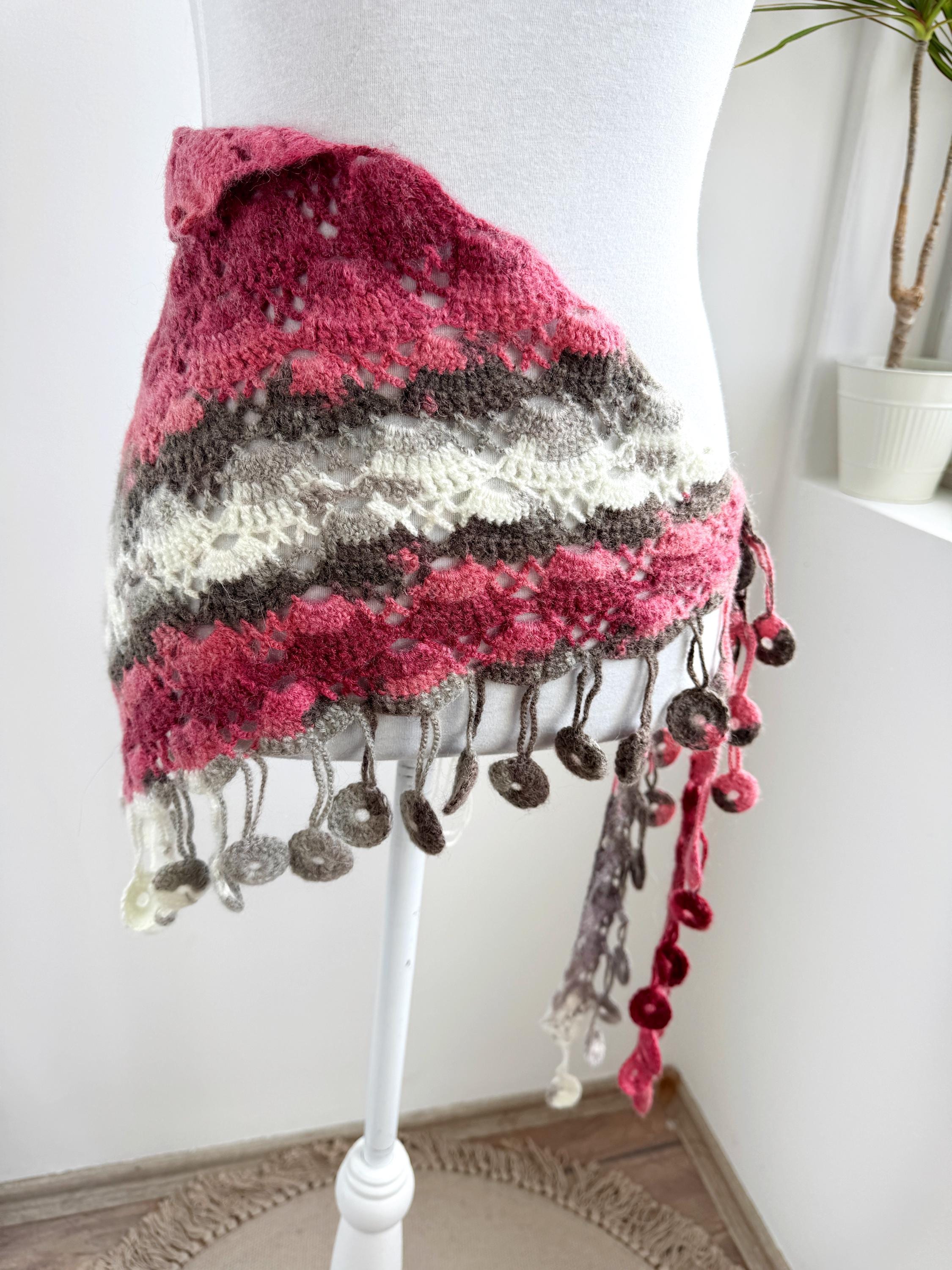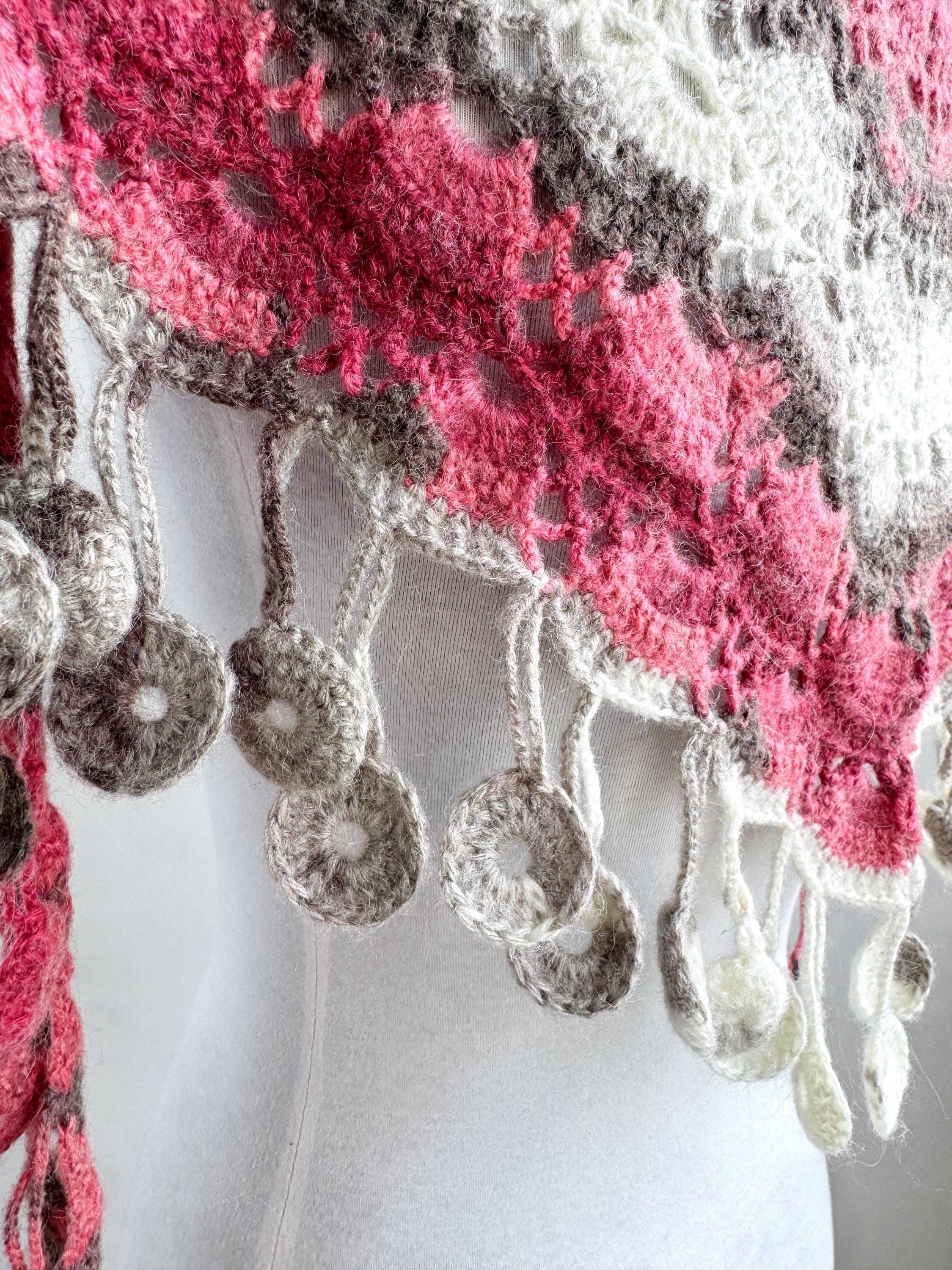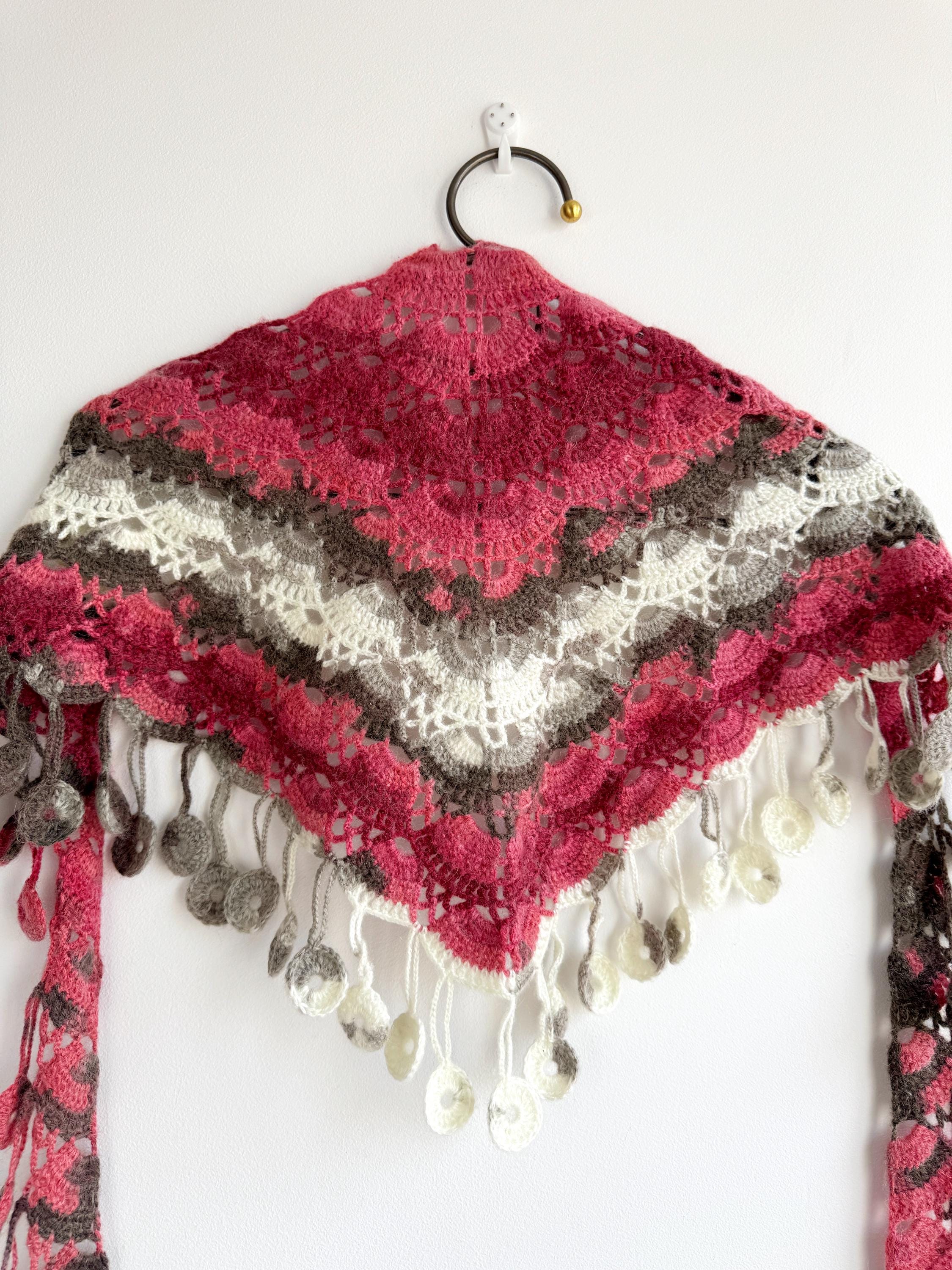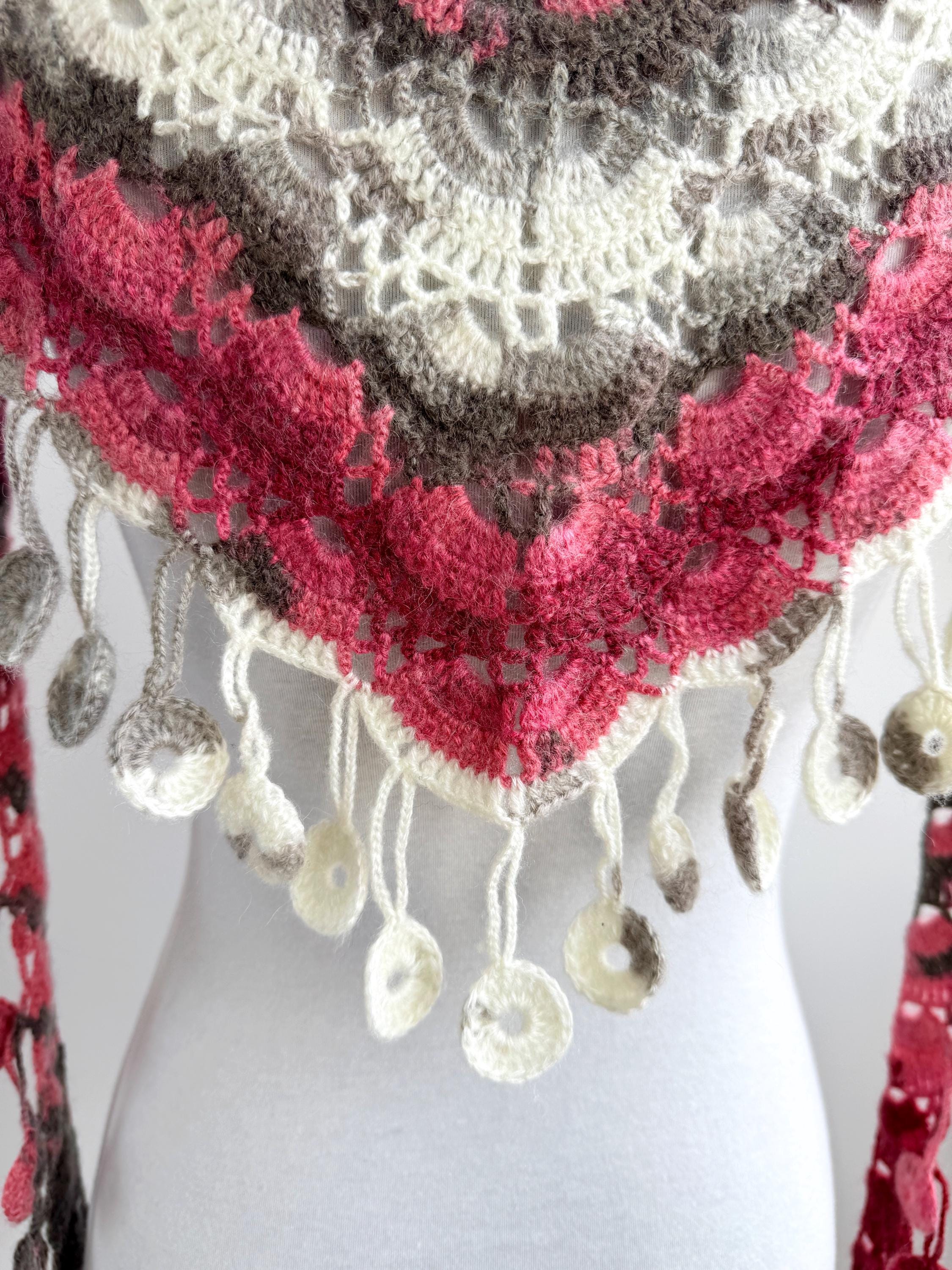 This stunning Y2K handmade crochet triangle shawl is a true labor of love — a wearable piece of art that effortlessly blends bohemian spirit with timeless craftsmanship. Worked in a gorgeous palette of dusty rose, deep berry, warm taupe, soft gray, and creamy ivory, this shawl features intricate lace stitch patterning with beautiful open lacework throughout. The real showstopper? The whimsical handmade coin fringe — dozens of tiny crocheted circles in matching colors cascade along all three edges, catching the light and movement with every step.