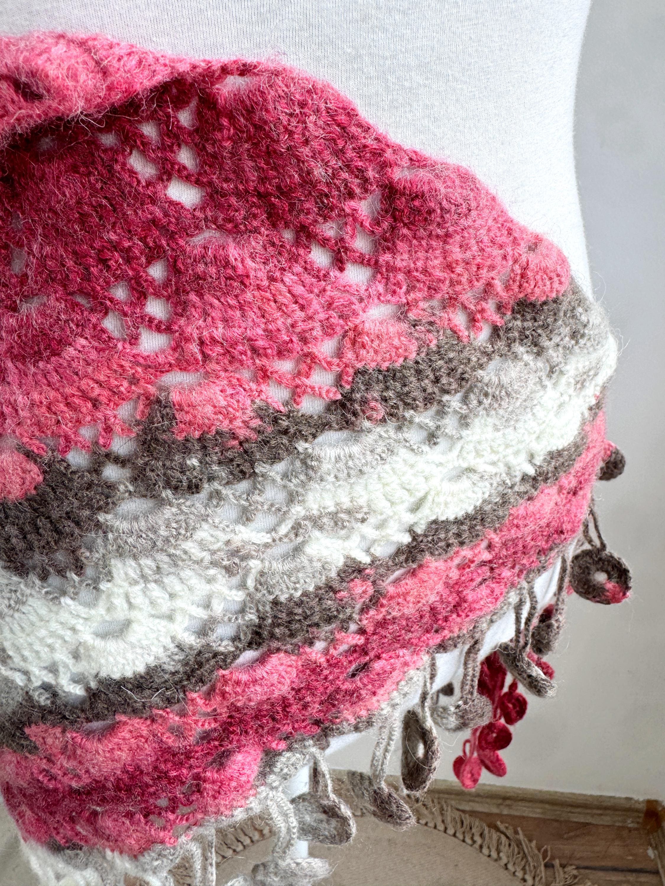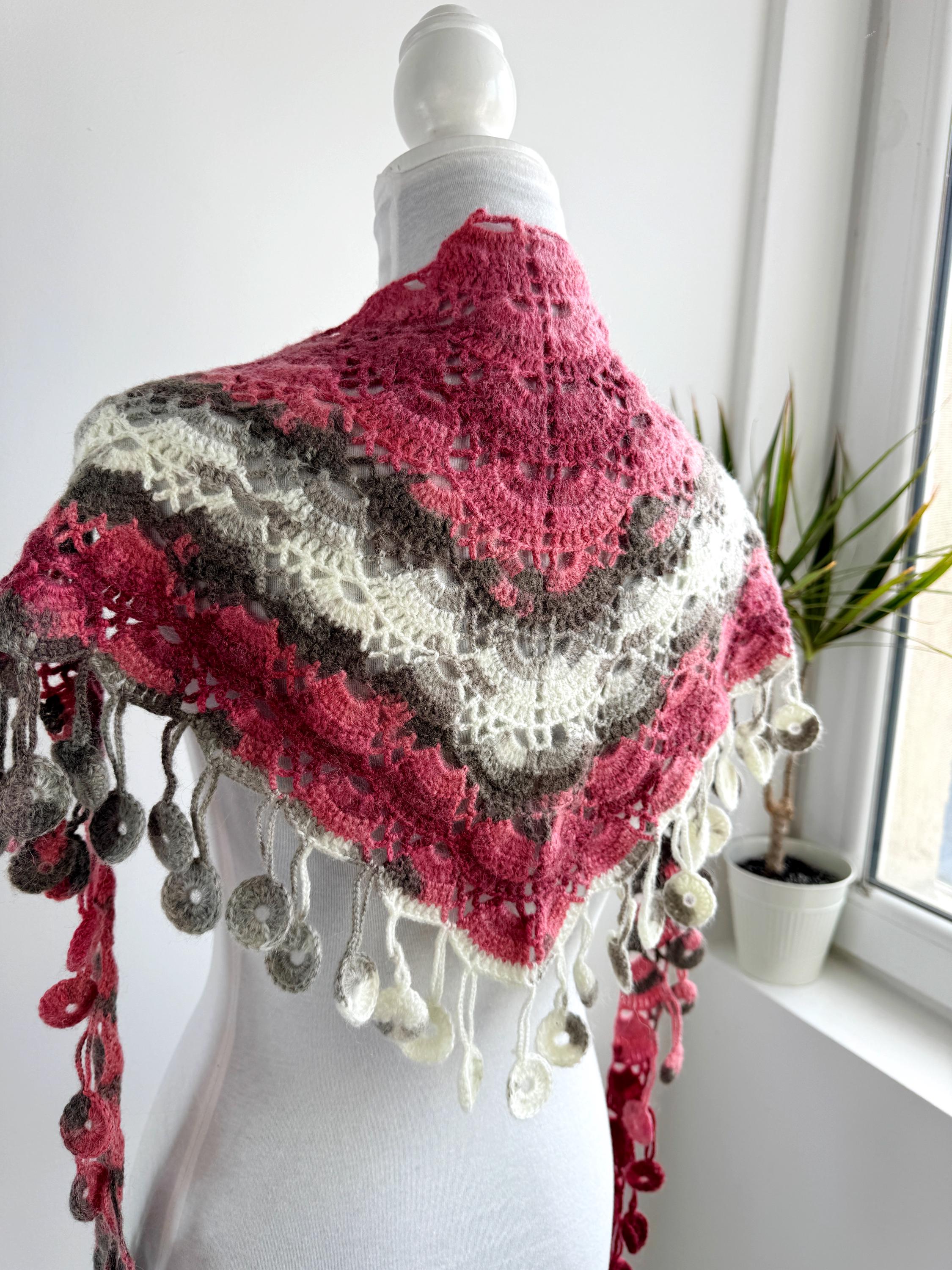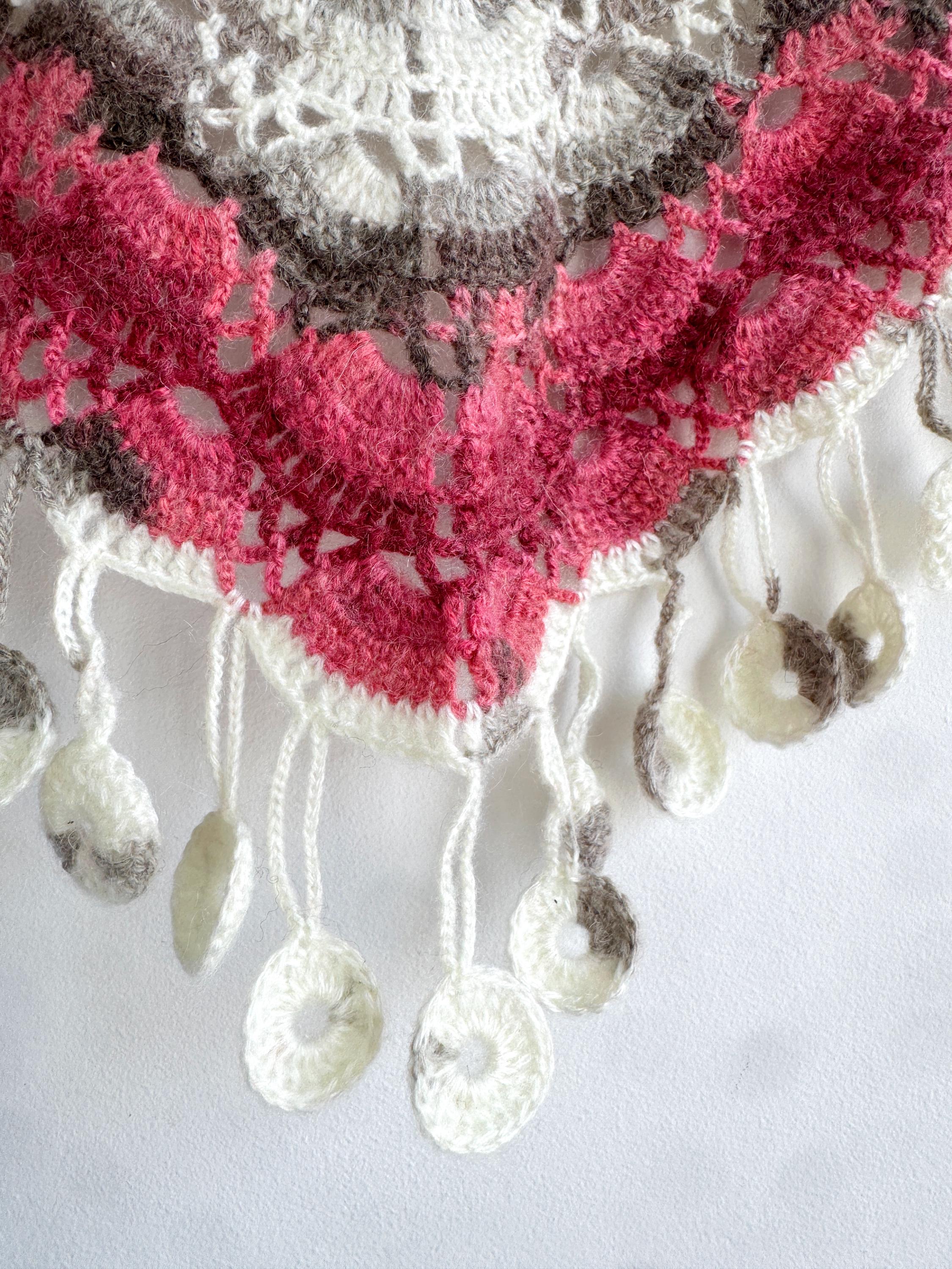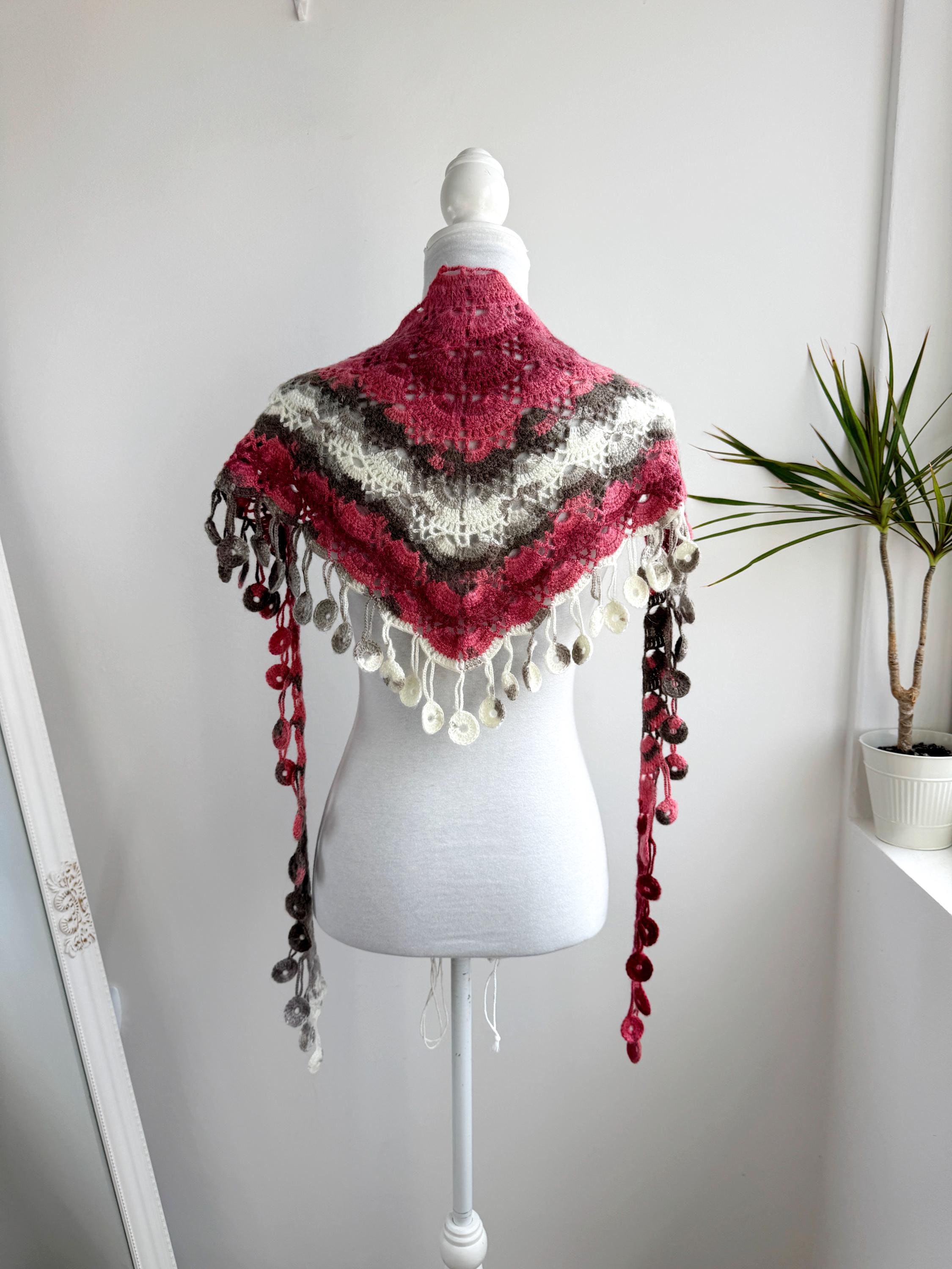 This stunning Y2K handmade crochet triangle shawl is a true labor of love — a wearable piece of art that effortlessly blends bohemian spirit with timeless craftsmanship. Worked in a gorgeous palette of dusty rose, deep berry, warm taupe, soft gray, and creamy ivory, this shawl features intricate lace stitch patterning with beautiful open lacework throughout. The real showstopper? The whimsical handmade coin fringe — dozens of tiny crocheted circles in matching colors cascade along all three edges, catching the light and movement with every step.