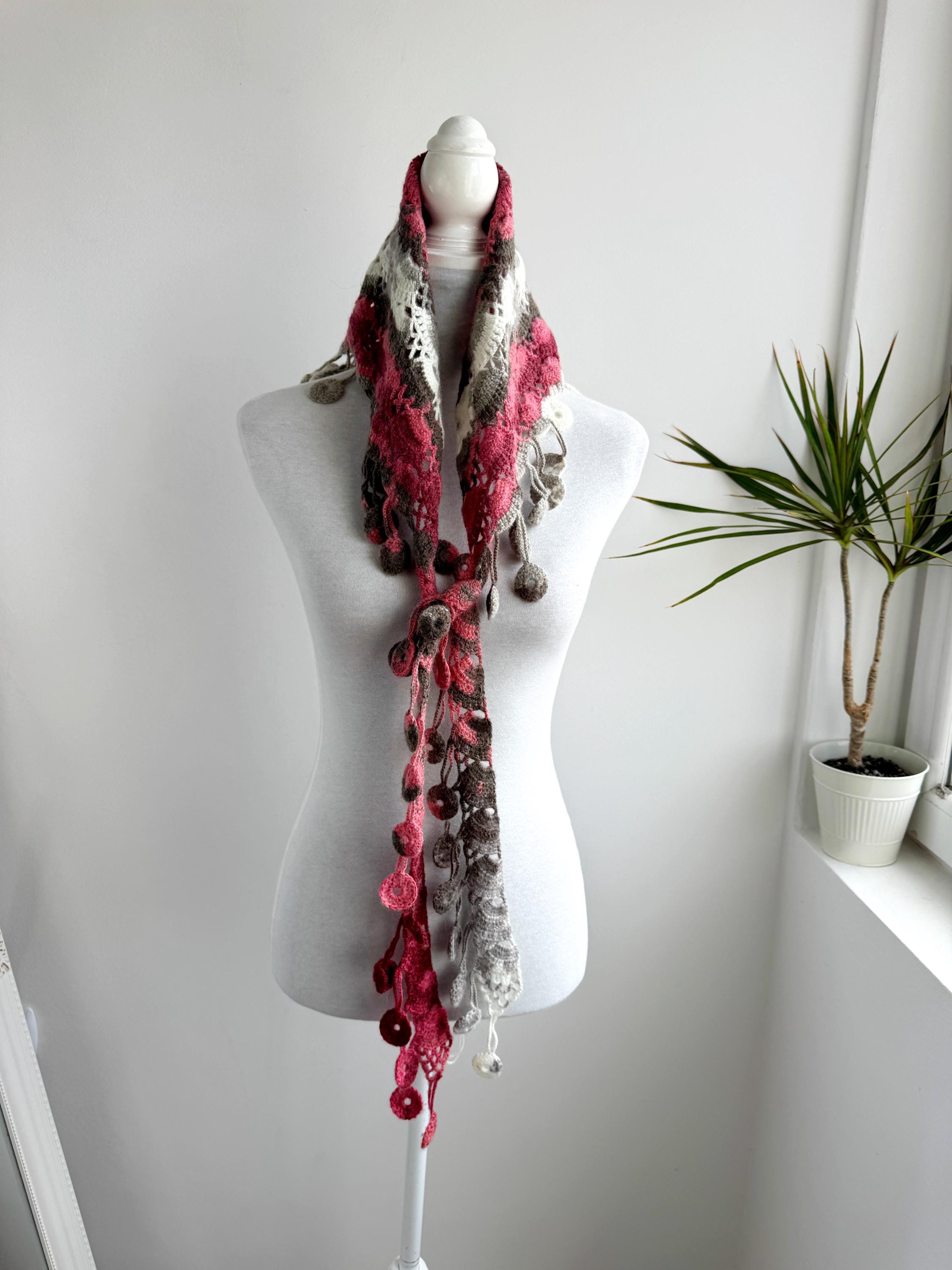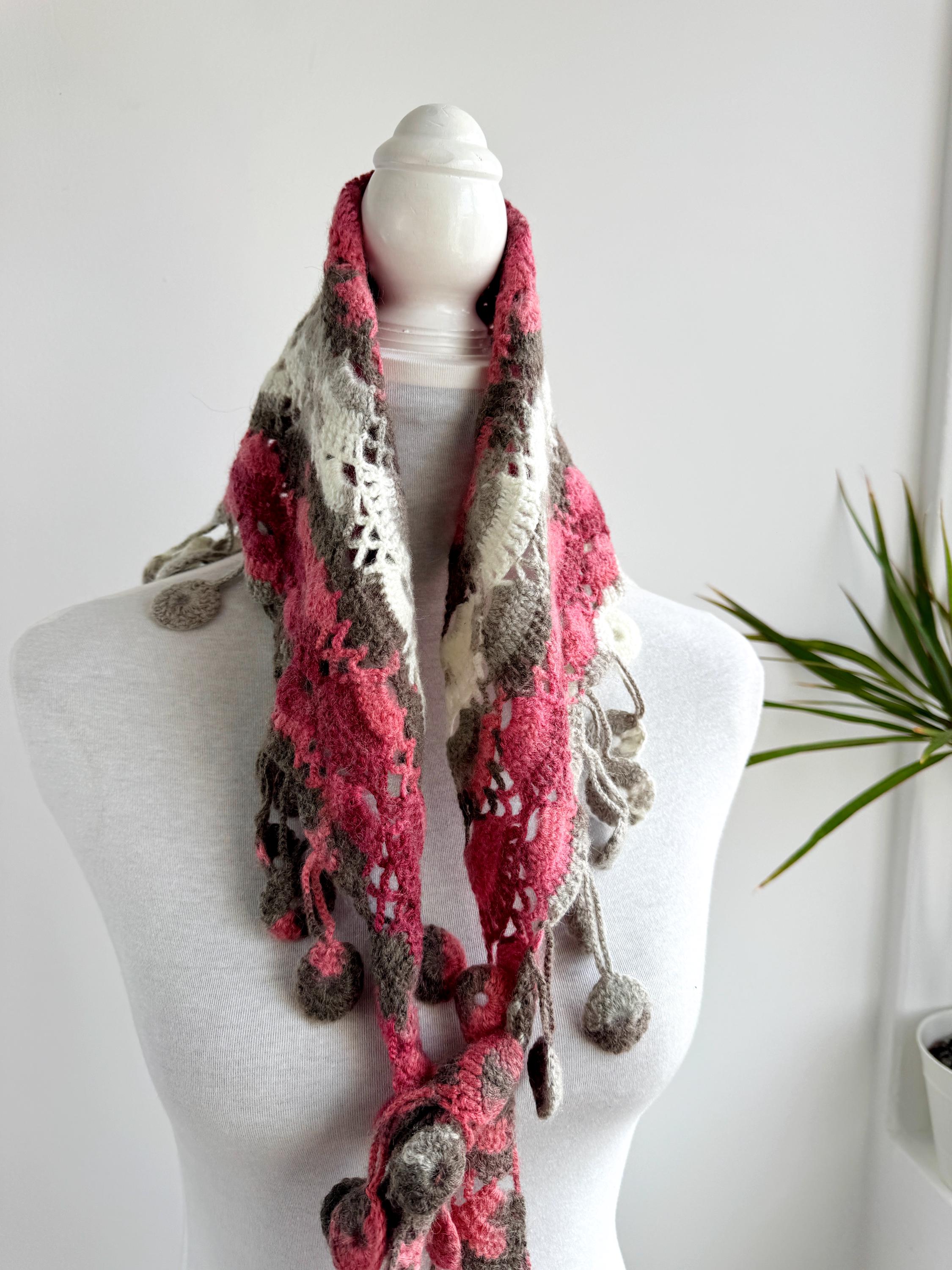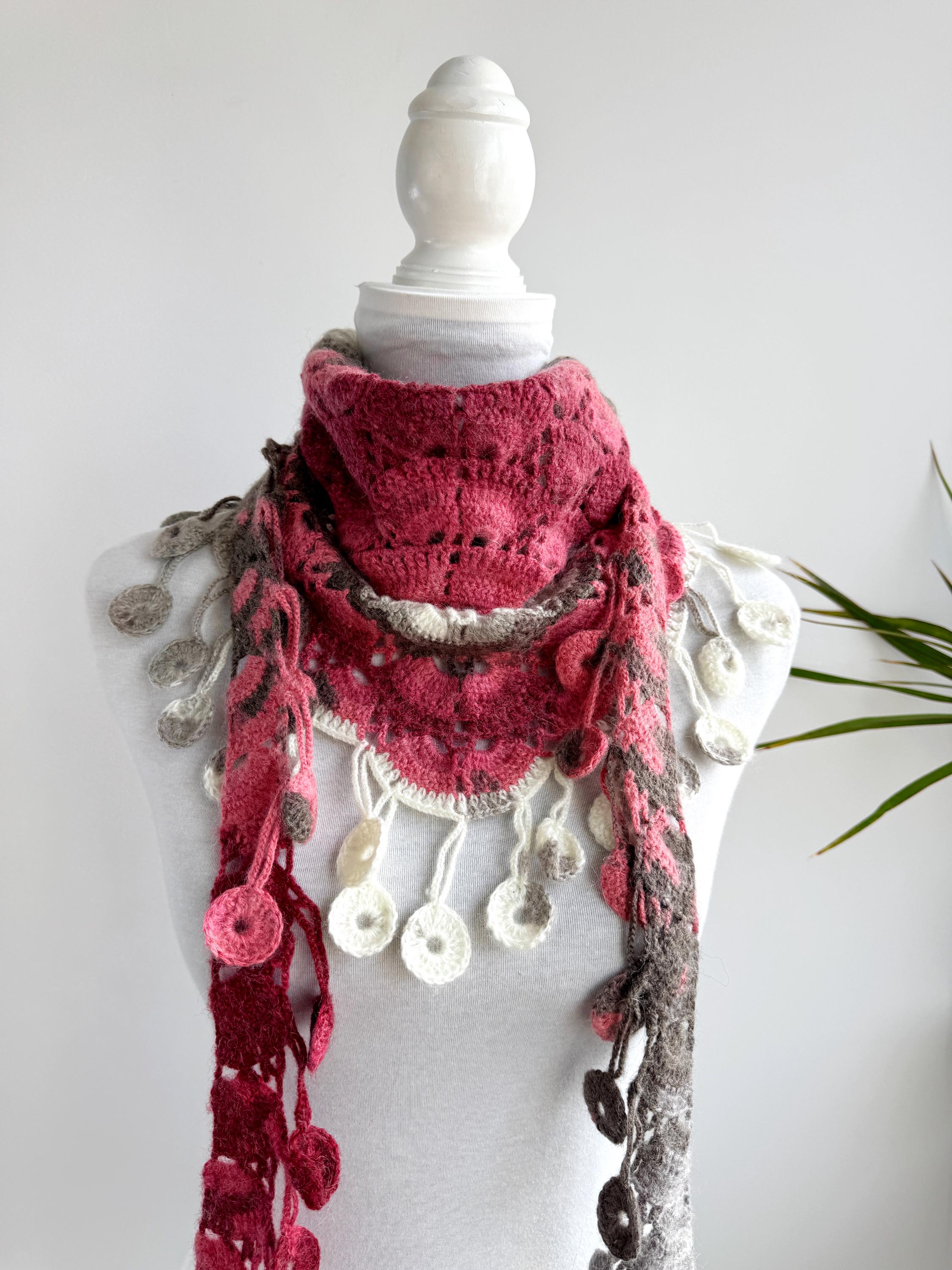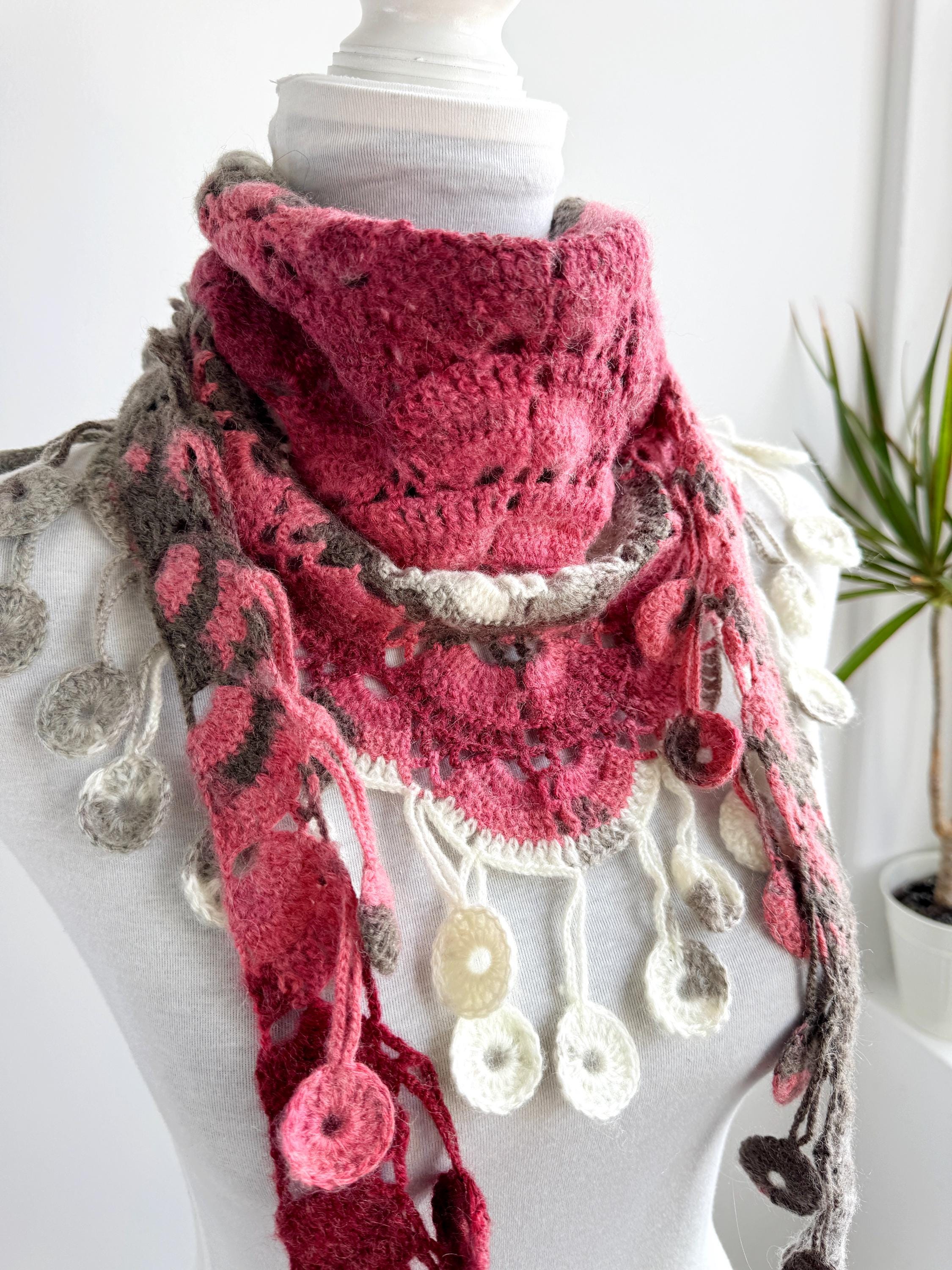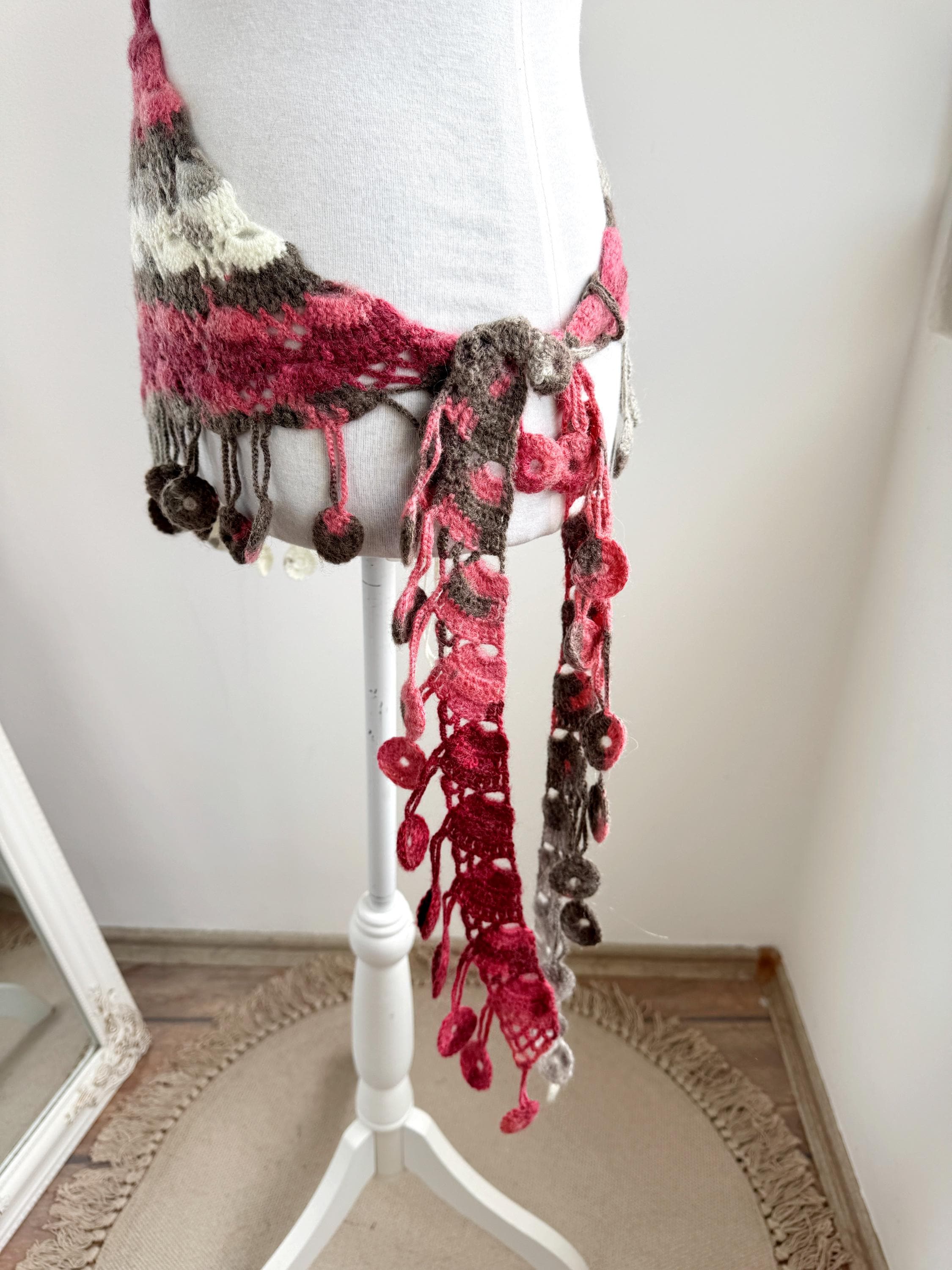 This stunning Y2K handmade crochet triangle shawl is a true labor of love — a wearable piece of art that effortlessly blends bohemian spirit with timeless craftsmanship. Worked in a gorgeous palette of dusty rose, deep berry, warm taupe, soft gray, and creamy ivory, this shawl features intricate lace stitch patterning with beautiful open lacework throughout. The real showstopper? The whimsical handmade coin fringe — dozens of tiny crocheted circles in matching colors cascade along all three edges, catching the light and movement with every step.
