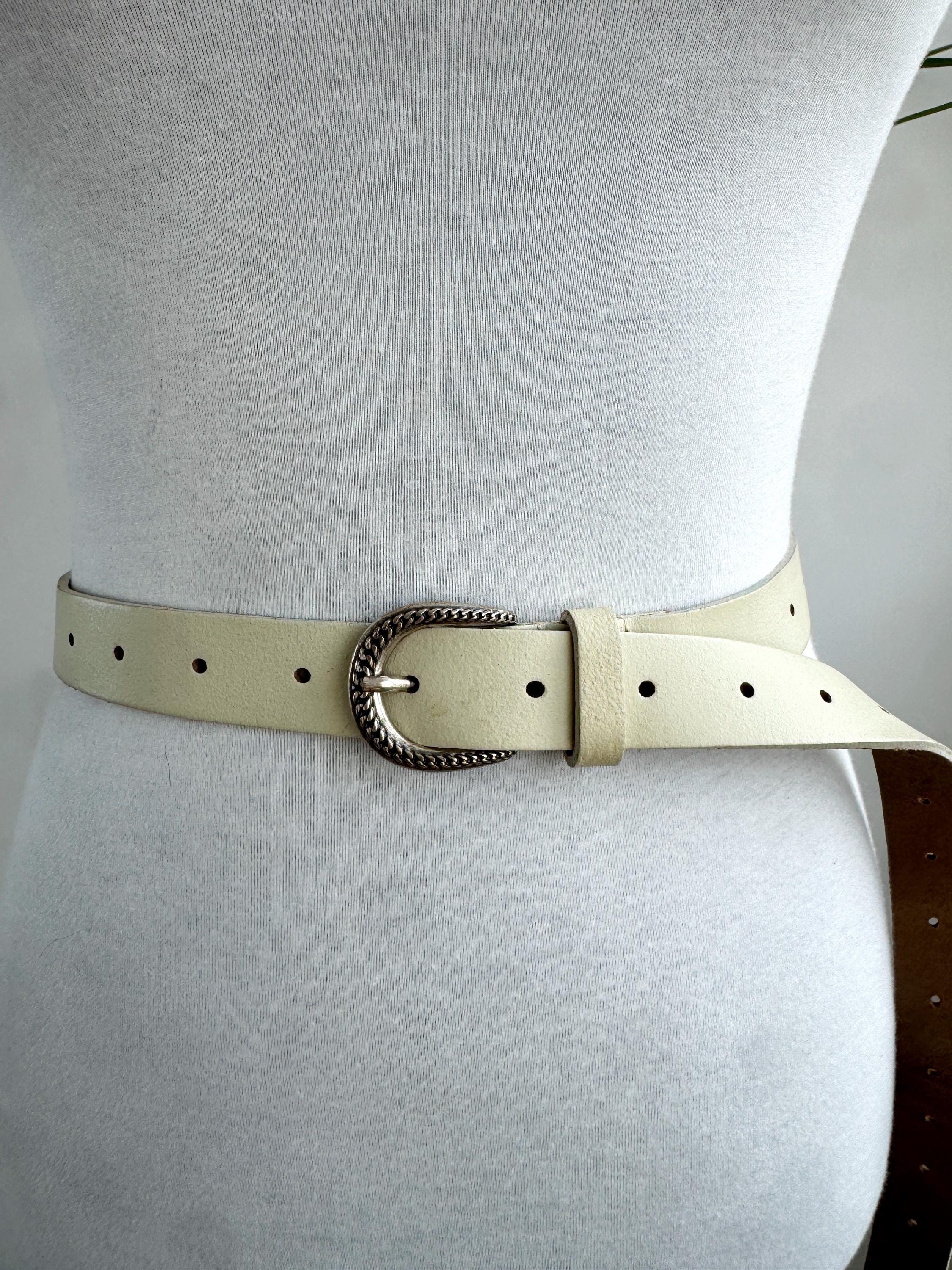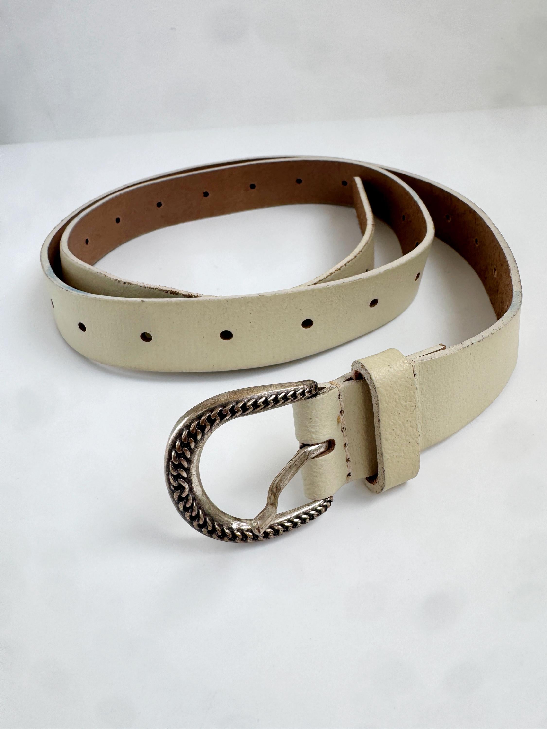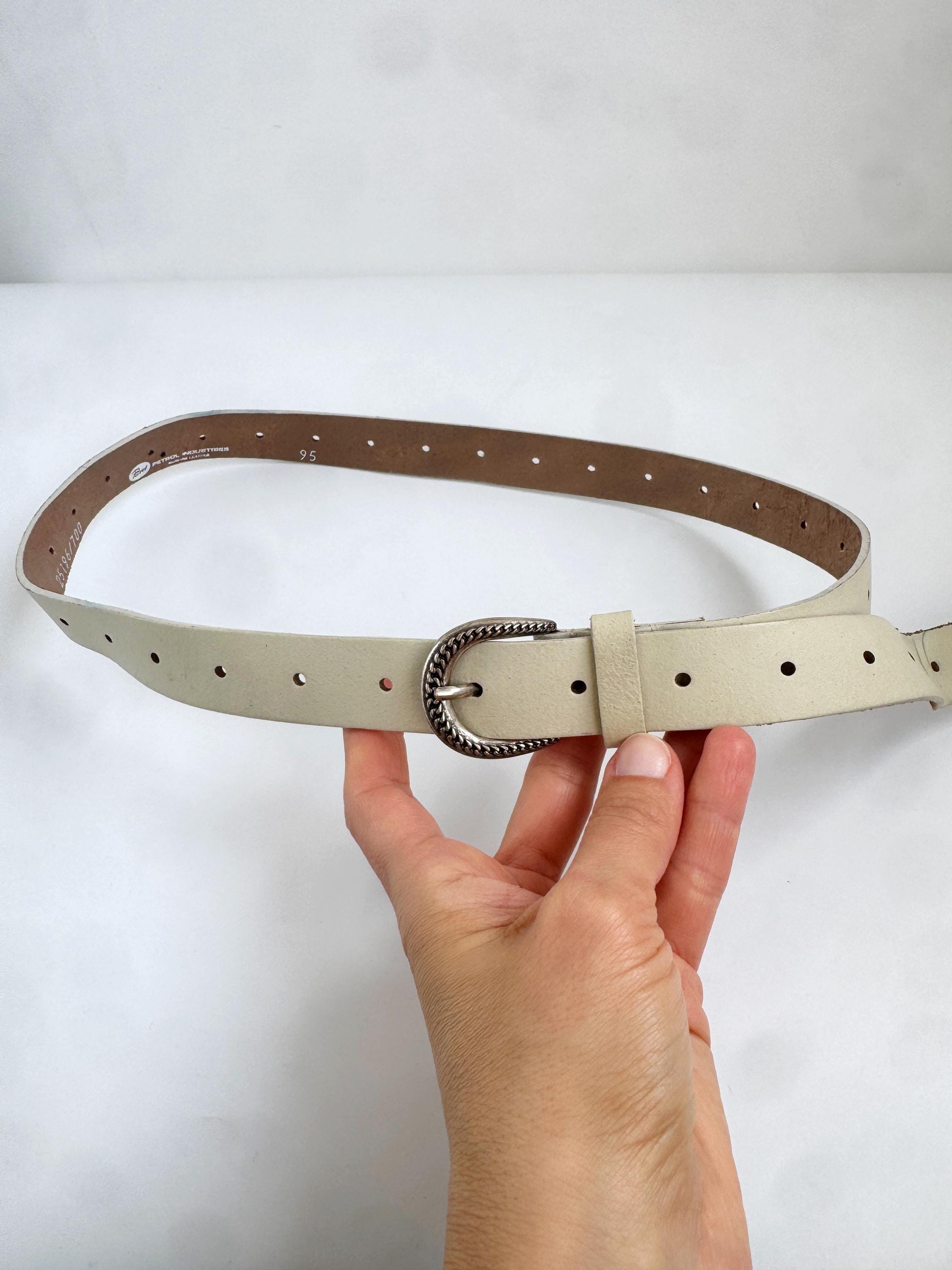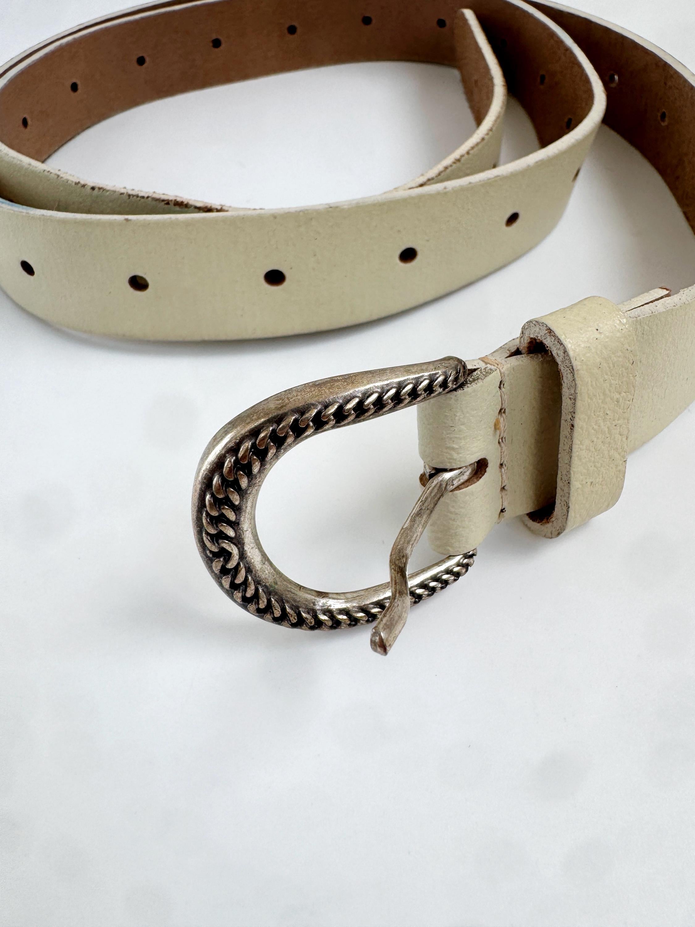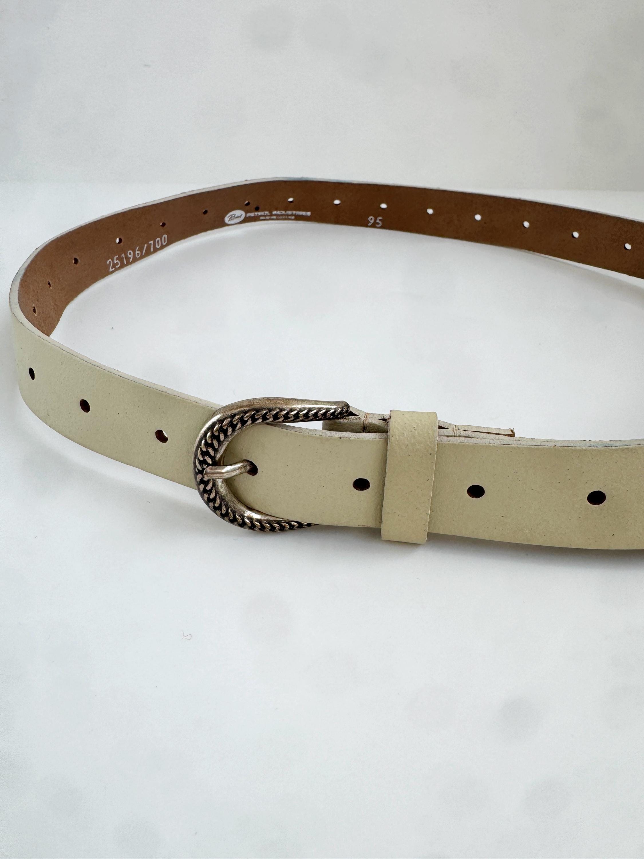 There's something quietly special about a belt that's been around long enough to have its own character — and this one absolutely does. This is a genuine leather belt by Petrol Industries, crafted from real leather in a warm cream/off-white tone that pairs effortlessly with everything from wide-leg denim to flowing midi skirts. The standout detail is the chunky silver-toned buckle with a braided chain border that gives it a Western-boho edge — the kind of hardware that makes people ask "where did you get that?"