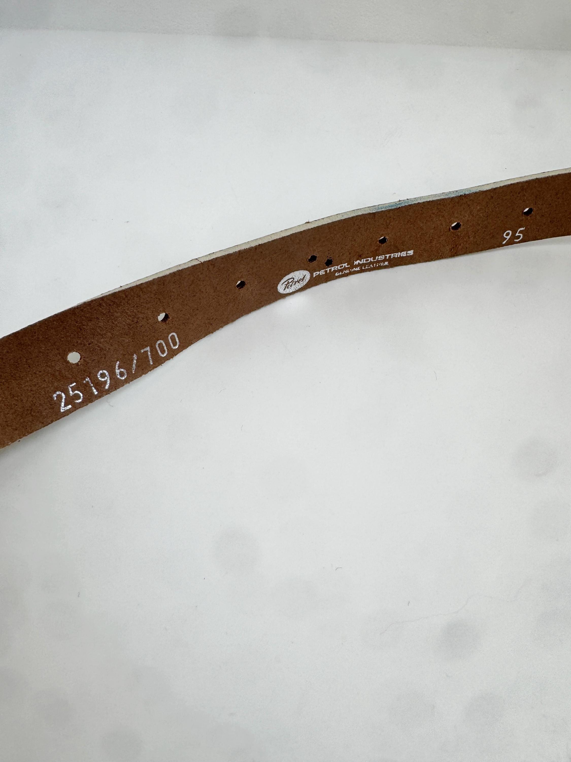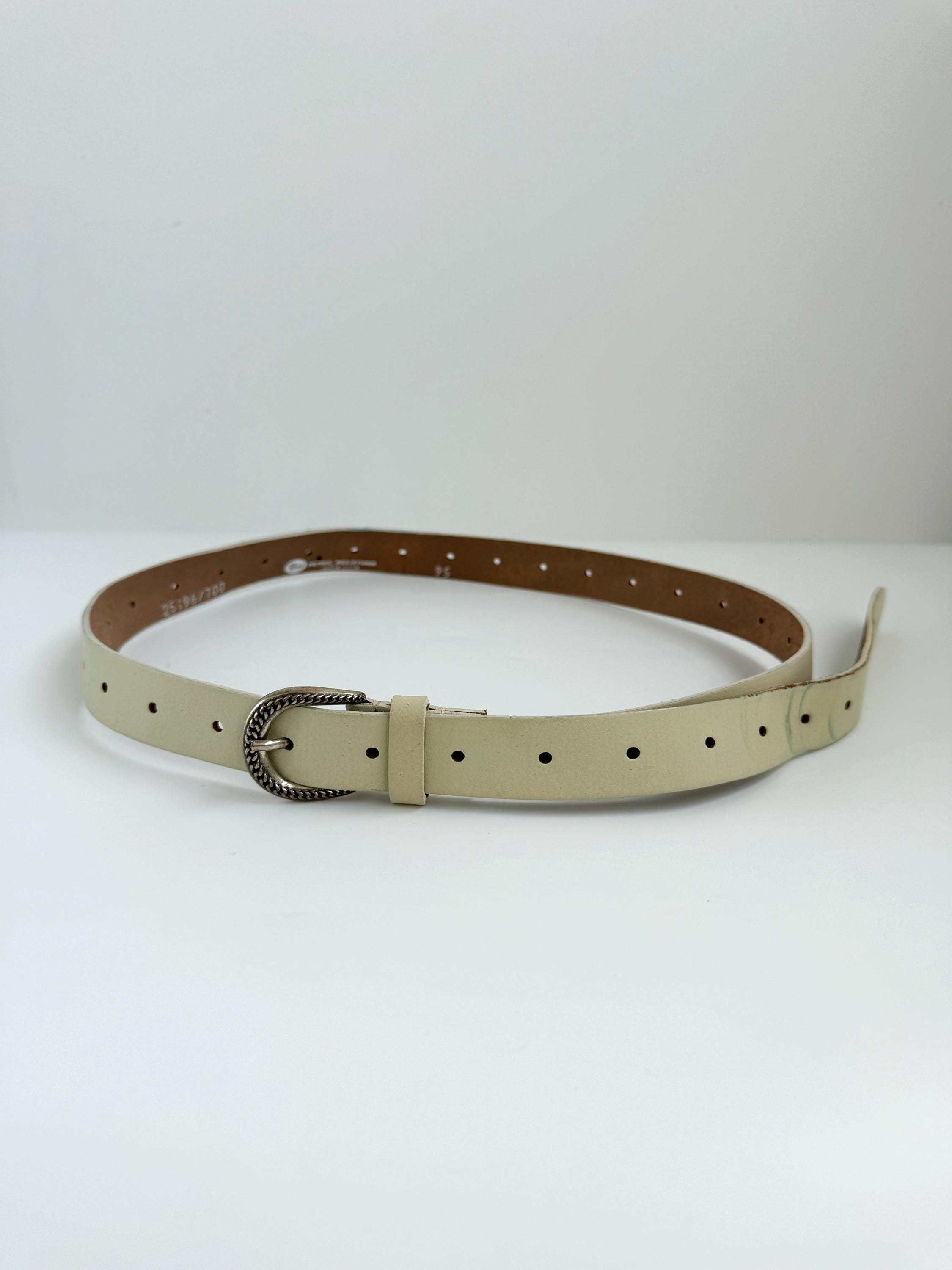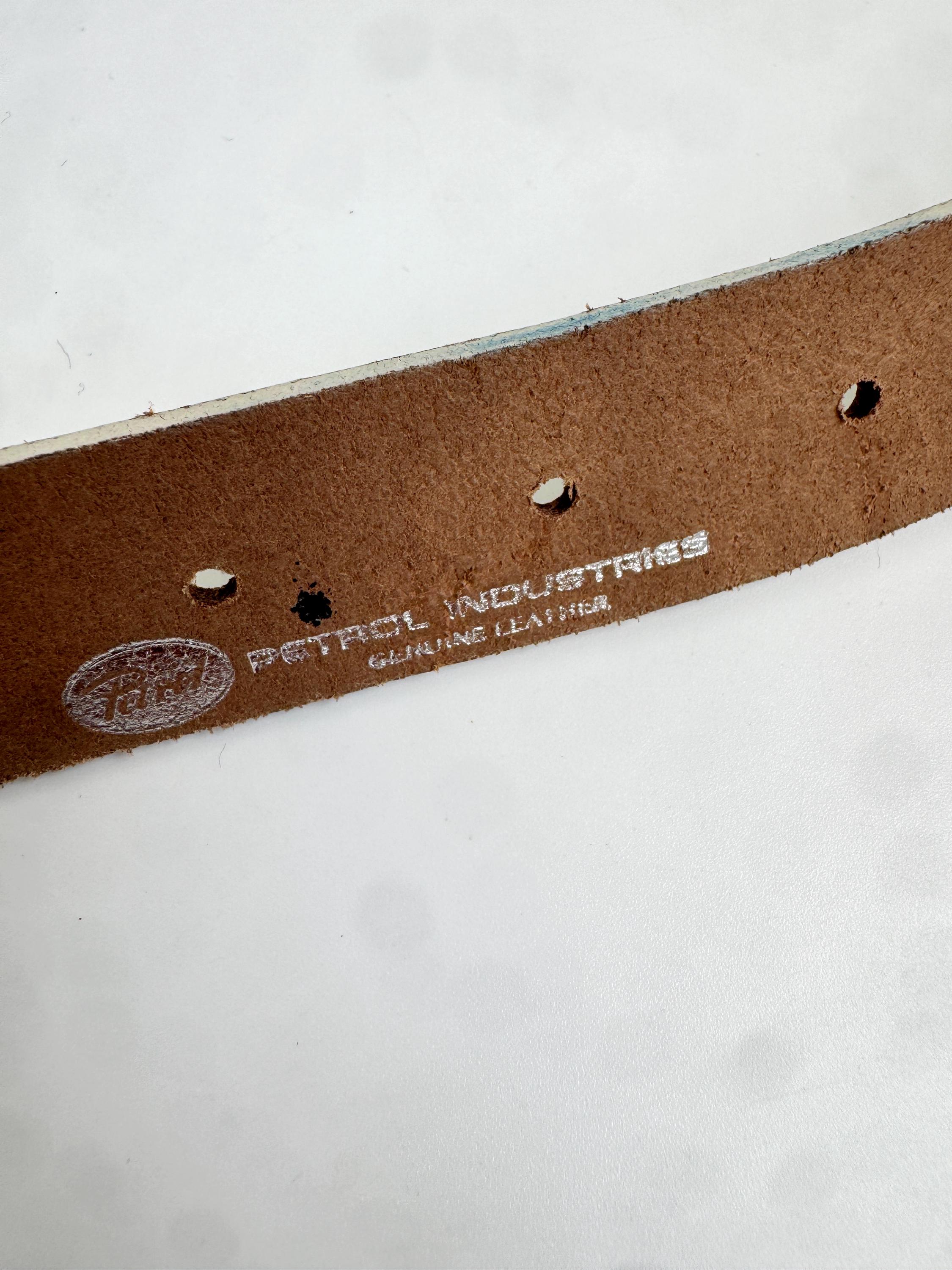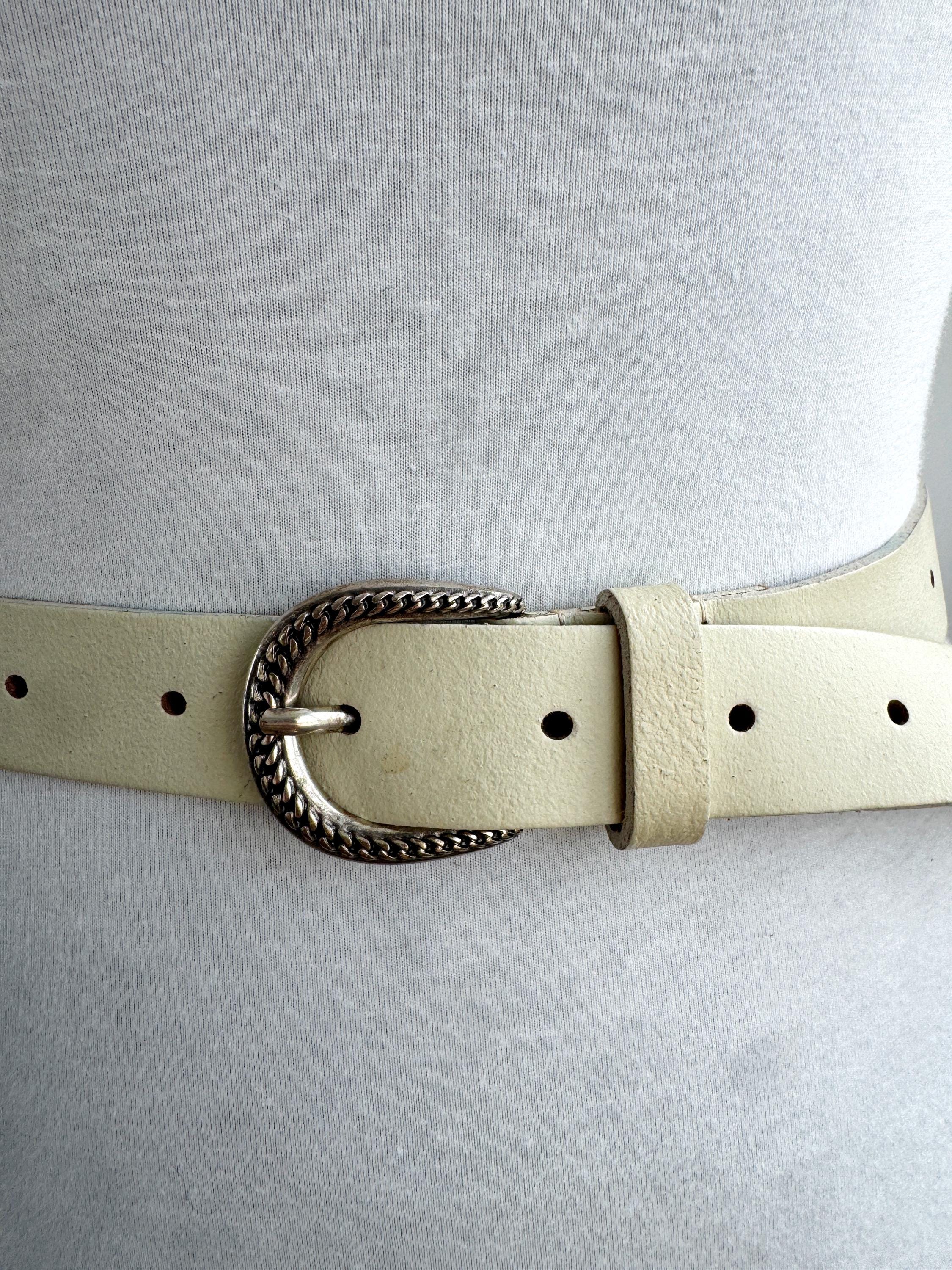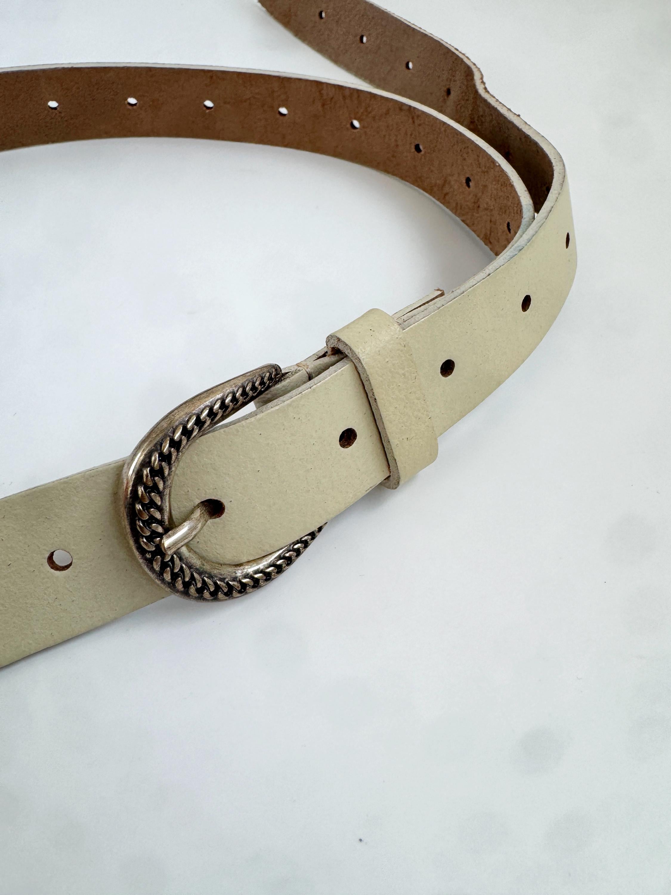 There's something quietly special about a belt that's been around long enough to have its own character — and this one absolutely does. This is a genuine leather belt by Petrol Industries, crafted from real leather in a warm cream/off-white tone that pairs effortlessly with everything from wide-leg denim to flowing midi skirts. The standout detail is the chunky silver-toned buckle with a braided chain border that gives it a Western-boho edge — the kind of hardware that makes people ask "where did you get that?"