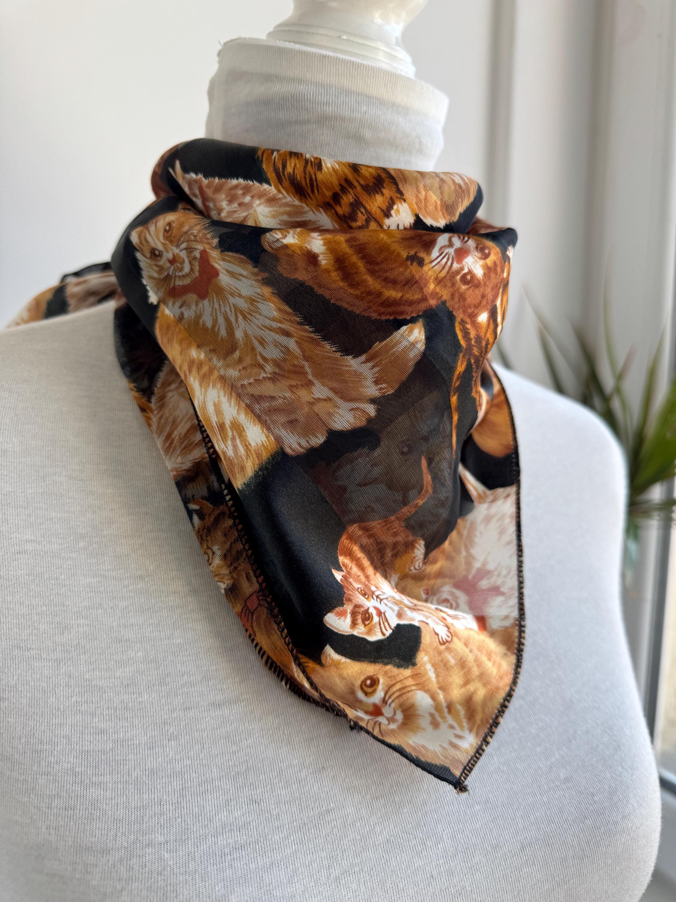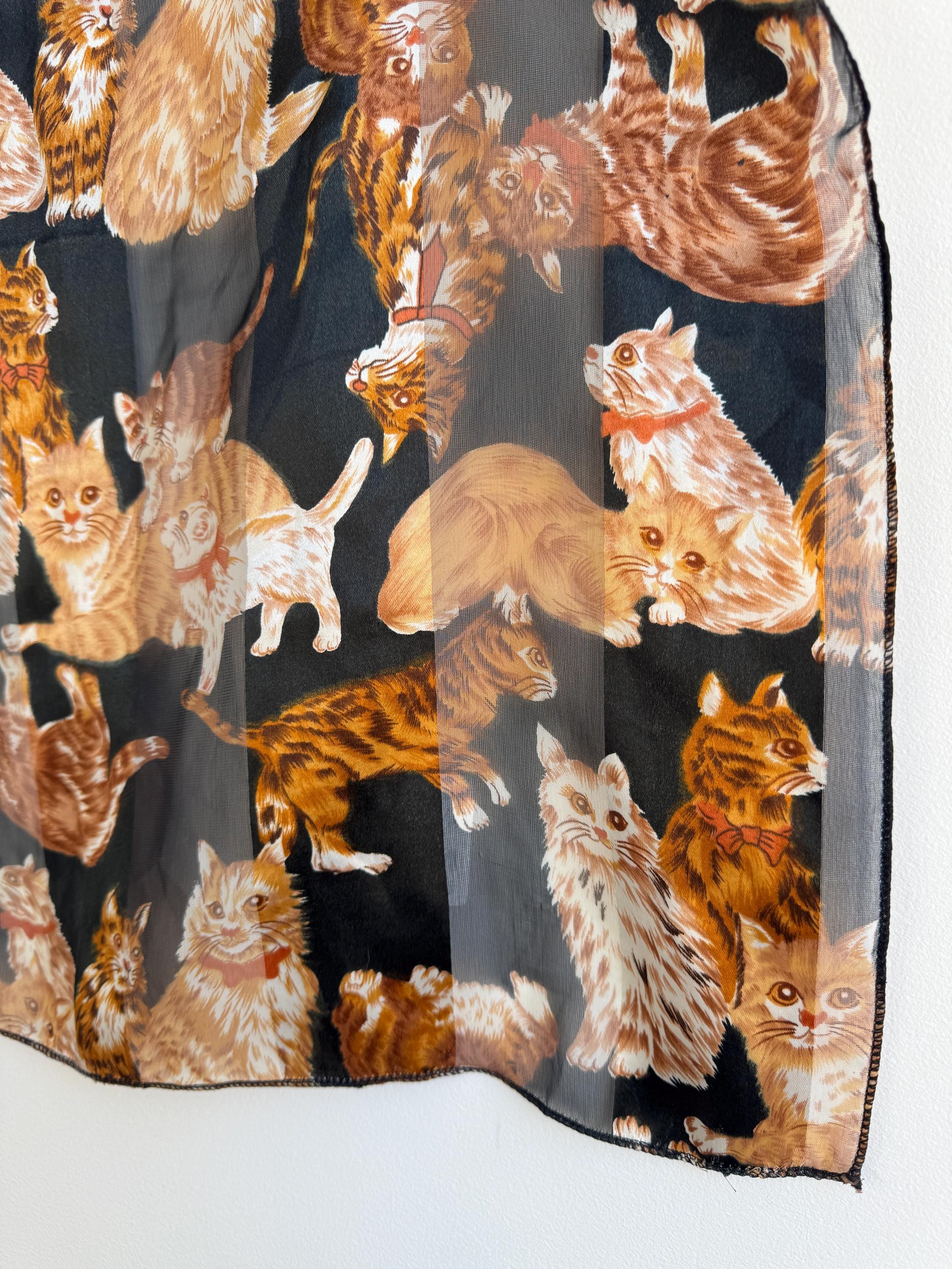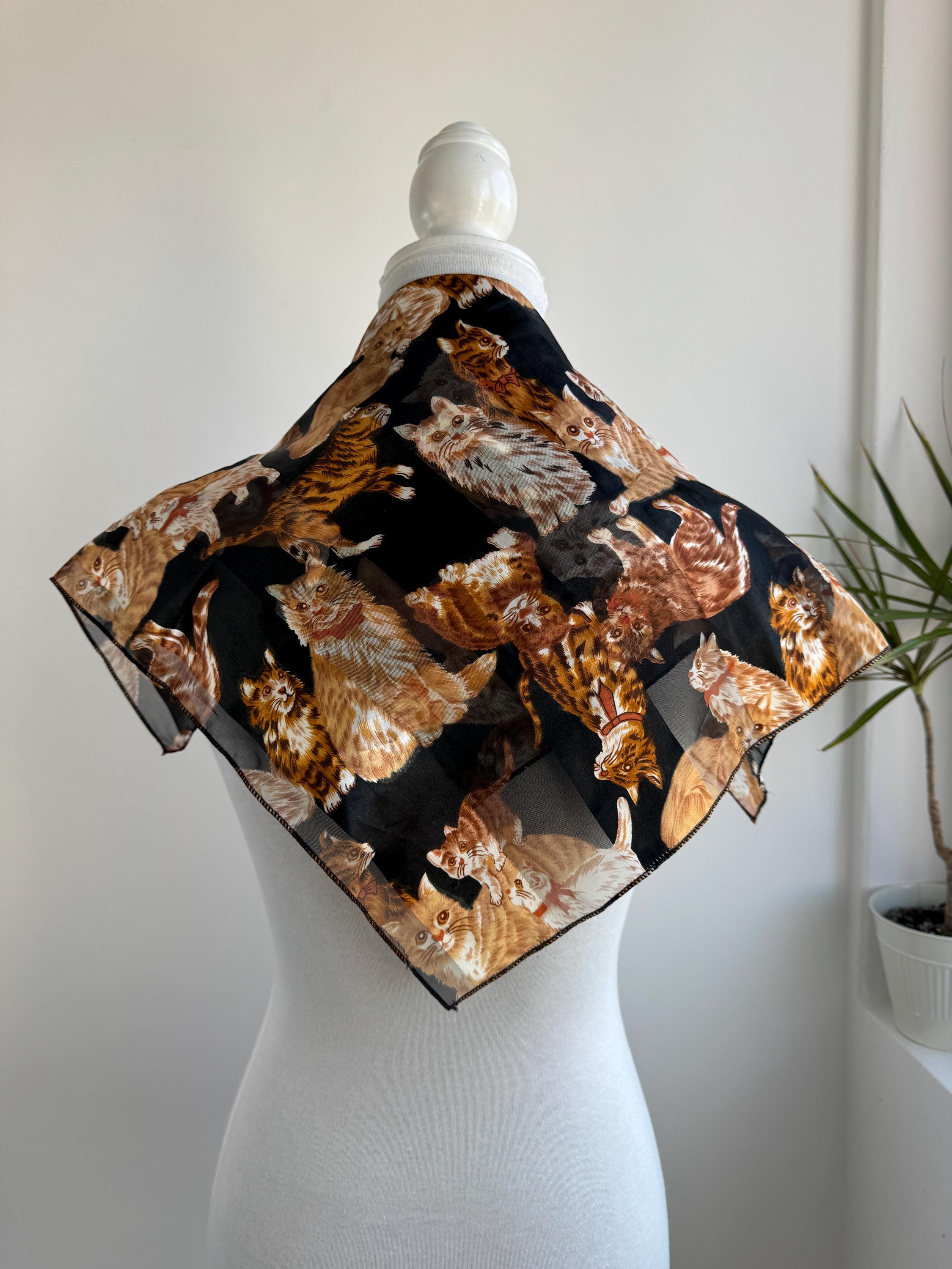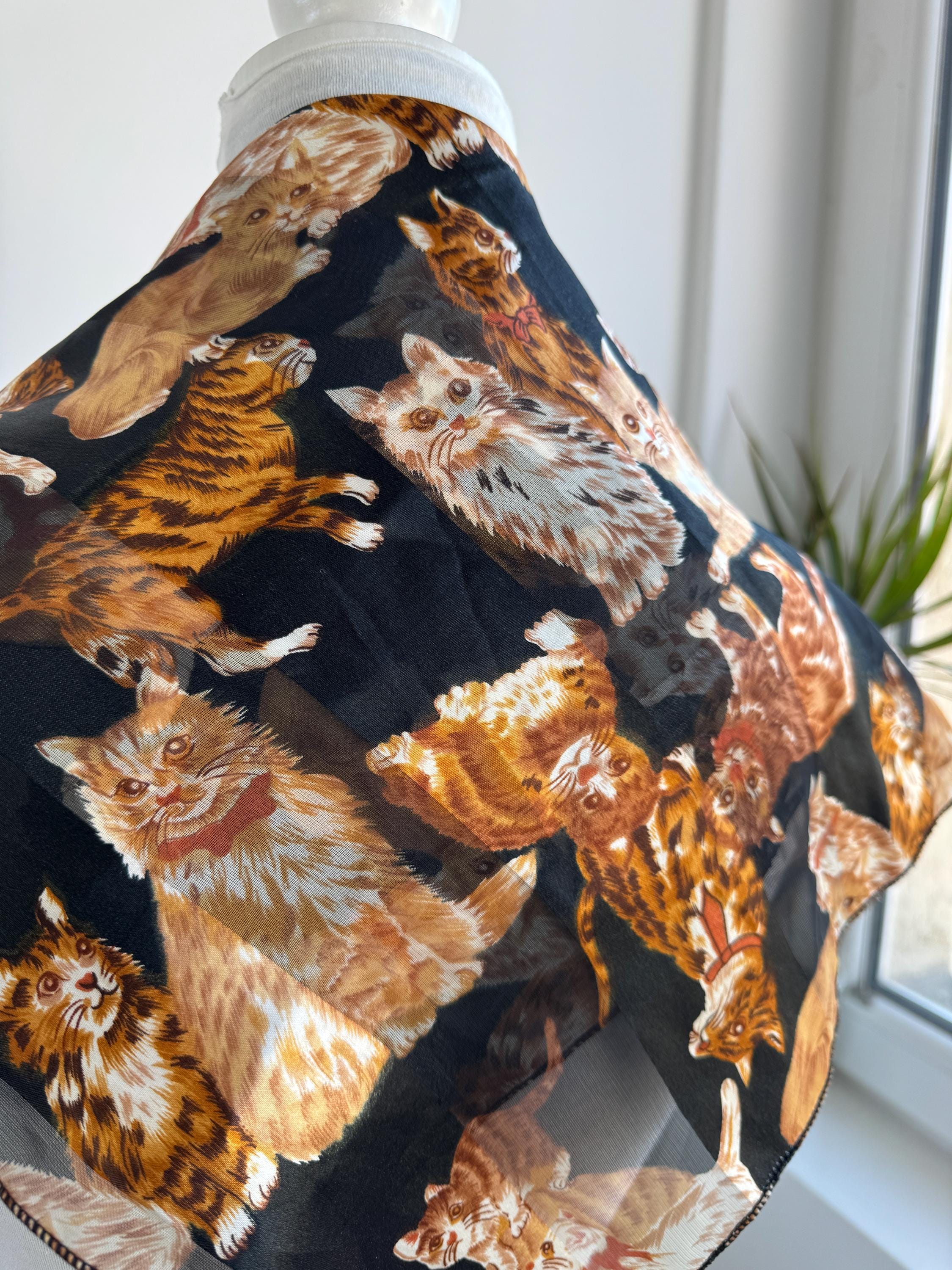 If you're a cat lover with an eye for one-of-a-kind vintage pieces, this charming sheer square scarf is about to become your new favourite accessory. Covered in a lively all-over print of illustrated kittens in warm amber, ginger, and cream tones against a dramatic black background, this piece effortlessly bridges the gap between quirky and chic. The sheer, lightweight polyester fabric gives it an ethereal quality — wear it knotted at the neck, draped over the shoulders, tied in the hair, or even styled as a decorative wrap. The vintage novelty cat print feels right at home alongside the current resurgence of retro animal prints and Y2K fashion aesthetics. A true statement piece for the vintage fashion enthusiast, cat lover, or anyone who appreciates bold, playful styling with a nostalgic twist.