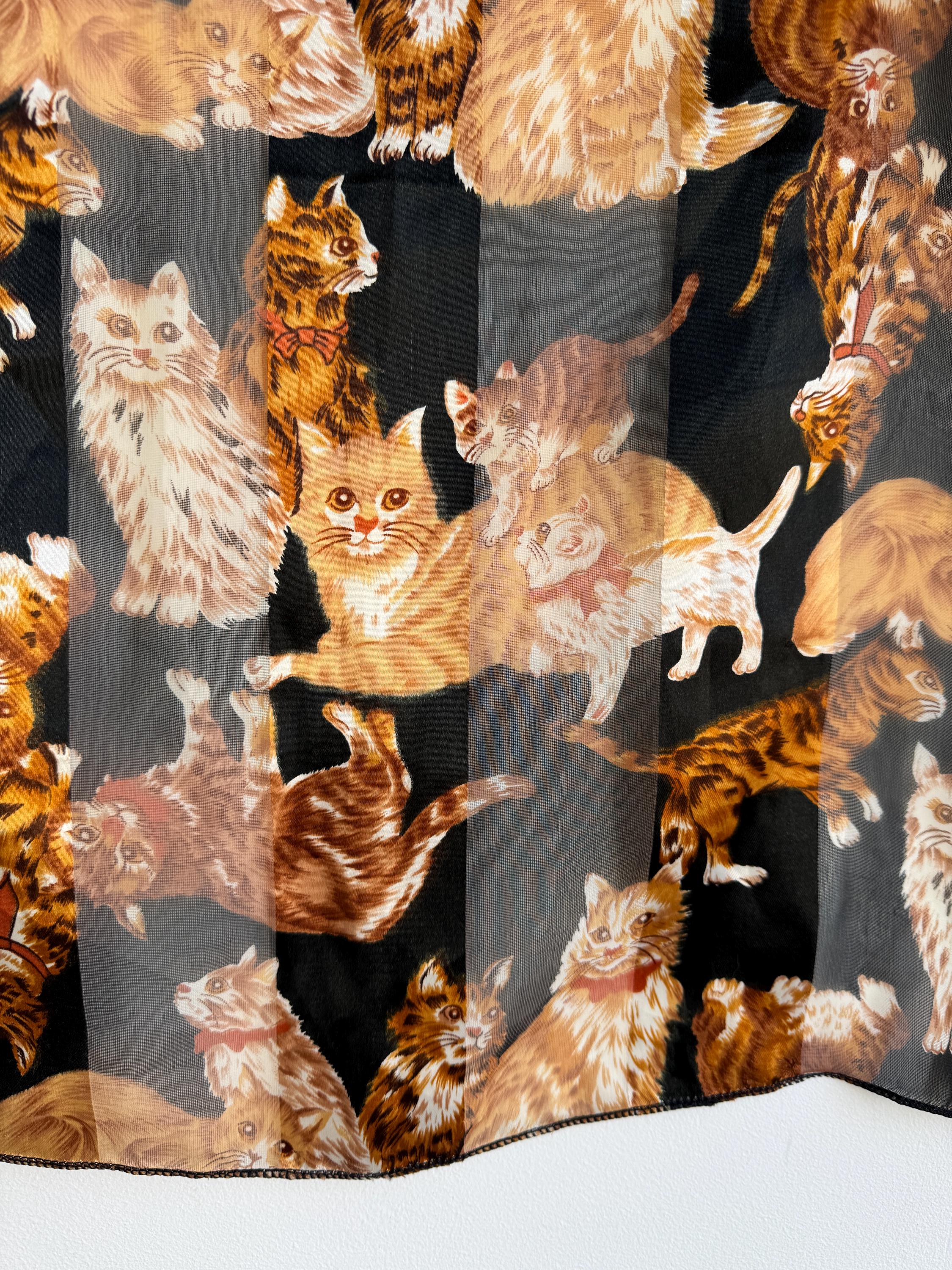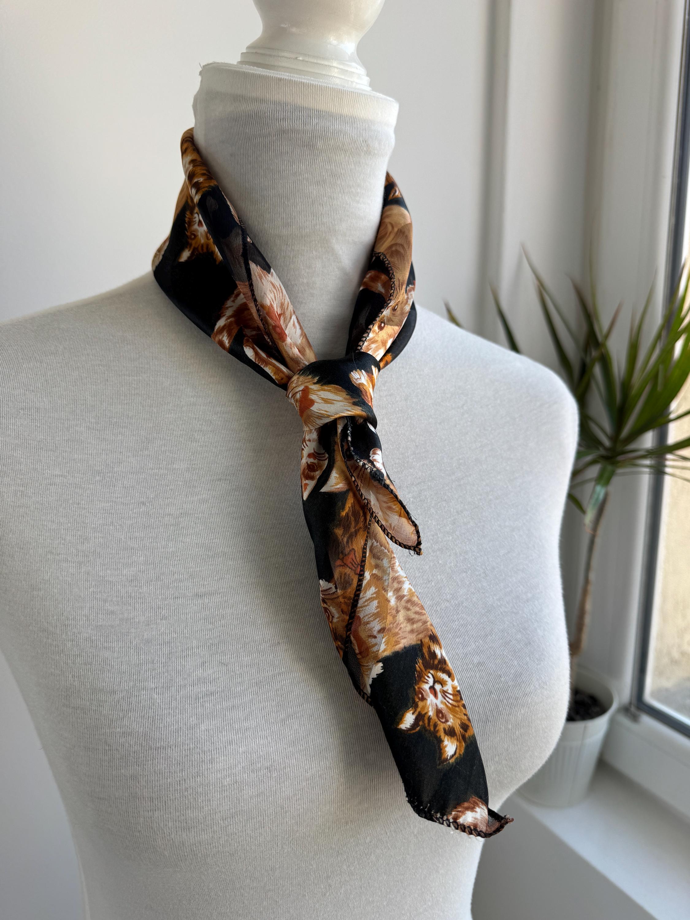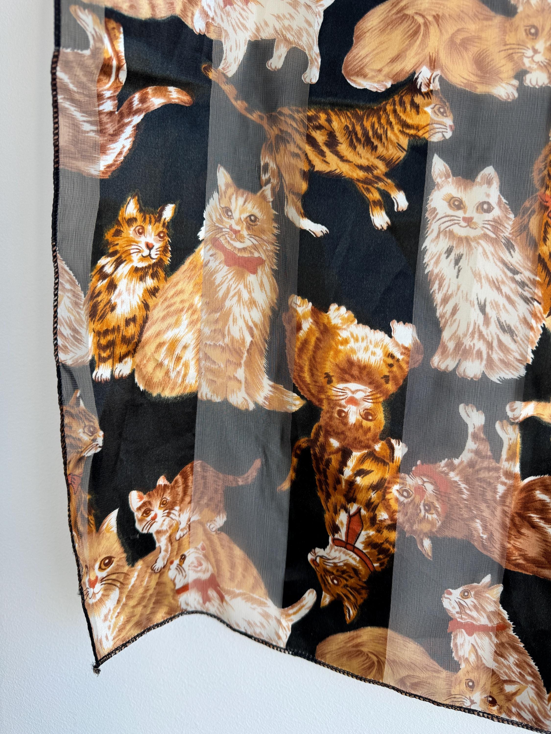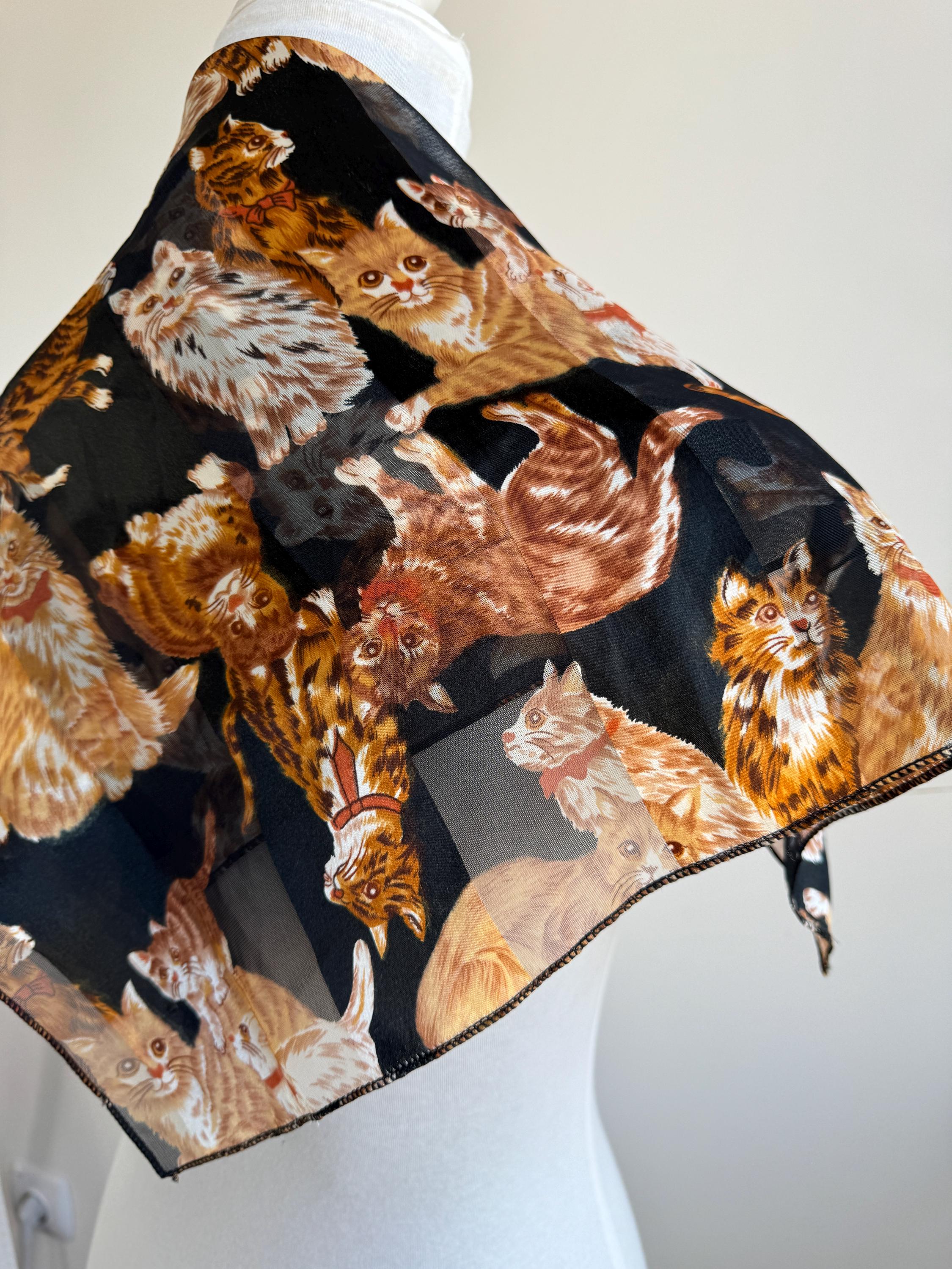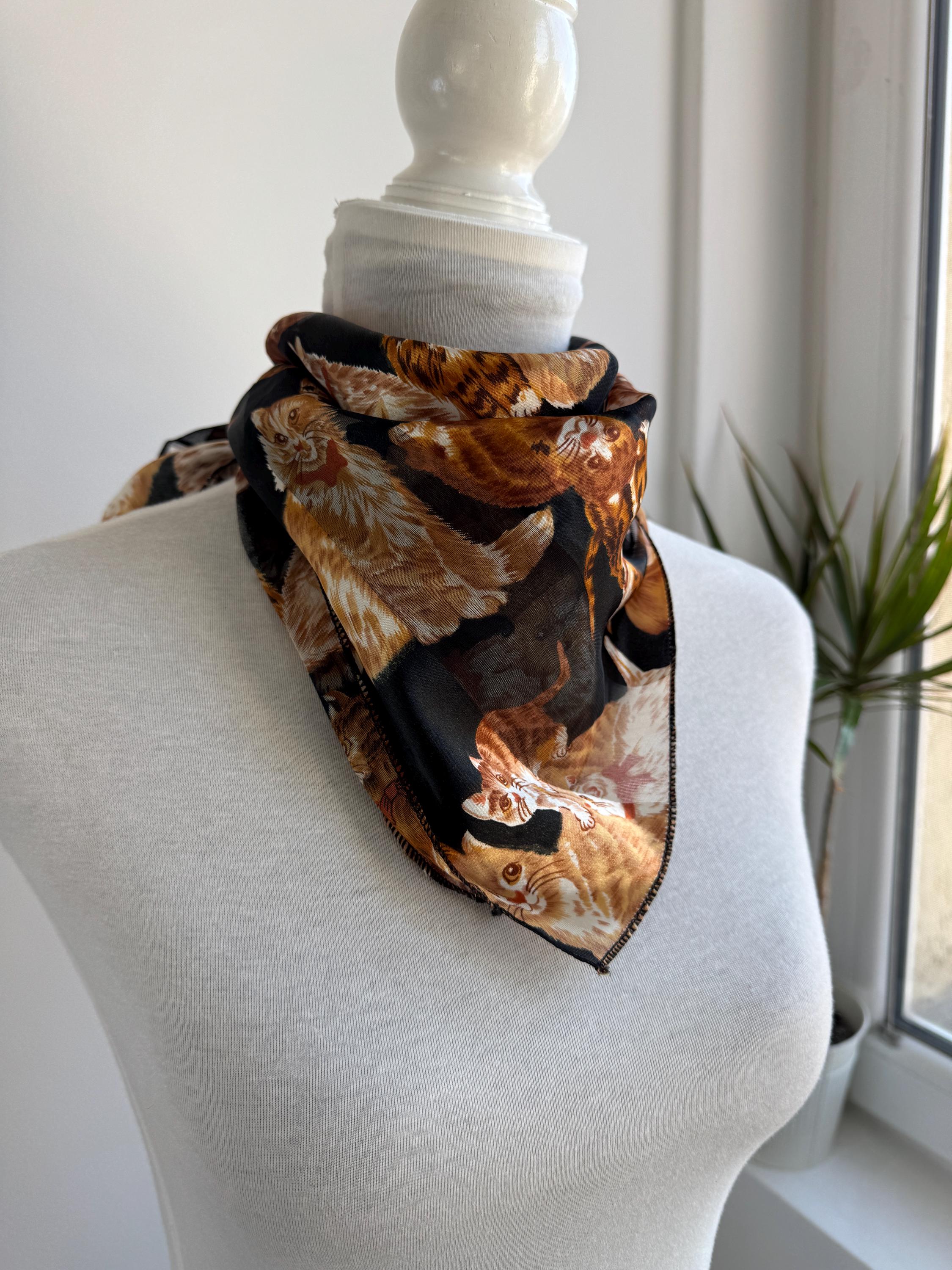If you're a cat lover with an eye for one-of-a-kind vintage pieces, this charming sheer square scarf is about to become your new favourite accessory. Covered in a lively all-over print of illustrated kittens in warm amber, ginger, and cream tones against a dramatic black background, this piece effortlessly bridges the gap between quirky and chic. The sheer, lightweight polyester fabric gives it an ethereal quality — wear it knotted at the neck, draped over the shoulders, tied in the hair, or even styled as a decorative wrap. The vintage novelty cat print feels right at home alongside the current resurgence of retro animal prints and Y2K fashion aesthetics. A true statement piece for the vintage fashion enthusiast, cat lover, or anyone who appreciates bold, playful styling with a nostalgic twist.