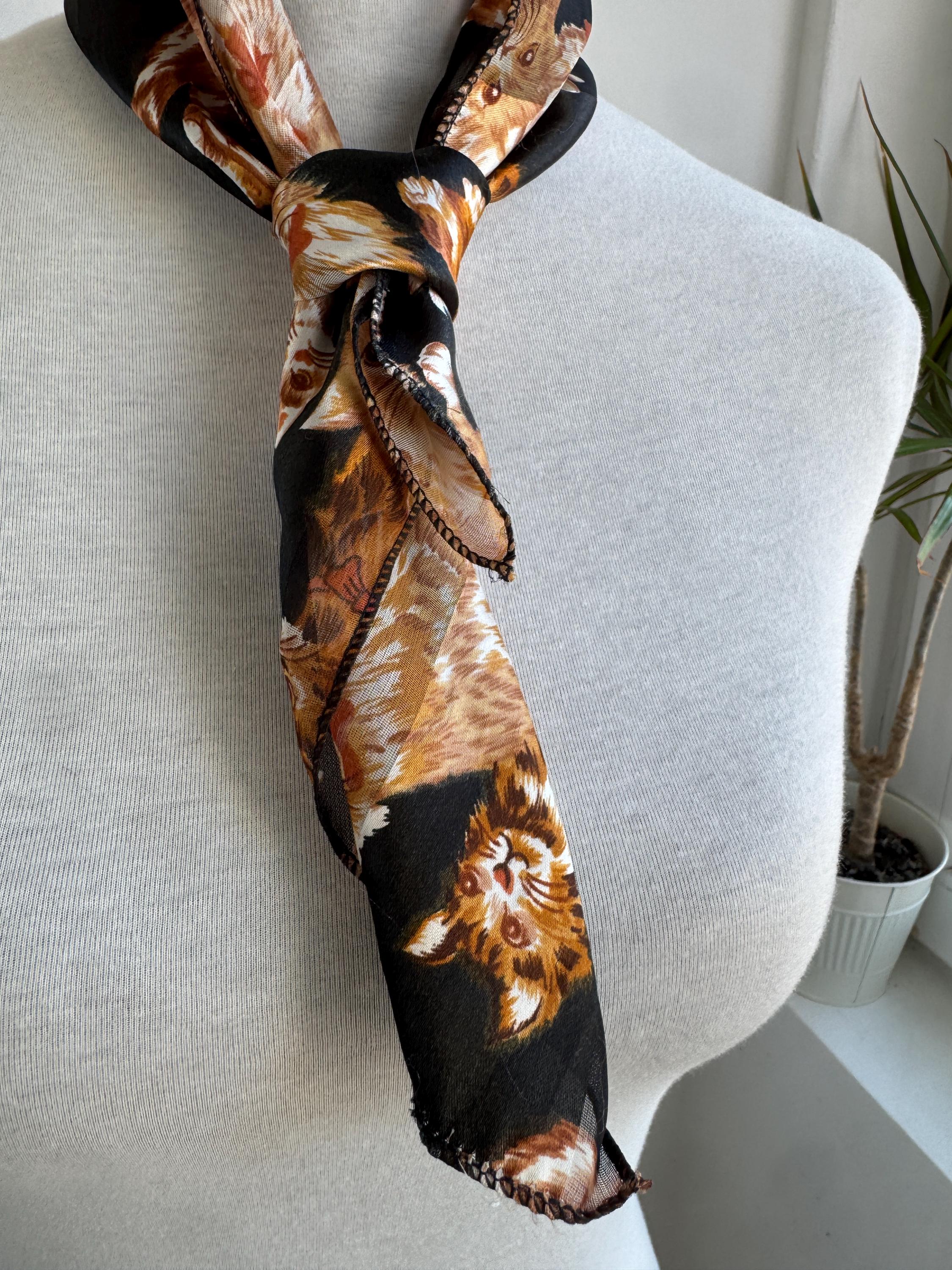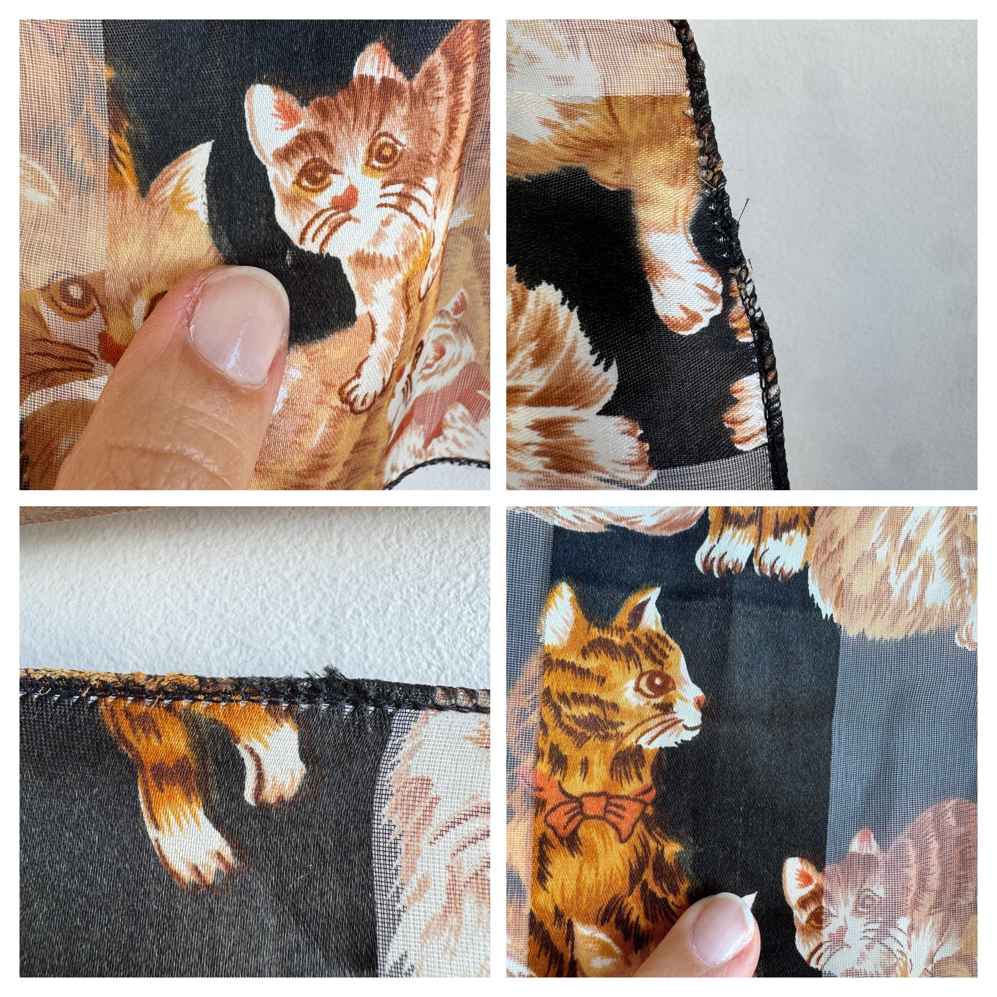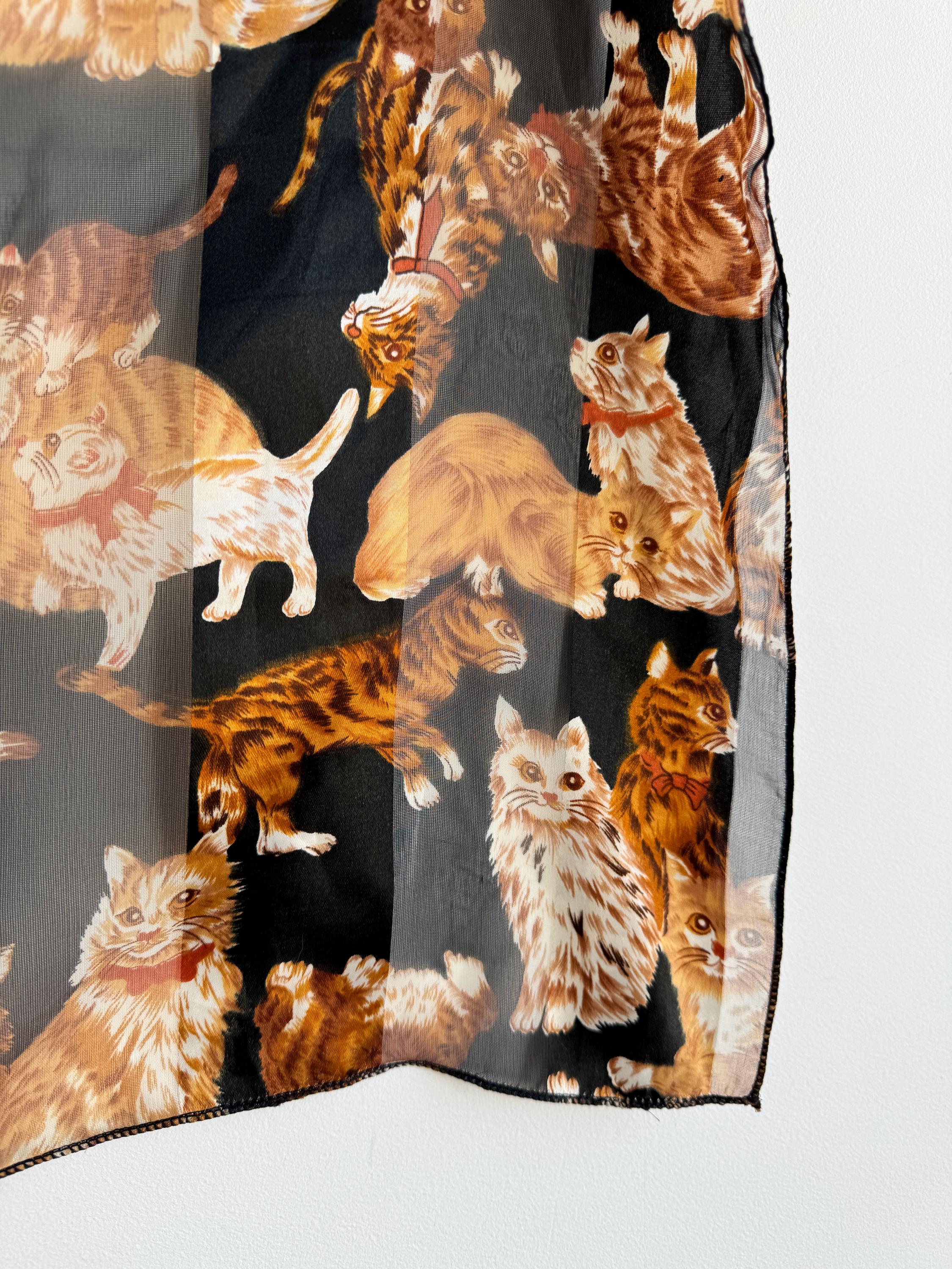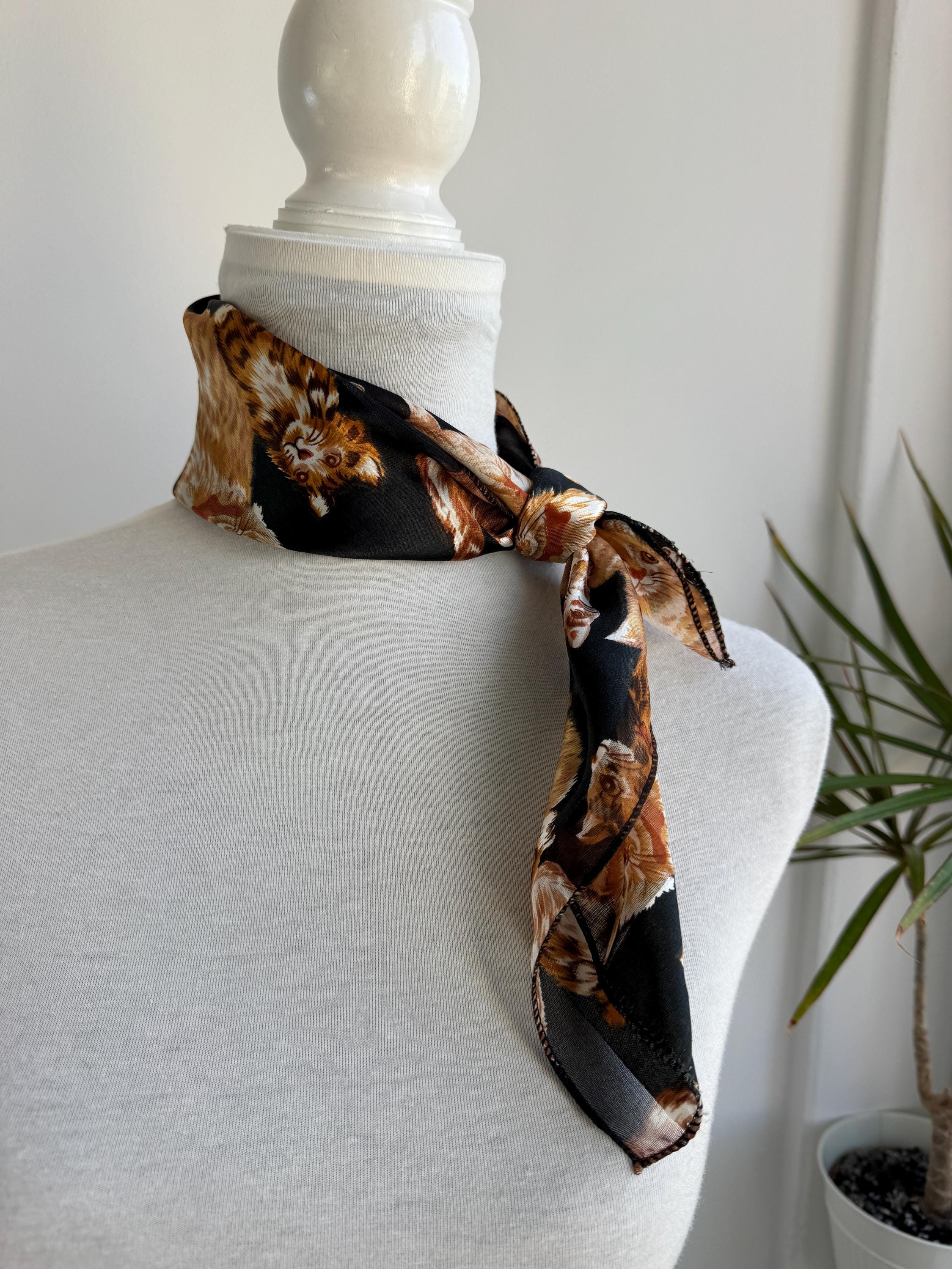 If you're a cat lover with an eye for one-of-a-kind vintage pieces, this charming sheer square scarf is about to become your new favourite accessory. Covered in a lively all-over print of illustrated kittens in warm amber, ginger, and cream tones against a dramatic black background, this piece effortlessly bridges the gap between quirky and chic. The sheer, lightweight polyester fabric gives it an ethereal quality — wear it knotted at the neck, draped over the shoulders, tied in the hair, or even styled as a decorative wrap. The vintage novelty cat print feels right at home alongside the current resurgence of retro animal prints and Y2K fashion aesthetics. A true statement piece for the vintage fashion enthusiast, cat lover, or anyone who appreciates bold, playful styling with a nostalgic twist.