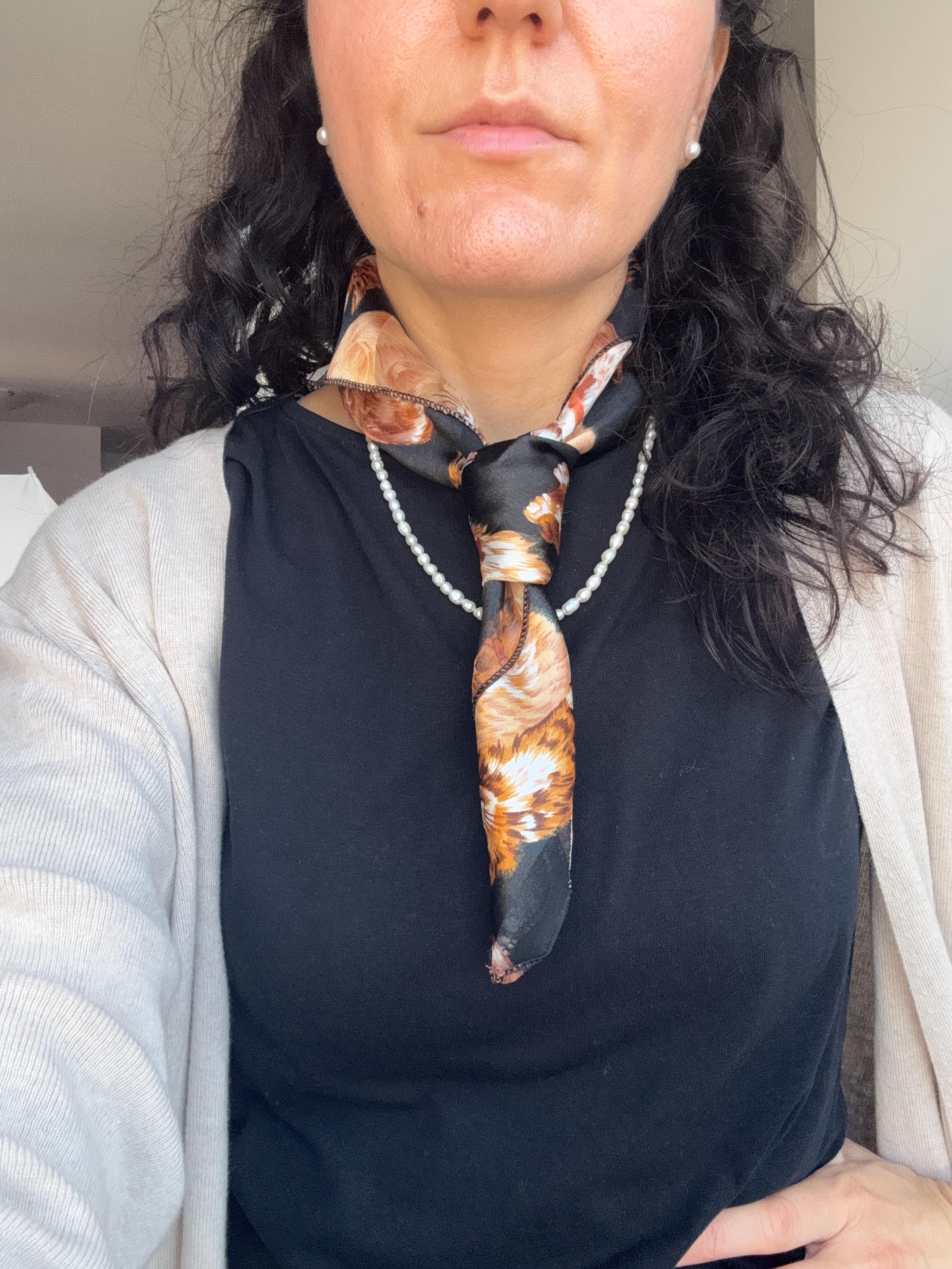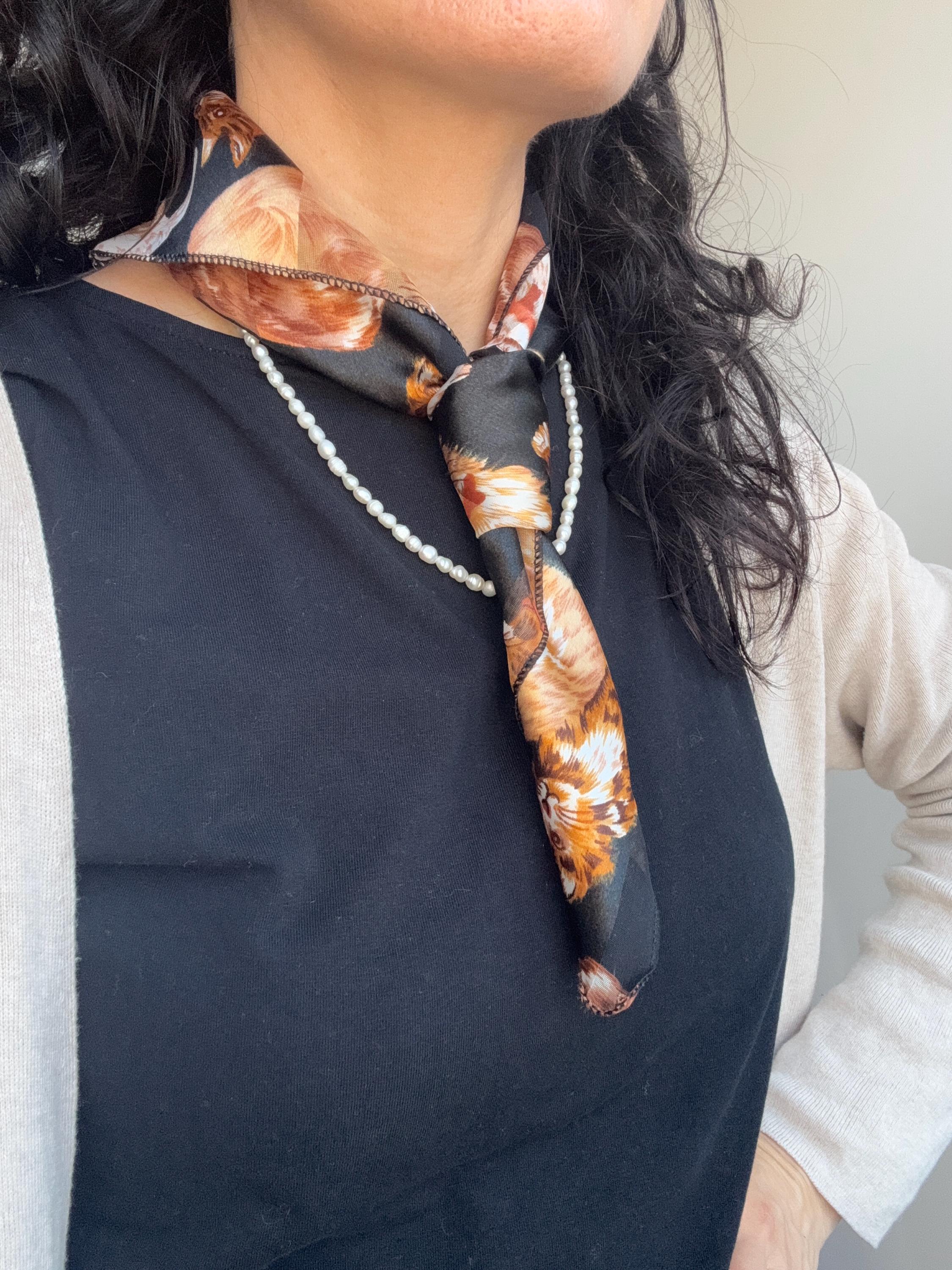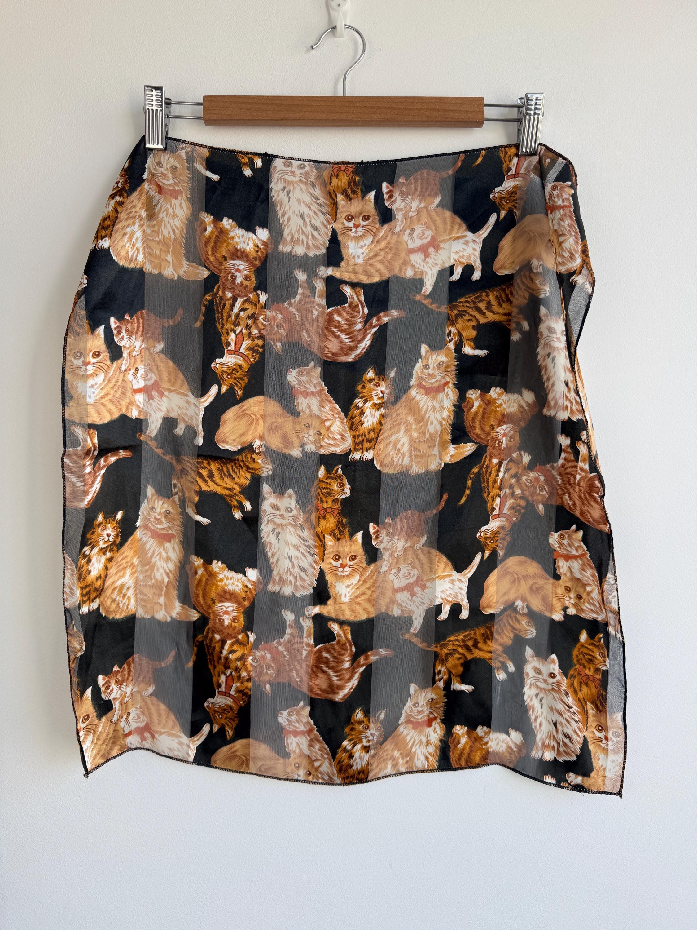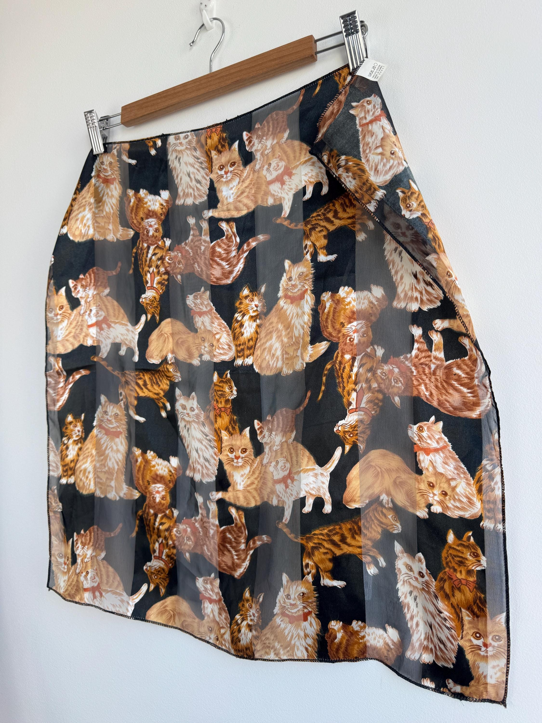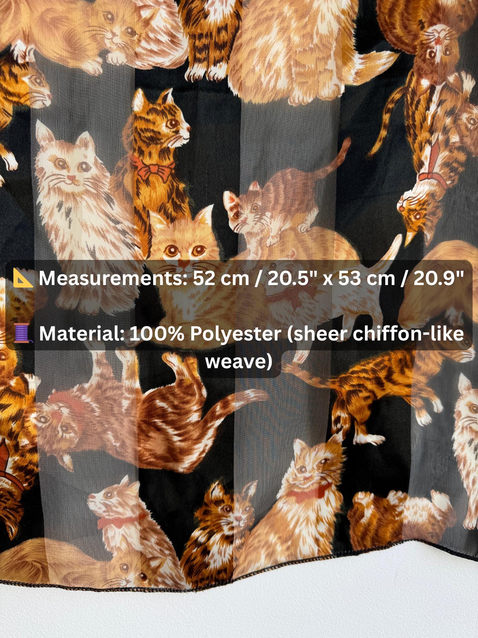 If you're a cat lover with an eye for one-of-a-kind vintage pieces, this charming sheer square scarf is about to become your new favourite accessory. Covered in a lively all-over print of illustrated kittens in warm amber, ginger, and cream tones against a dramatic black background, this piece effortlessly bridges the gap between quirky and chic. The sheer, lightweight polyester fabric gives it an ethereal quality — wear it knotted at the neck, draped over the shoulders, tied in the hair, or even styled as a decorative wrap. The vintage novelty cat print feels right at home alongside the current resurgence of retro animal prints and Y2K fashion aesthetics. A true statement piece for the vintage fashion enthusiast, cat lover, or anyone who appreciates bold, playful styling with a nostalgic twist.