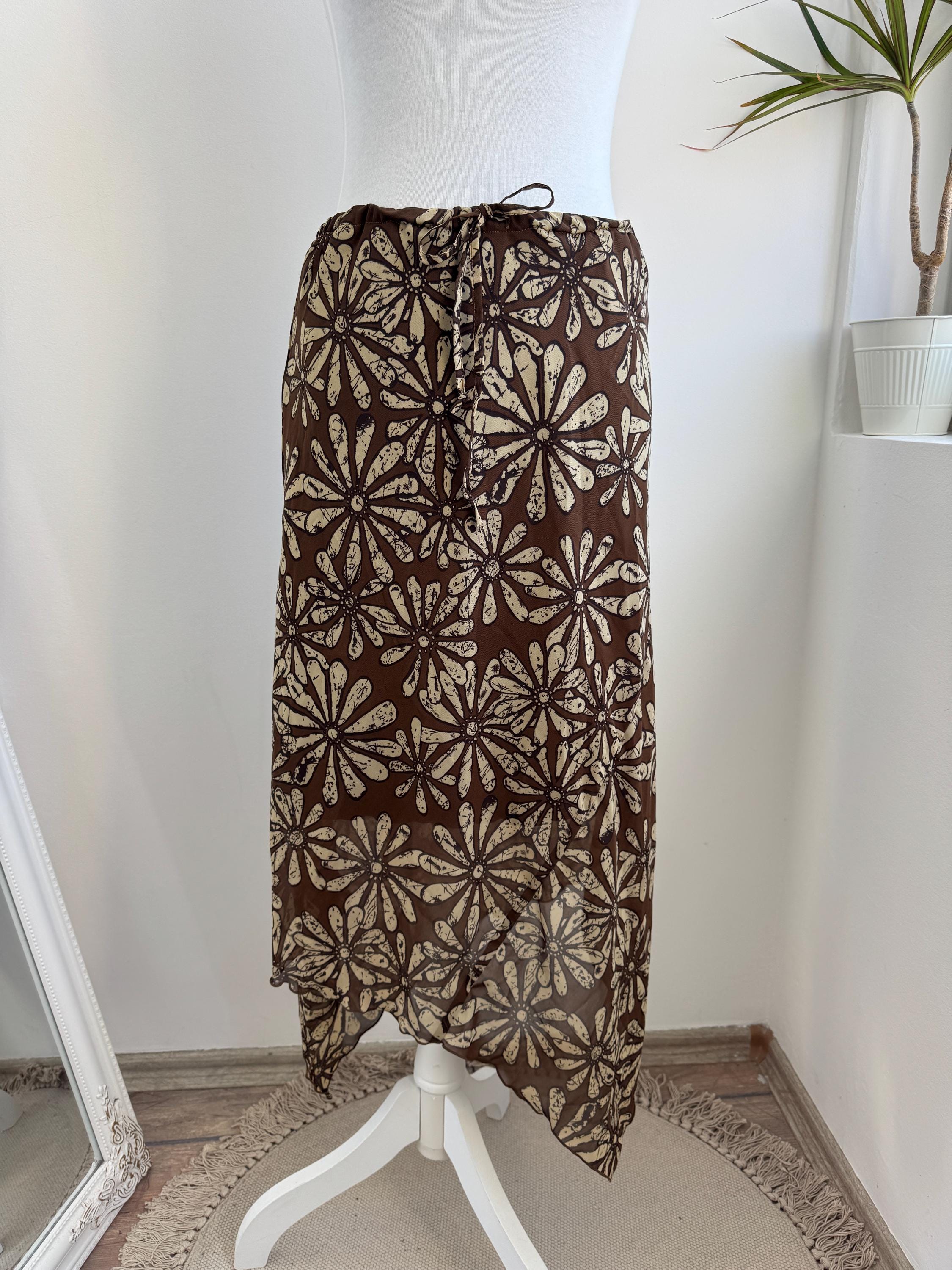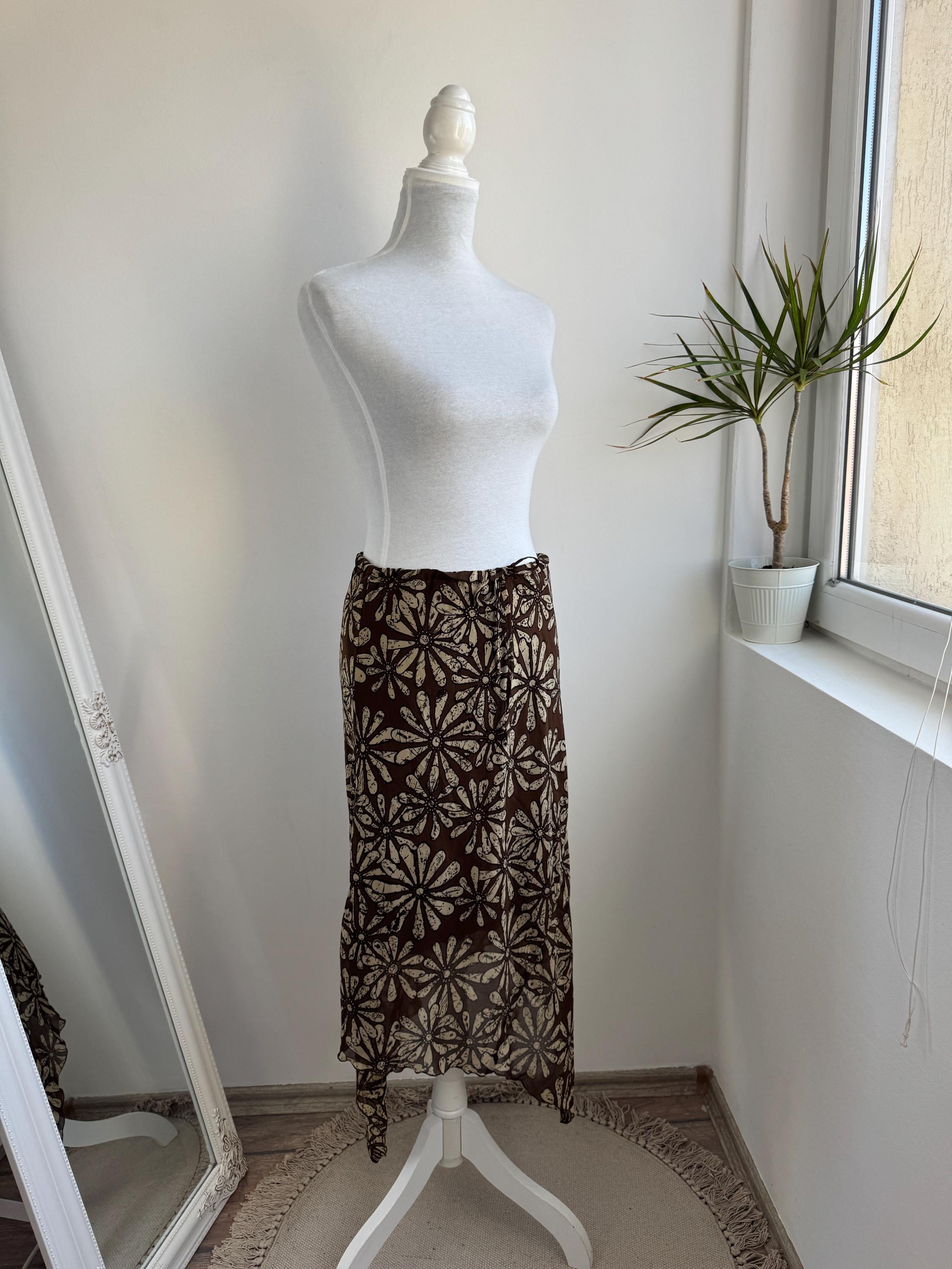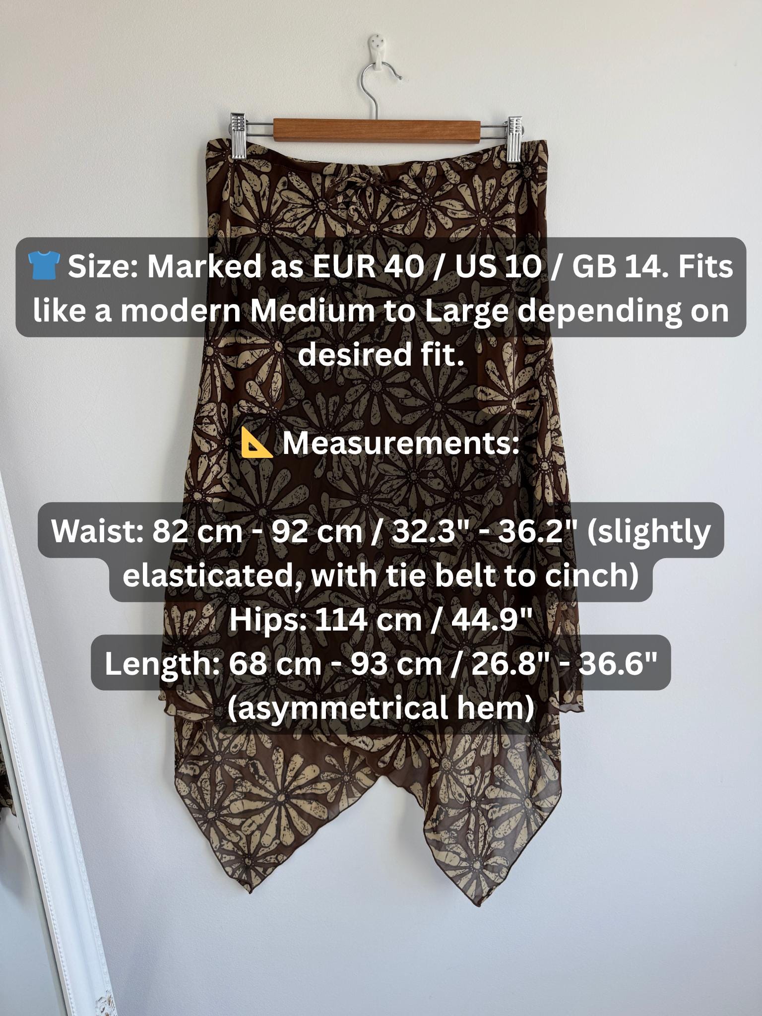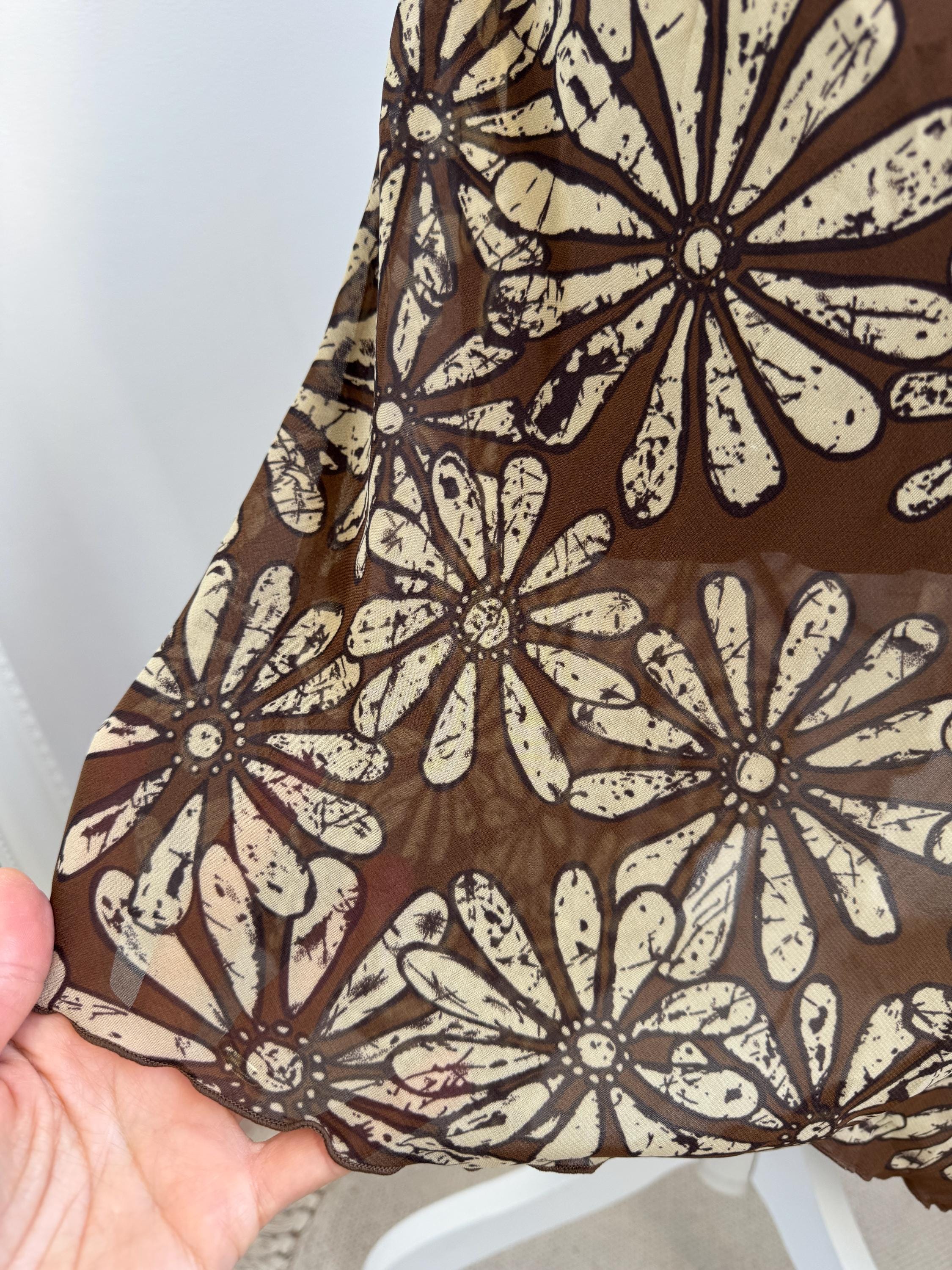 Bring a touch of effortless retro charm to your summer wardrobe with this stunning vintage H&M mesh skirt. Featuring a rich chocolate brown base adorned with a bold, cream-colored floral print, this sheer asymmetrical skirt perfectly captures the earthy, bohemian aesthetic of the early 2000s. The double-layered design features a delicate, sheer mesh top layer that flows beautifully over a solid brown knee length lining lining, providing both comfort and a playful sense of movement.