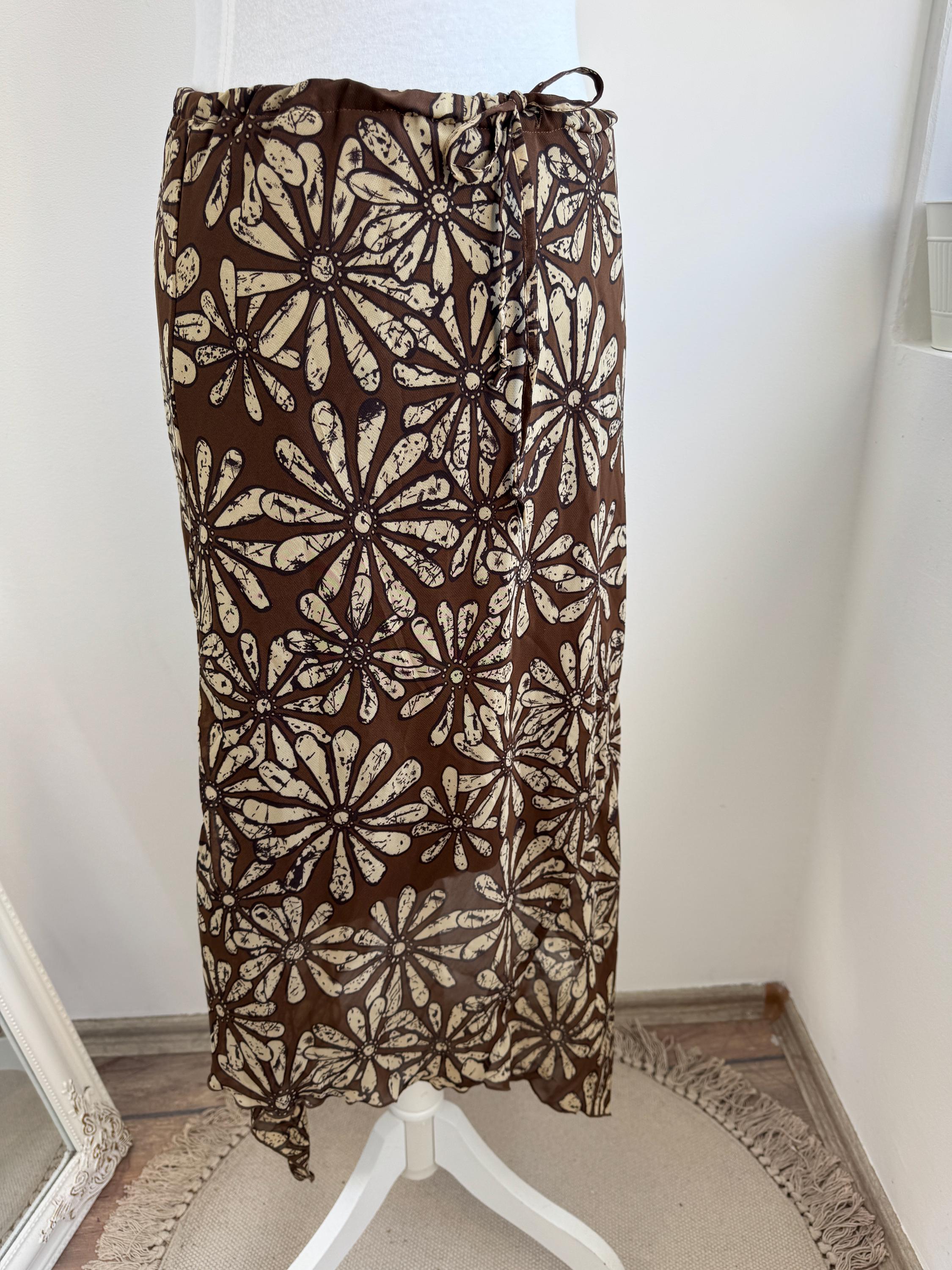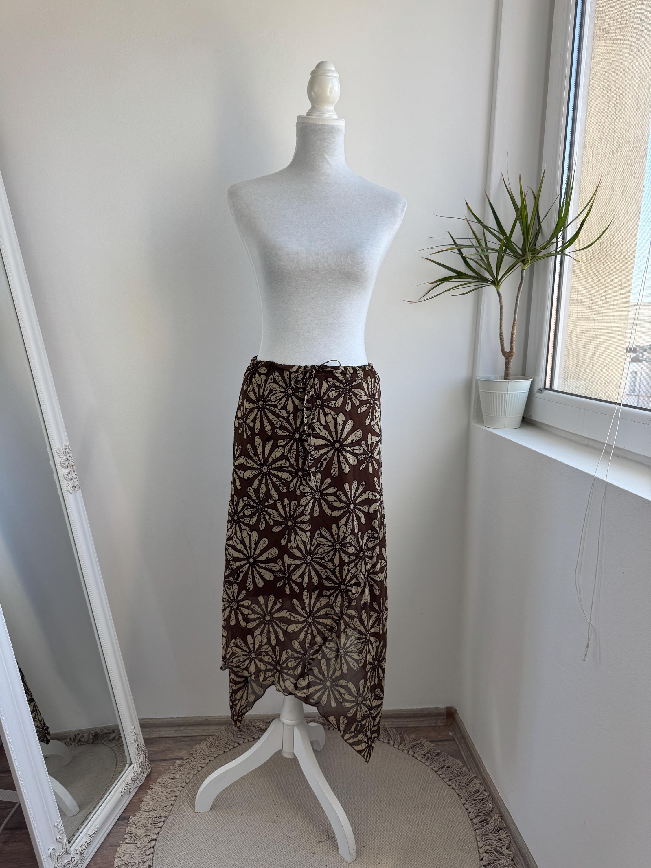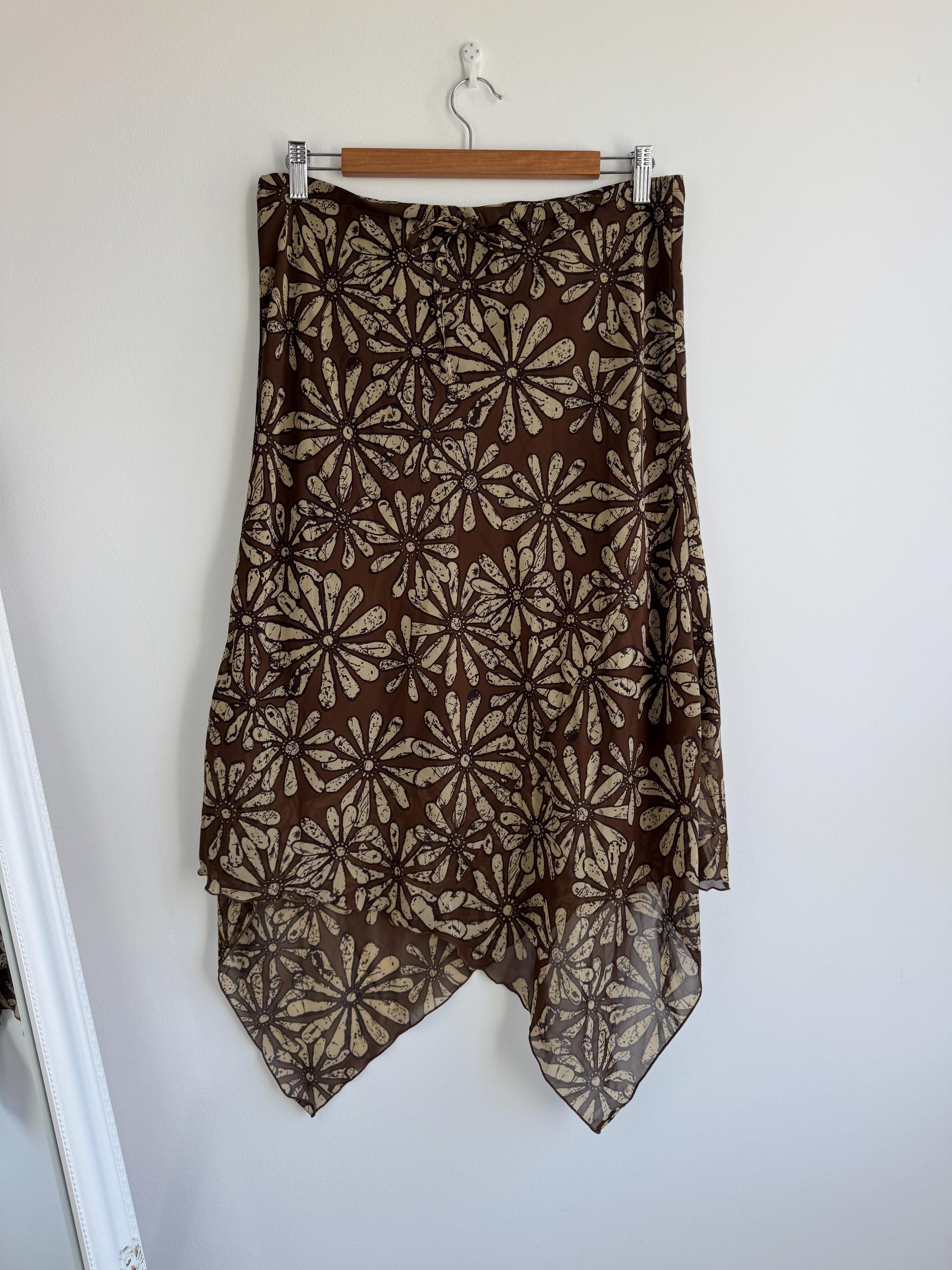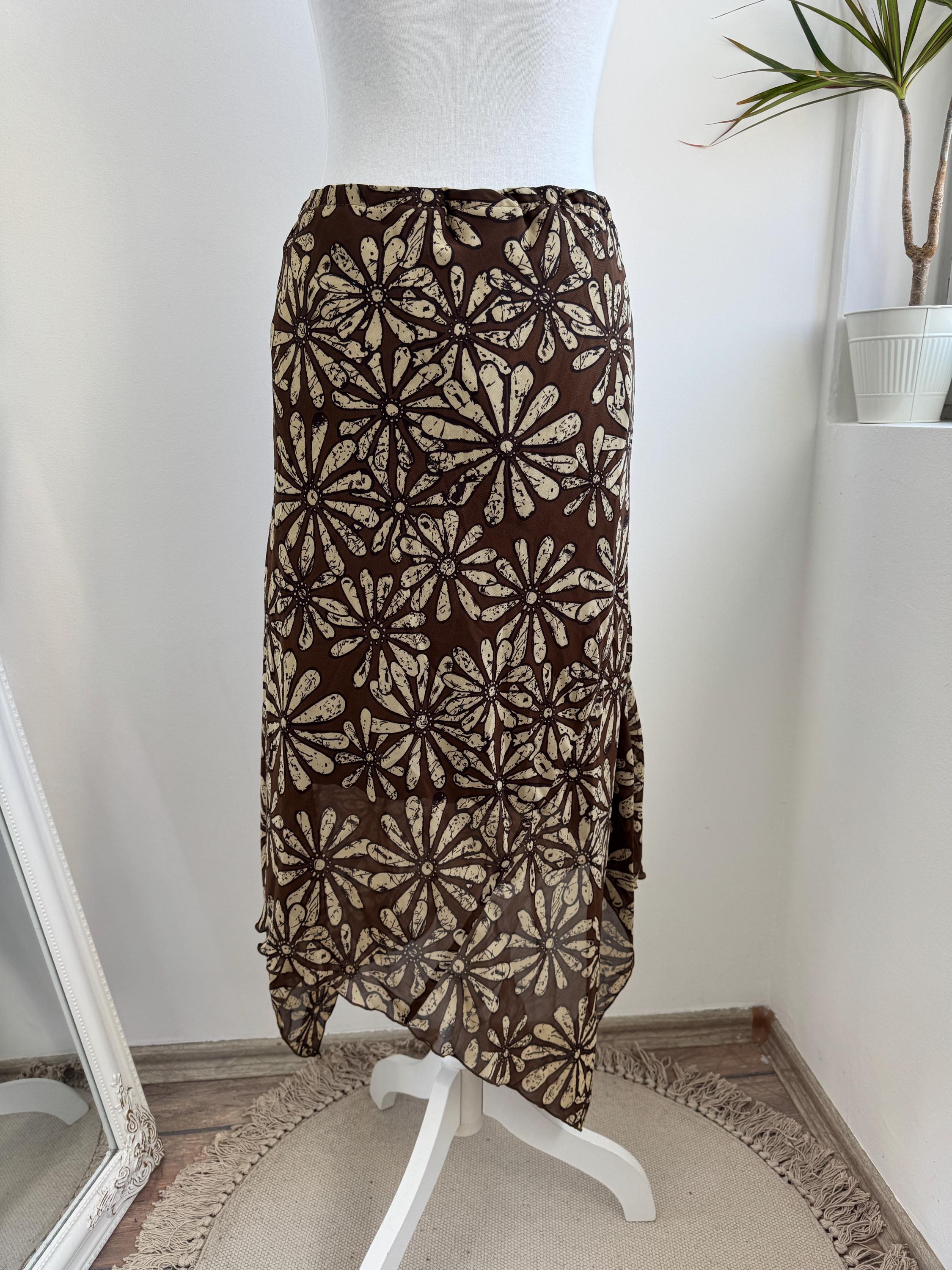 Bring a touch of effortless retro charm to your summer wardrobe with this stunning vintage H&M mesh skirt. Featuring a rich chocolate brown base adorned with a bold, cream-colored floral print, this sheer asymmetrical skirt perfectly captures the earthy, bohemian aesthetic of the early 2000s. The double-layered design features a delicate, sheer mesh top layer that flows beautifully over a solid brown knee length lining lining, providing both comfort and a playful sense of movement.