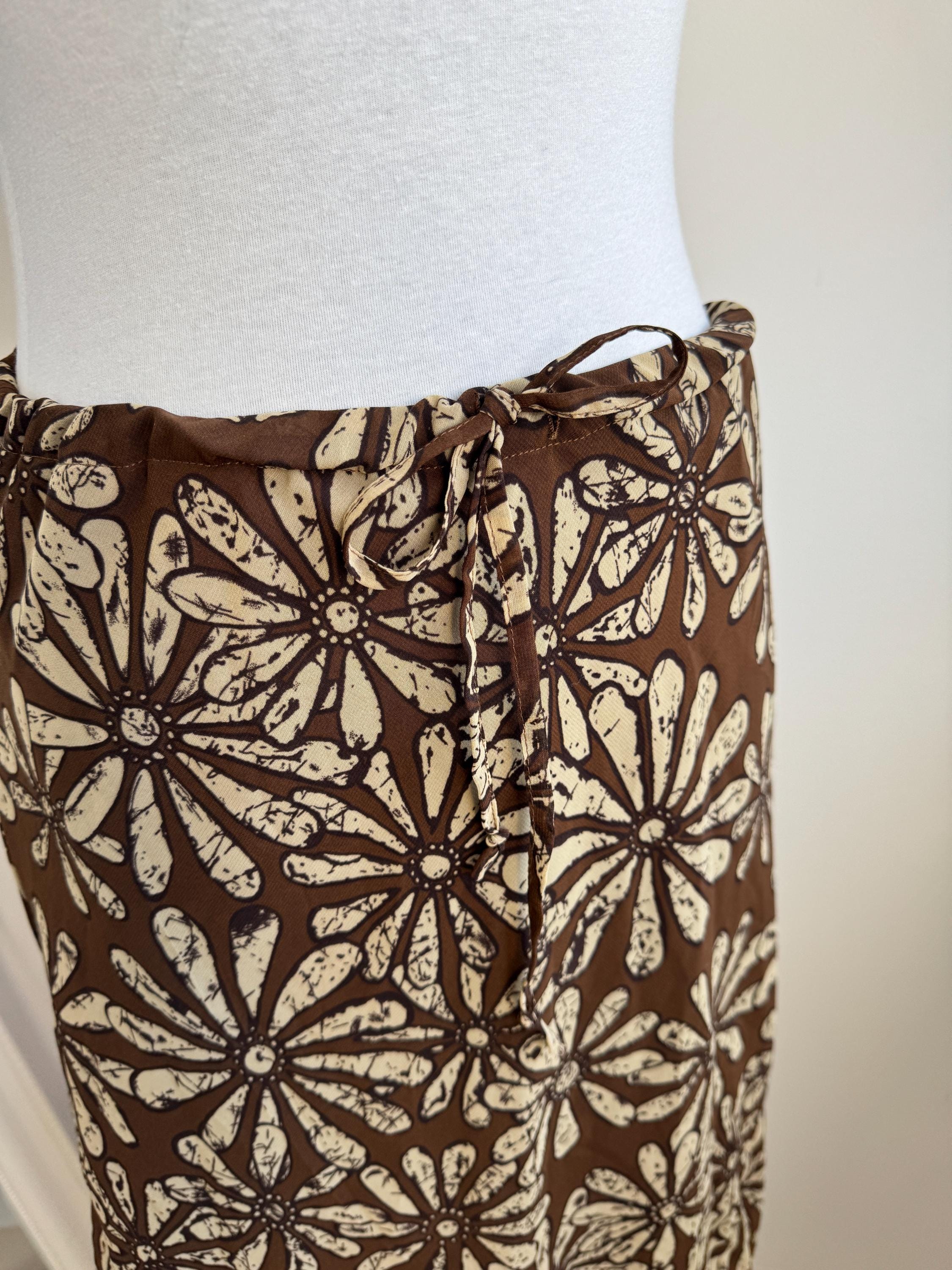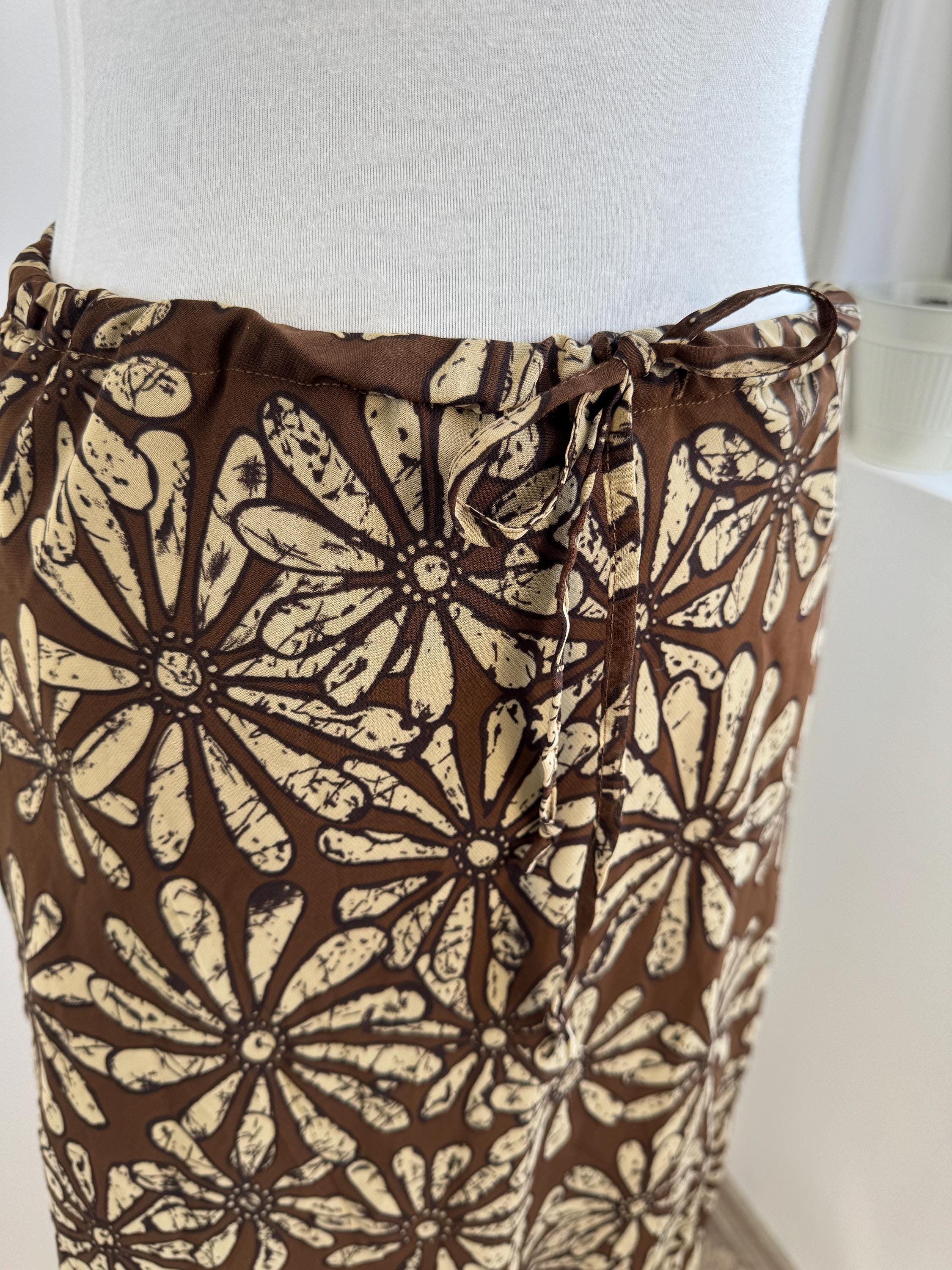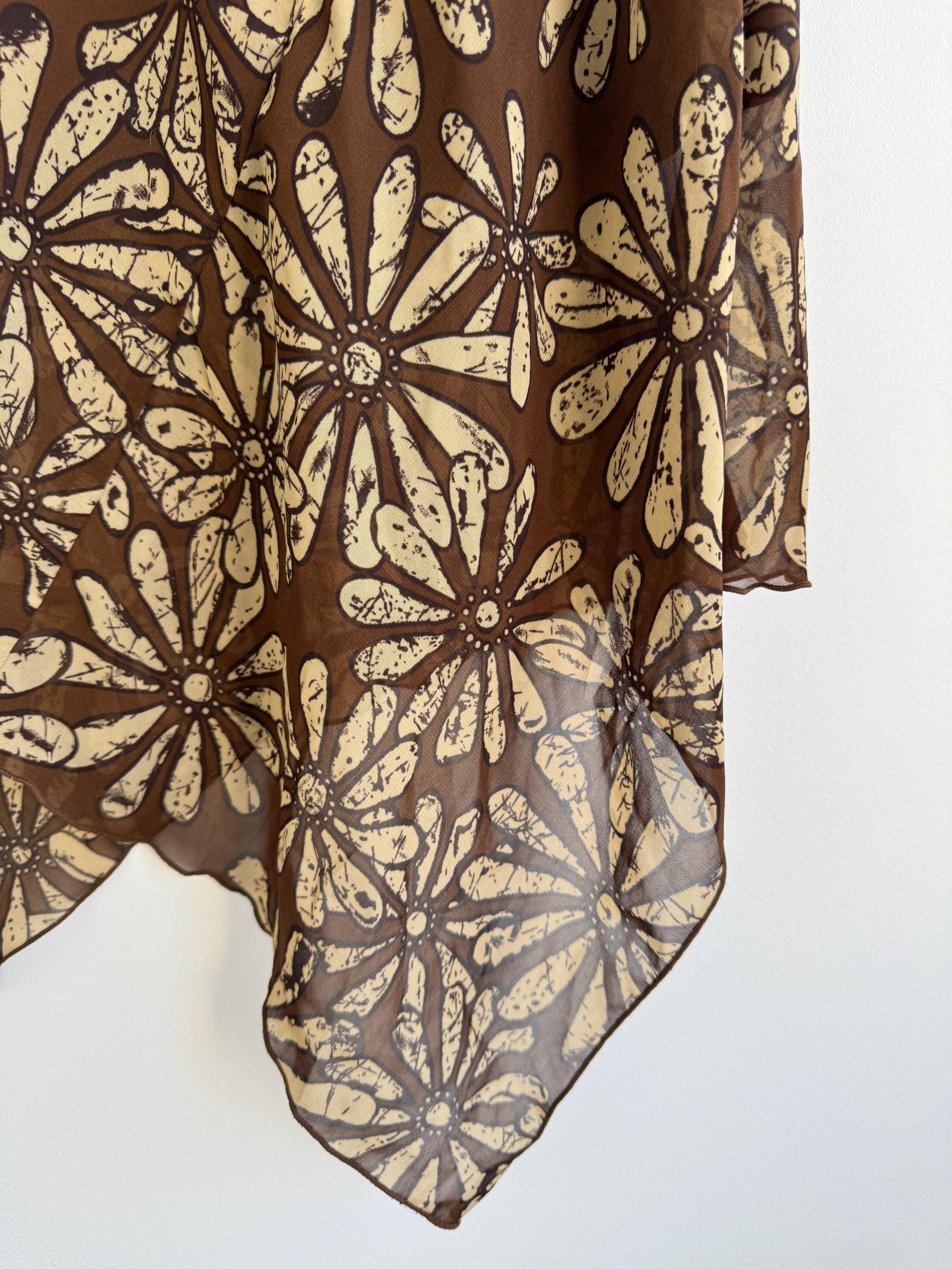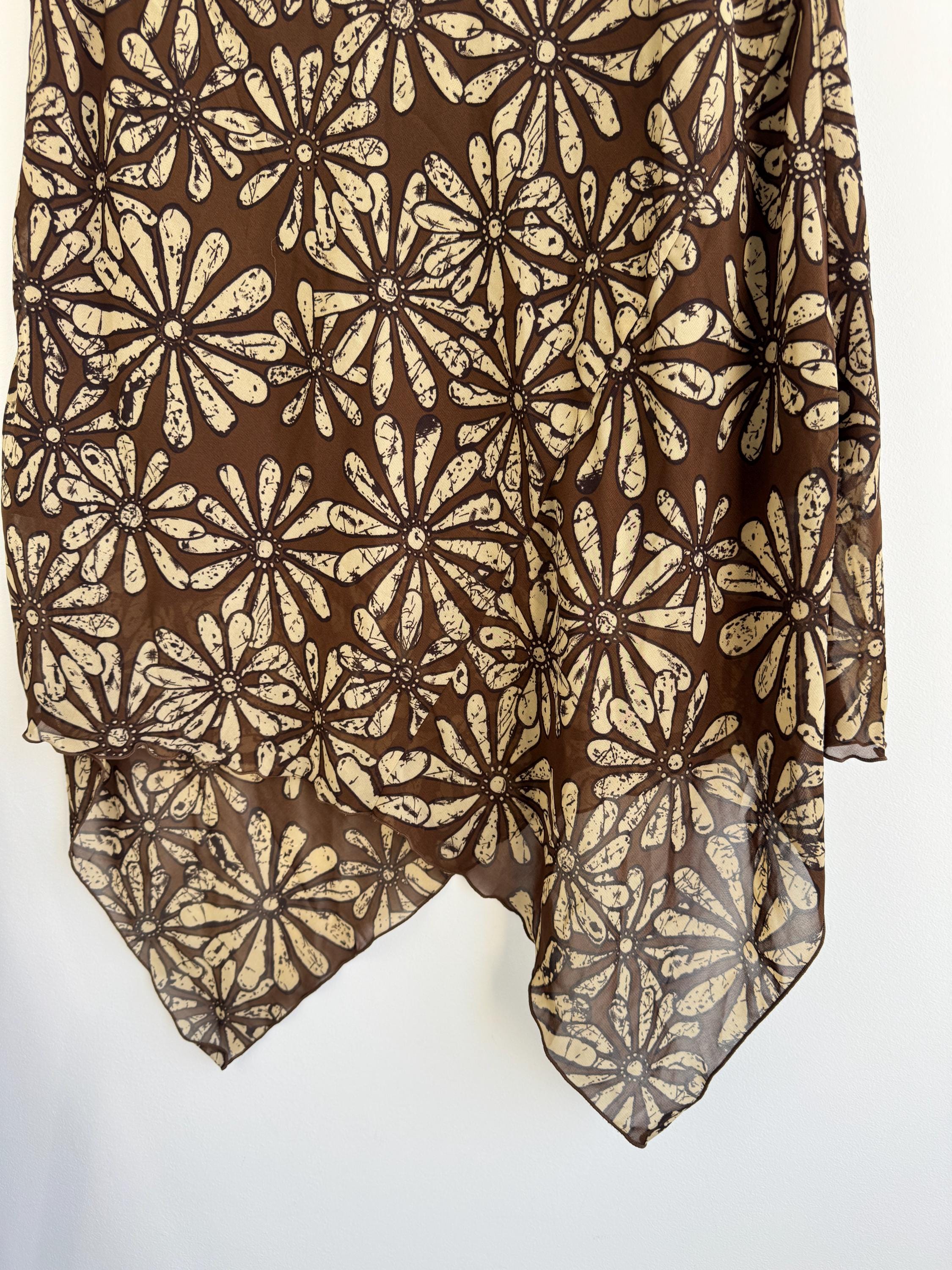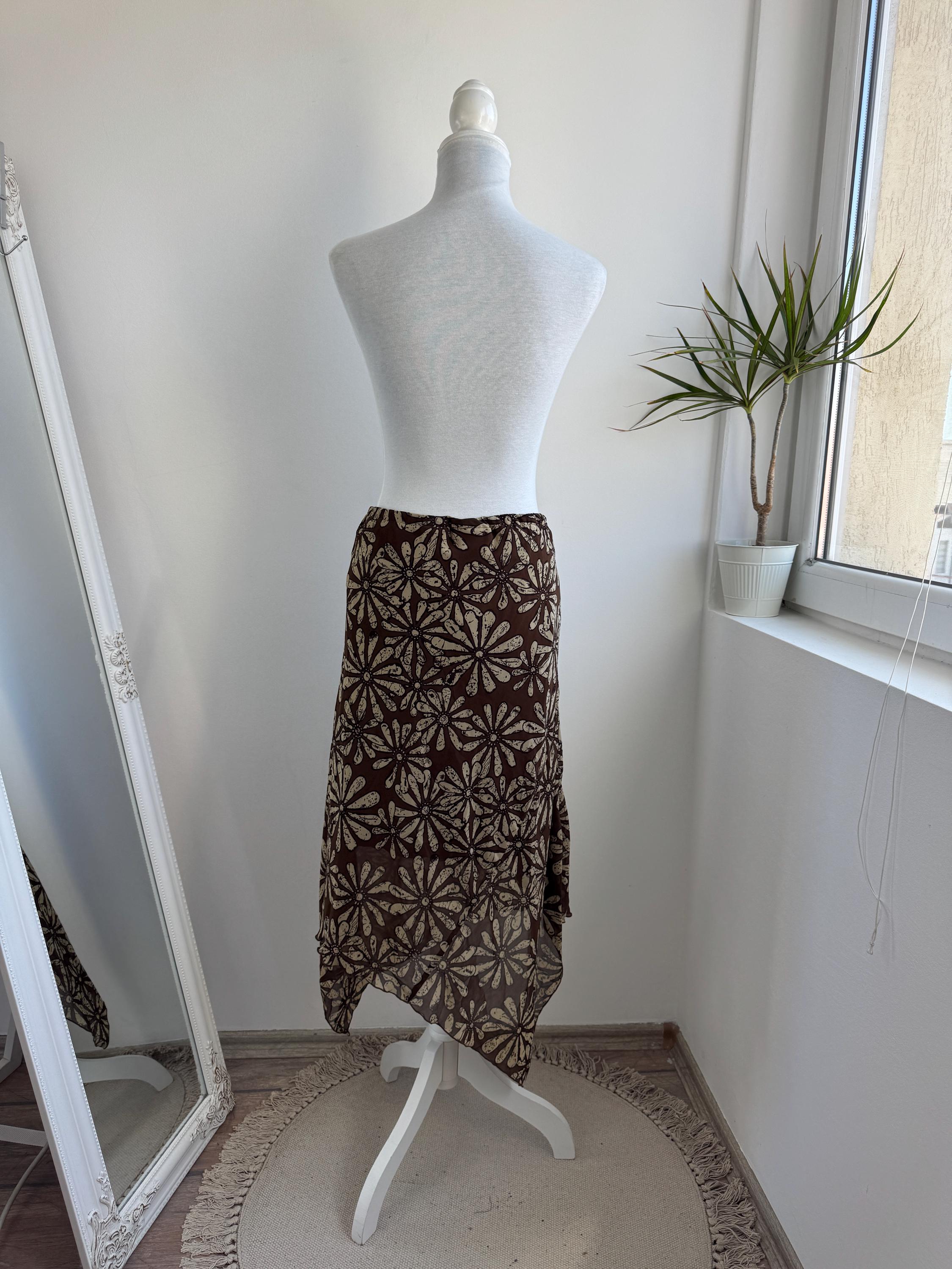 Bring a touch of effortless retro charm to your summer wardrobe with this stunning vintage H&M mesh skirt. Featuring a rich chocolate brown base adorned with a bold, cream-colored floral print, this sheer asymmetrical skirt perfectly captures the earthy, bohemian aesthetic of the early 2000s. The double-layered design features a delicate, sheer mesh top layer that flows beautifully over a solid brown knee length lining lining, providing both comfort and a playful sense of movement.