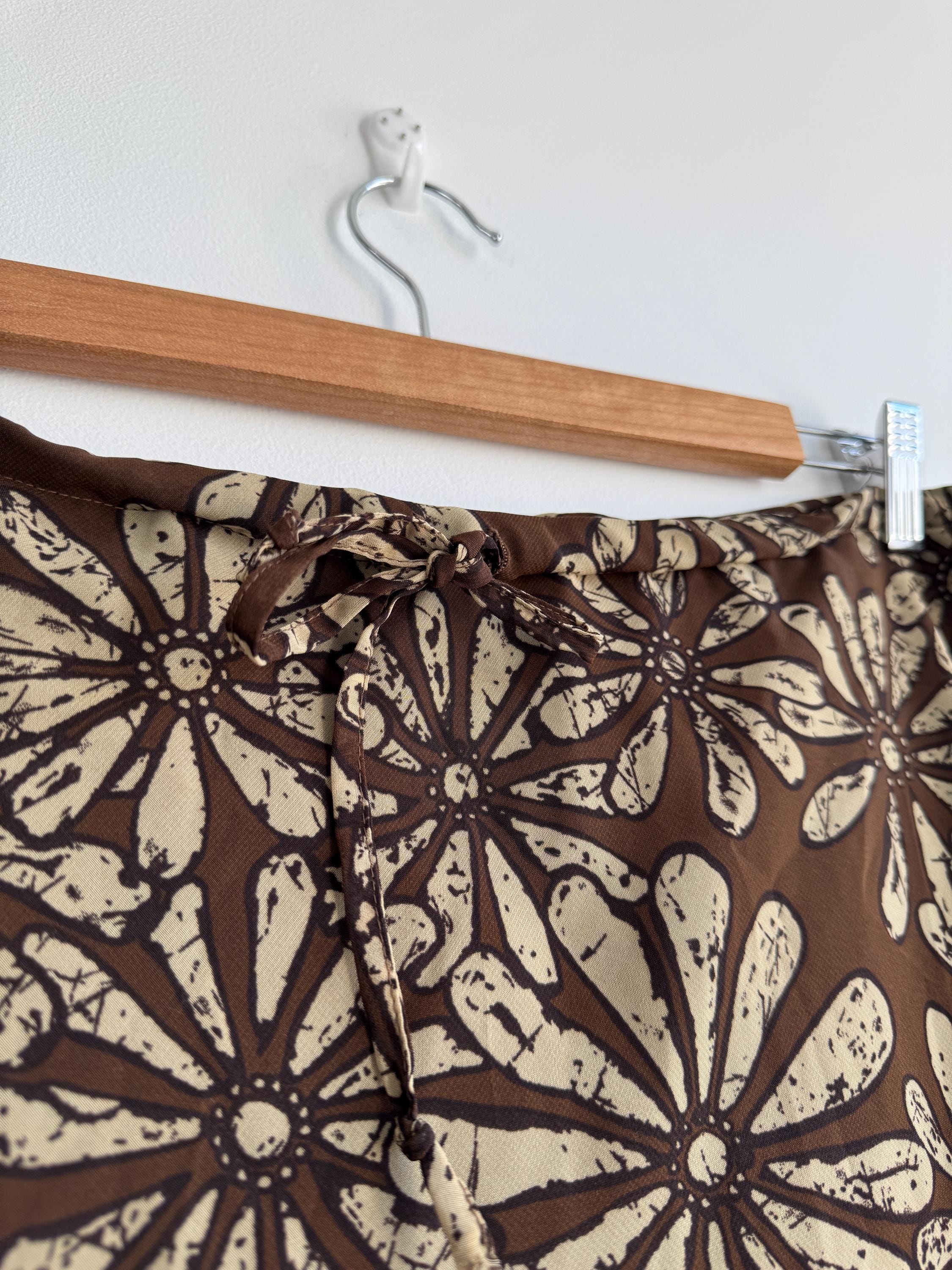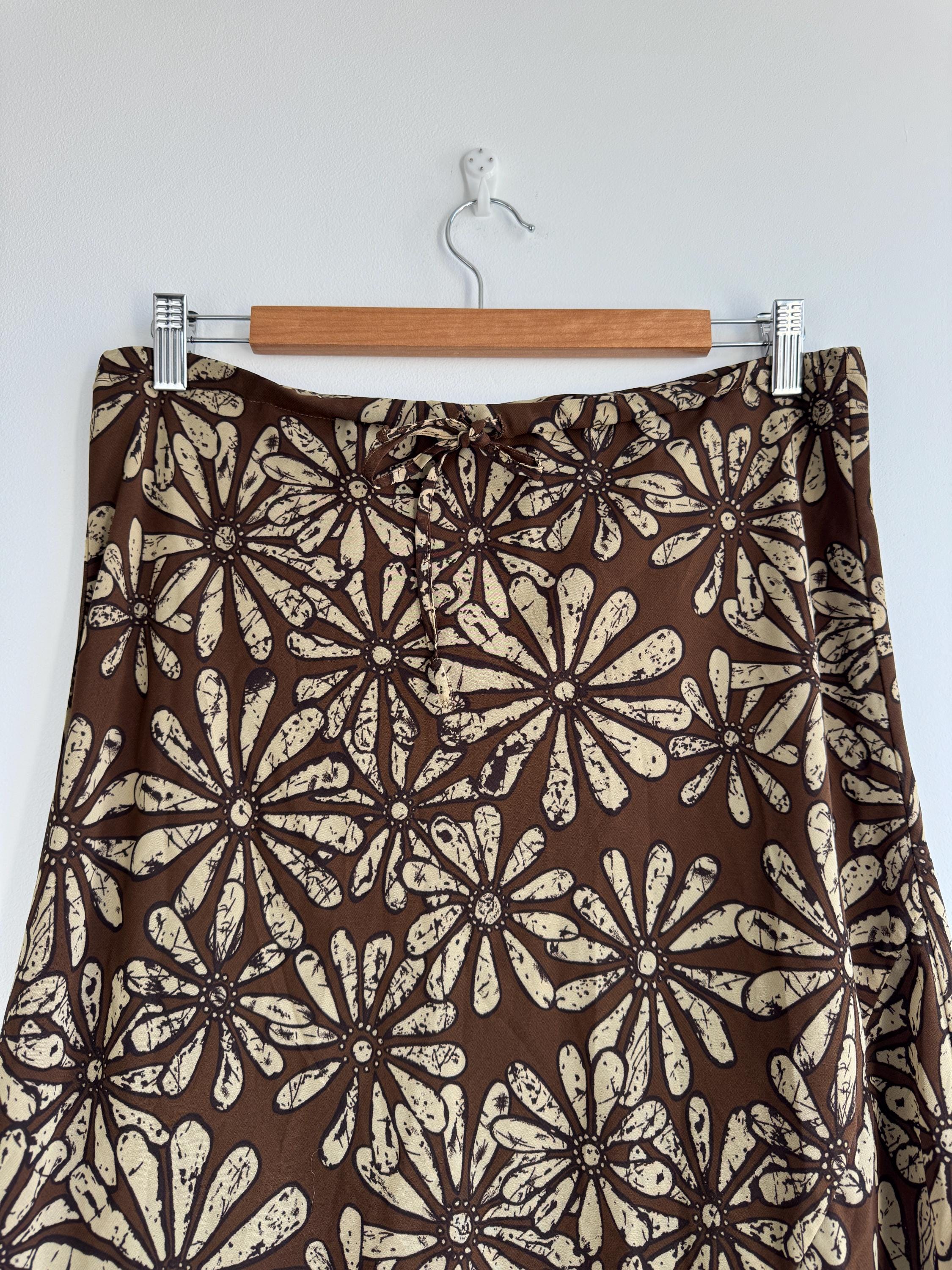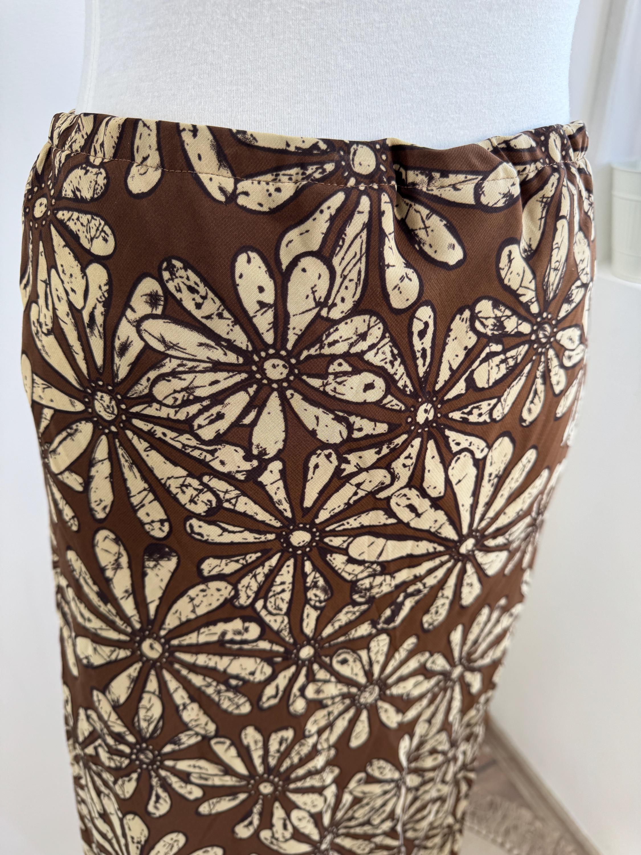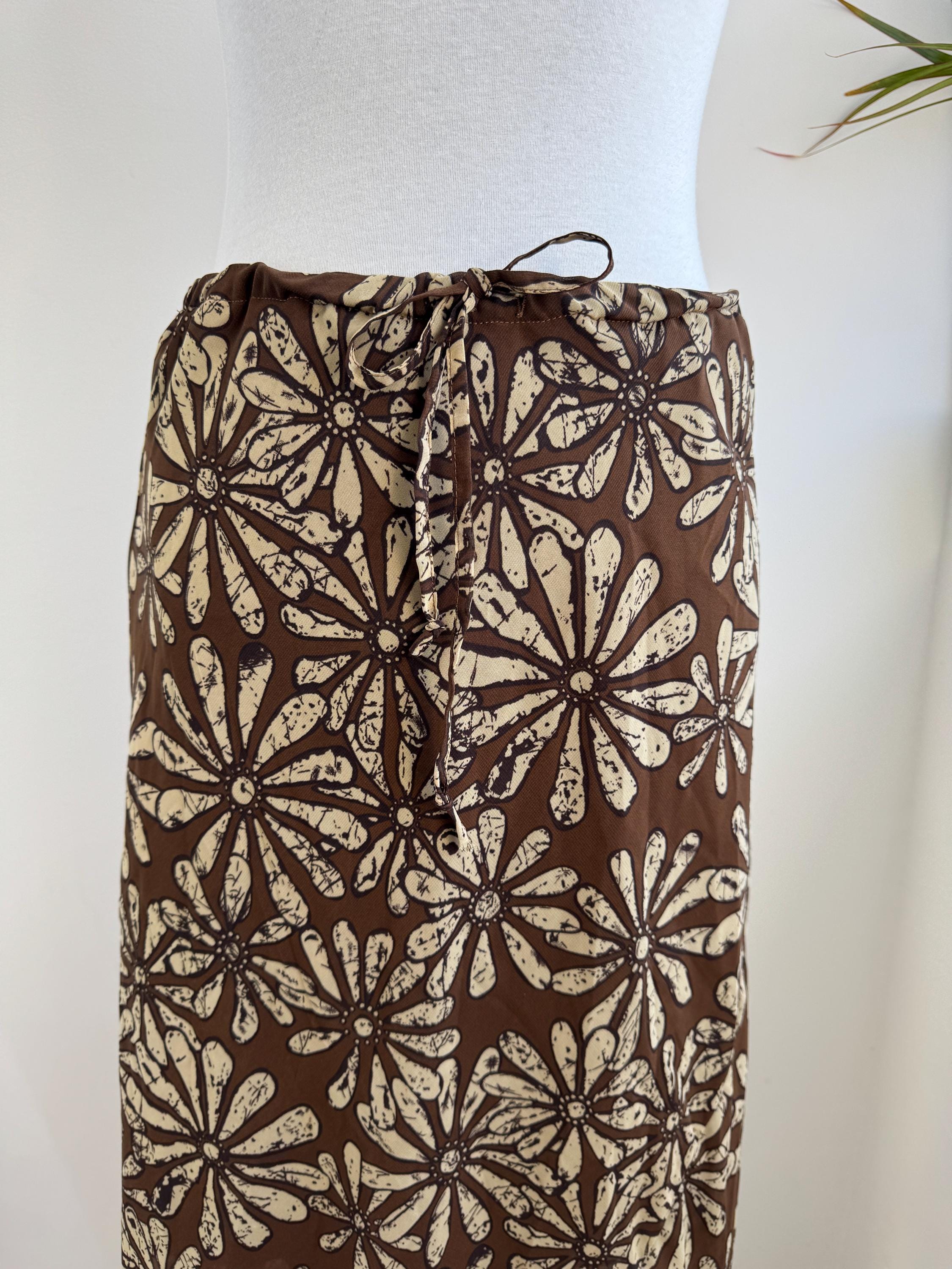 Bring a touch of effortless retro charm to your summer wardrobe with this stunning vintage H&M mesh skirt. Featuring a rich chocolate brown base adorned with a bold, cream-colored floral print, this sheer asymmetrical skirt perfectly captures the earthy, bohemian aesthetic of the early 2000s. The double-layered design features a delicate, sheer mesh top layer that flows beautifully over a solid brown knee length lining lining, providing both comfort and a playful sense of movement.