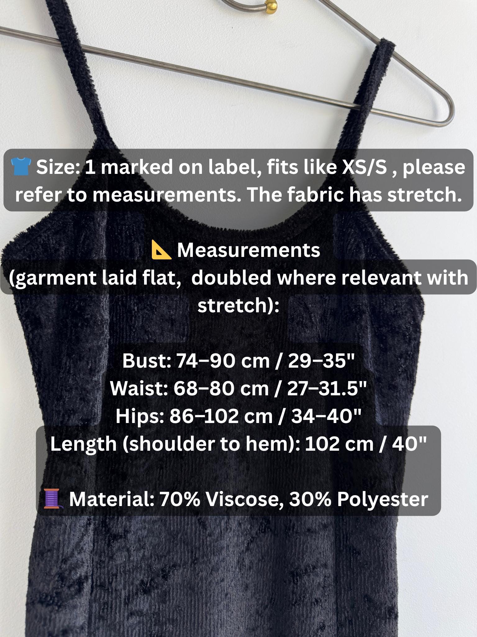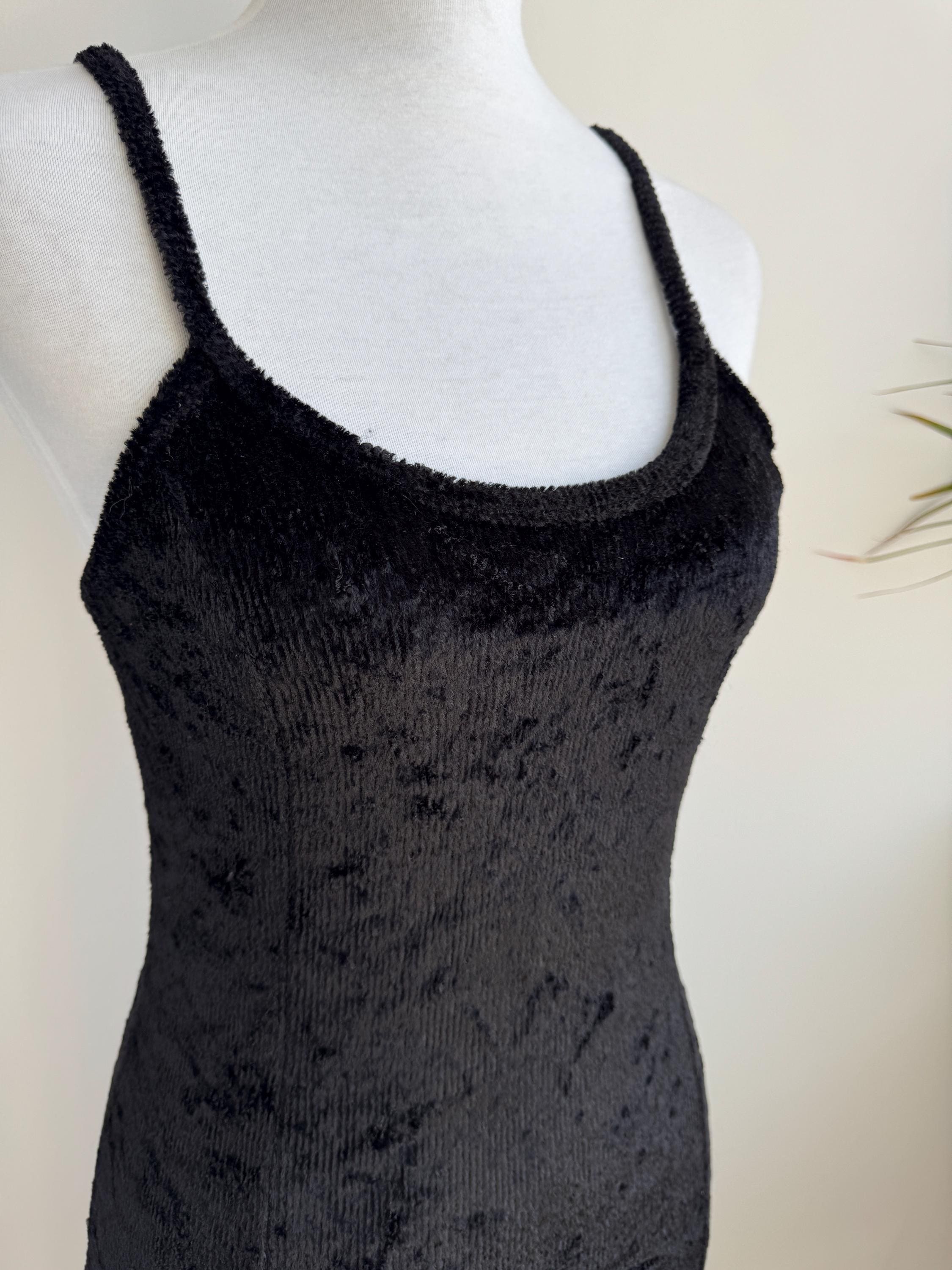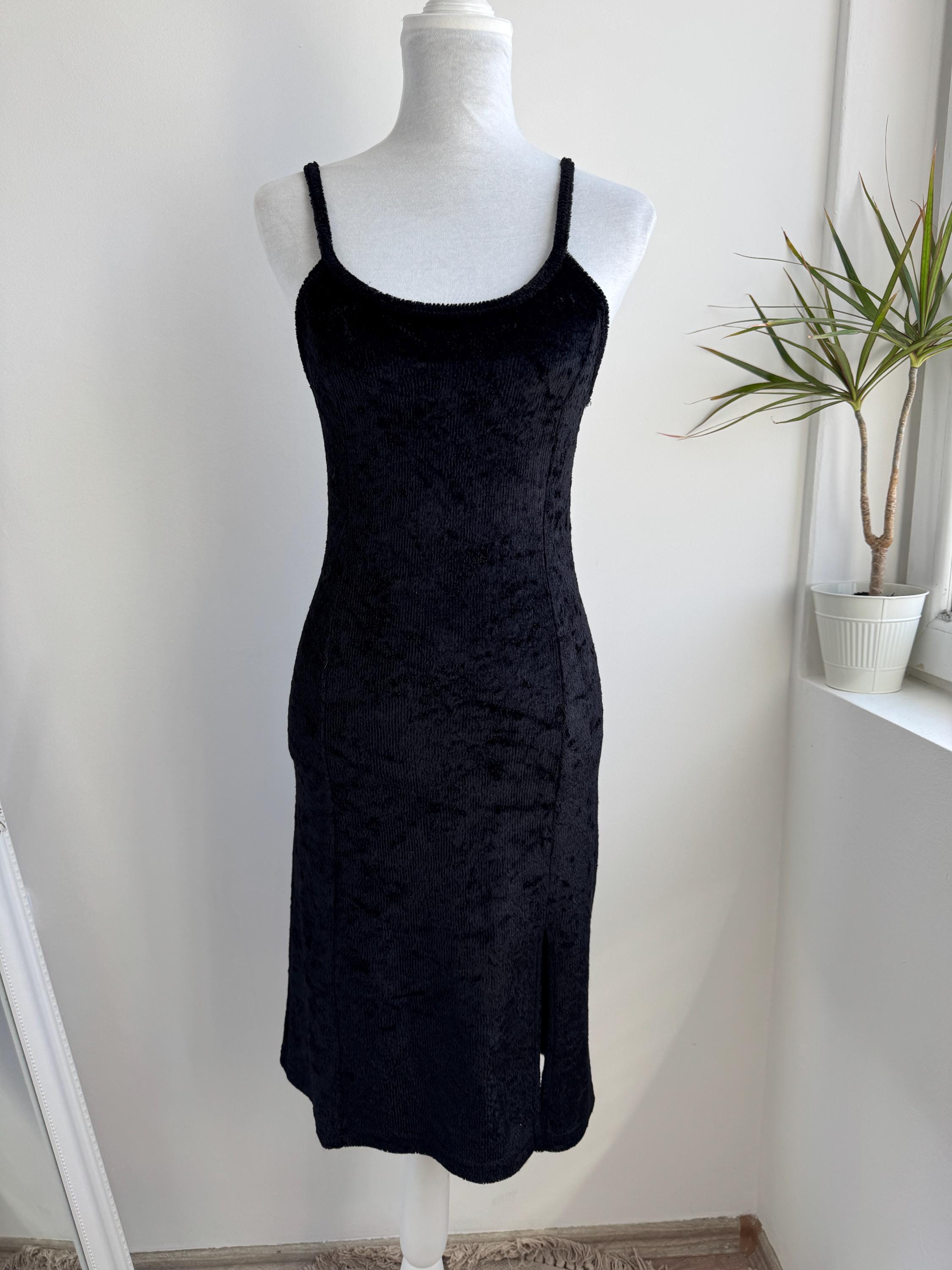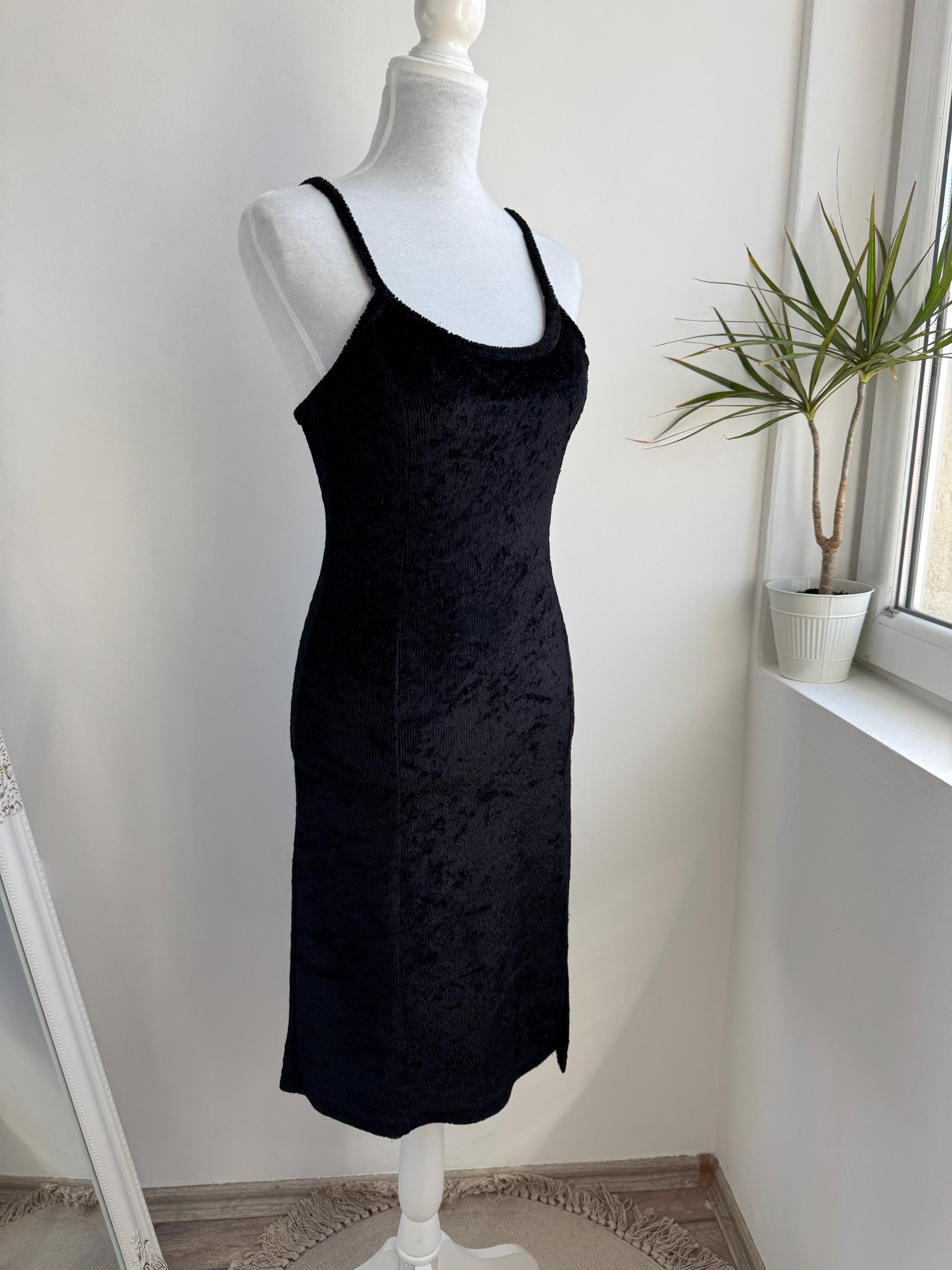 Step into the ultimate 90s evening aesthetic with this stunning black crushed velvet midi dress by Mad People Italia. This body-conscious slip-style dress features delicate spaghetti straps, a scoop neckline, and a figure-hugging silhouette that falls to a flattering midi length with a subtle side slit. The richly textured crushed velvet fabric — a hallmark of late 90s glamour — catches the light beautifully, making this velvet party dress effortlessly elegant for nights out, parties, or dressed-up occasions. Whether you're building a vintage-inspired capsule wardrobe or hunting for that one showstopping piece, this dress delivers old-school luxury in spades.