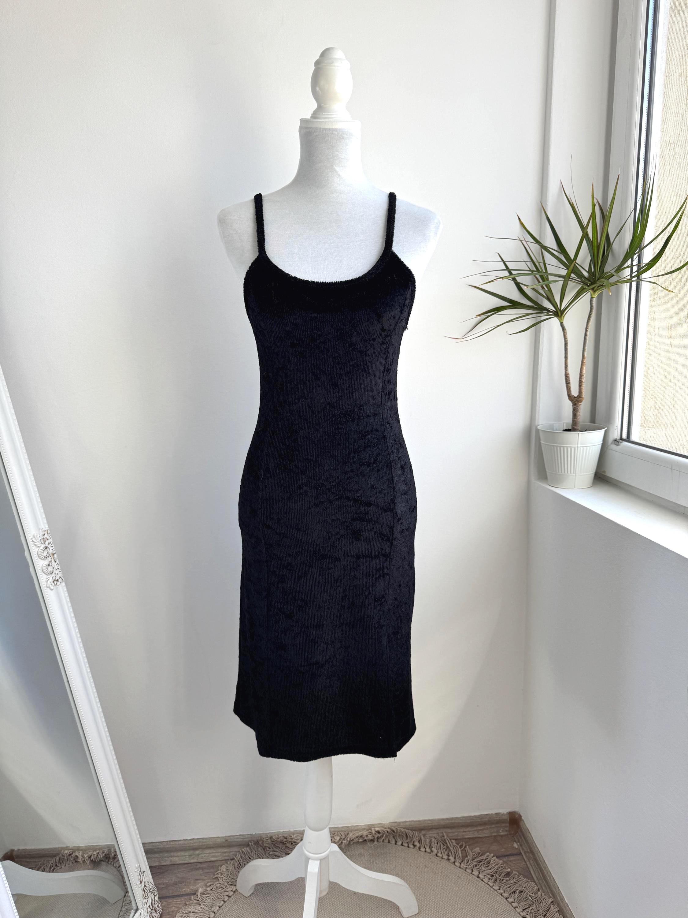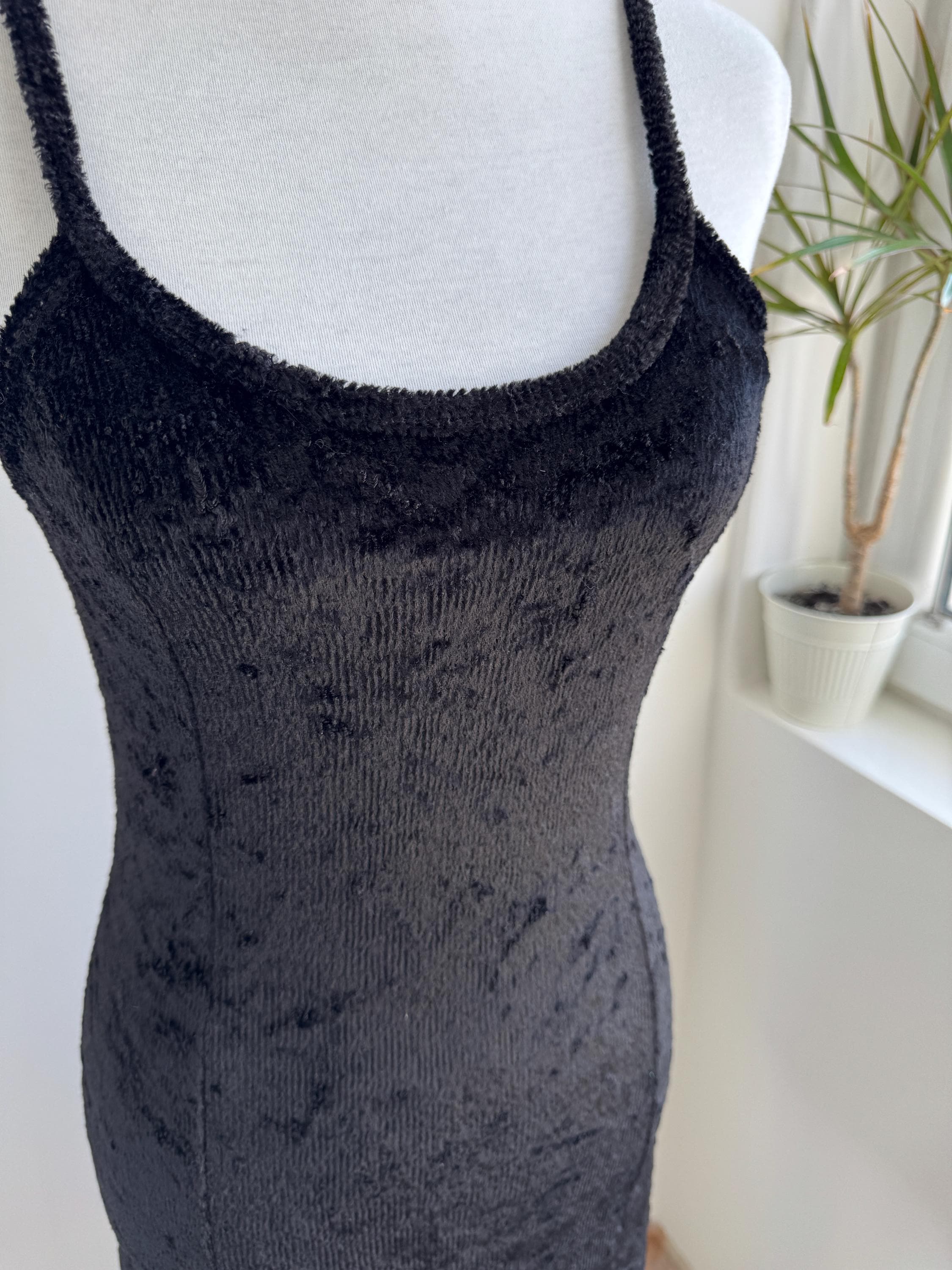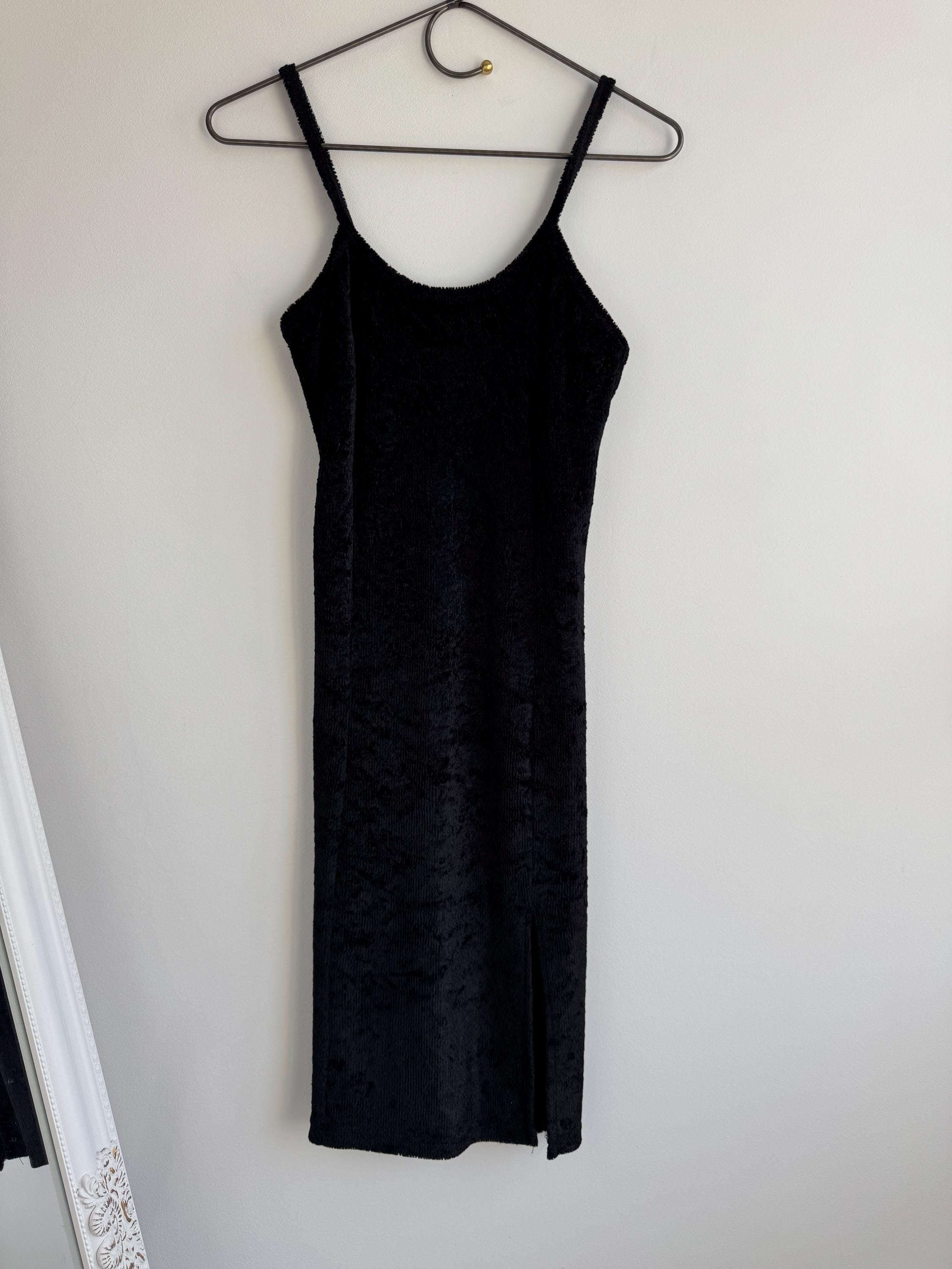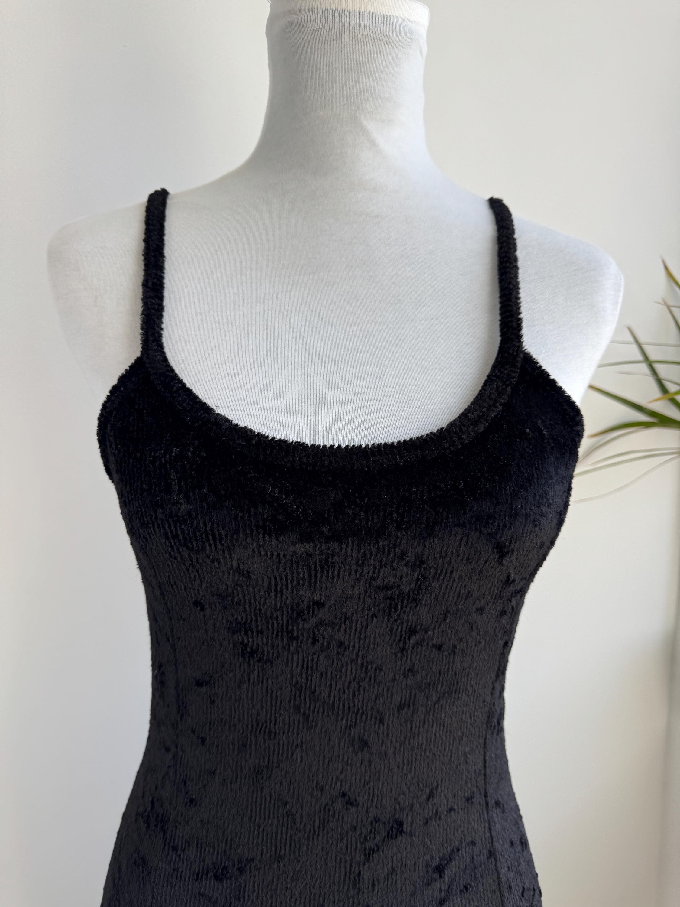 Step into the ultimate 90s evening aesthetic with this stunning black crushed velvet midi dress by Mad People Italia. This body-conscious slip-style dress features delicate spaghetti straps, a scoop neckline, and a figure-hugging silhouette that falls to a flattering midi length with a subtle side slit. The richly textured crushed velvet fabric — a hallmark of late 90s glamour — catches the light beautifully, making this velvet party dress effortlessly elegant for nights out, parties, or dressed-up occasions. Whether you're building a vintage-inspired capsule wardrobe or hunting for that one showstopping piece, this dress delivers old-school luxury in spades.