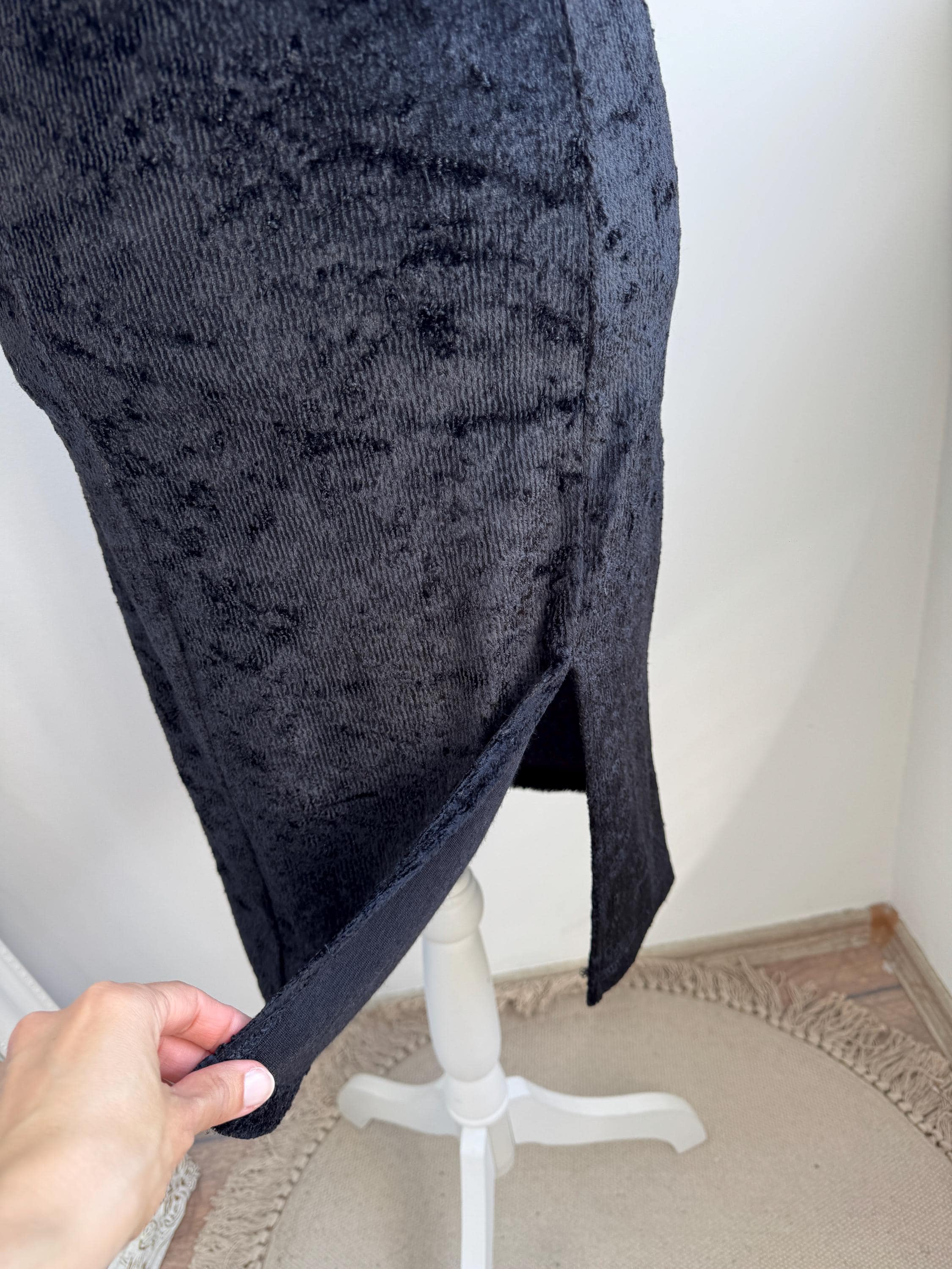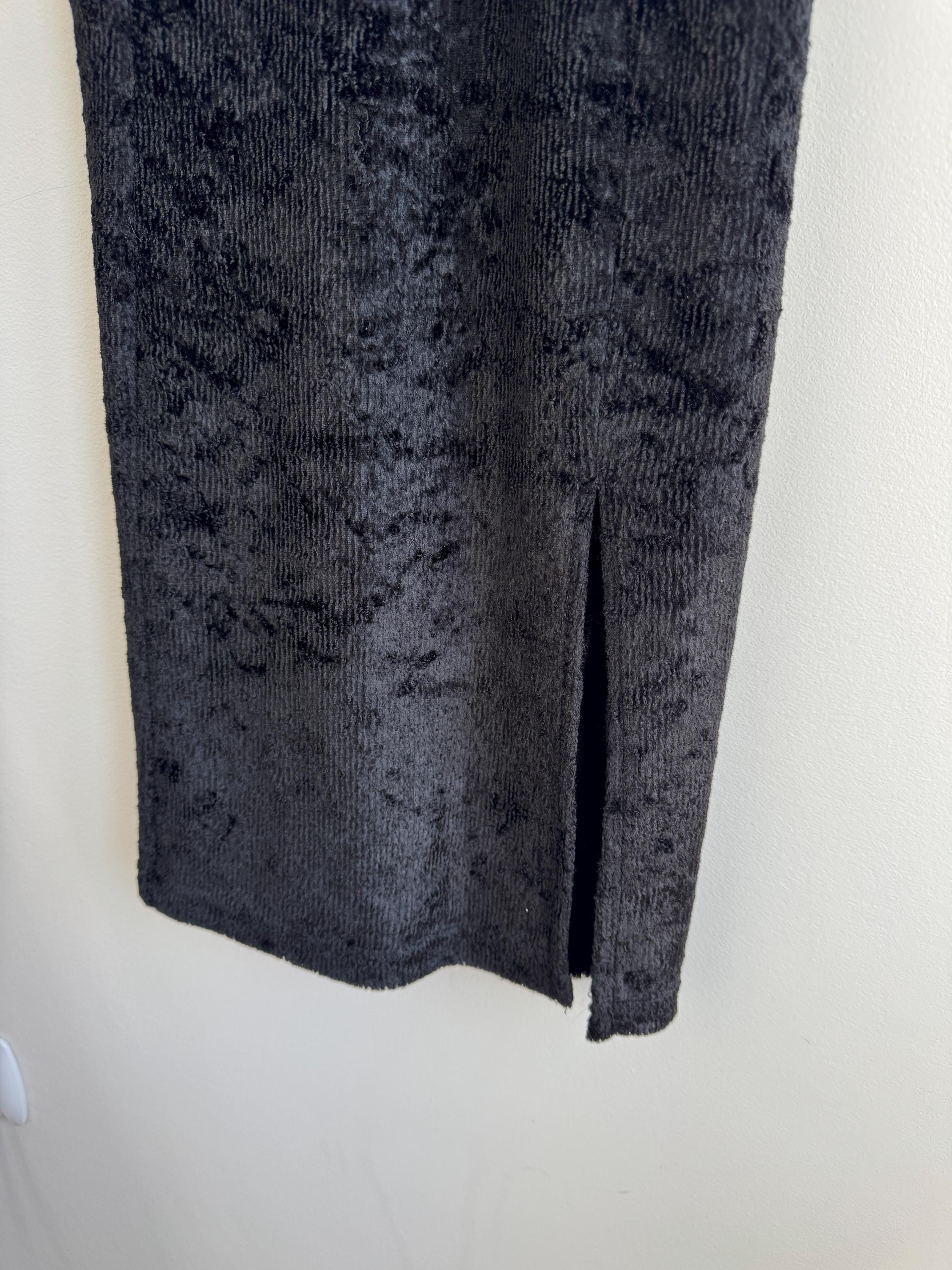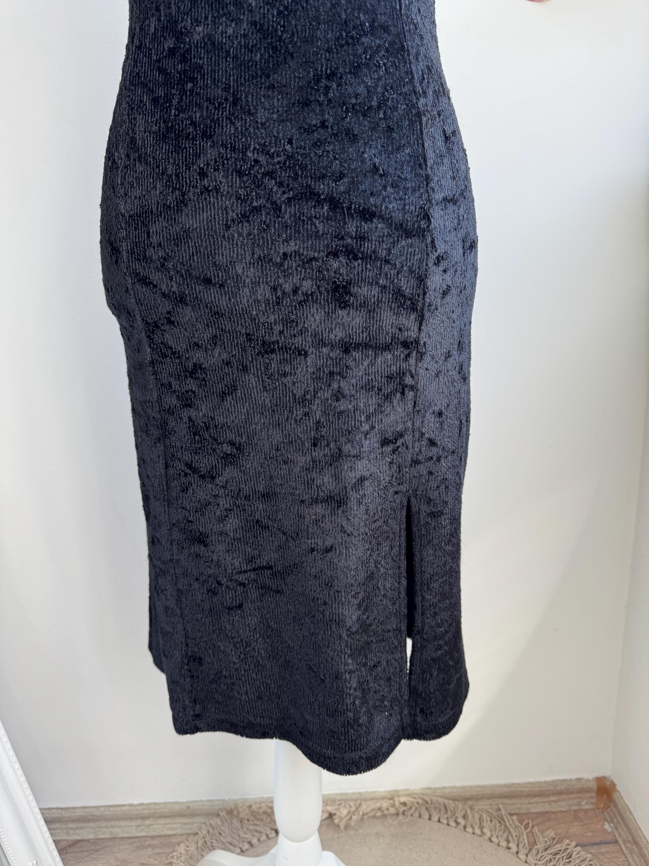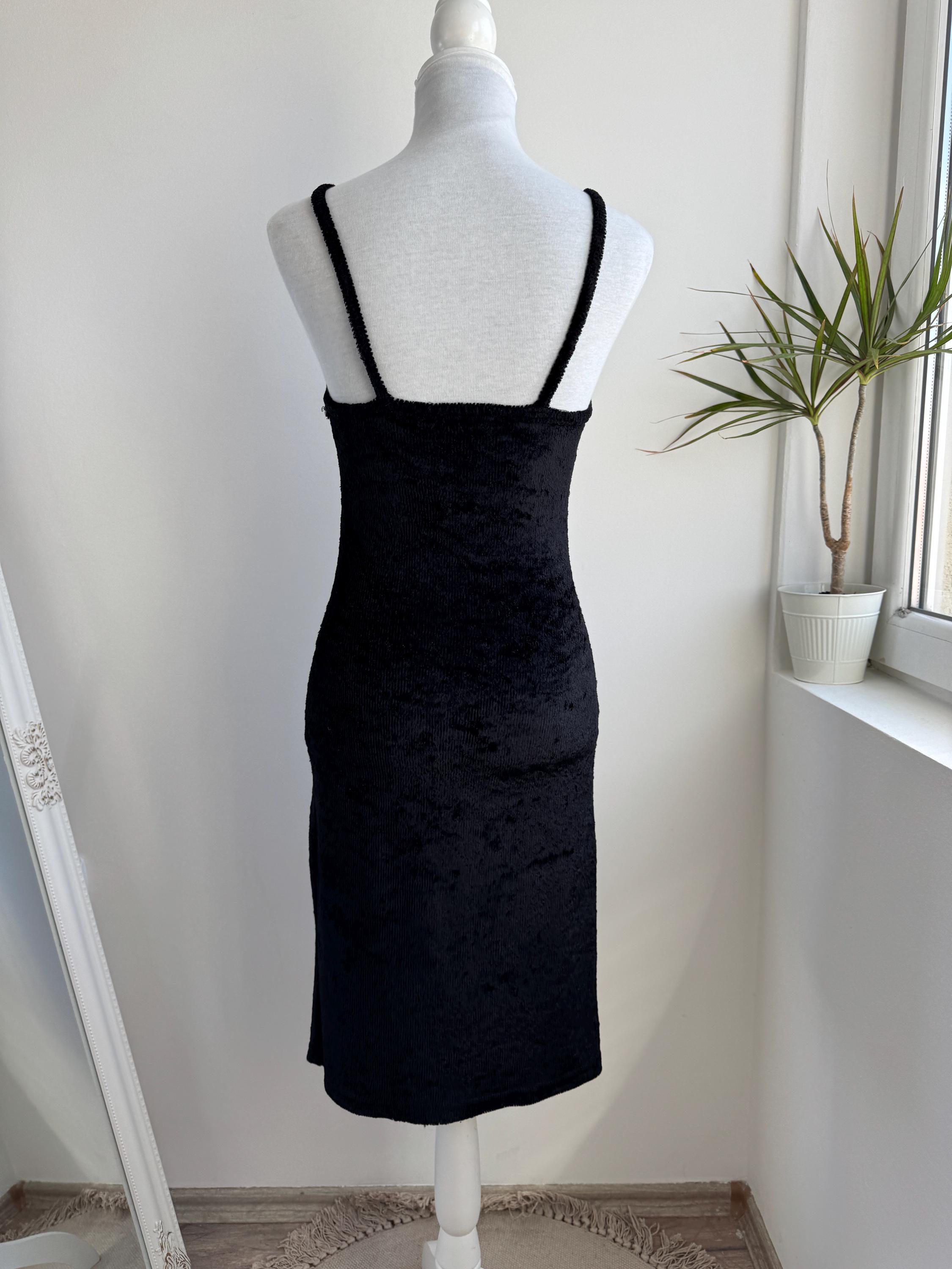 Step into the ultimate 90s evening aesthetic with this stunning black crushed velvet midi dress by Mad People Italia. This body-conscious slip-style dress features delicate spaghetti straps, a scoop neckline, and a figure-hugging silhouette that falls to a flattering midi length with a subtle side slit. The richly textured crushed velvet fabric — a hallmark of late 90s glamour — catches the light beautifully, making this velvet party dress effortlessly elegant for nights out, parties, or dressed-up occasions. Whether you're building a vintage-inspired capsule wardrobe or hunting for that one showstopping piece, this dress delivers old-school luxury in spades.