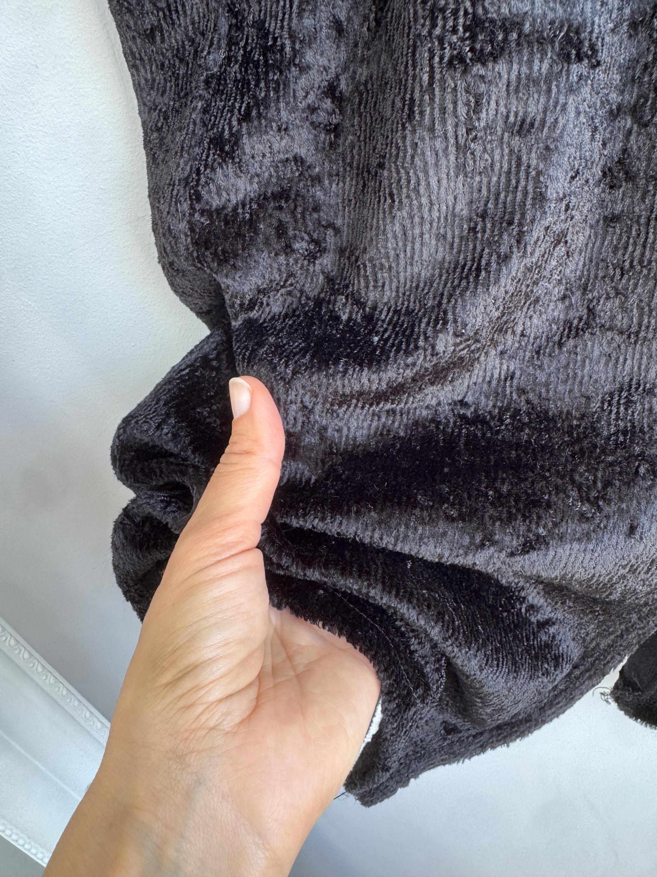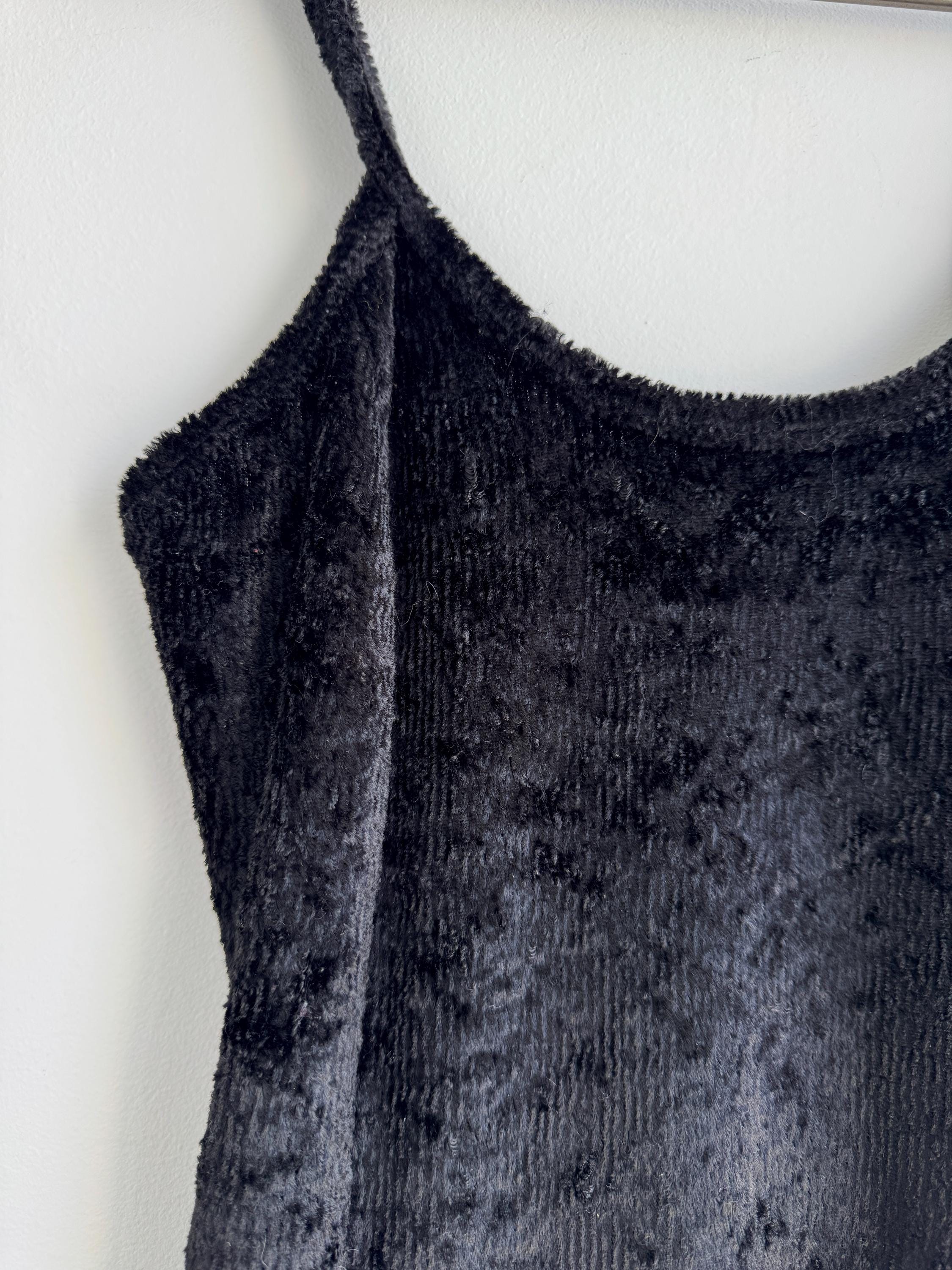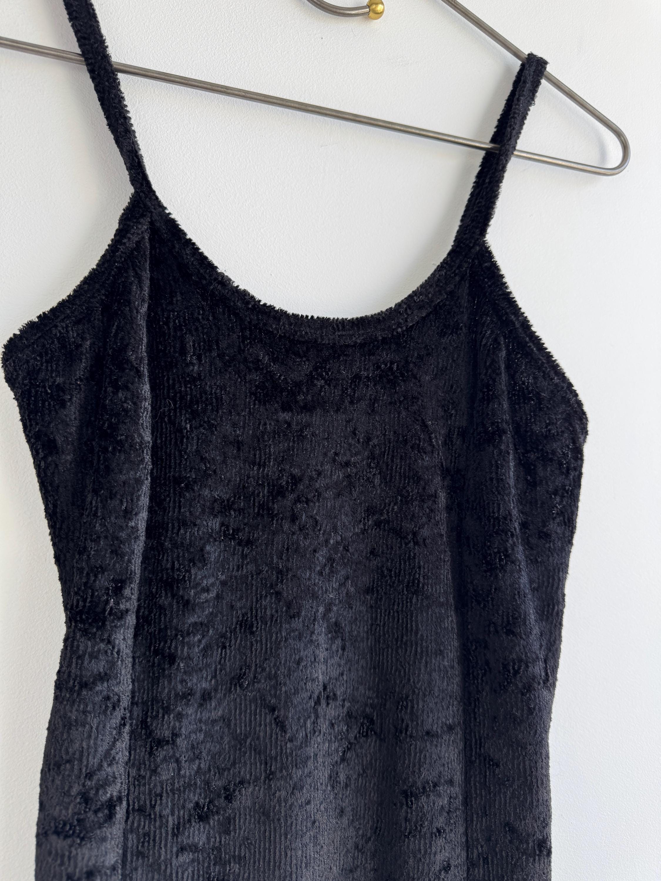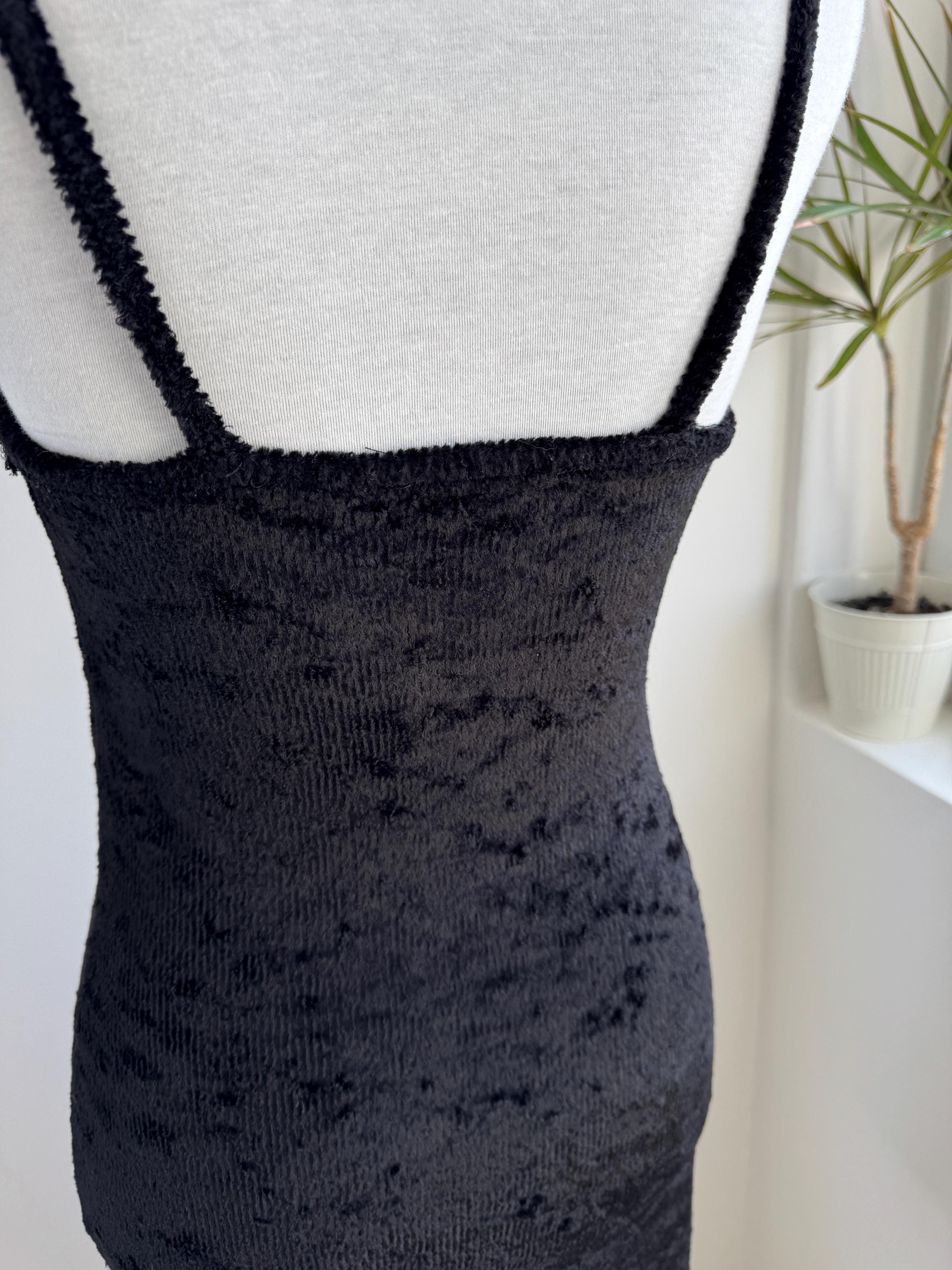 Step into the ultimate 90s evening aesthetic with this stunning black crushed velvet midi dress by Mad People Italia. This body-conscious slip-style dress features delicate spaghetti straps, a scoop neckline, and a figure-hugging silhouette that falls to a flattering midi length with a subtle side slit. The richly textured crushed velvet fabric — a hallmark of late 90s glamour — catches the light beautifully, making this velvet party dress effortlessly elegant for nights out, parties, or dressed-up occasions. Whether you're building a vintage-inspired capsule wardrobe or hunting for that one showstopping piece, this dress delivers old-school luxury in spades.