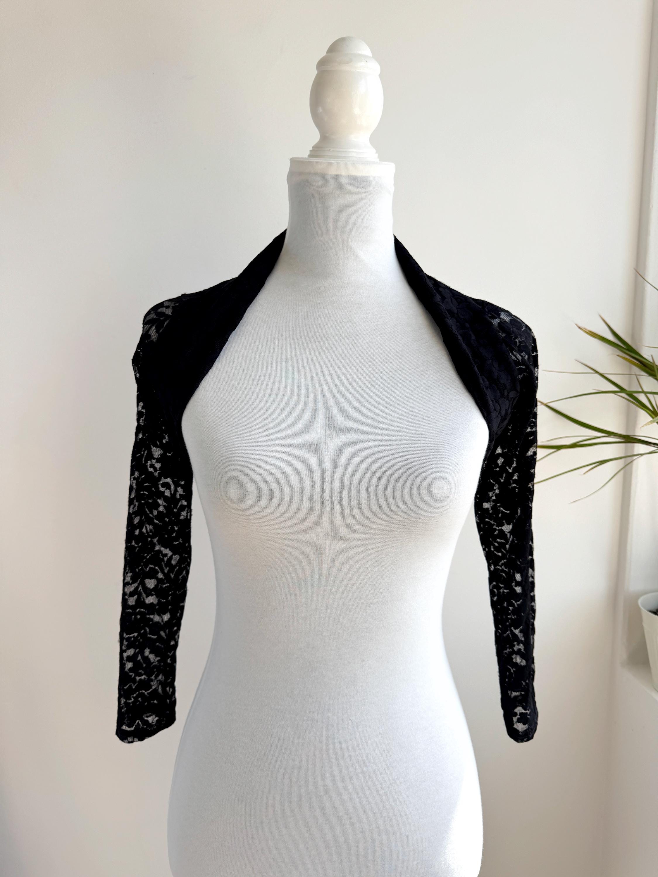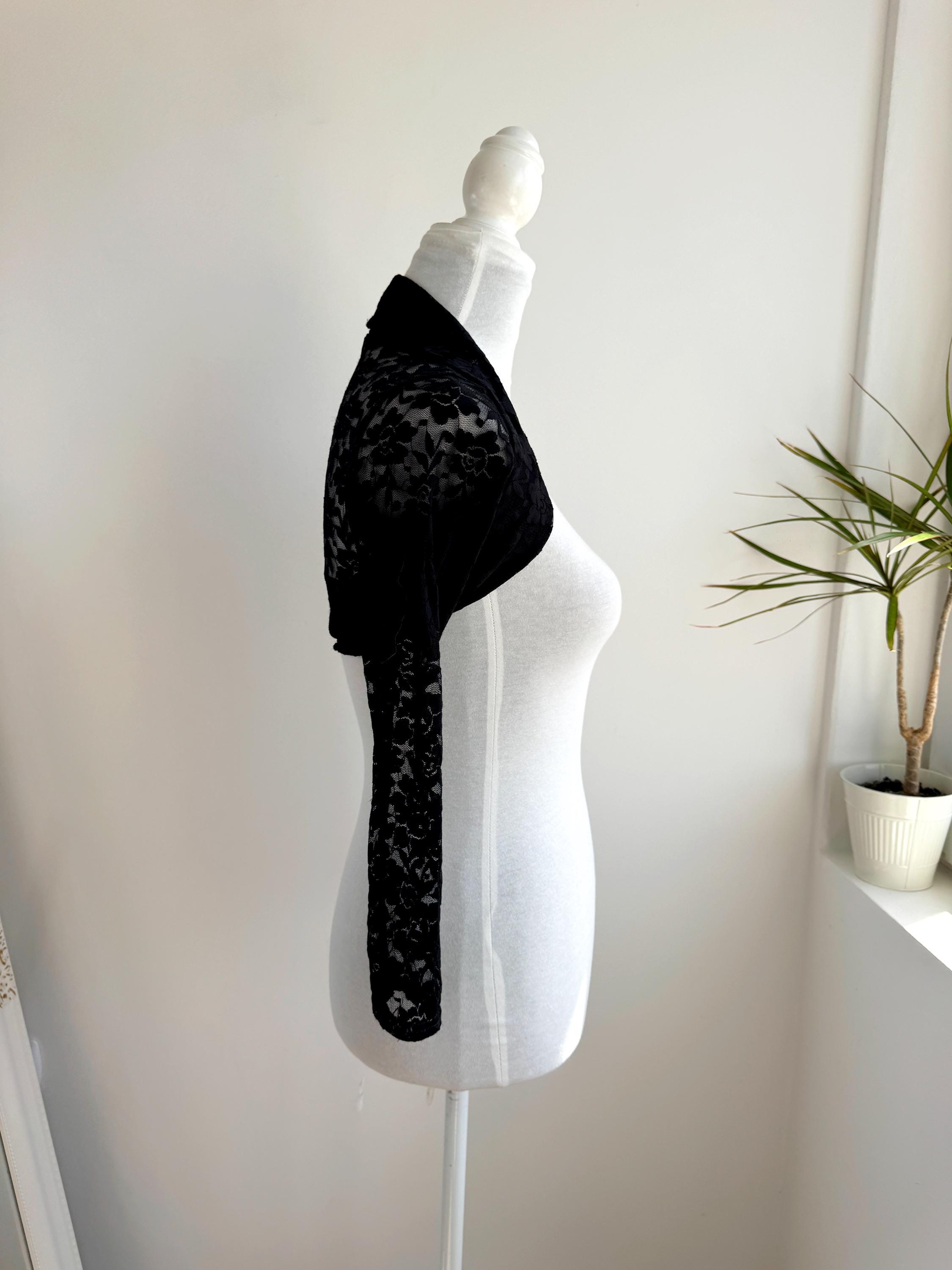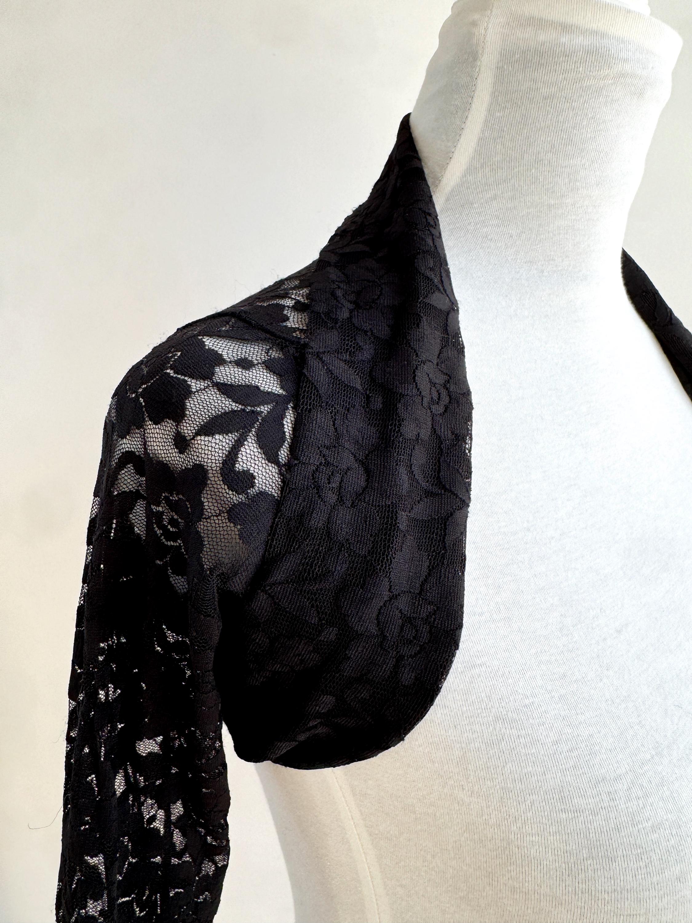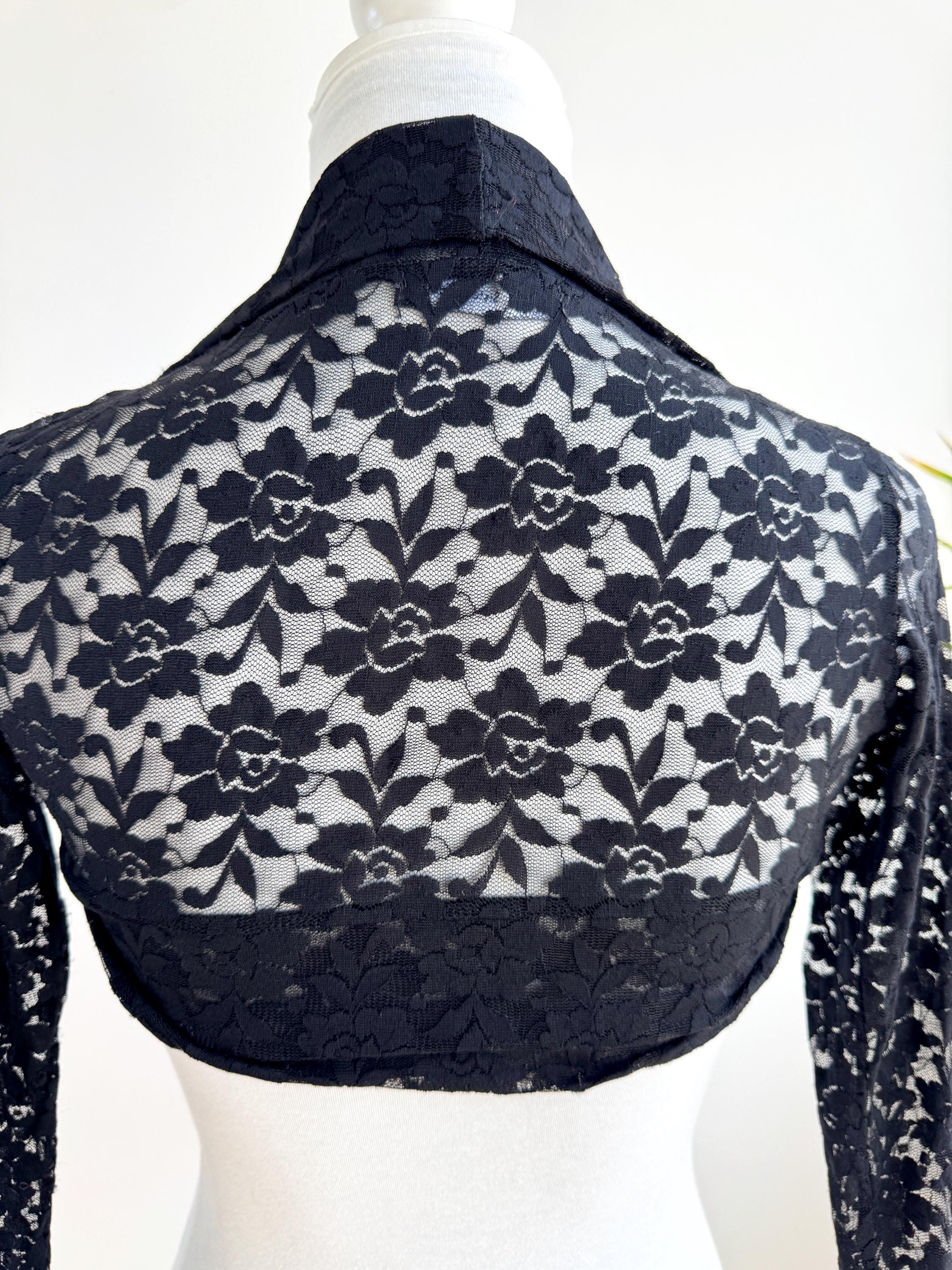 This elegant vintage Y2K black lace bolero shrug is a stunning little layering piece that works beautifully over a strapless dress, slip dress, or bodycon for weddings, parties, proms, and formal occasions. The delicate all-over floral lace pattern gives it a romantic, feminine edge that feels equally at home in a vintage-inspired look or a modern evening outfit. The open-front cropped silhouette makes it incredibly versatile — throw it over a little black dress for an instant evening upgrade or style it with high-waisted trousers for a going-out look with a twist.