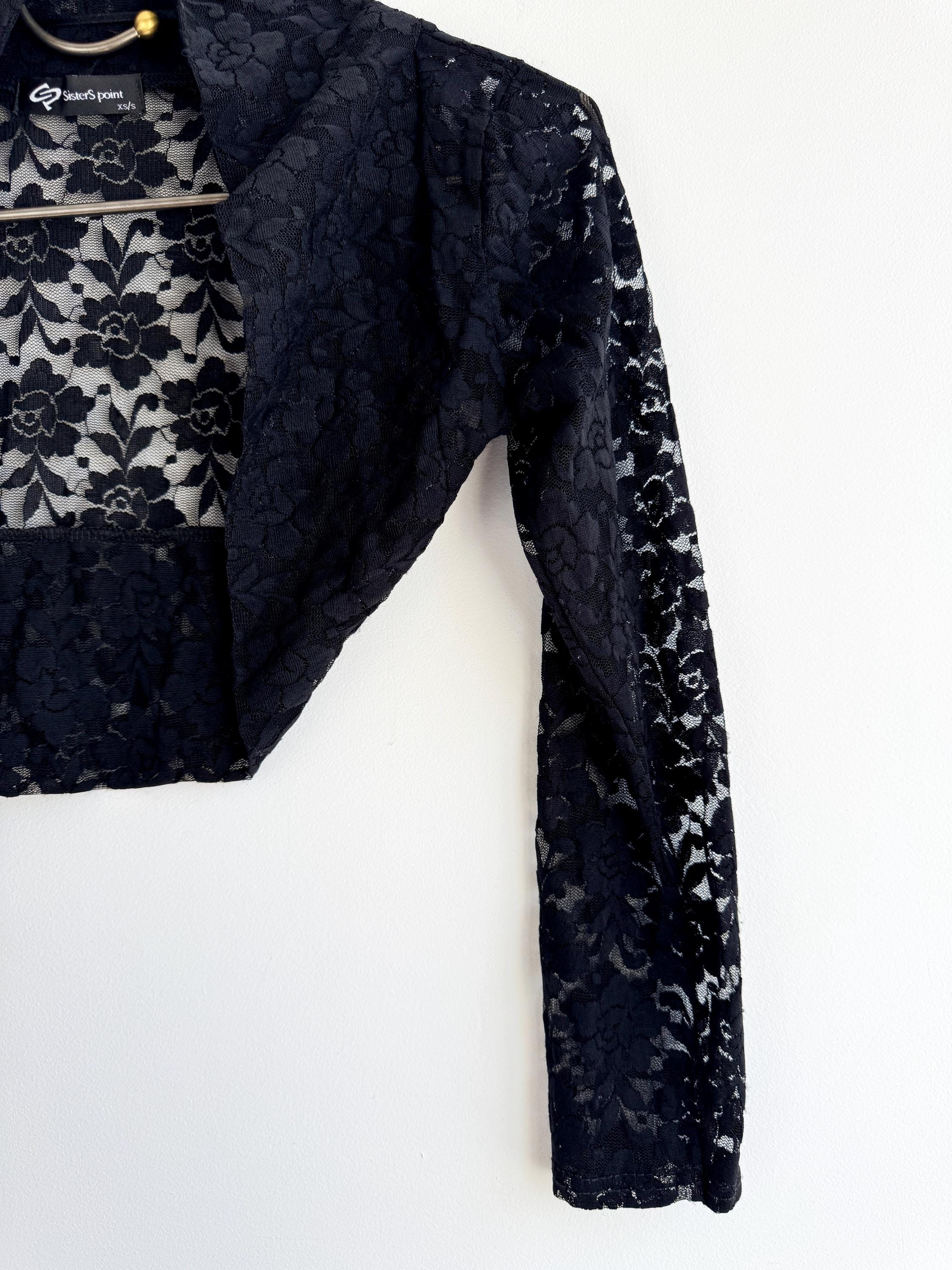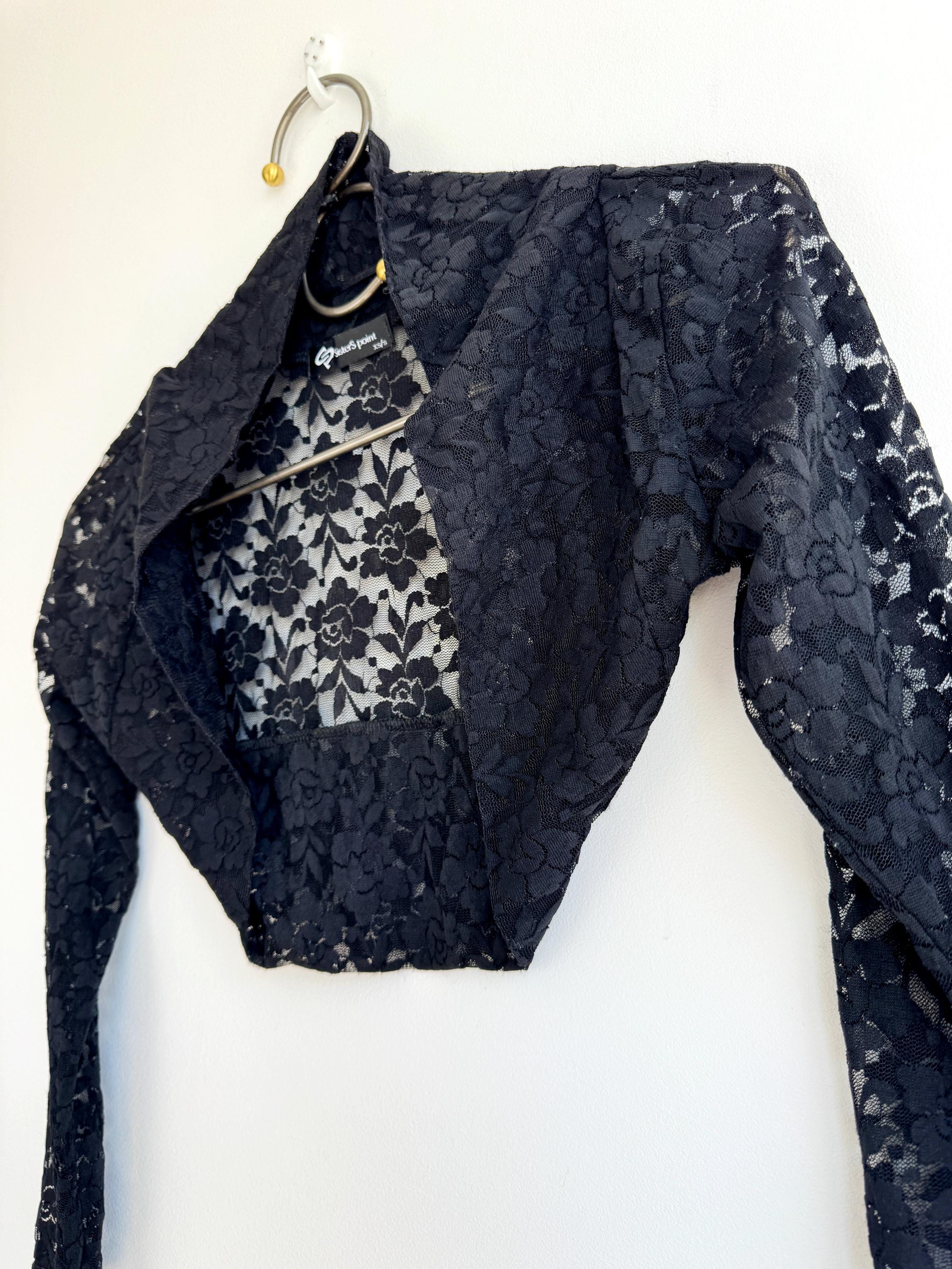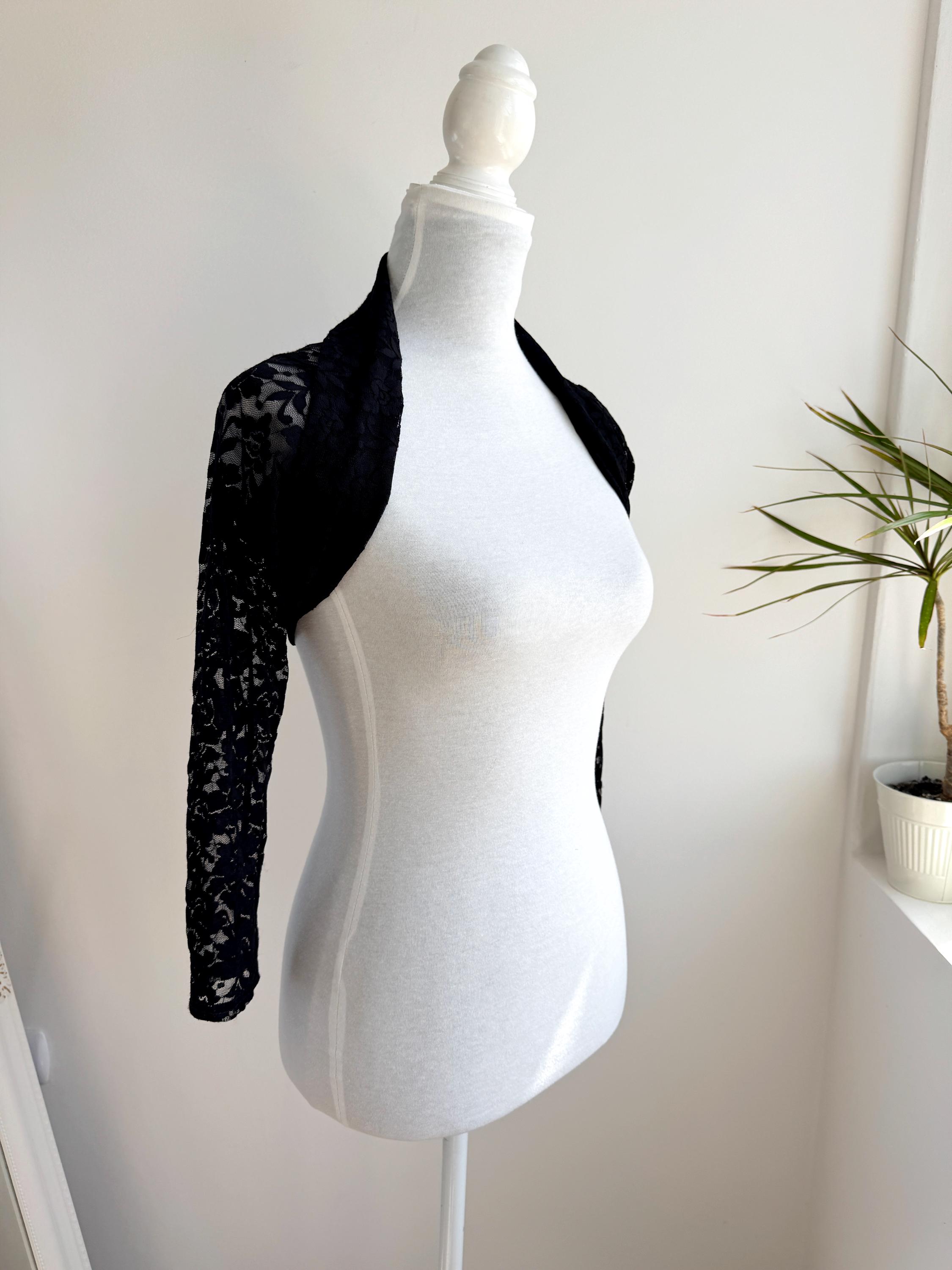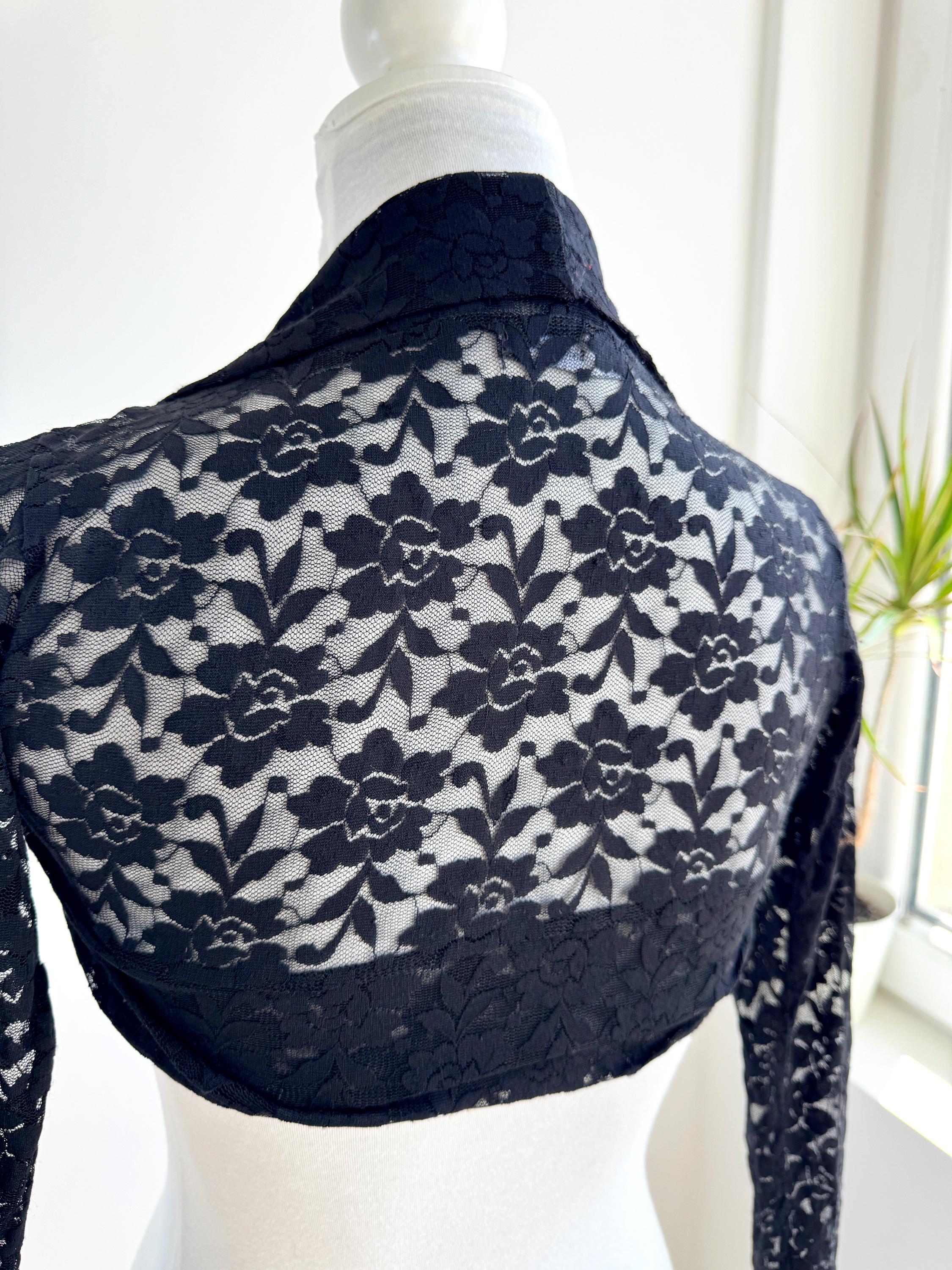 This elegant vintage Y2K black lace bolero shrug is a stunning little layering piece that works beautifully over a strapless dress, slip dress, or bodycon for weddings, parties, proms, and formal occasions. The delicate all-over floral lace pattern gives it a romantic, feminine edge that feels equally at home in a vintage-inspired look or a modern evening outfit. The open-front cropped silhouette makes it incredibly versatile — throw it over a little black dress for an instant evening upgrade or style it with high-waisted trousers for a going-out look with a twist.
