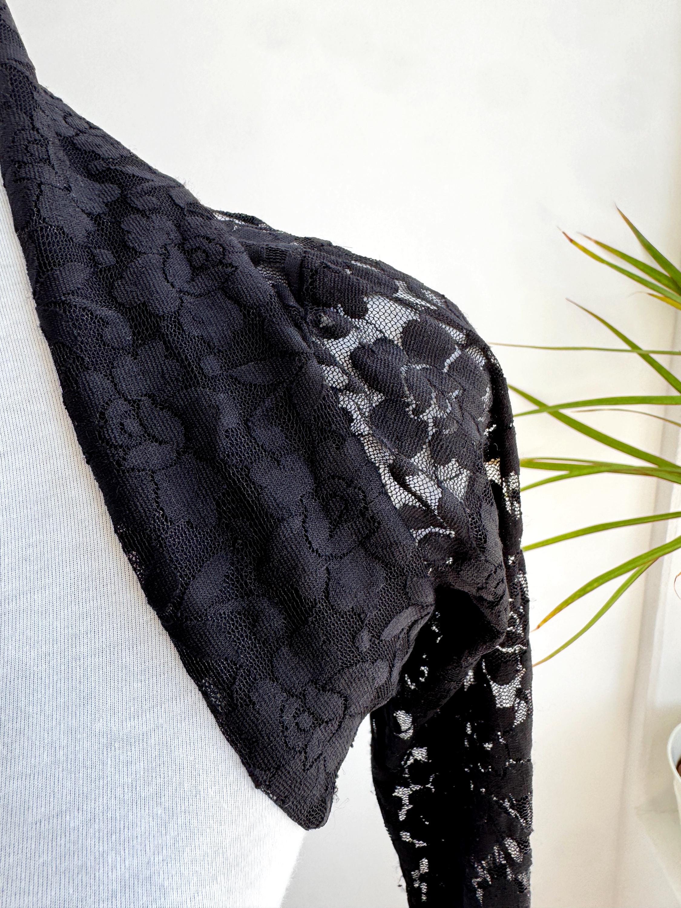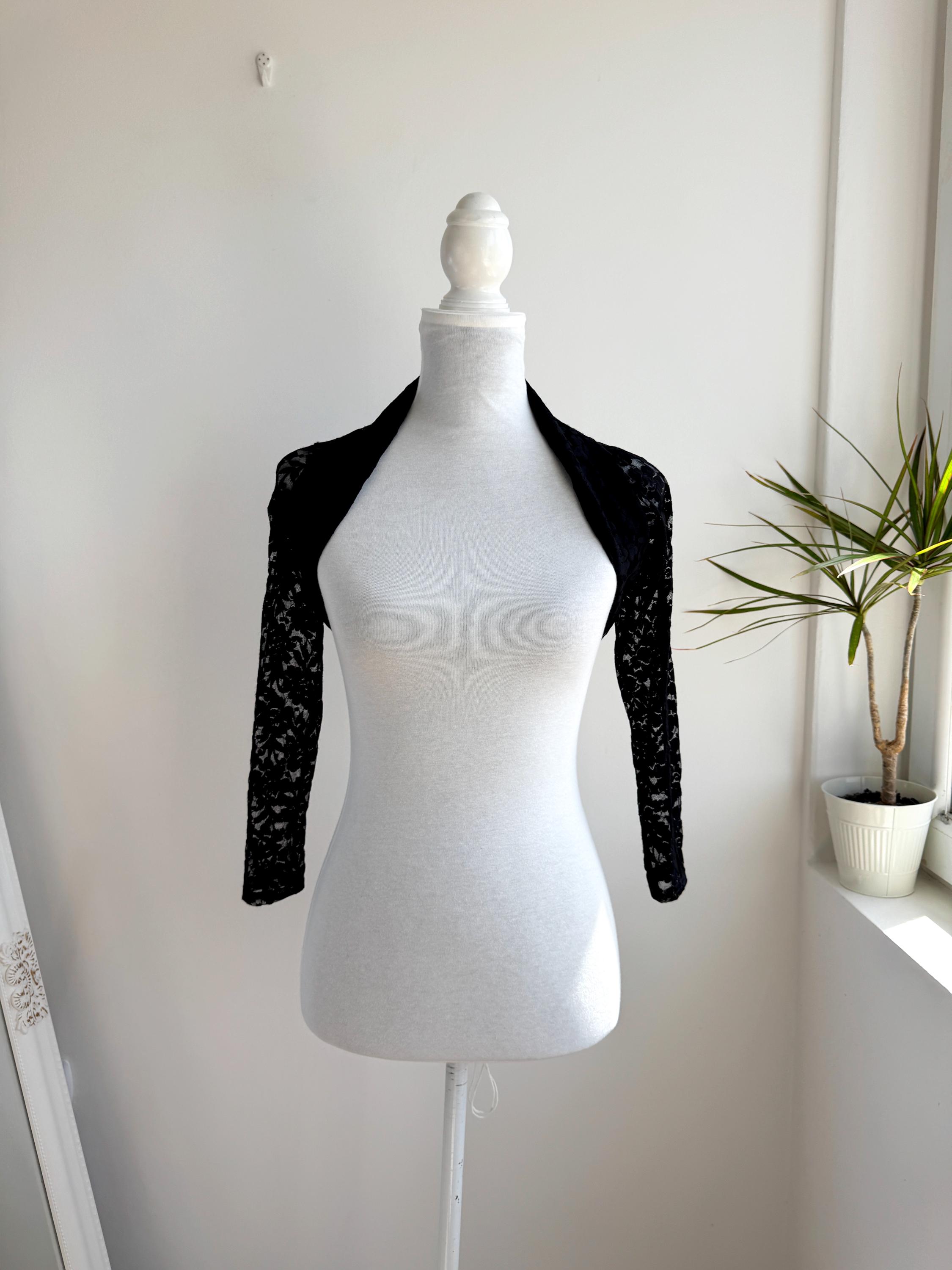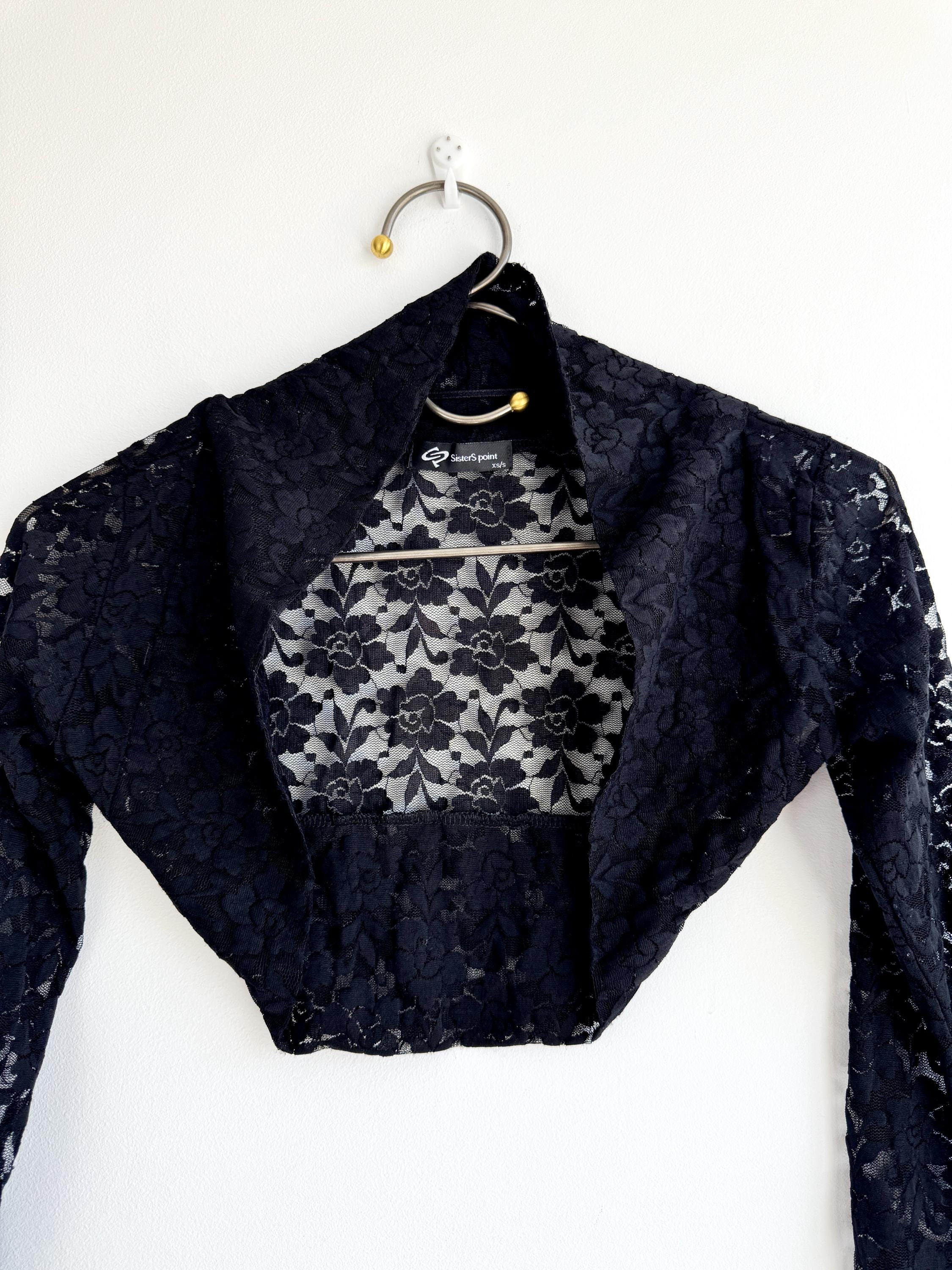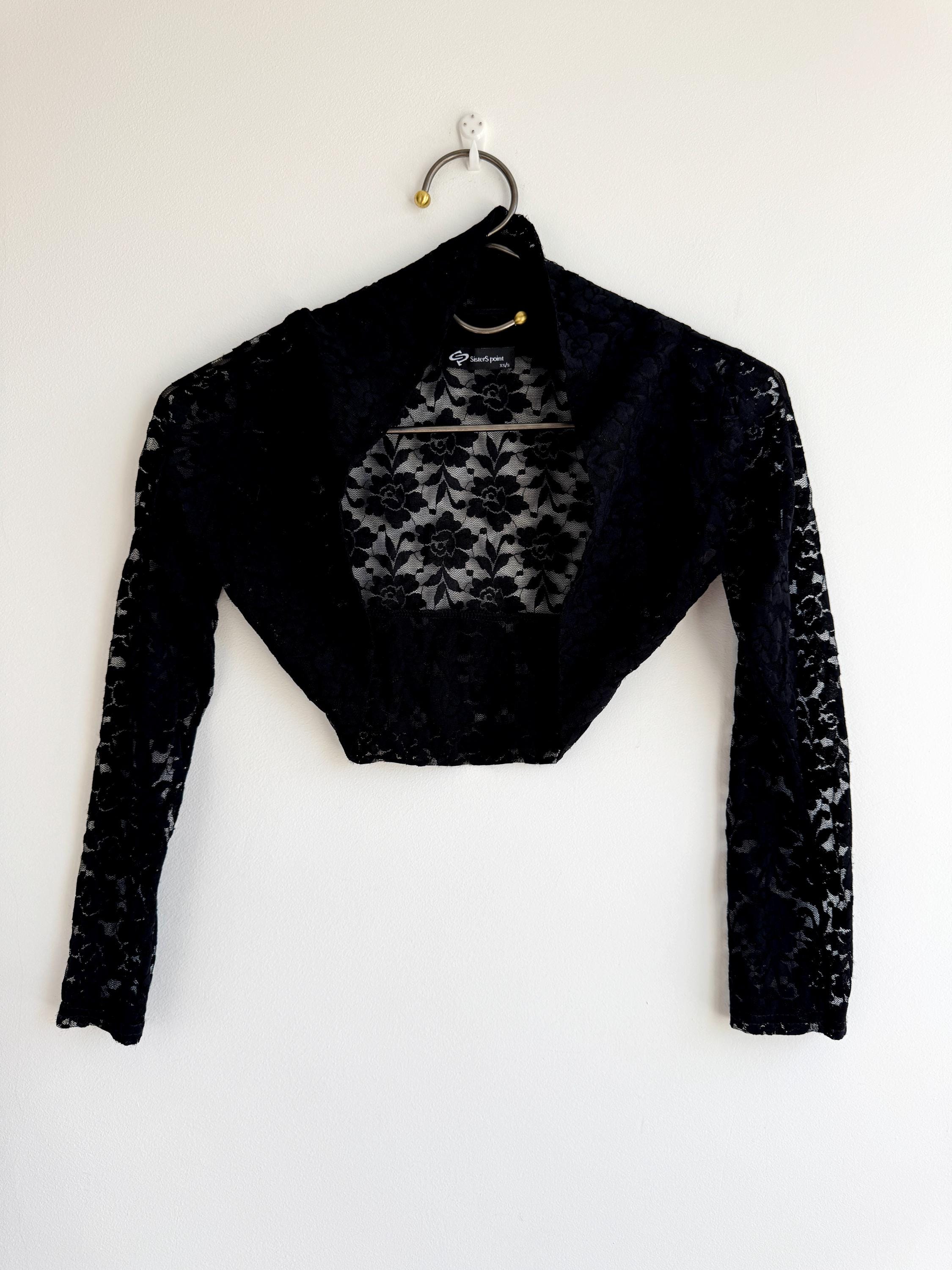 This elegant vintage Y2K black lace bolero shrug is a stunning little layering piece that works beautifully over a strapless dress, slip dress, or bodycon for weddings, parties, proms, and formal occasions. The delicate all-over floral lace pattern gives it a romantic, feminine edge that feels equally at home in a vintage-inspired look or a modern evening outfit. The open-front cropped silhouette makes it incredibly versatile — throw it over a little black dress for an instant evening upgrade or style it with high-waisted trousers for a going-out look with a twist.