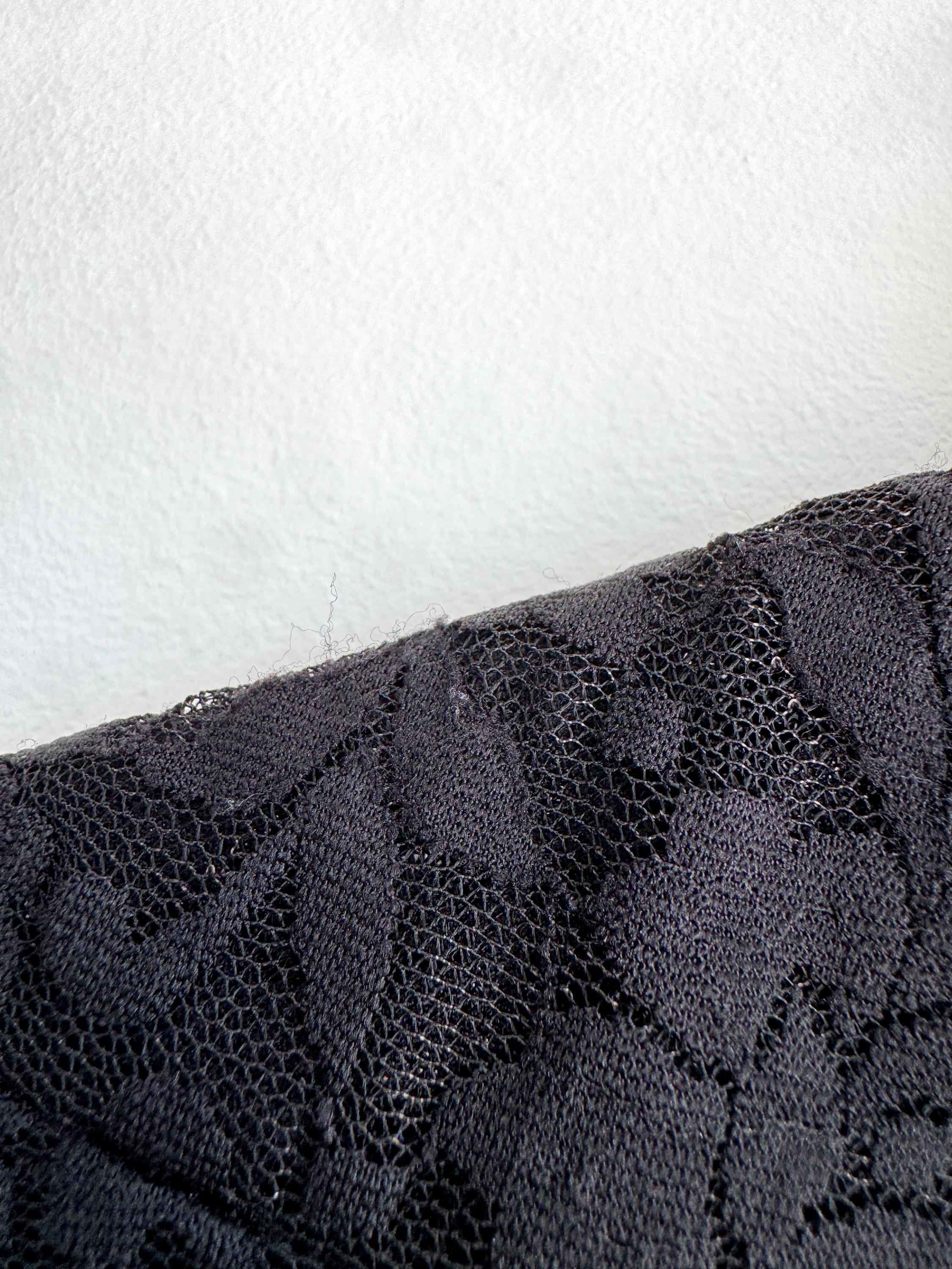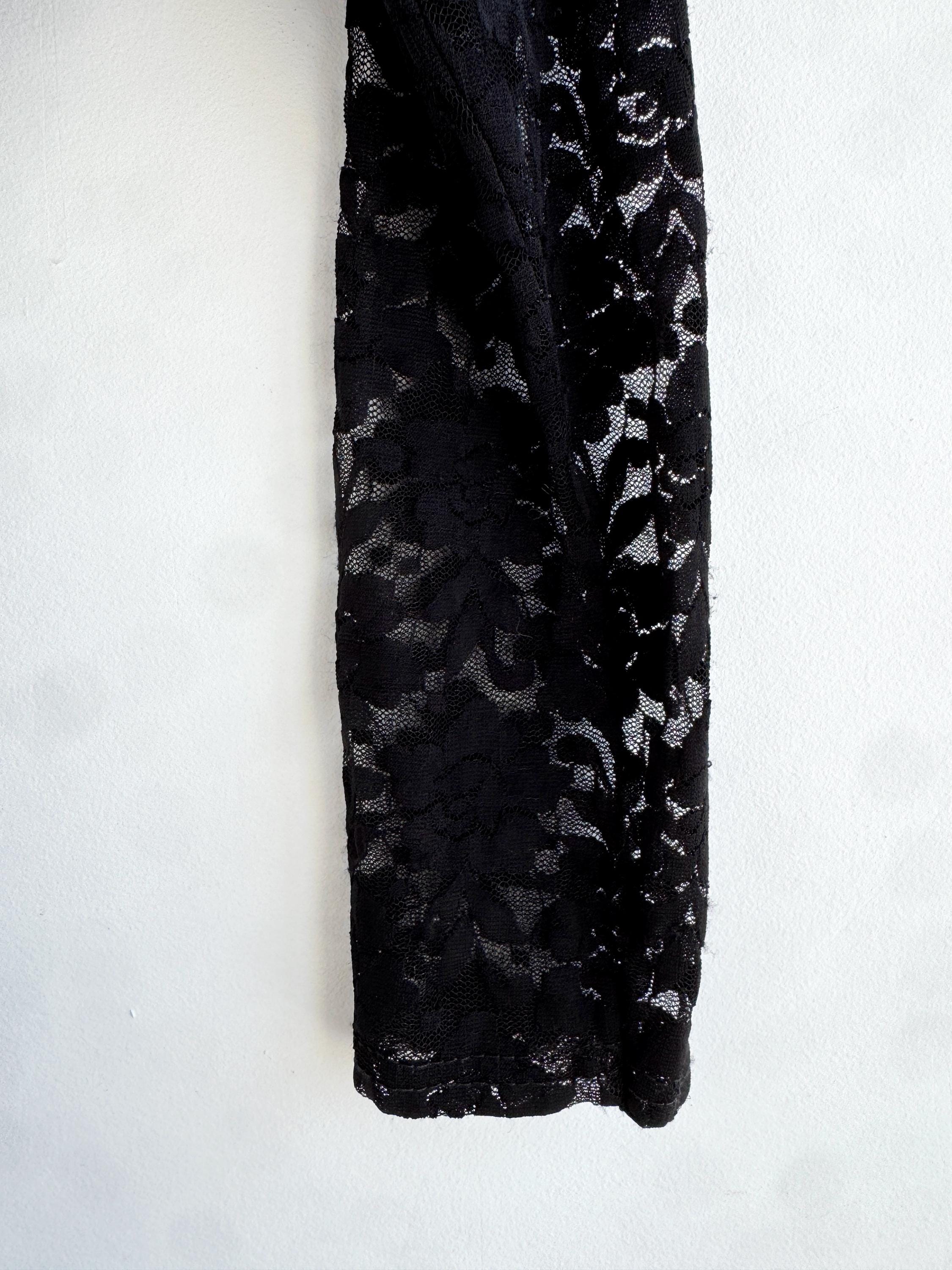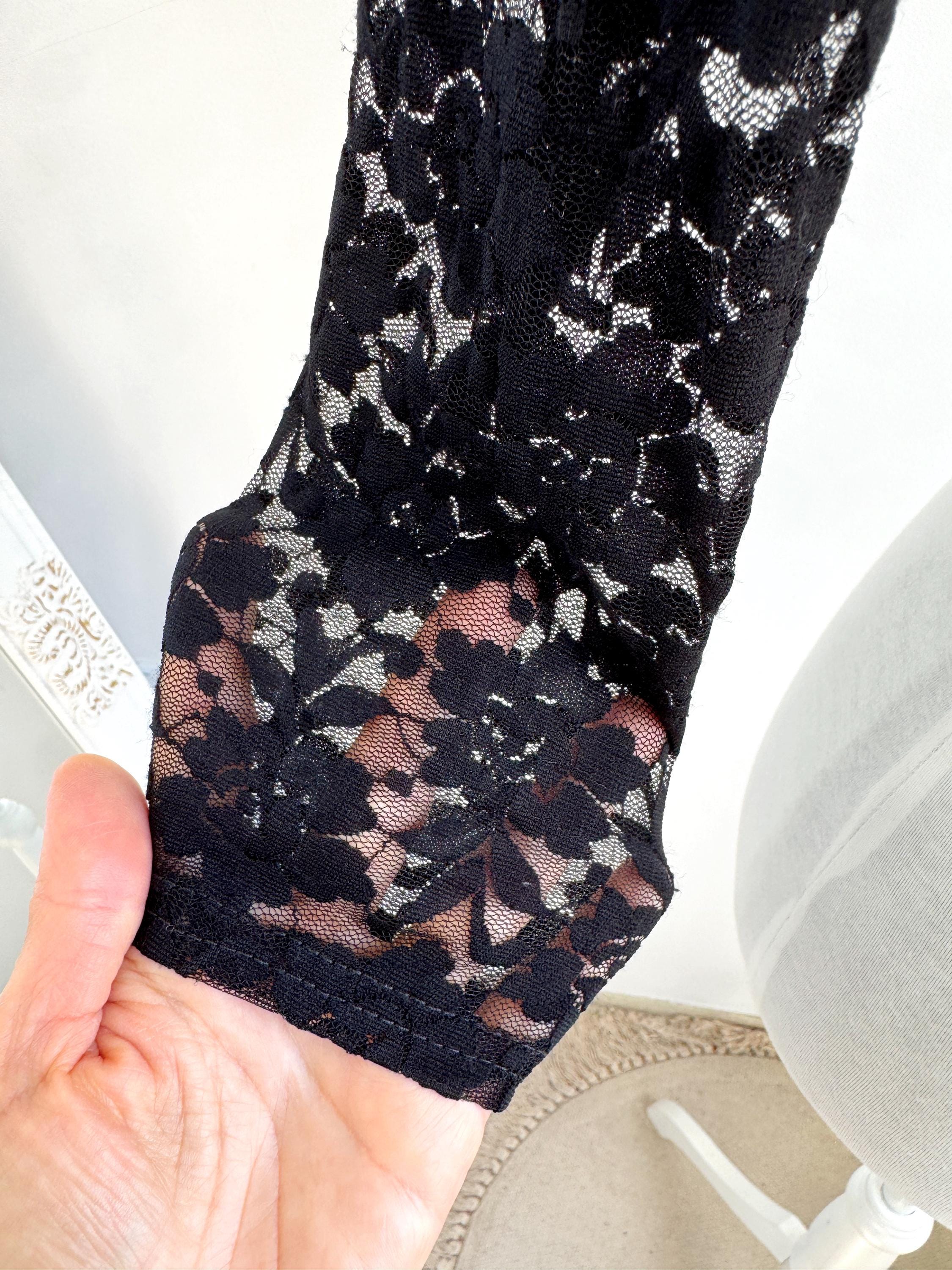 The long sleeves are fully sheer lace, adding coverage without sacrificing that barely-there elegance. A subtle elasticated hem keeps it neatly in place. This is the kind of lace layerig piece that disappears into an outfit in the best possible way — you barely notice it's there, but the look wouldn't be the same without it.