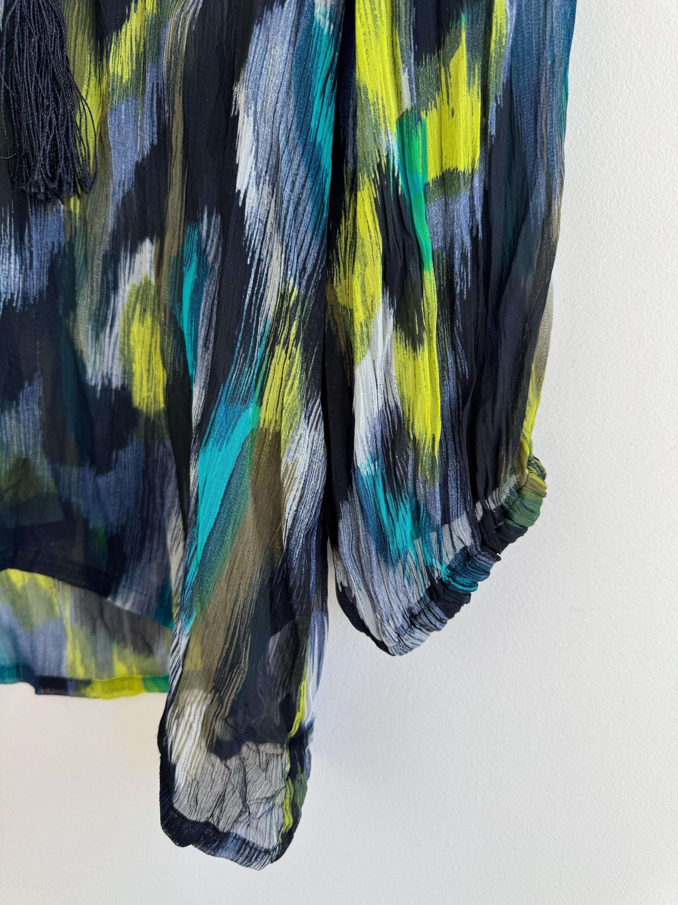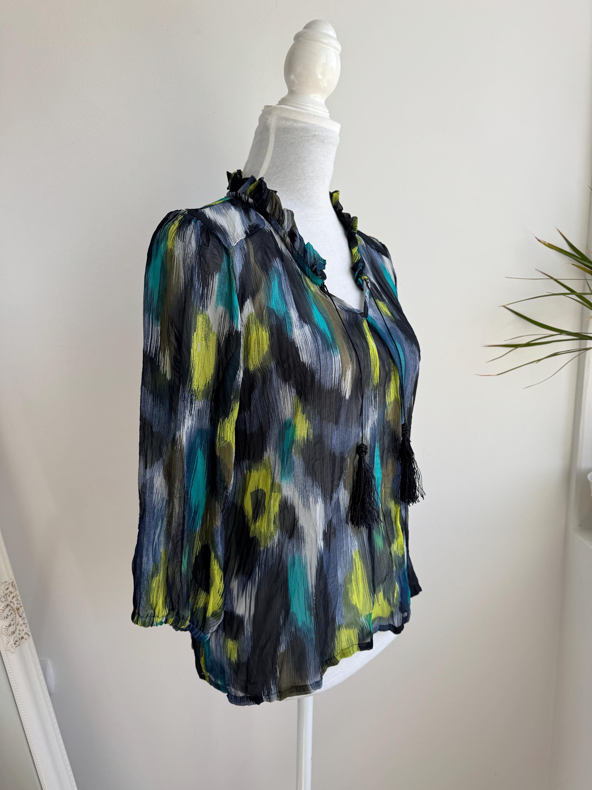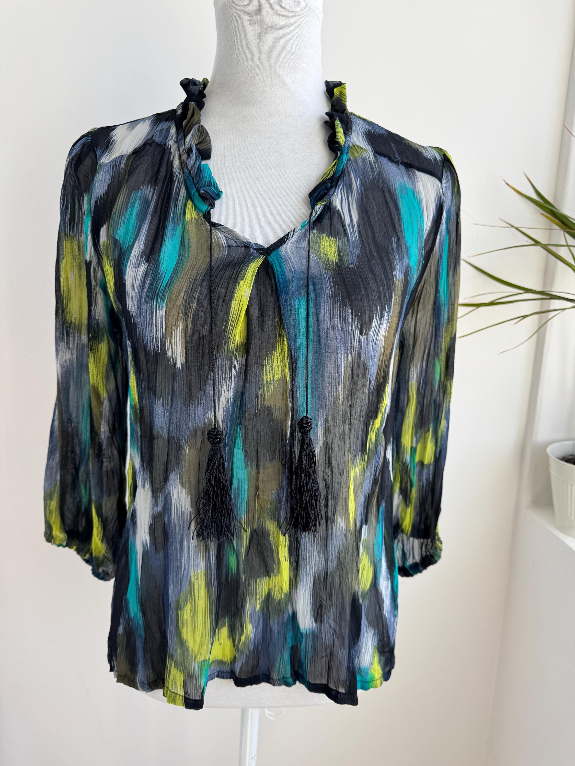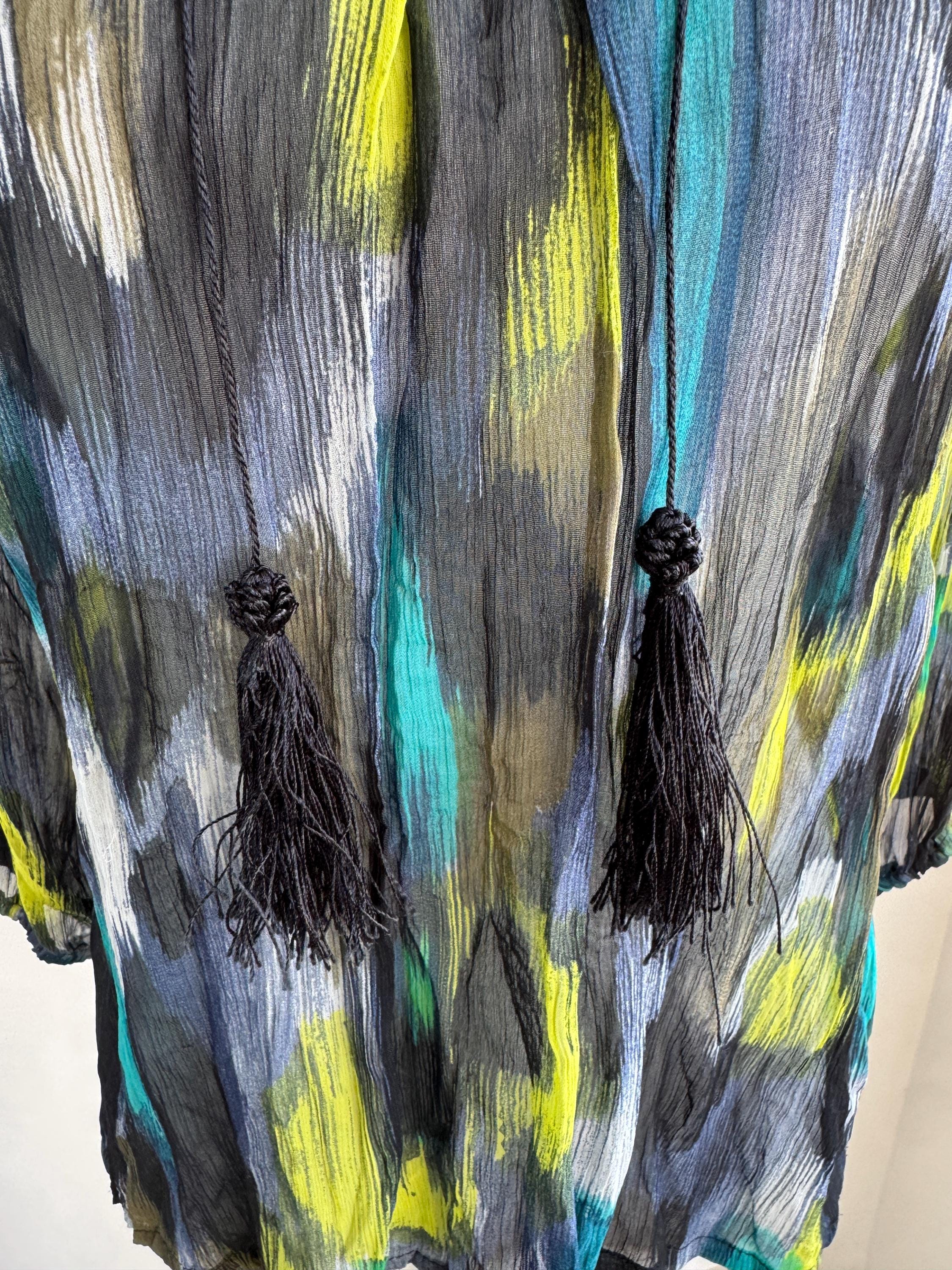 If you've ever wanted a boho sheer blouse that looks like a watercolour painting came to life, this vintage teal and lime green top is exactly that. This gorgeous vintage tassel blouse features a bold abstract print in deep teal, lime yellow-green, charcoal grey and black — the kind of colour combination that's striking, energetic and surprisingly easy to wear. The textured semi-sheer fabric gives it a lovely crinkled finish, and the ruffle-trimmed tie neck adds a genuinely romantic, bohemian touch. The real finishing detail? Two long black silk tassels that hang from the open V-neckline — playful, dramatic and completely one of a kind.T Style it with wide-leg black trousers and strappy heels, or keep it casual with jeans and sandals. Either way, it's going to be the most interesting thing in the room.
