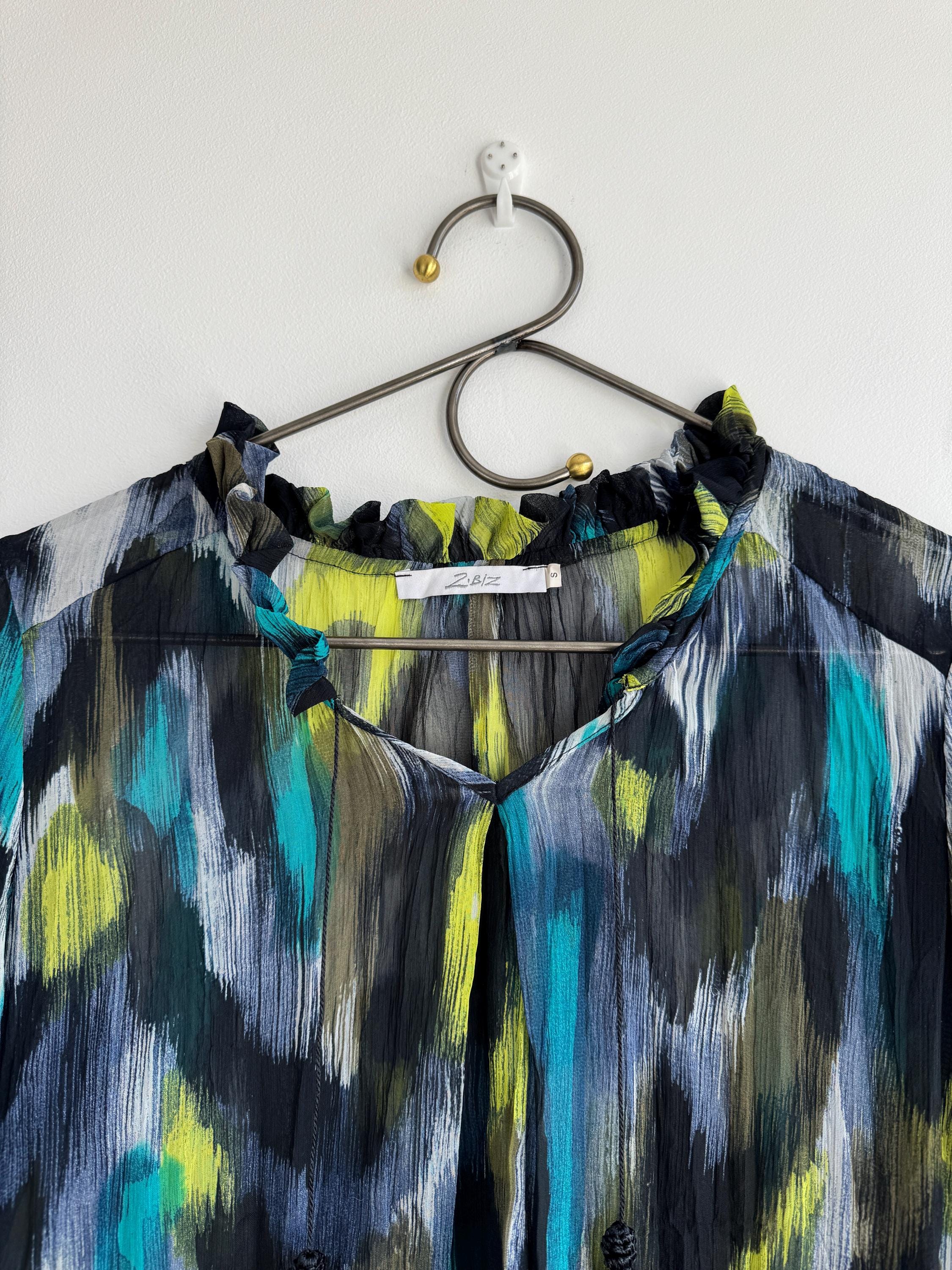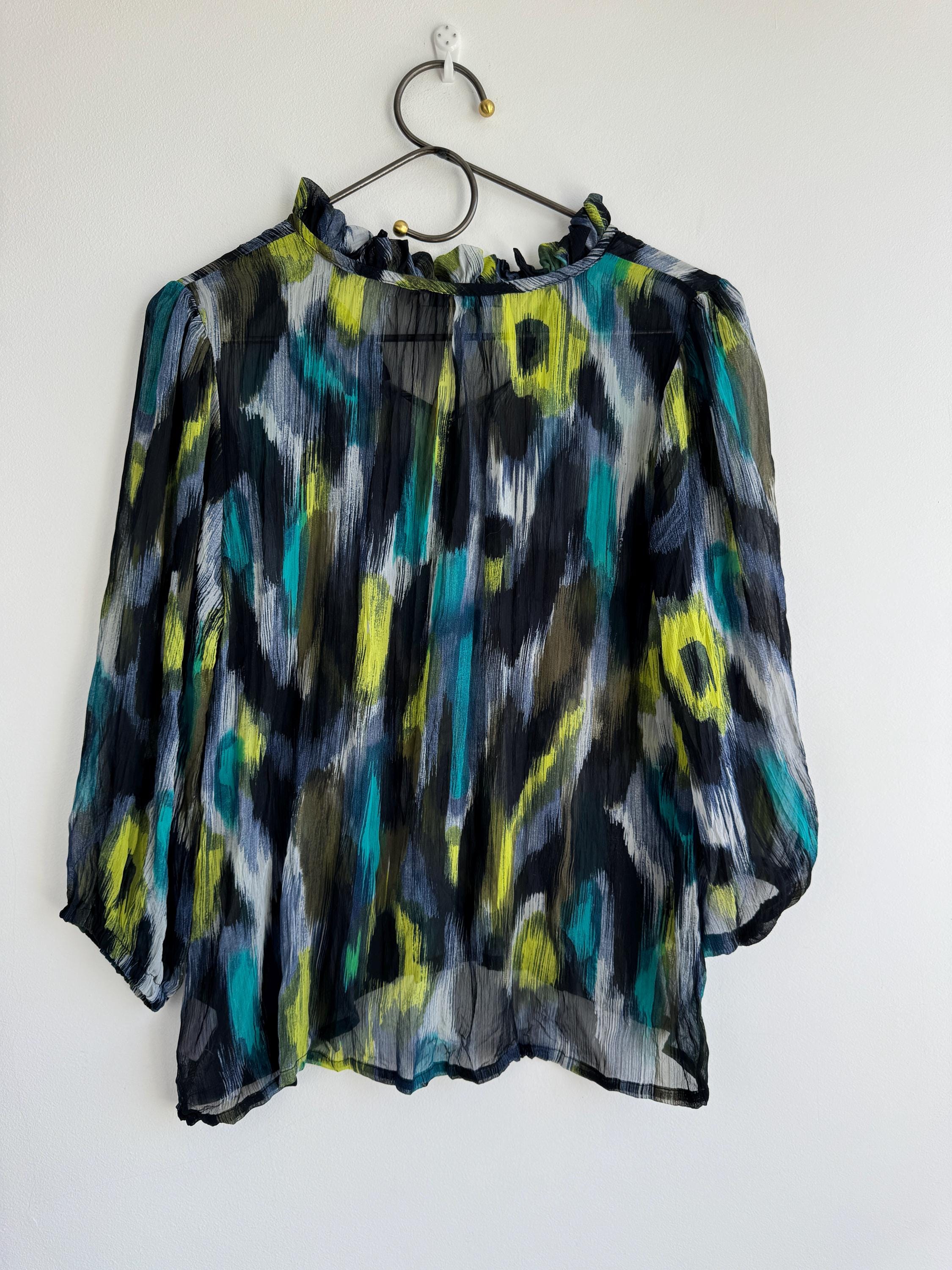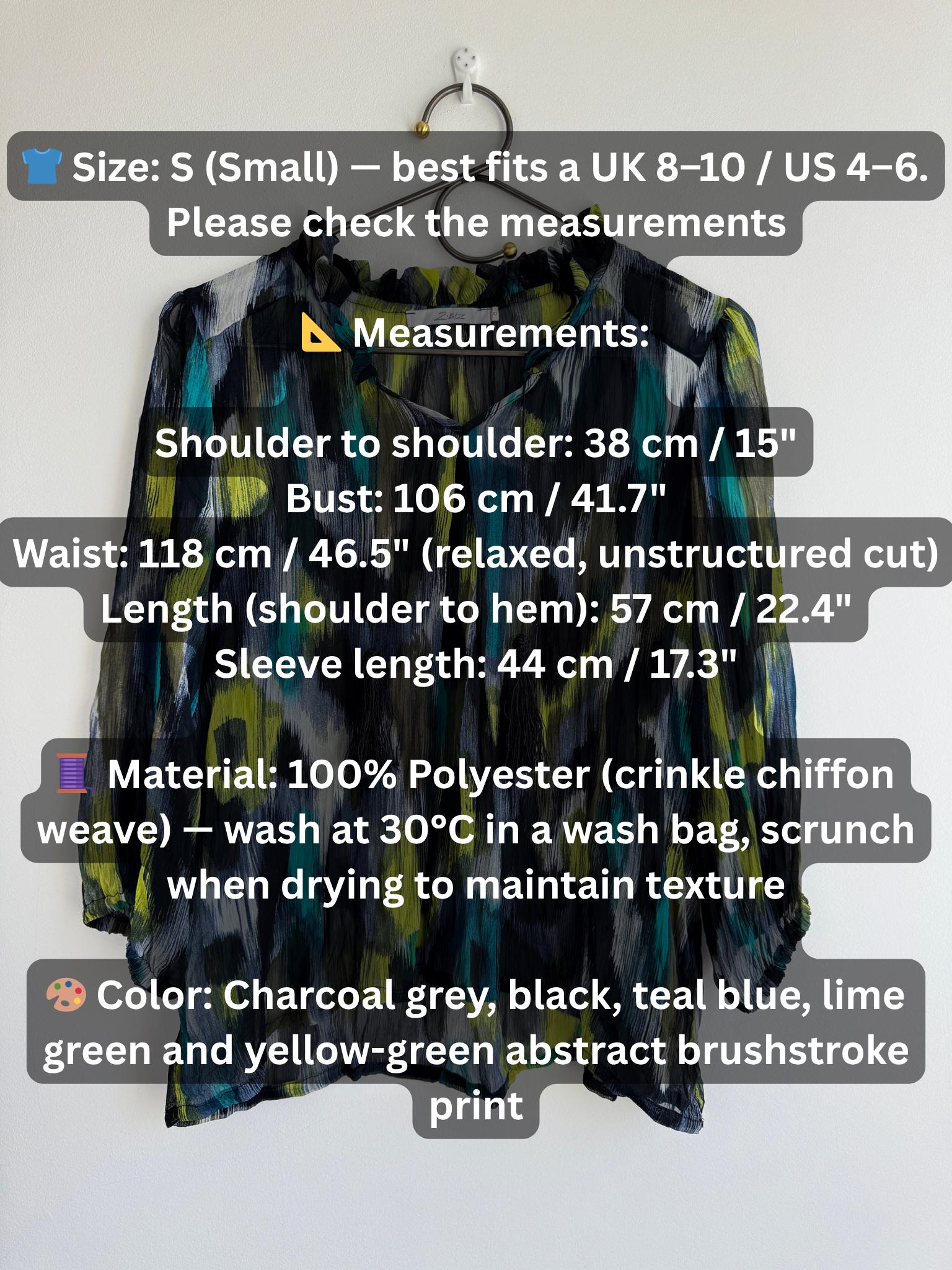 If you've ever wanted a boho sheer blouse that looks like a watercolour painting came to life, this vintage teal and lime green top is exactly that. This gorgeous vintage tassel blouse features a bold abstract print in deep teal, lime yellow-green, charcoal grey and black — the kind of colour combination that's striking, energetic and surprisingly easy to wear. The textured semi-sheer fabric gives it a lovely crinkled finish, and the ruffle-trimmed tie neck adds a genuinely romantic, bohemian touch. The real finishing detail? Two long black silk tassels that hang from the open V-neckline — playful, dramatic and completely one of a kind.T Style it with wide-leg black trousers and strappy heels, or keep it casual with jeans and sandals. Either way, it's going to be the most interesting thing in the room.