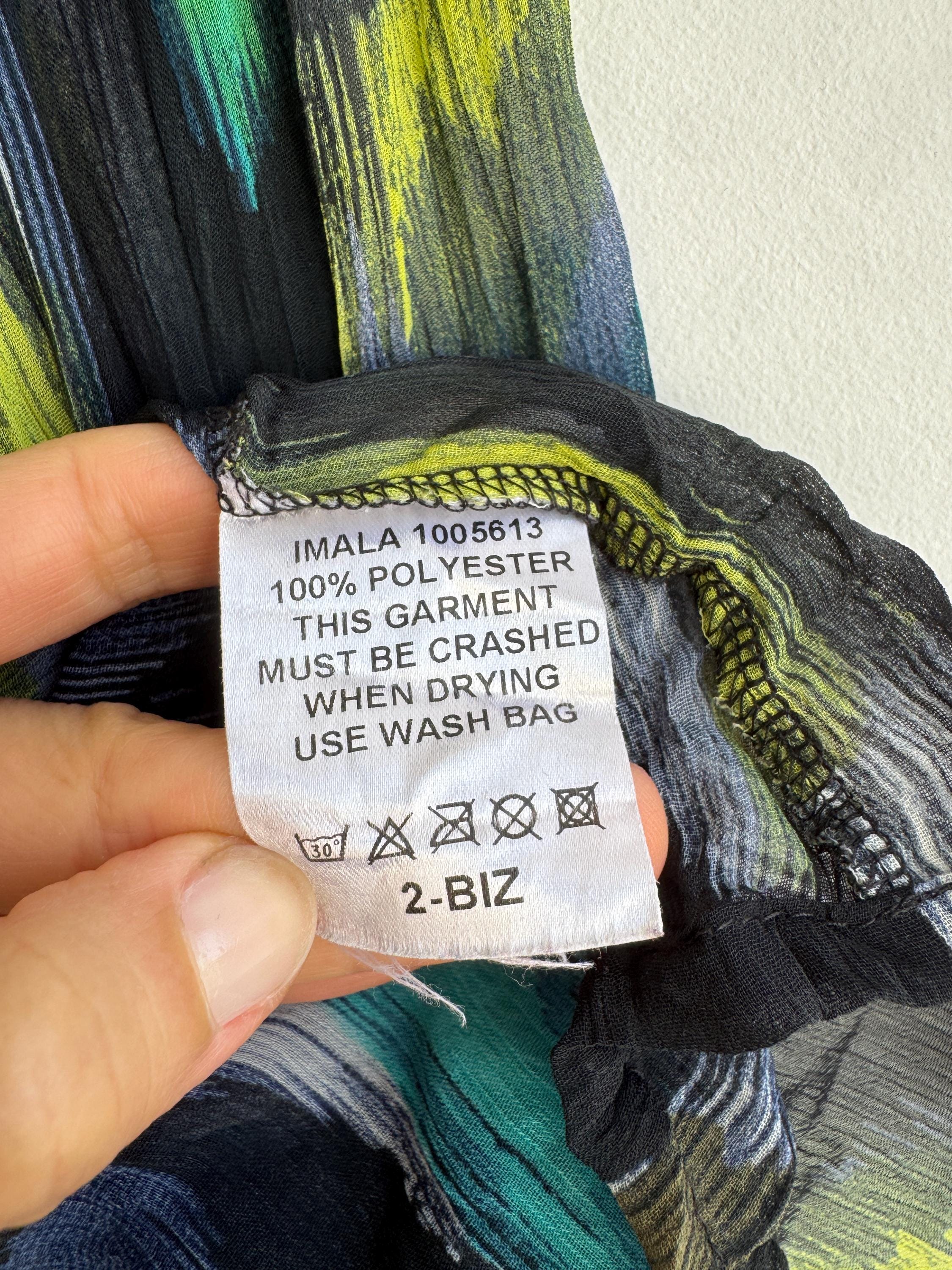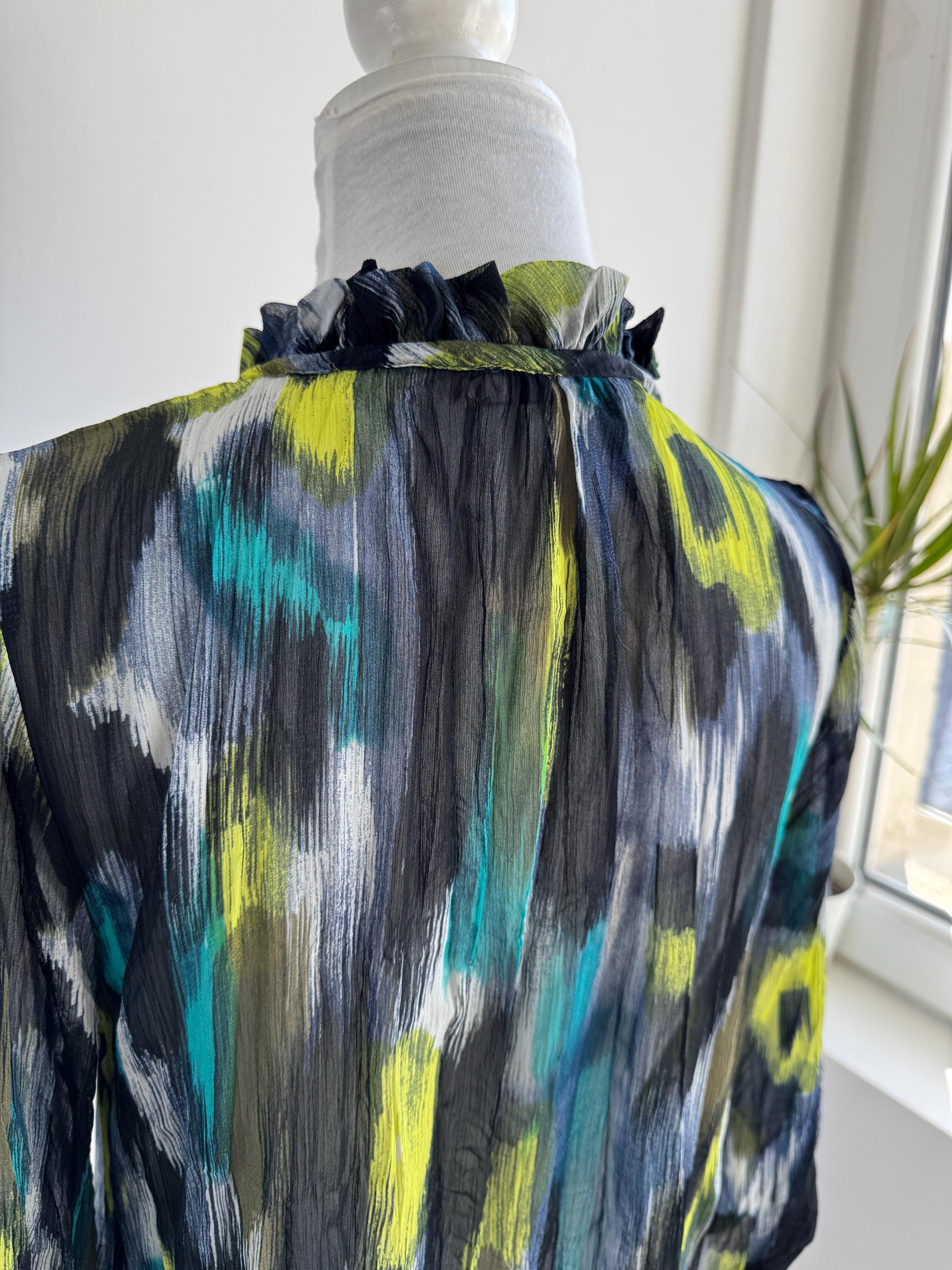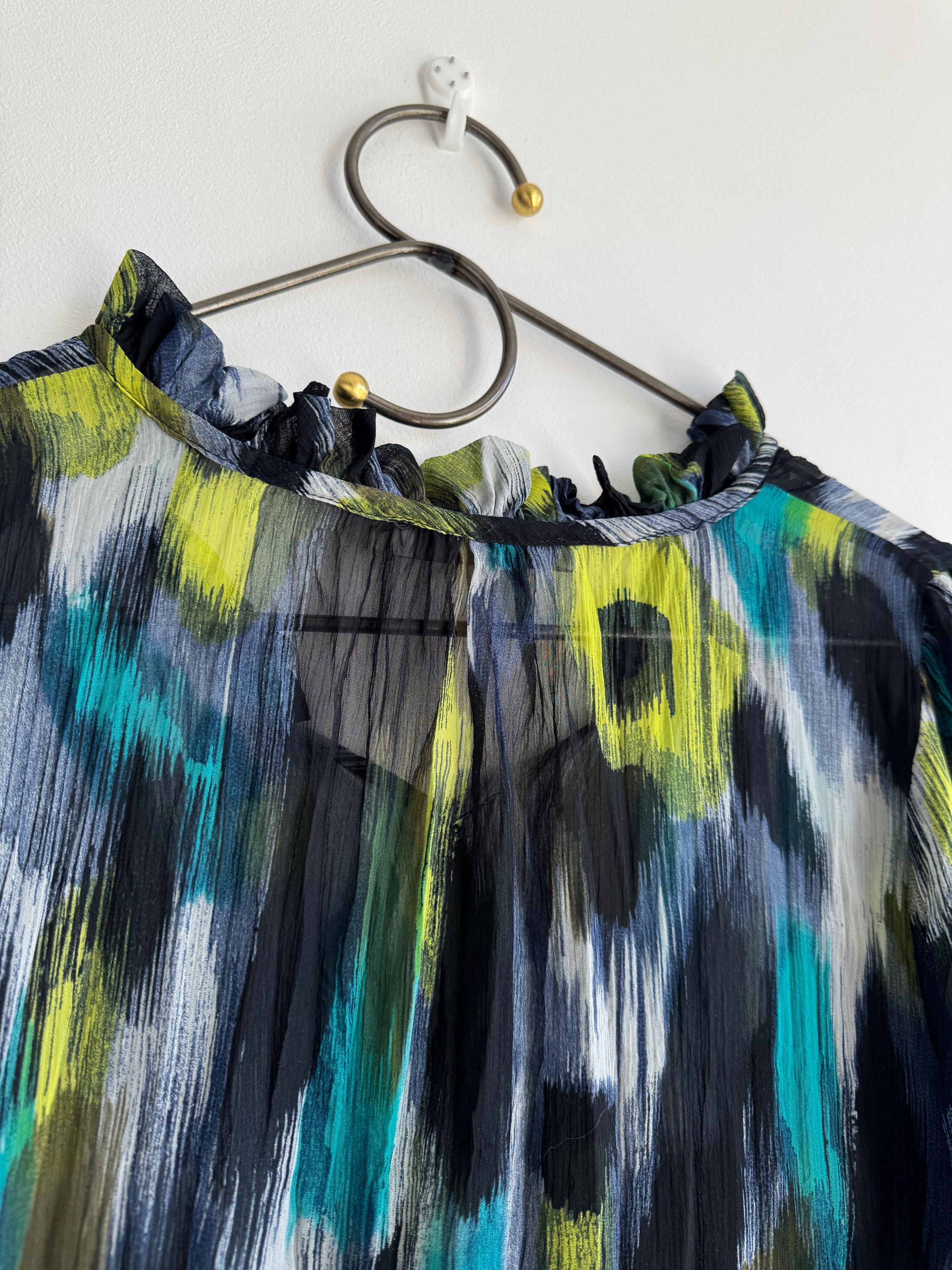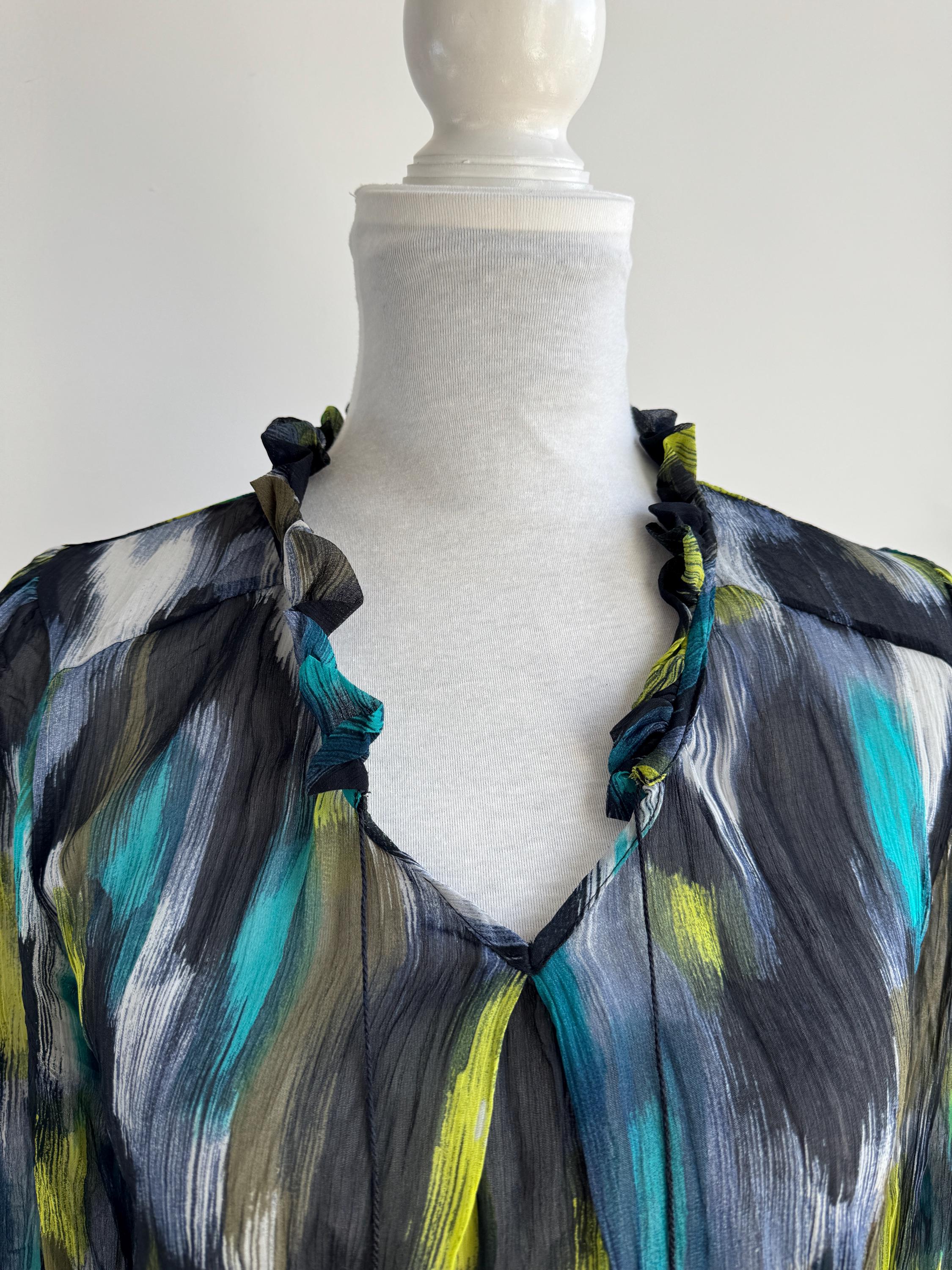 If you've ever wanted a boho sheer blouse that looks like a watercolour painting came to life, this vintage teal and lime green top is exactly that. This gorgeous vintage tassel blouse features a bold abstract print in deep teal, lime yellow-green, charcoal grey and black — the kind of colour combination that's striking, energetic and surprisingly easy to wear. The textured semi-sheer fabric gives it a lovely crinkled finish, and the ruffle-trimmed tie neck adds a genuinely romantic, bohemian touch. The real finishing detail? Two long black silk tassels that hang from the open V-neckline — playful, dramatic and completely one of a kind.T Style it with wide-leg black trousers and strappy heels, or keep it casual with jeans and sandals. Either way, it's going to be the most interesting thing in the room.