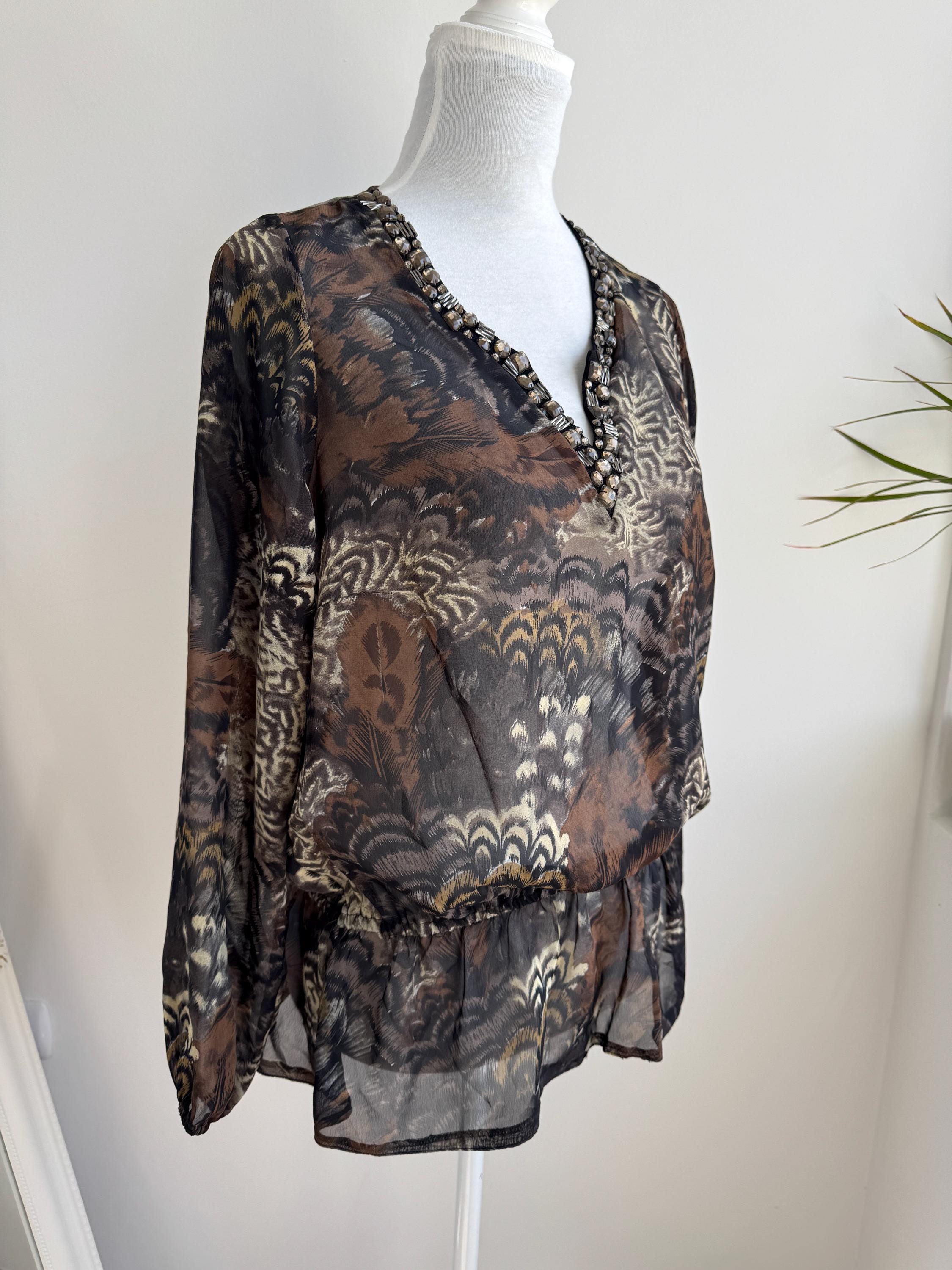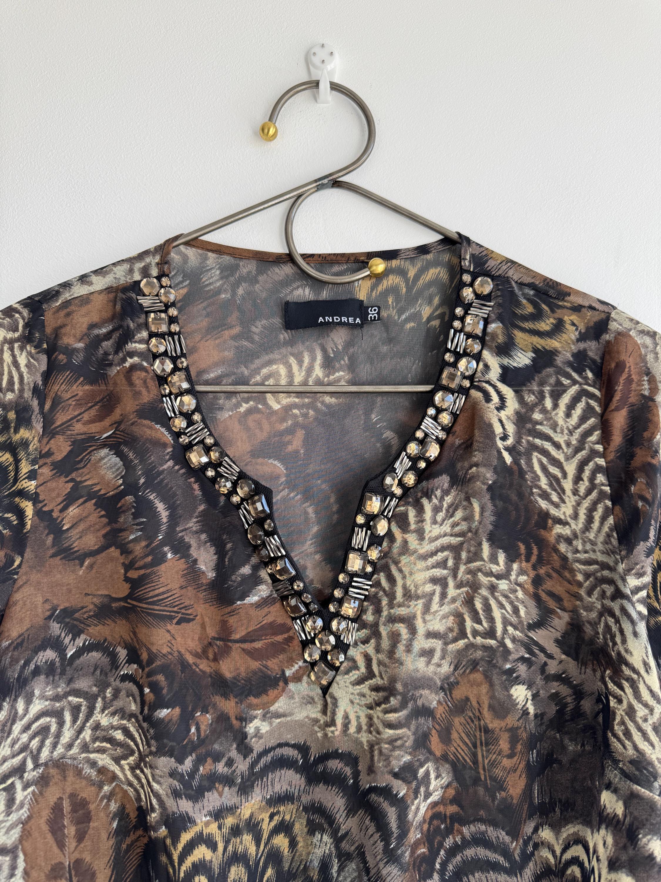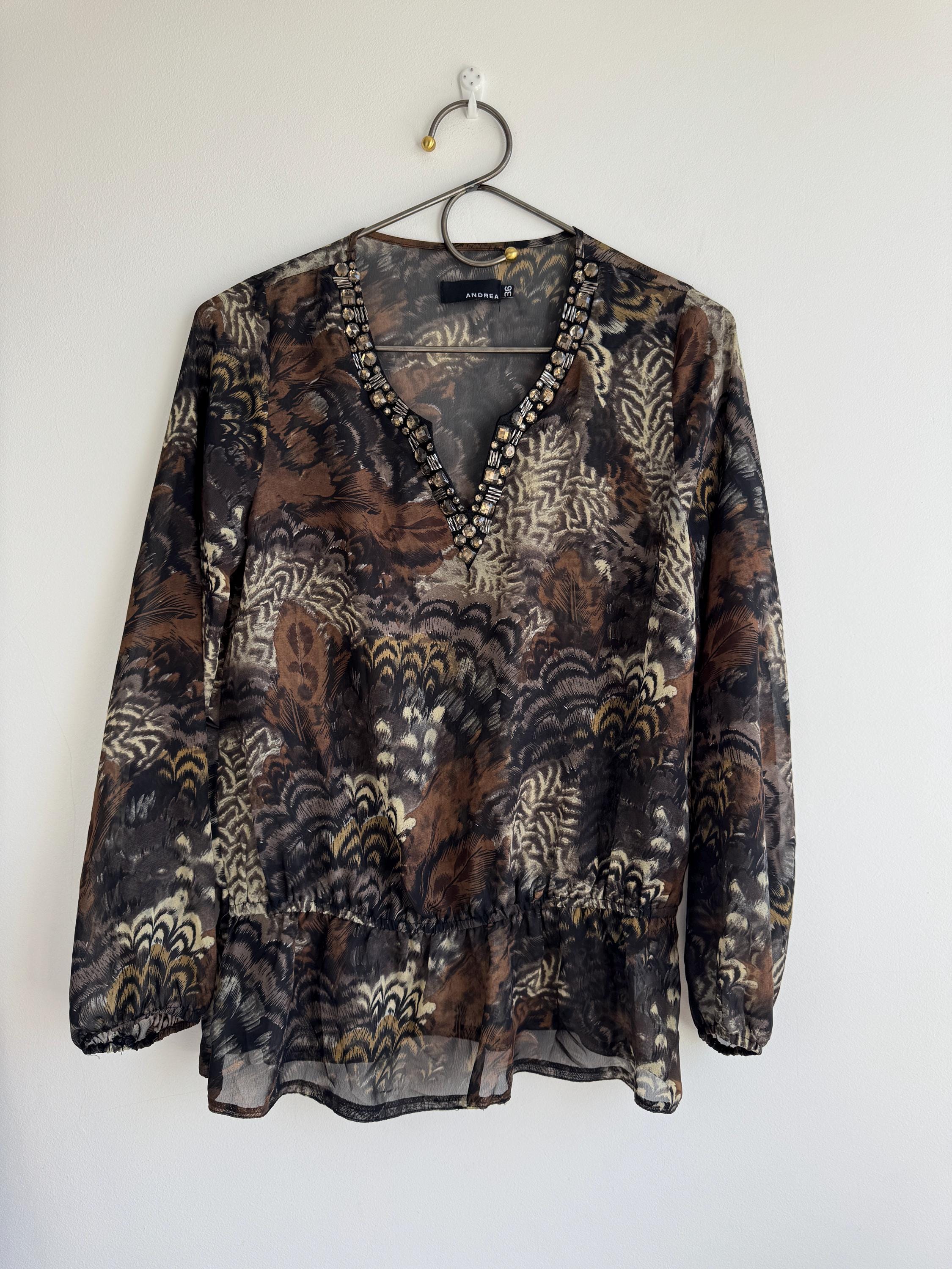 Step into something truly special with this stunning vintage Andrea blouse — a piece that effortlessly blends bohemian spirit with evening glamour. The rich feather and peacock-inspired print in deep browns, blacks, and antique gold tones gives this top an almost painterly quality, while the sheer chiffon-like fabric adds a beautiful, floaty silhouette. The real showstopper, though, is the hand-embellished V-neckline, densely decorated with crystal and tube beads. An elasticated waist creates a relaxed peplum drop hem that's both flattering and effortlessly chic. This is the kind of blouse that gets noticed.