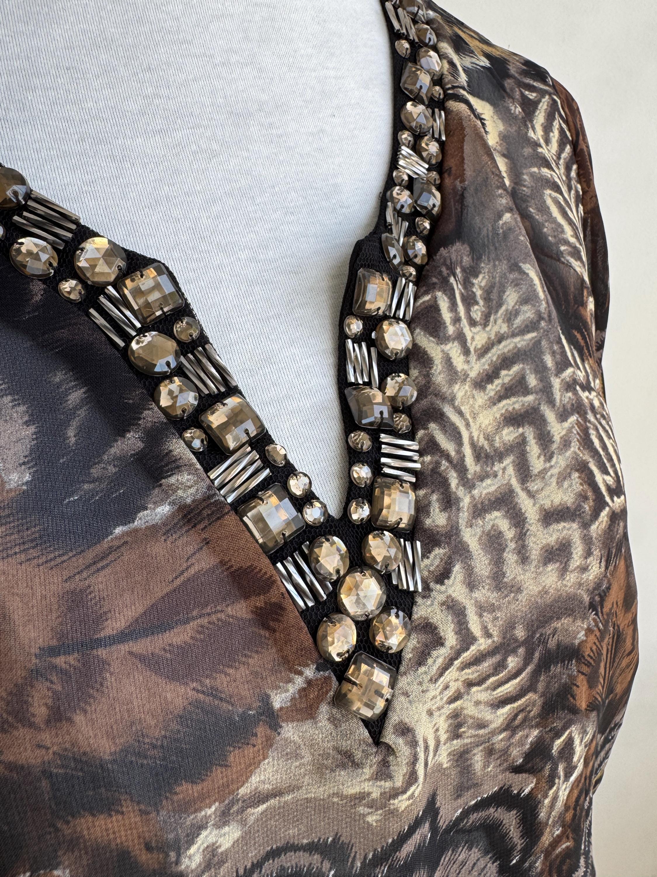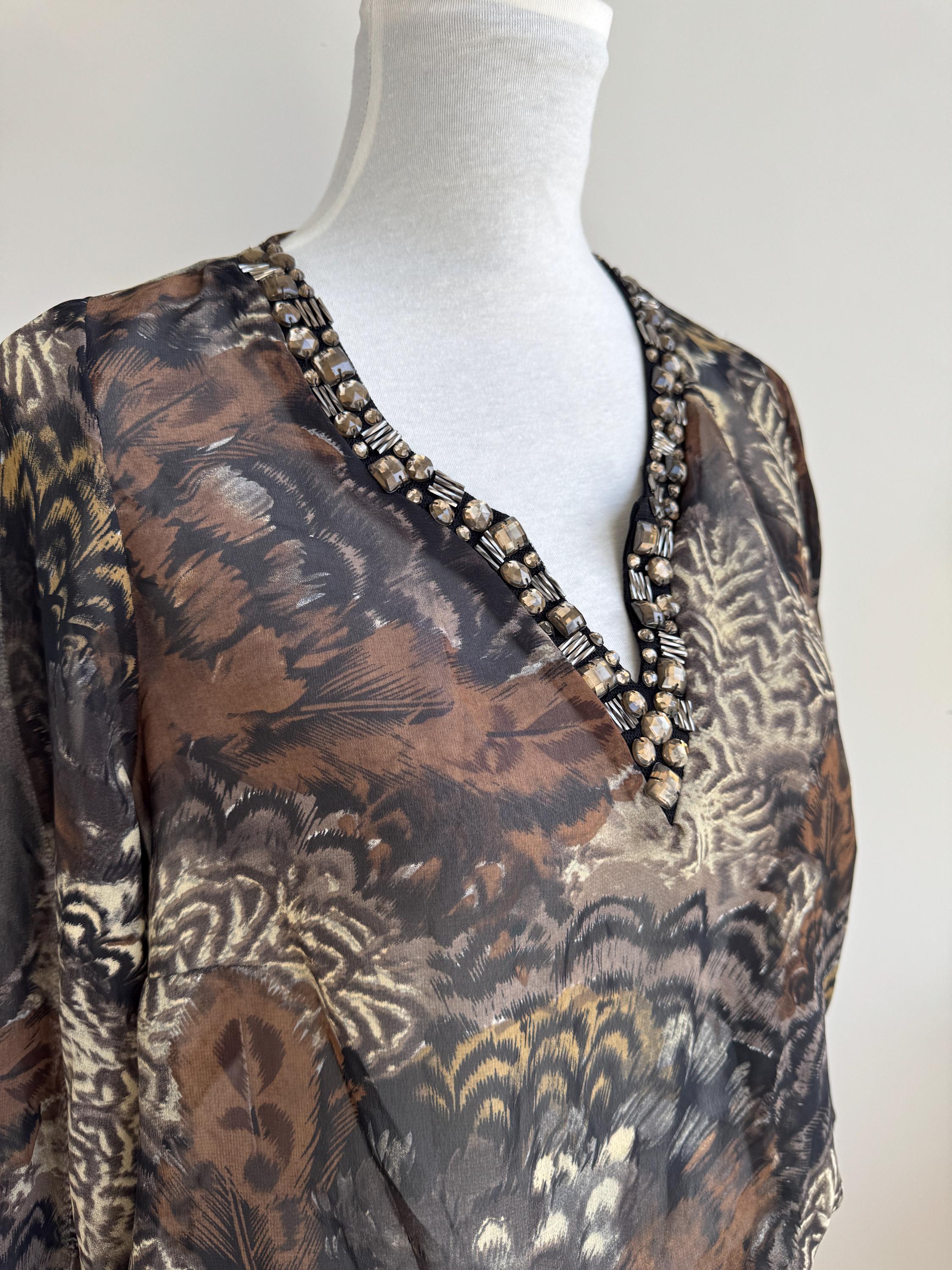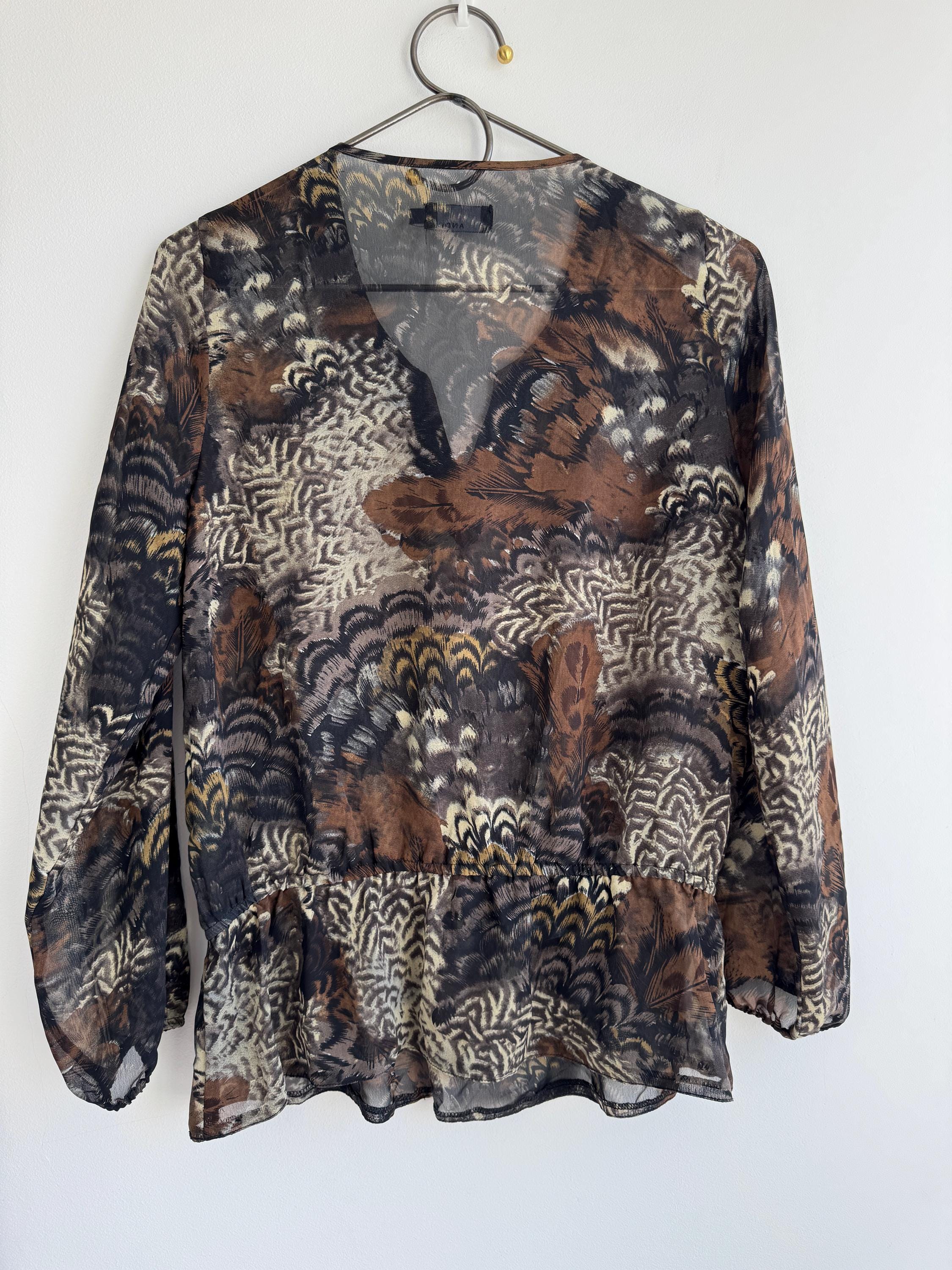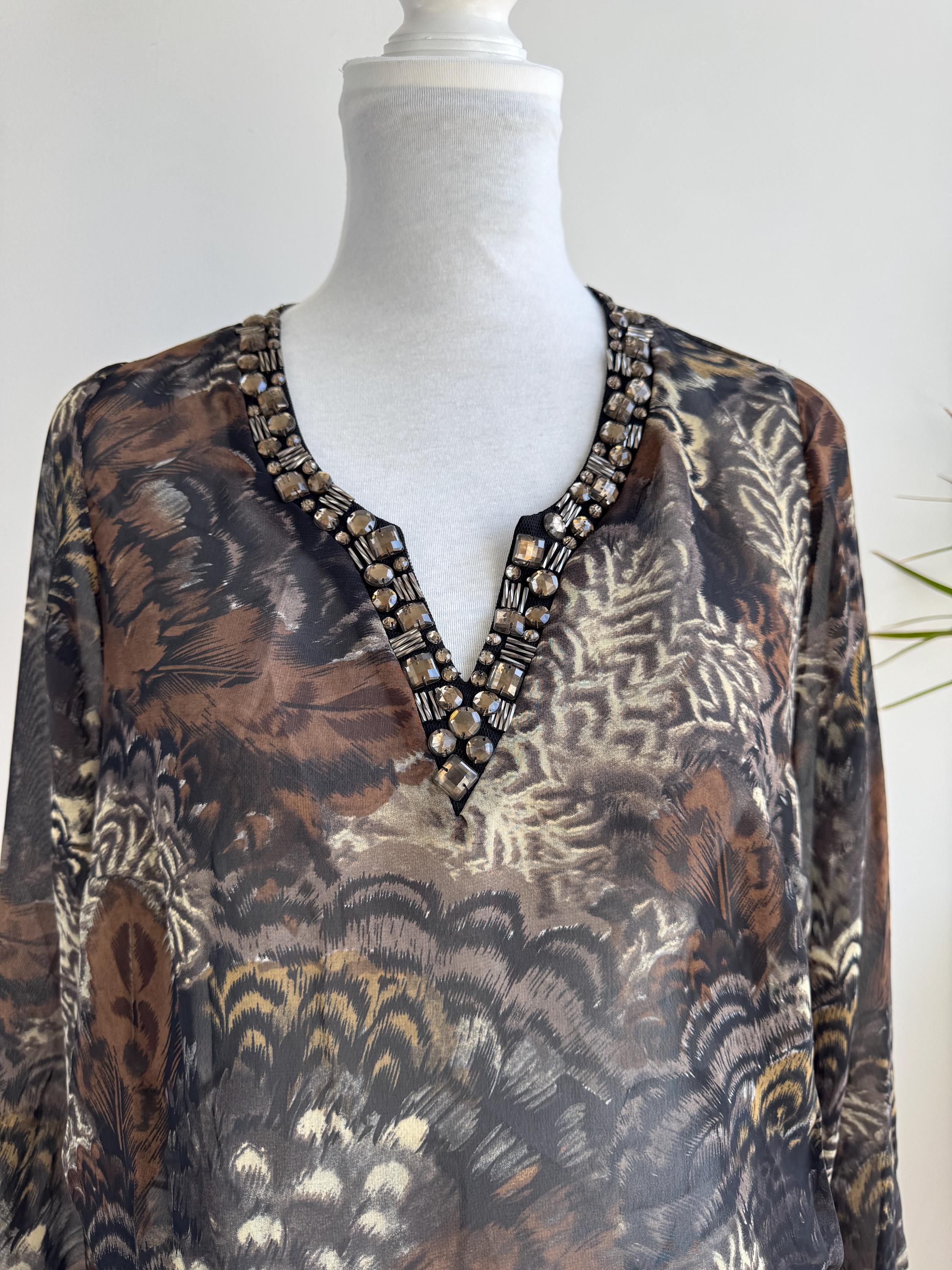 Step into something truly special with this stunning vintage Andrea blouse — a piece that effortlessly blends bohemian spirit with evening glamour. The rich feather and peacock-inspired print in deep browns, blacks, and antique gold tones gives this top an almost painterly quality, while the sheer chiffon-like fabric adds a beautiful, floaty silhouette. The real showstopper, though, is the hand-embellished V-neckline, densely decorated with crystal and tube beads. An elasticated waist creates a relaxed peplum drop hem that's both flattering and effortlessly chic. This is the kind of blouse that gets noticed.