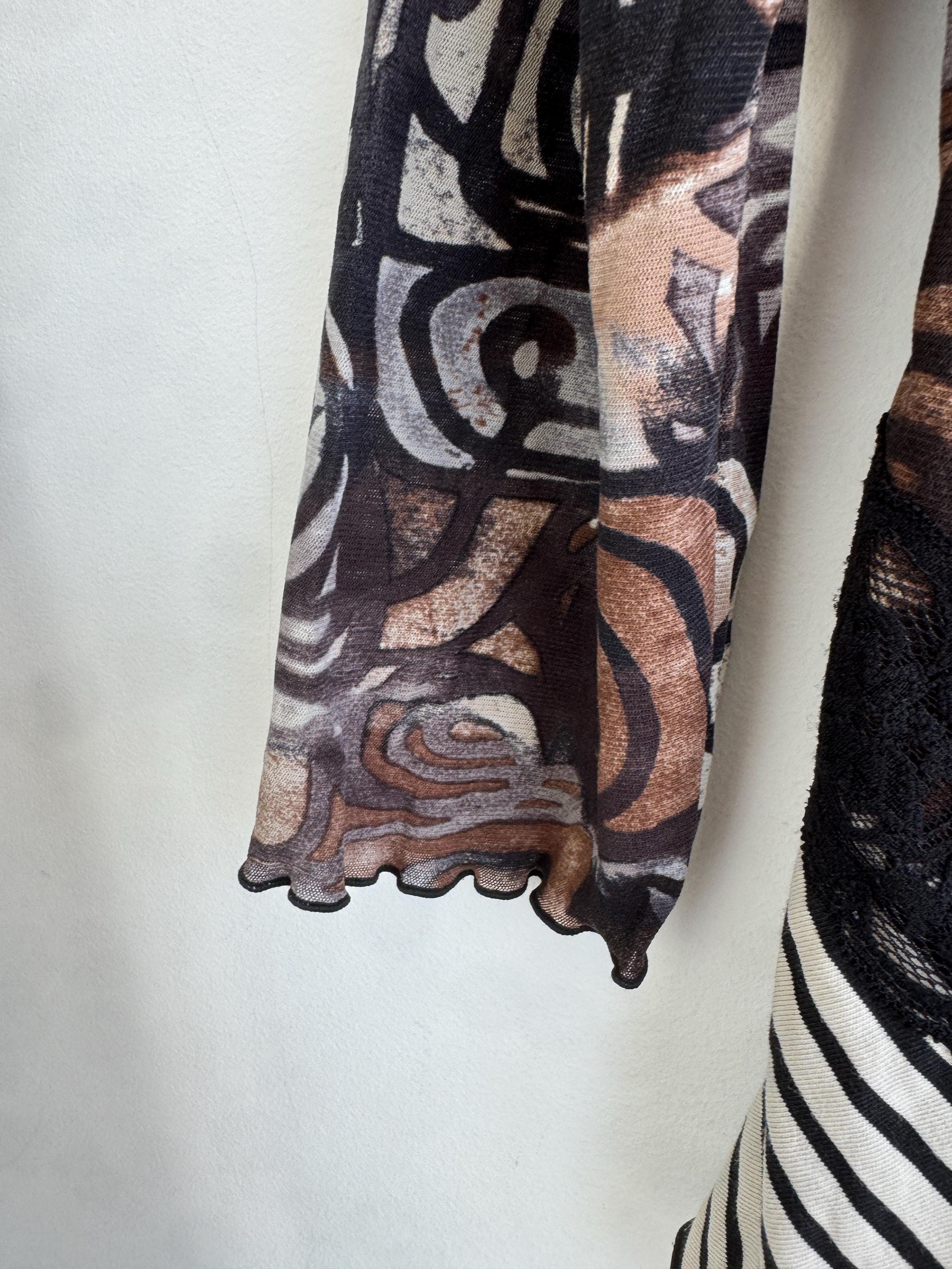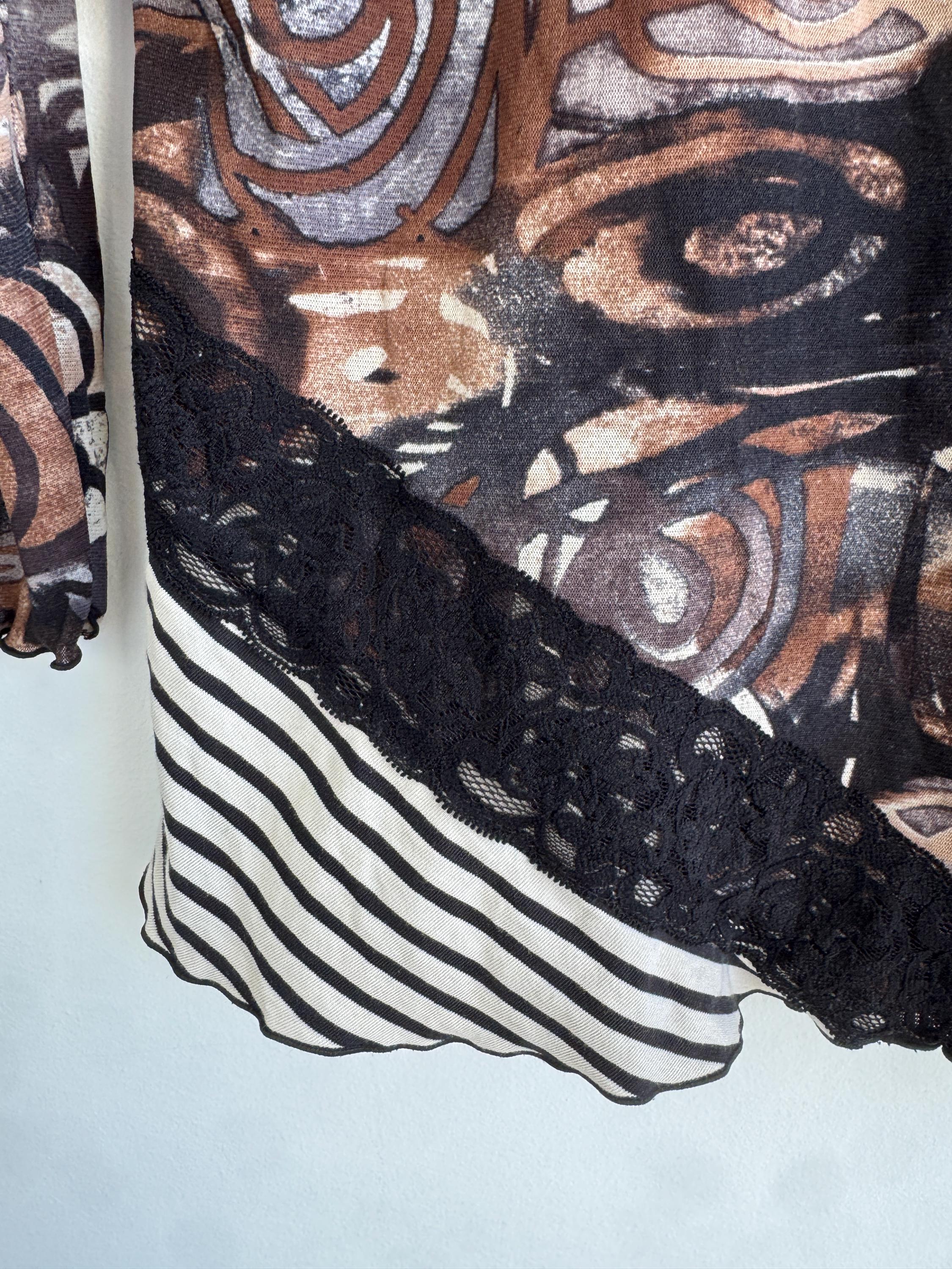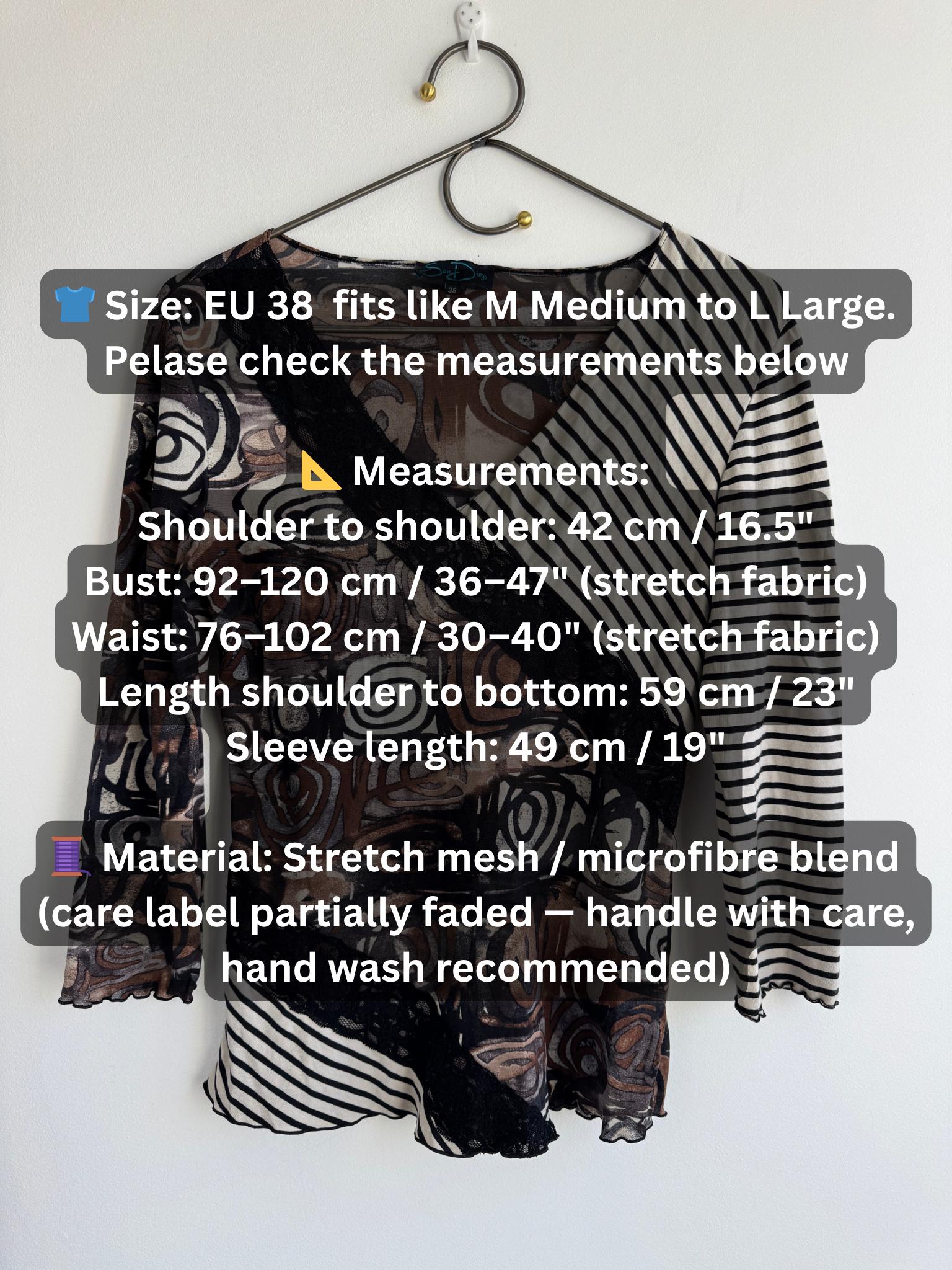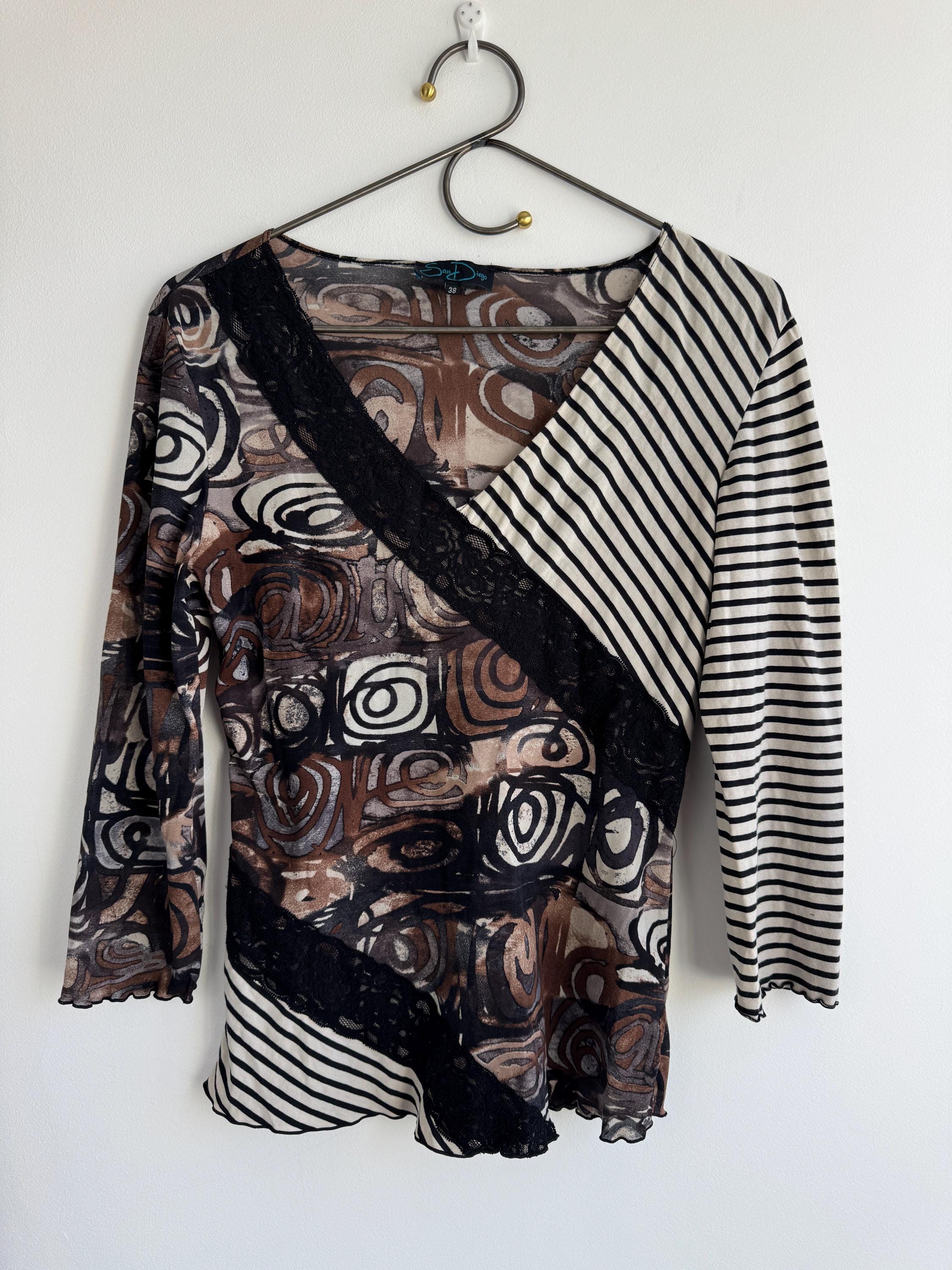 This vintage 90s mesh blouse by San Diego is a rare mixed-print patchwork find — combining black and cream horizontal stripes with a semi-sheer abstract swirl panel in rich earth tones of brown, black and taupe, separated by a bold diagonal black lace trim. It's a genuinely striking 3/4 sleeve women's top in EU size 38 (fits like medium) that blends the best of late 90s and Y2K fashion in one eclectic piece. If you love statement vintage clothing that turns heads without trying, this is the one.
