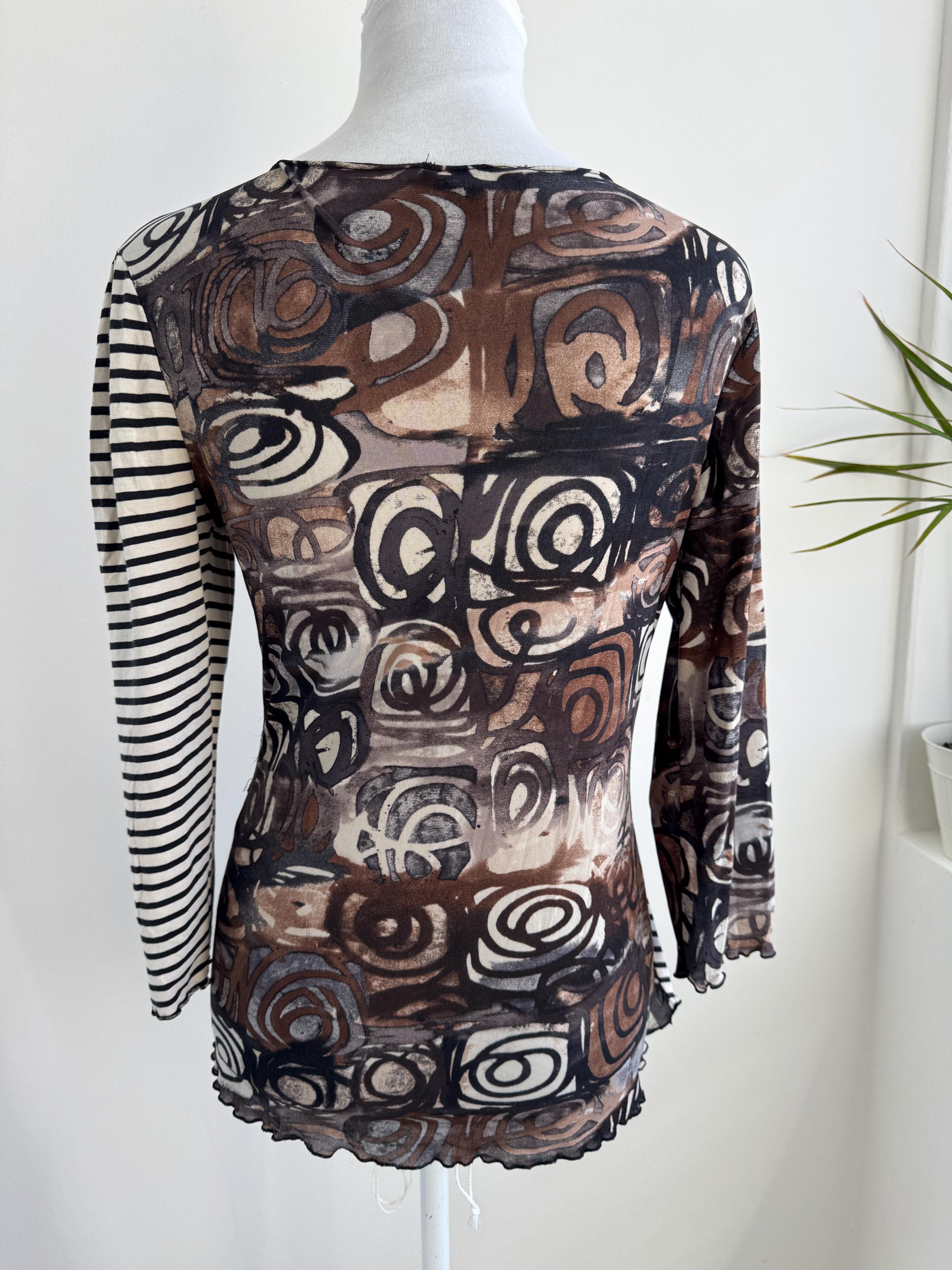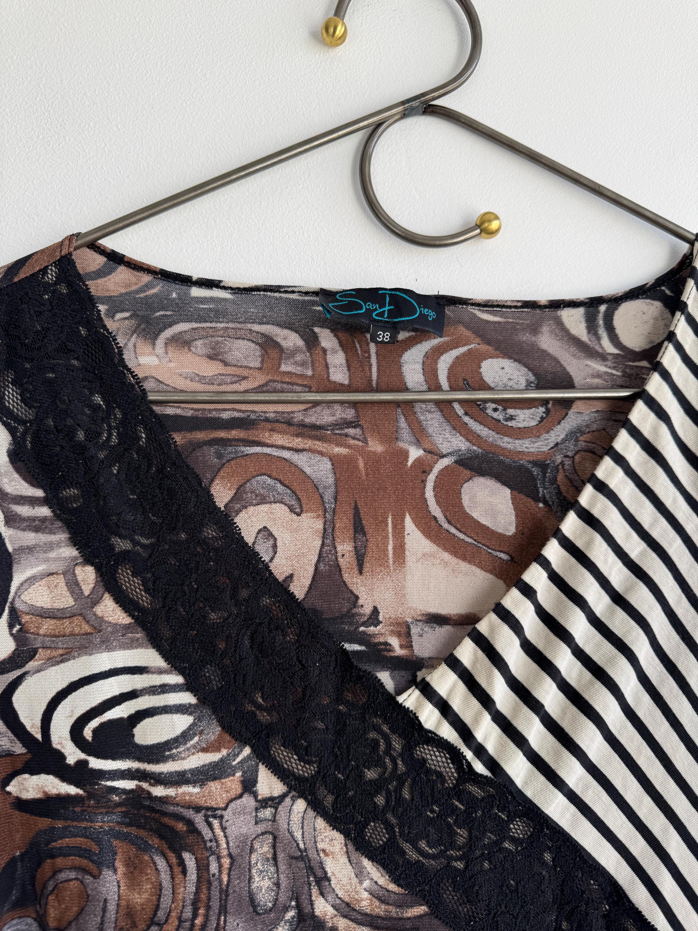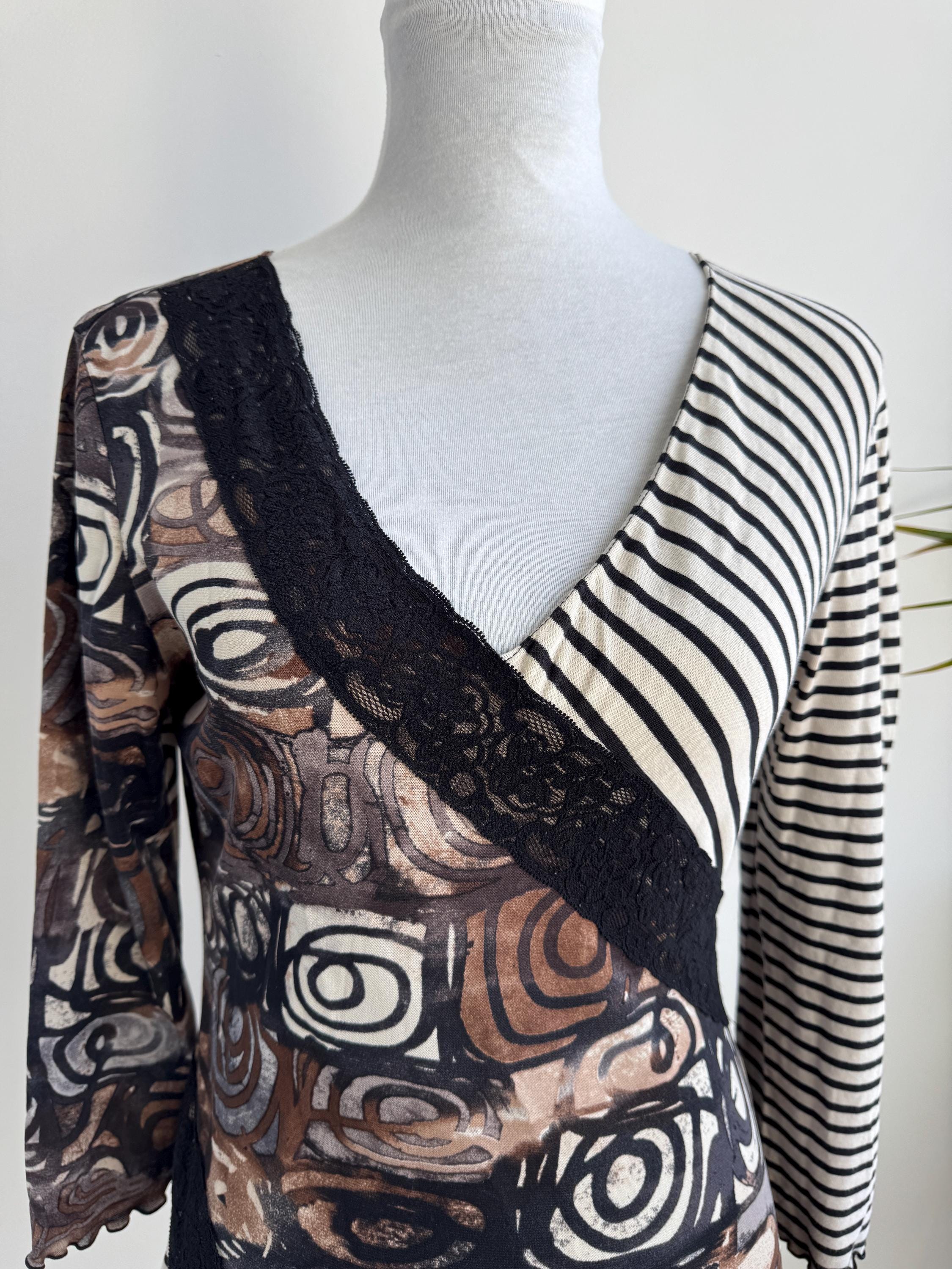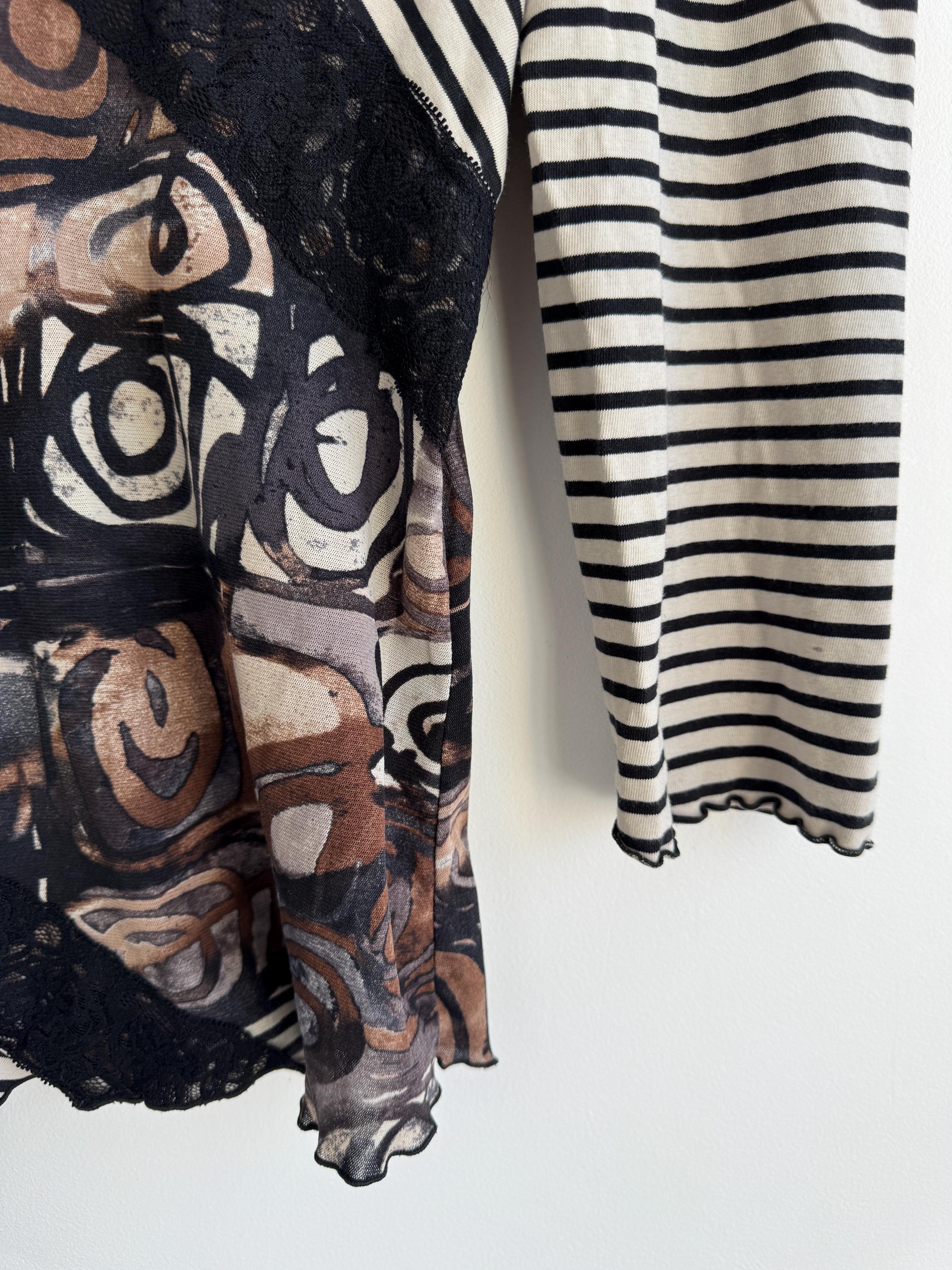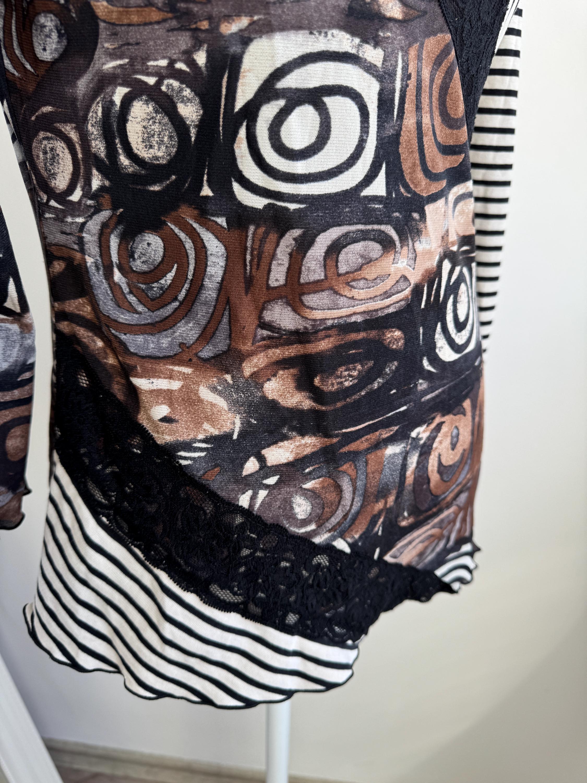 This vintage 90s mesh blouse by San Diego is a rare mixed-print patchwork find — combining black and cream horizontal stripes with a semi-sheer abstract swirl panel in rich earth tones of brown, black and taupe, separated by a bold diagonal black lace trim. It's a genuinely striking 3/4 sleeve women's top in EU size 38 (fits like medium) that blends the best of late 90s and Y2K fashion in one eclectic piece. If you love statement vintage clothing that turns heads without trying, this is the one.