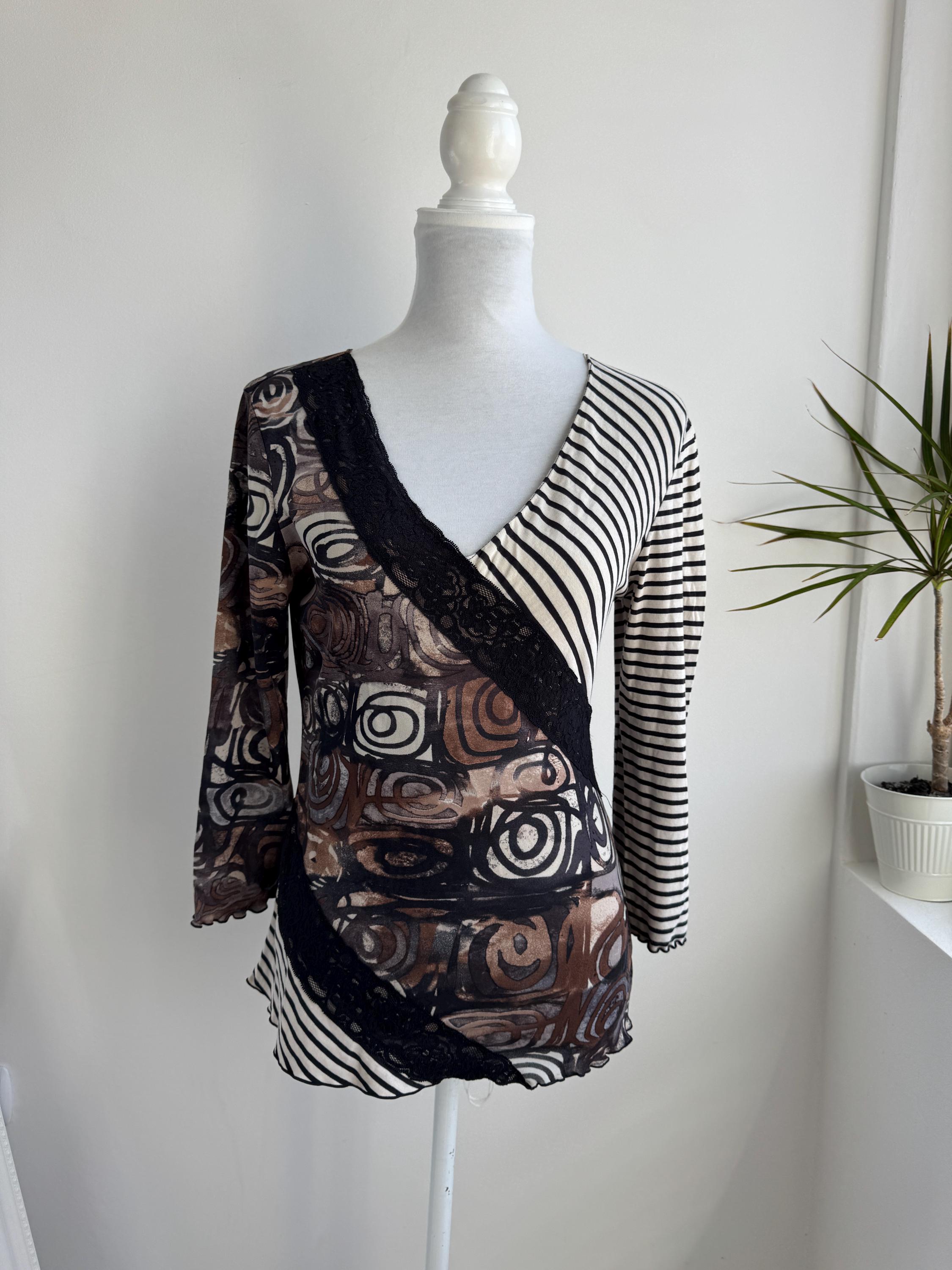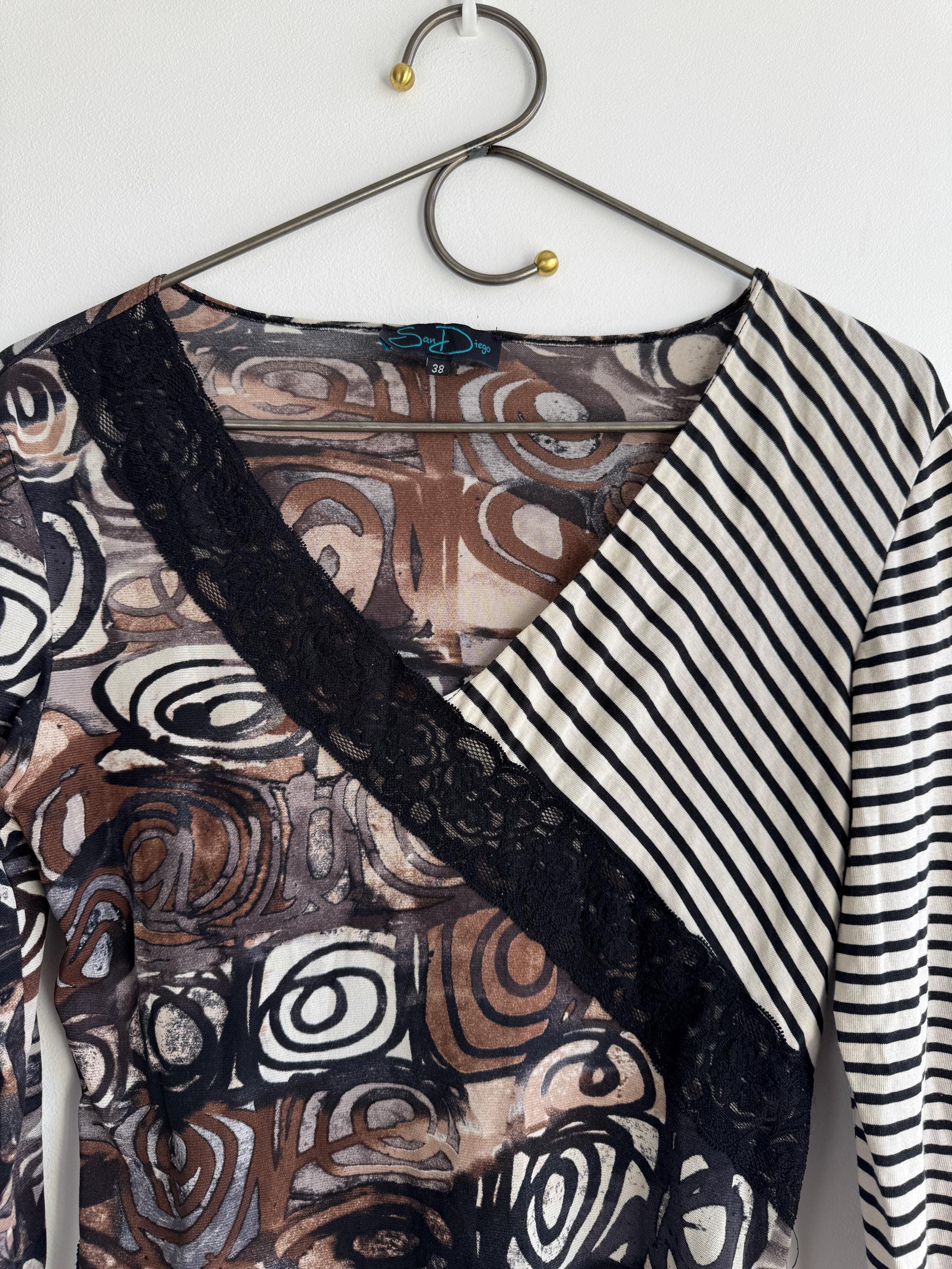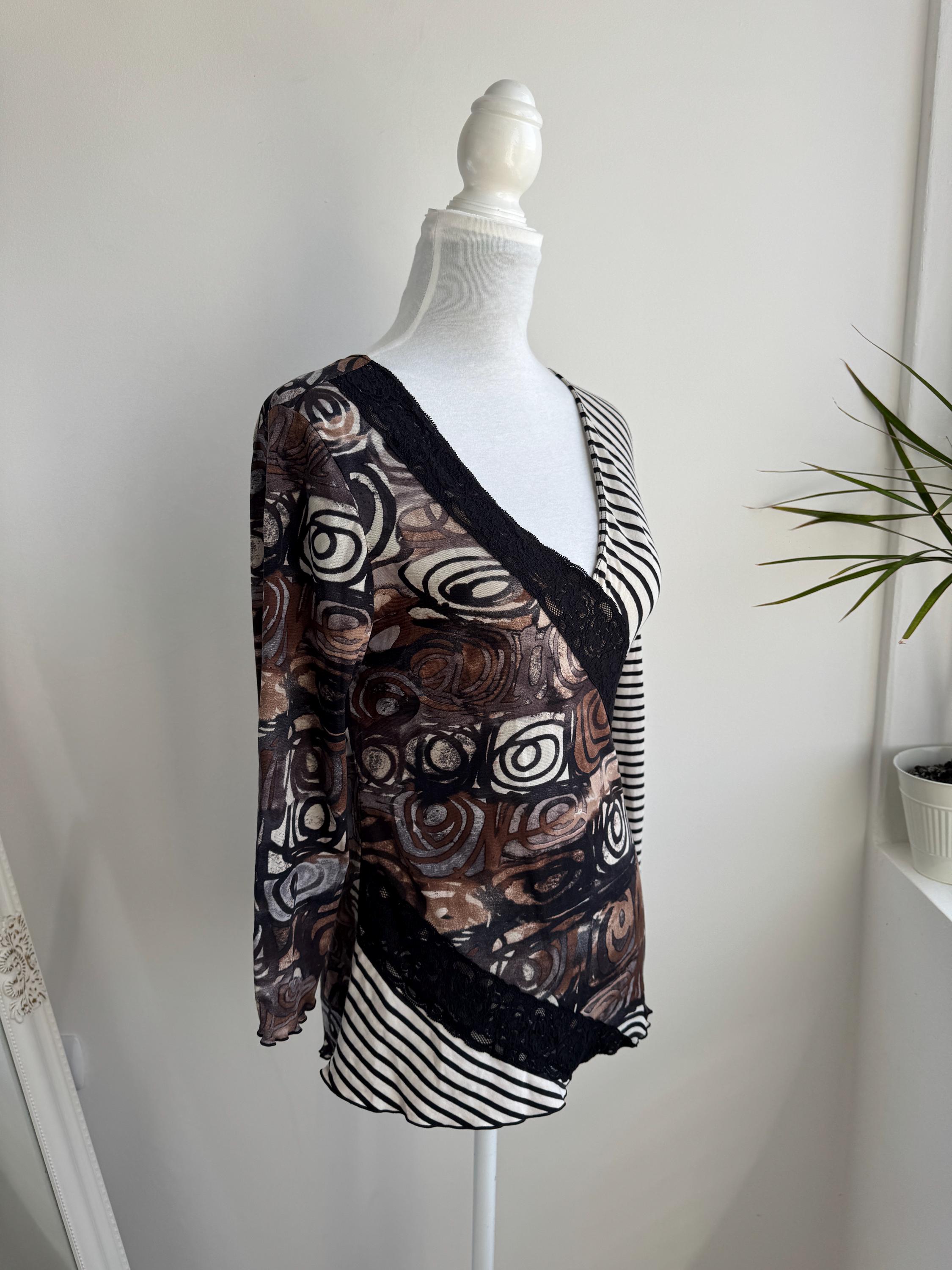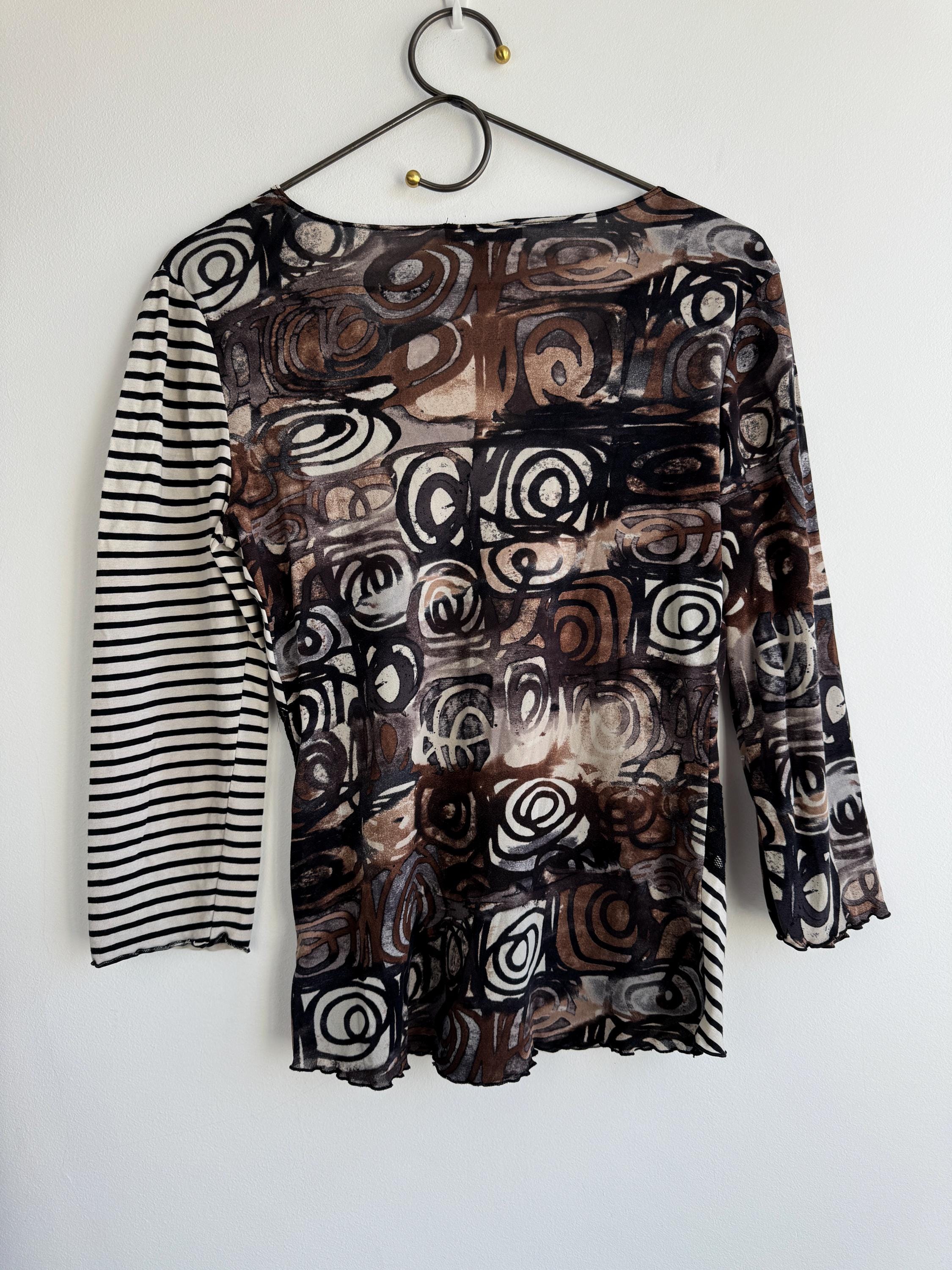 This vintage 90s mesh blouse by San Diego is a rare mixed-print patchwork find — combining black and cream horizontal stripes with a semi-sheer abstract swirl panel in rich earth tones of brown, black and taupe, separated by a bold diagonal black lace trim. It's a genuinely striking 3/4 sleeve women's top in EU size 38 (fits like medium) that blends the best of late 90s and Y2K fashion in one eclectic piece. If you love statement vintage clothing that turns heads without trying, this is the one.