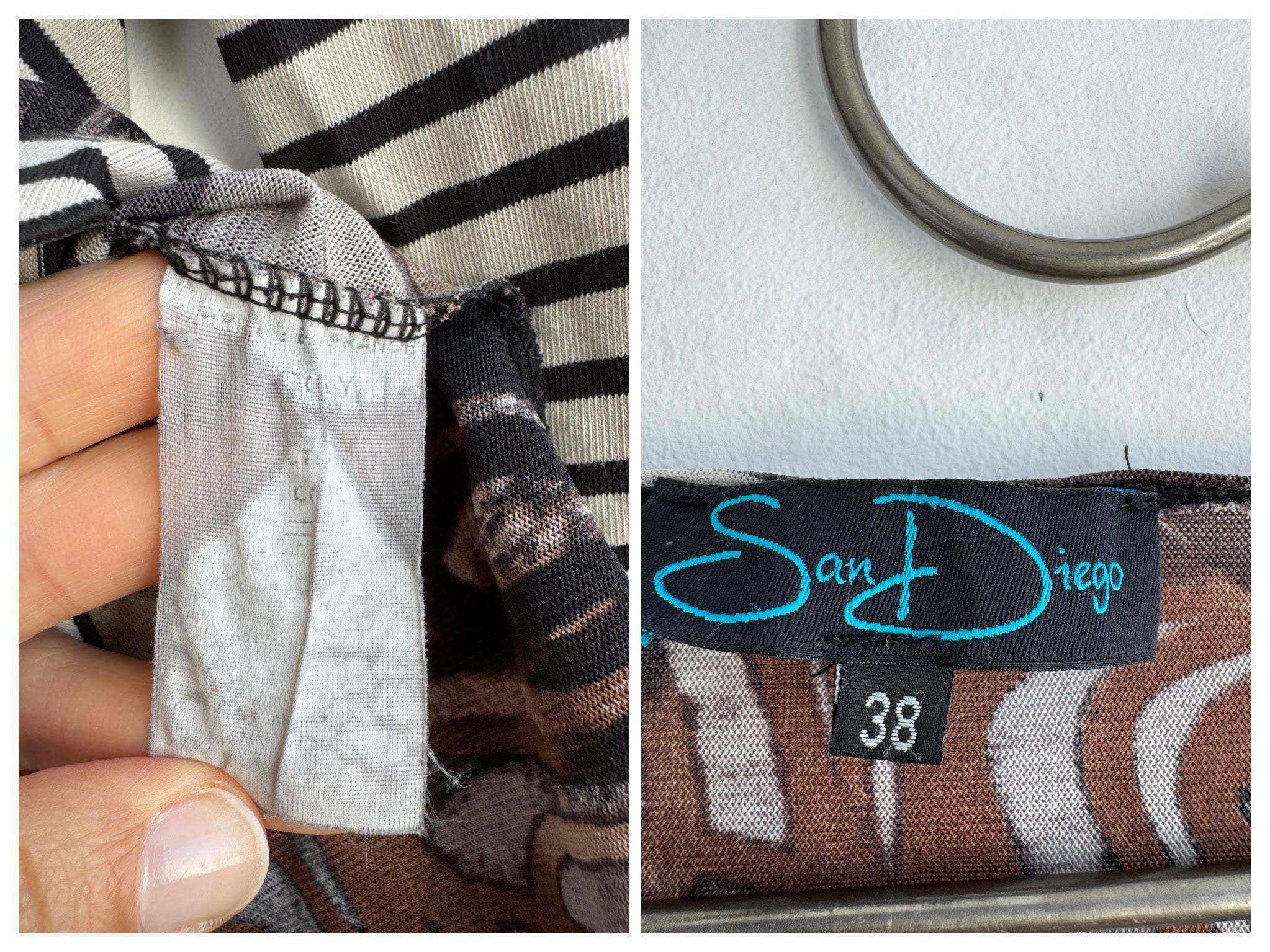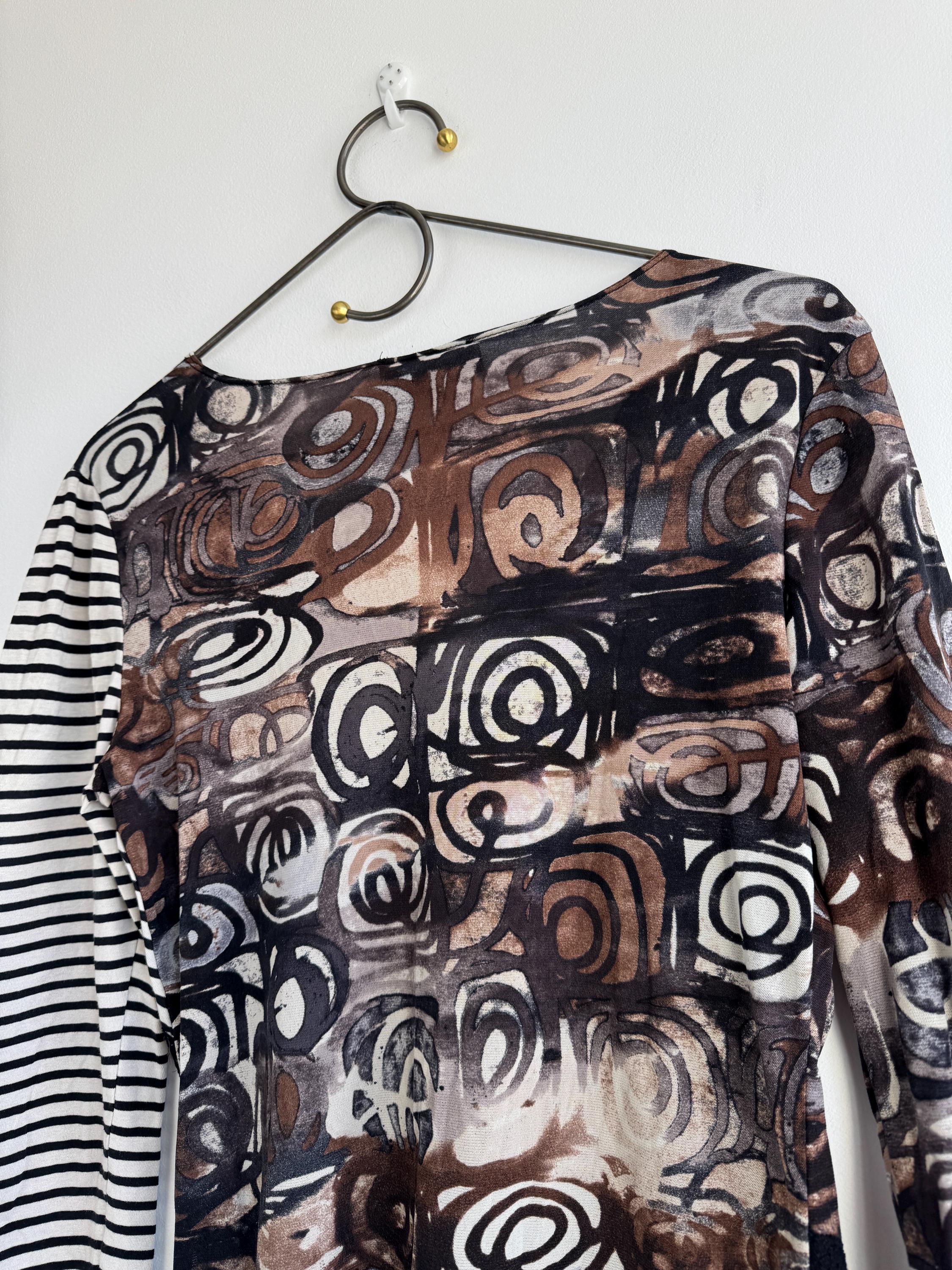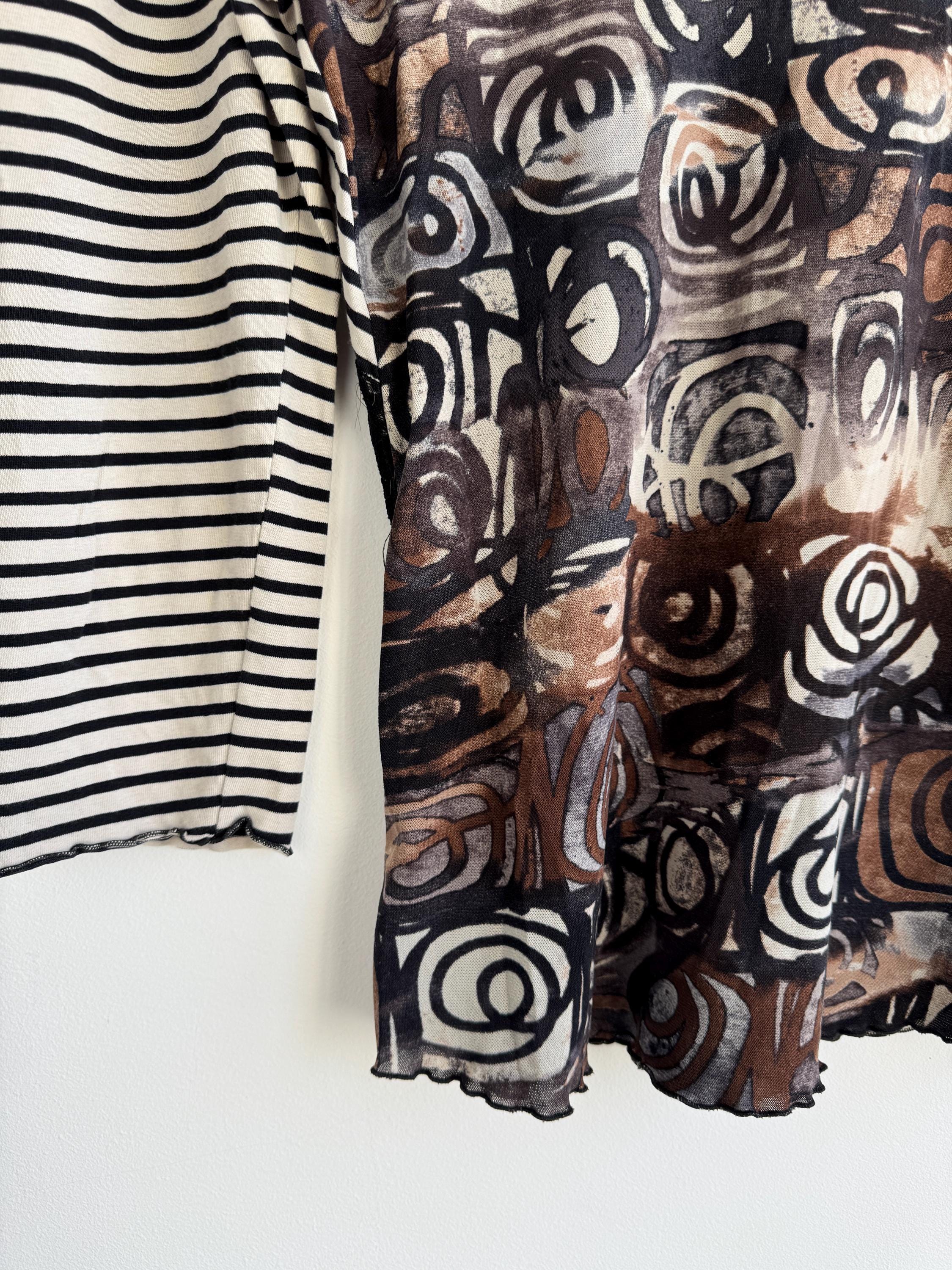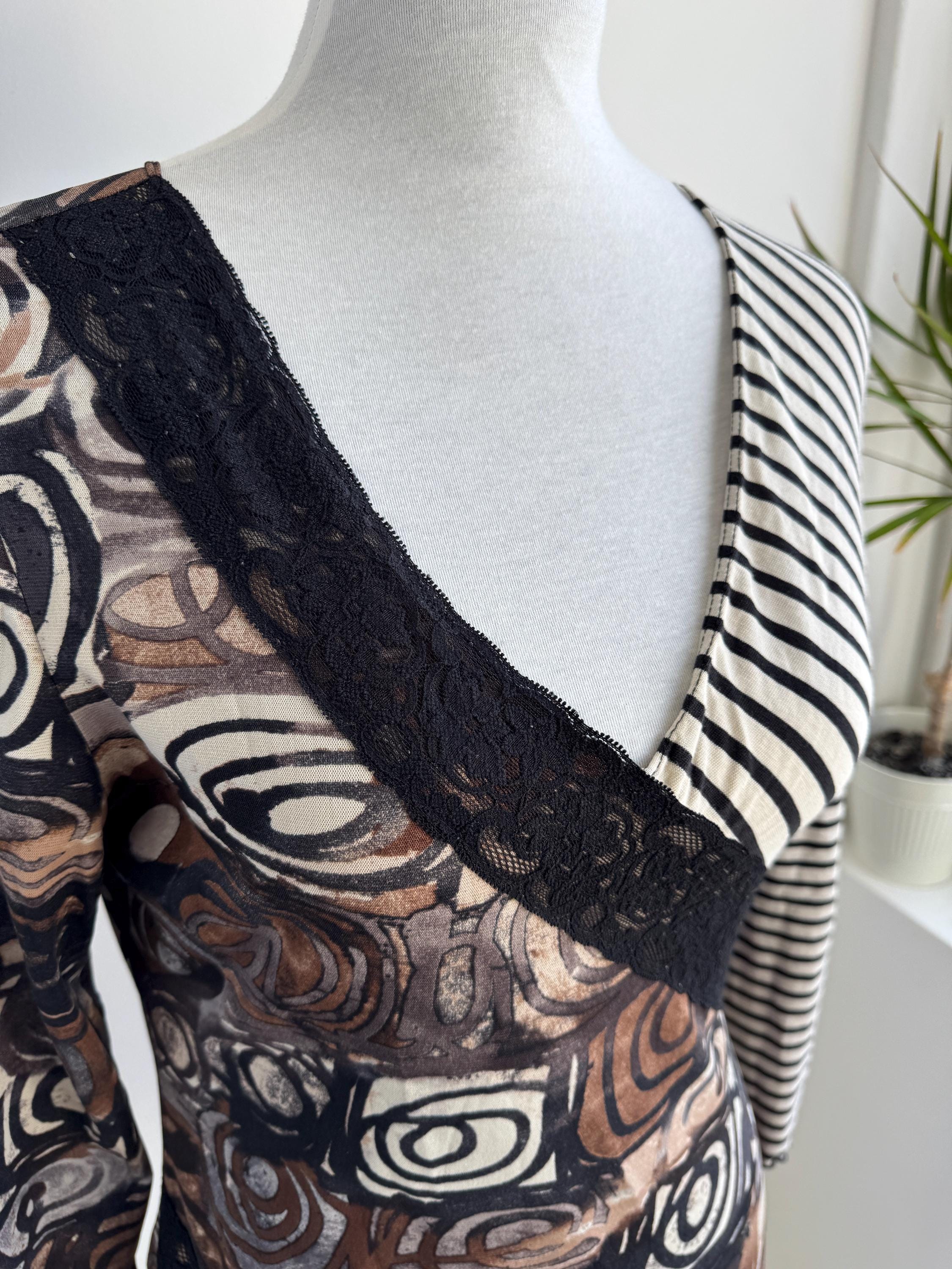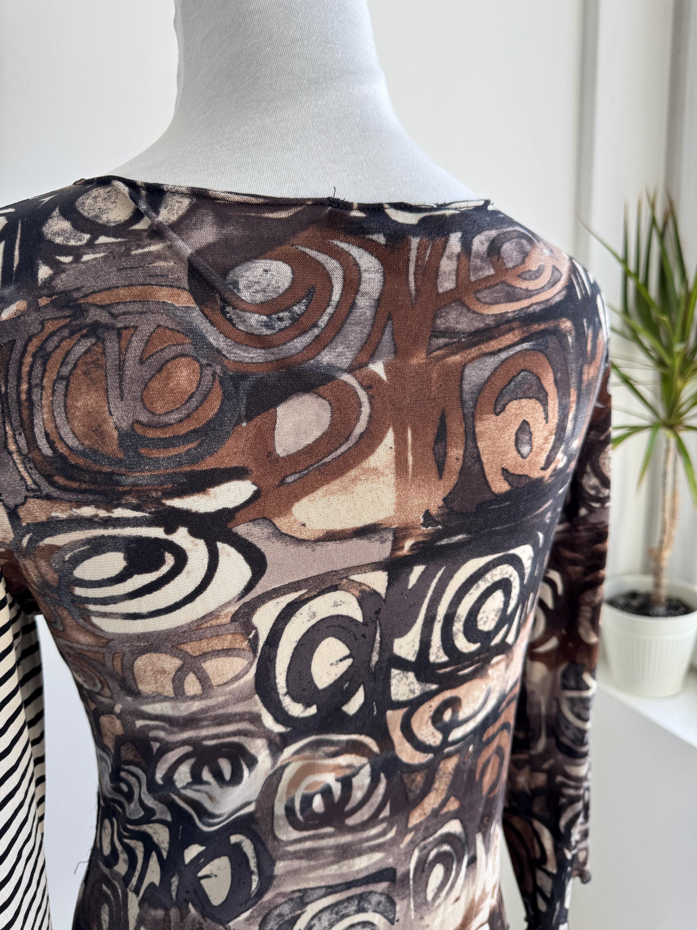 This vintage 90s mesh blouse by San Diego is a rare mixed-print patchwork find — combining black and cream horizontal stripes with a semi-sheer abstract swirl panel in rich earth tones of brown, black and taupe, separated by a bold diagonal black lace trim. It's a genuinely striking 3/4 sleeve women's top in EU size 38 (fits like medium) that blends the best of late 90s and Y2K fashion in one eclectic piece. If you love statement vintage clothing that turns heads without trying, this is the one.