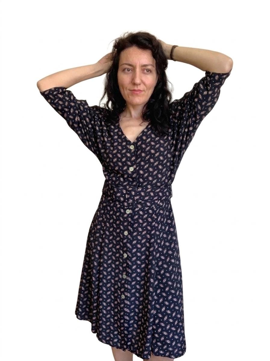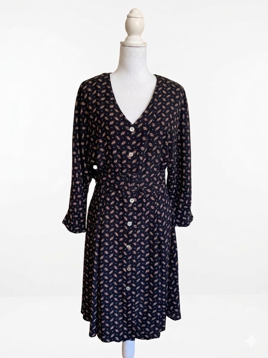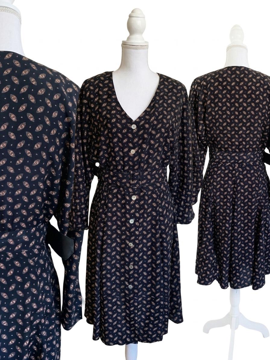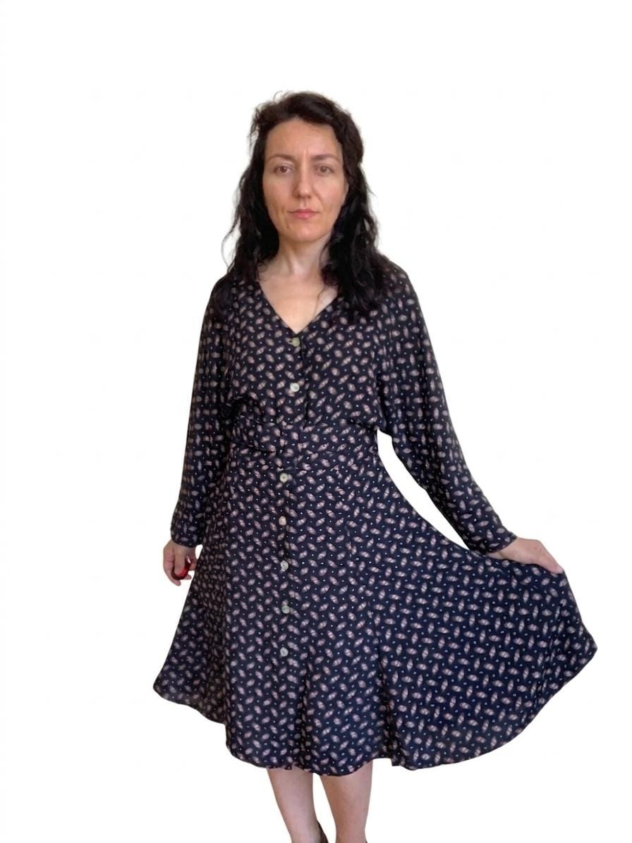 This vintage black button-down midi dress features a stunning fit-and-flare silhouette and elegant long batwing sleeves for a timeless, minimalist look. Crafted from 100% fluid viscose, this soft shirt dress moves beautifully and serves as a versatile staple for a dark academia or retro-inspired wardrobe.