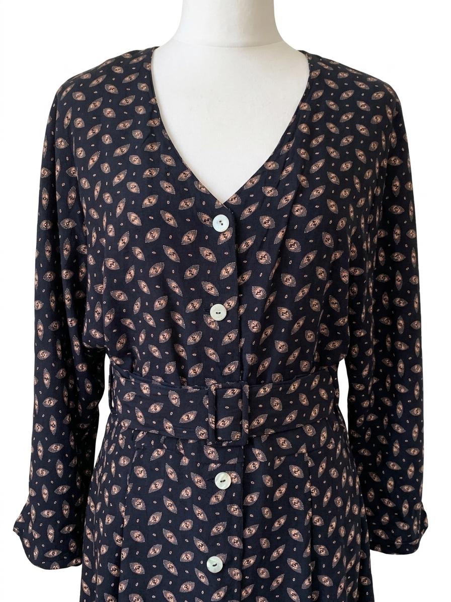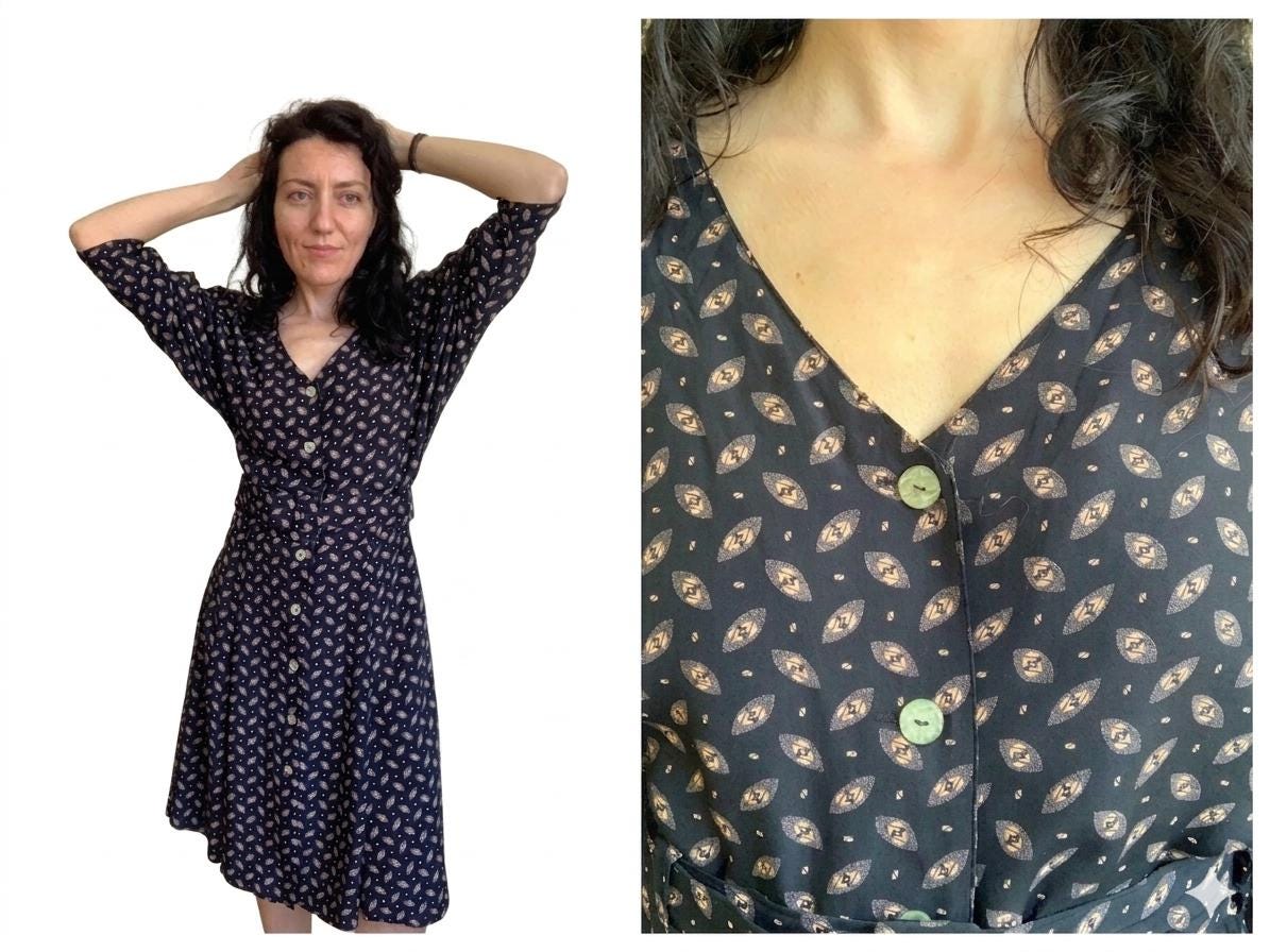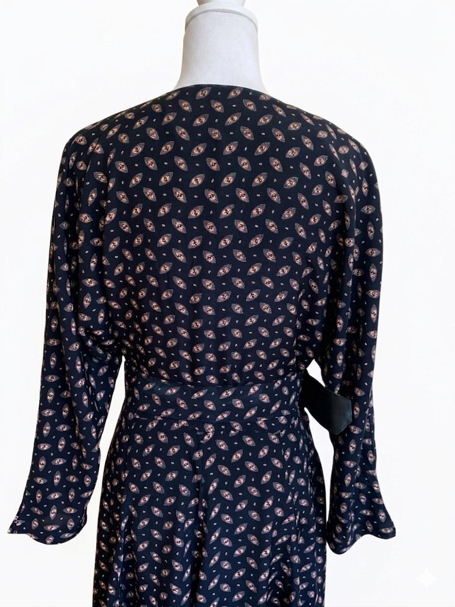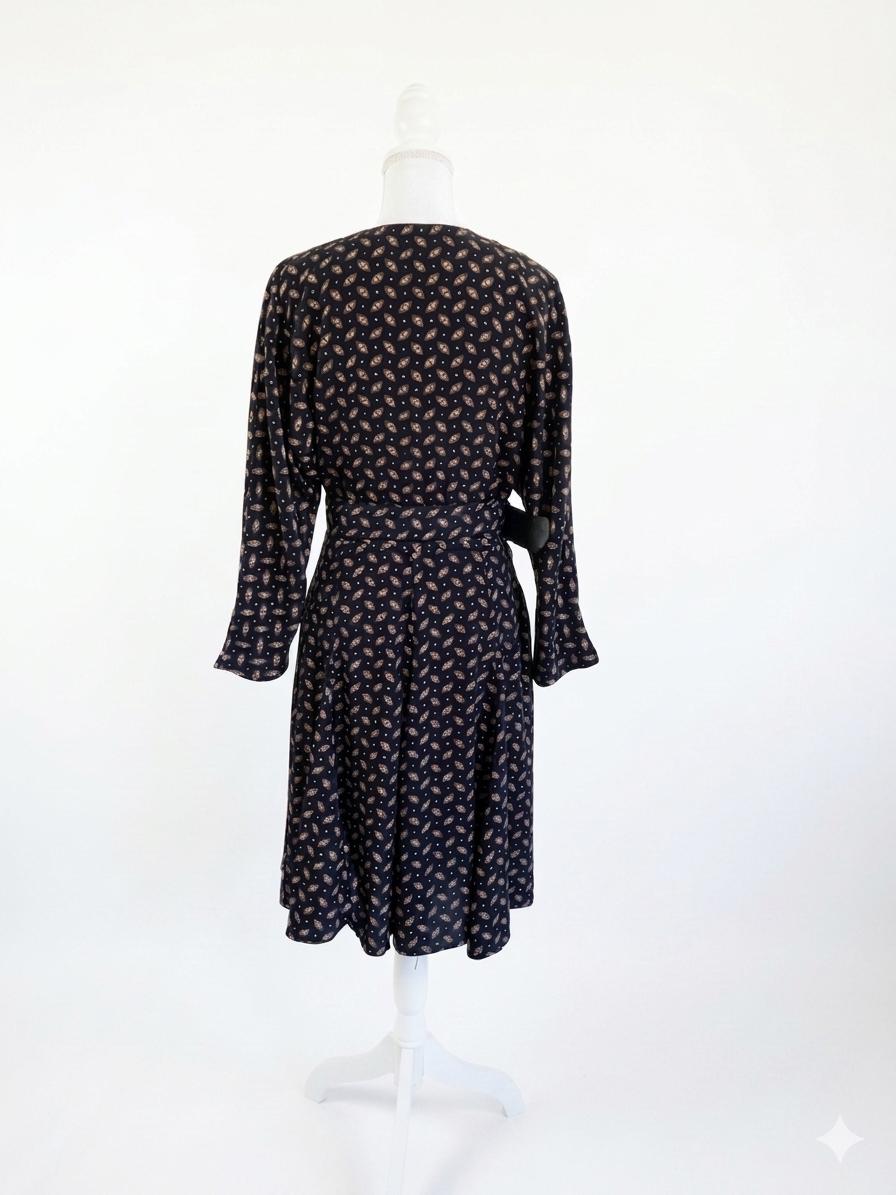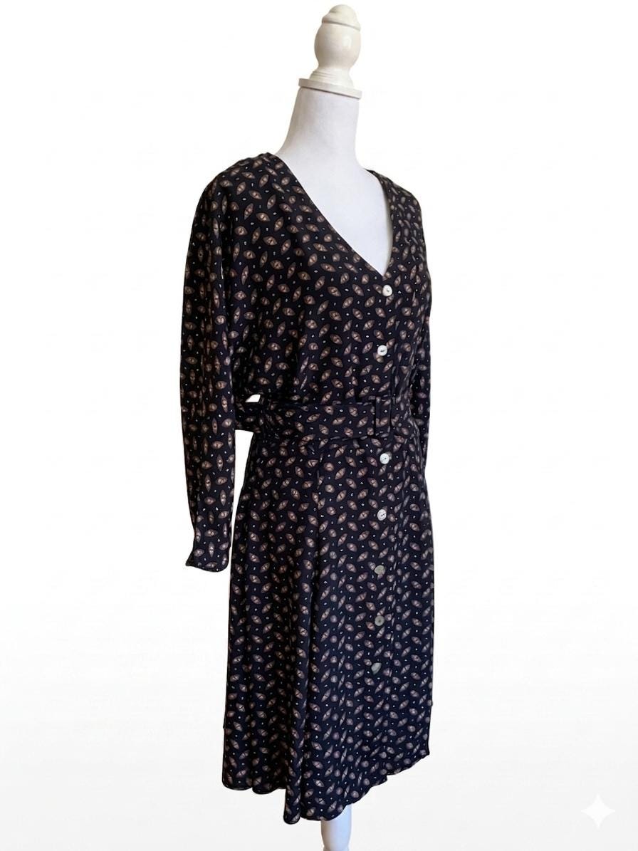 This vintage black button-down midi dress features a stunning fit-and-flare silhouette and elegant long batwing sleeves for a timeless, minimalist look. Crafted from 100% fluid viscose, this soft shirt dress moves beautifully and serves as a versatile staple for a dark academia or retro-inspired wardrobe.