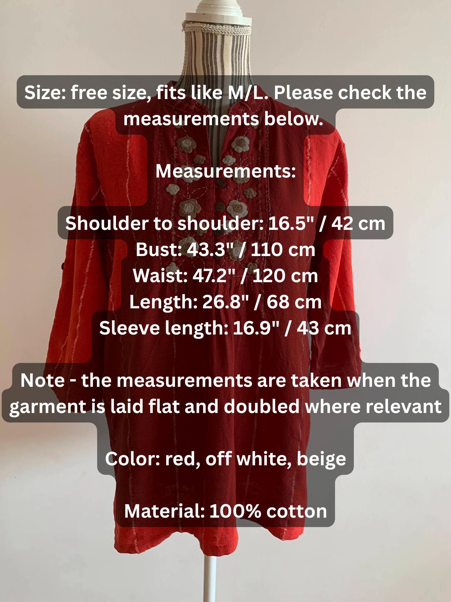 This vibrant vintage 90s red cotton embroidered shirt is the perfect addition to a bohemian or cottagecore wardrobe. Hand-finished with delicate off-white and beige crochet flower appliqués, this breathable 100% cotton blouse features a relaxed, loose fit with a classic half-button closure. Designed with versatile 3/4 roll-tab sleeves, it effortlessly transitions from a casual day top to a standout festival shirt. Whether you are looking for a unique Thai-made piece or a comfortable hippie-style tunic, this embroidered top offers a timeless, airy silhouette for sizes Medium to Large.
