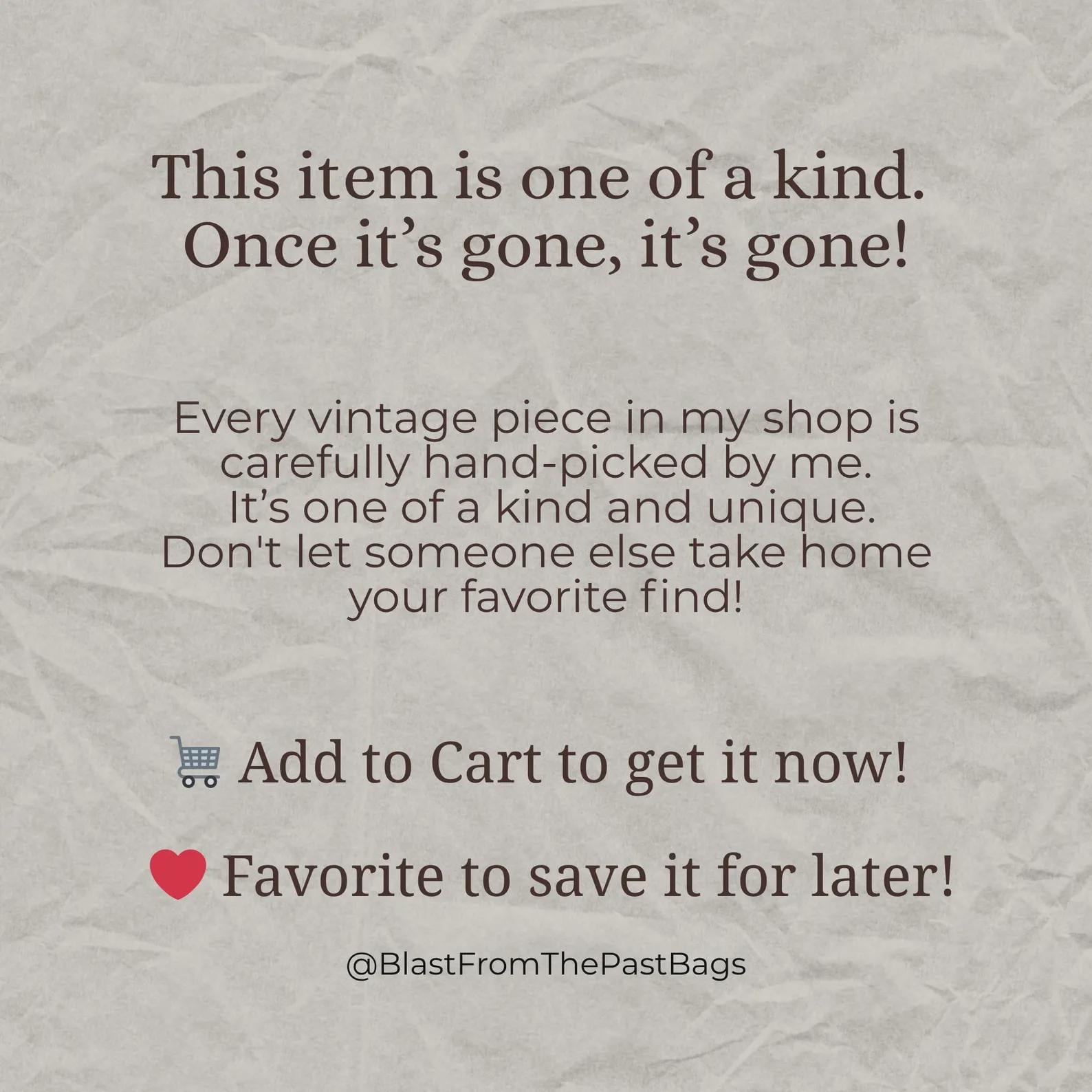 All my items come neatly packaged in simple craft paper and twine with a BlastFromThePastBags business card and a thank you note. They are gift-ready. If you'd like to present the vintage bag, scarf, dress, shirt or belt as a gift, just let me know and I will be happy to white anything you'd like on the thank you card. If you are presenting the item as a gift for special occasion, just let me know and I can use special gift wrapping paper that corresponds to the theme - Birthday, Christmas, or any other occasion :)