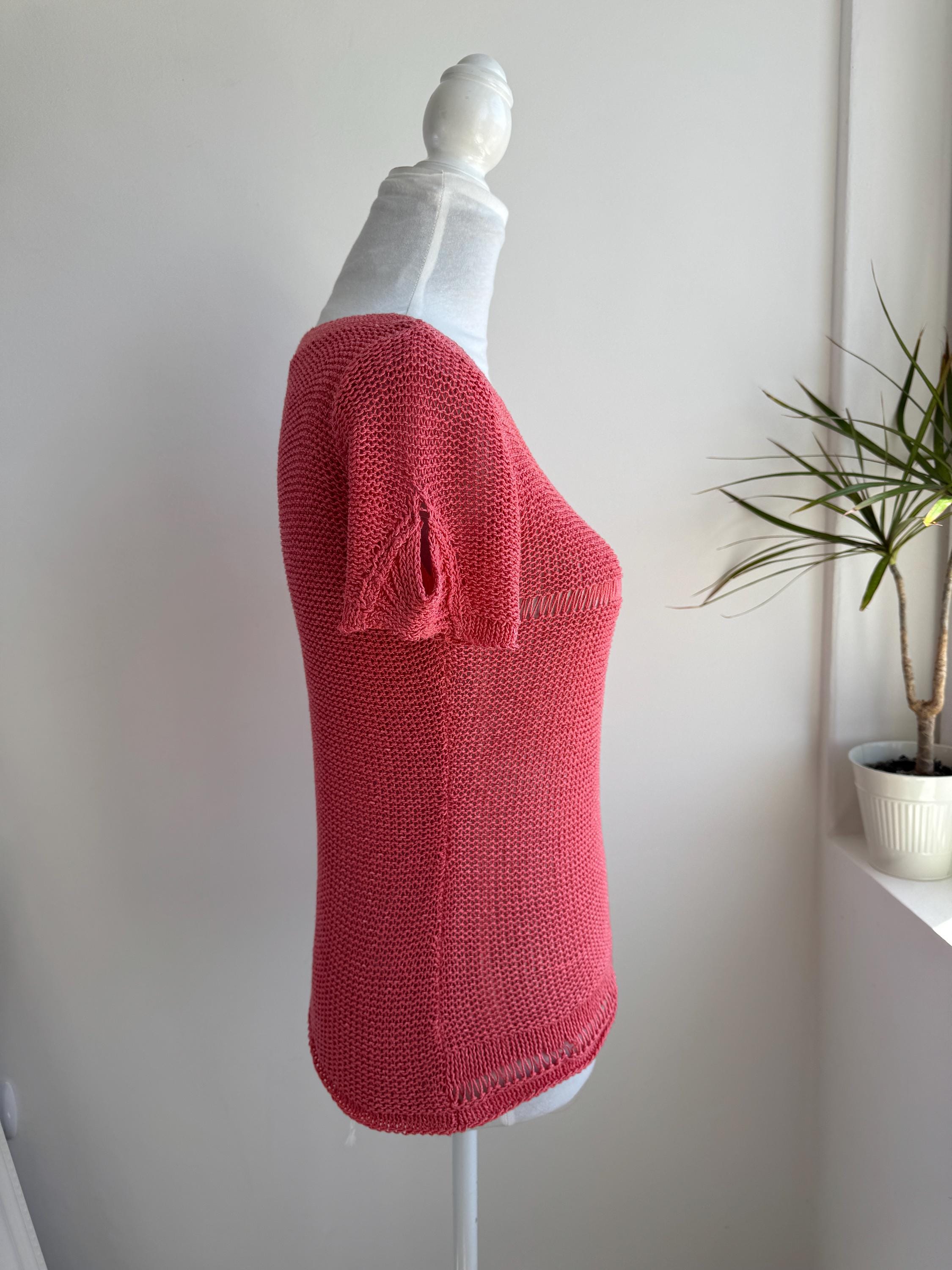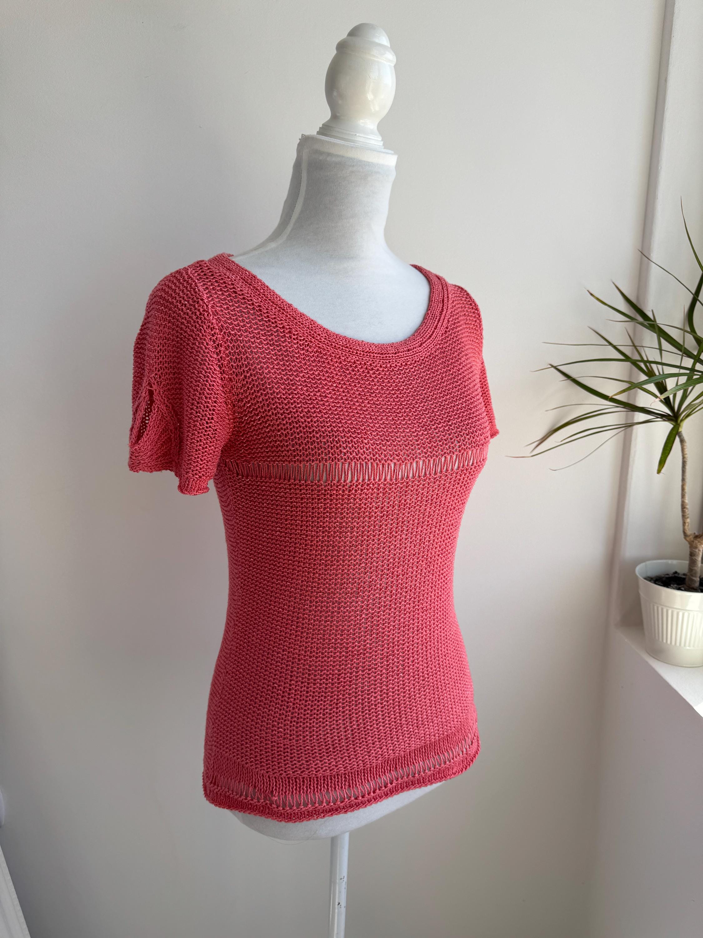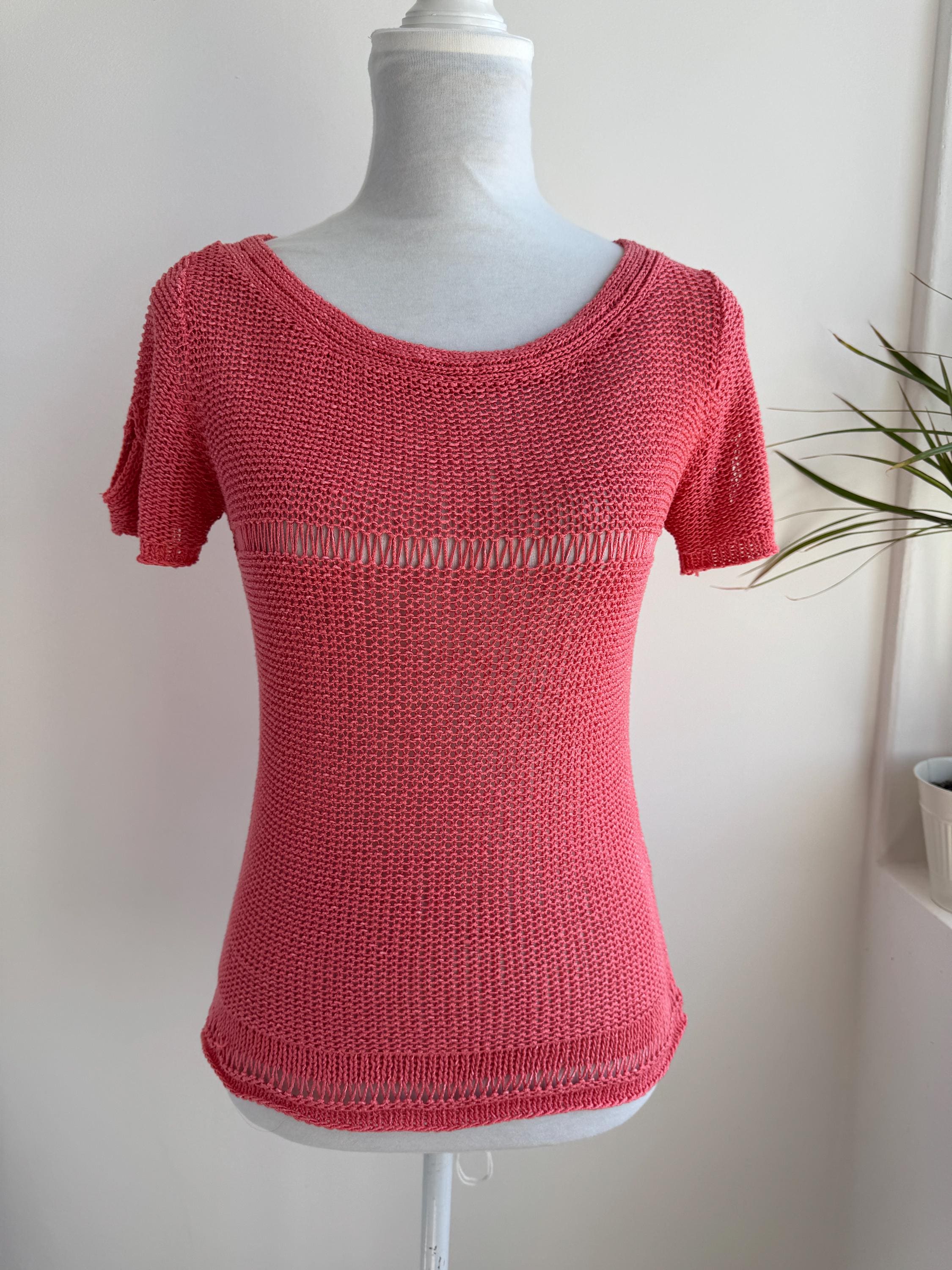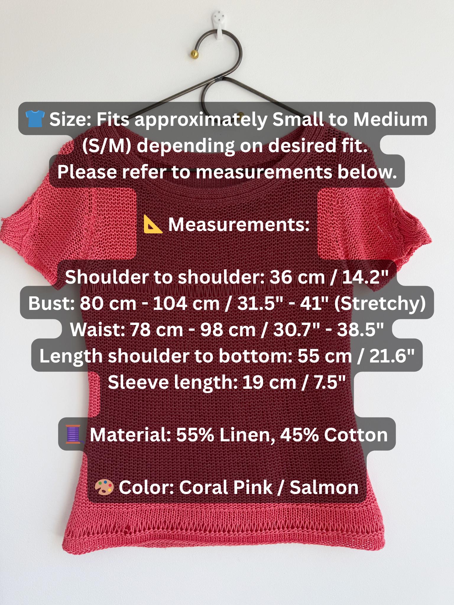 This vintage coral pink linen knit top is the ultimate breathable summer blouse for your sustainable wardrobe. Expertly crafted from a high-quality linen cotton blend, this short sleeve salmon pink sweater offers a beautiful natural texture and a timeless boho aesthetic. Whether you are searching for a cottagecore knit or a chic coastal grandmother staple, this versatile open work crochet style top provides a flattering, airy fit that transitions perfectly from a seaside stroll to a casual evening out.