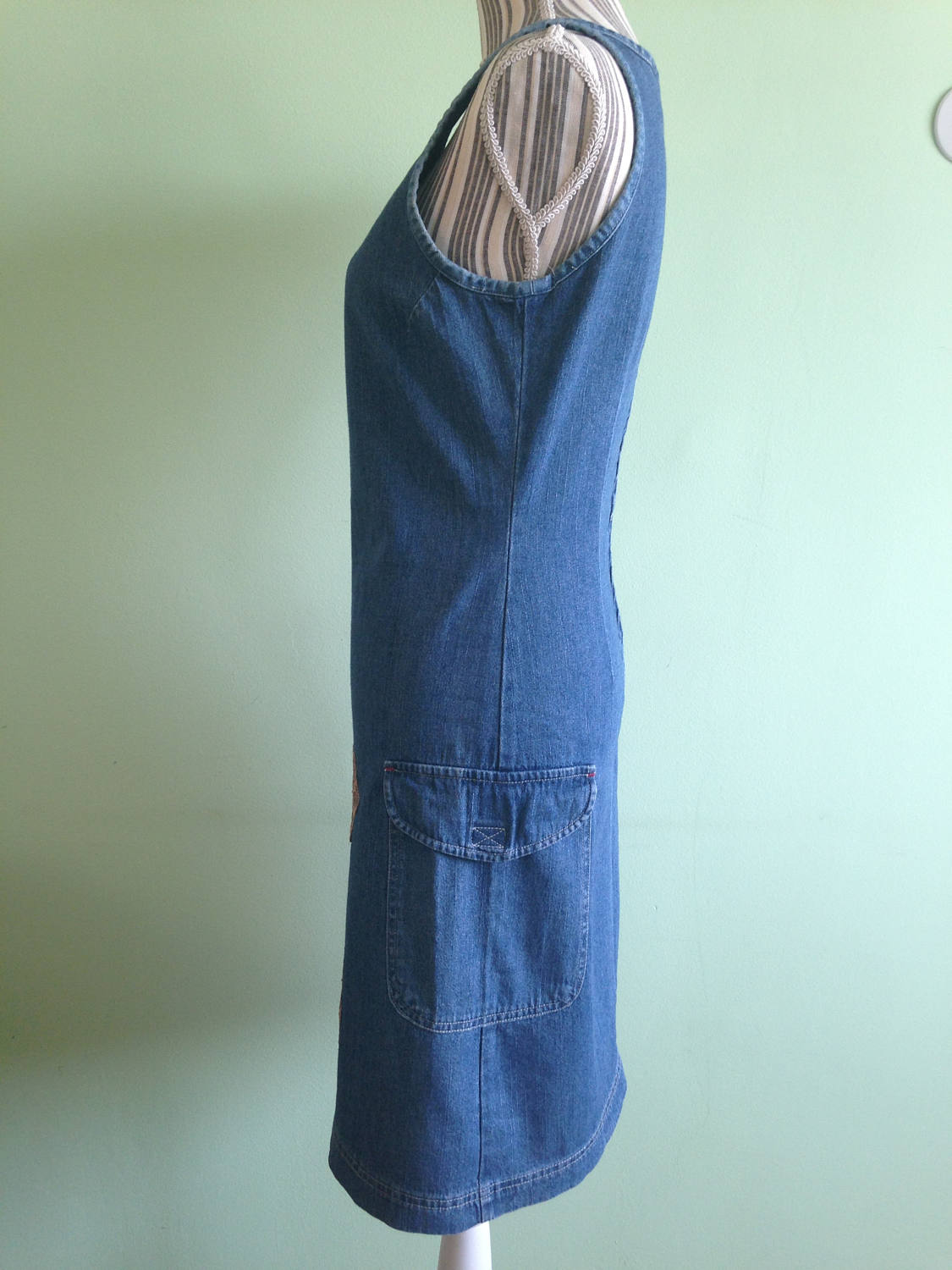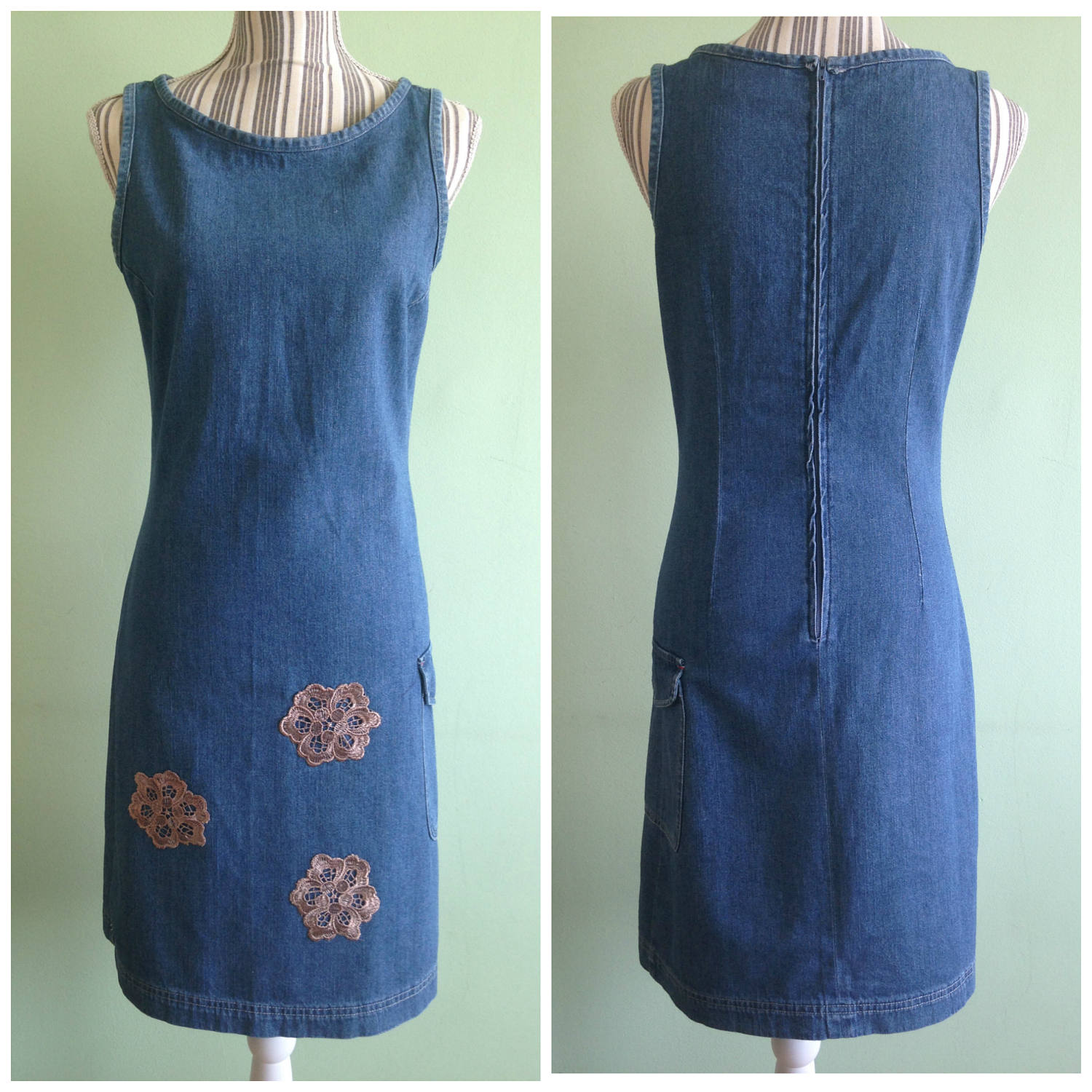 This is a simple 90s fitted denim dress with back zip closure. This blue jeans dress fits right below the knee and beautifully wraps the body. This simple sarafan dress is made of cotton fabric. It has three silk flower applique decorations on the front of the skirt in champagne beige color. There is a side pocket as well. This 90s grunge dress is perfect to wear in the spring summer season. It would look great with a knitted cardigan.