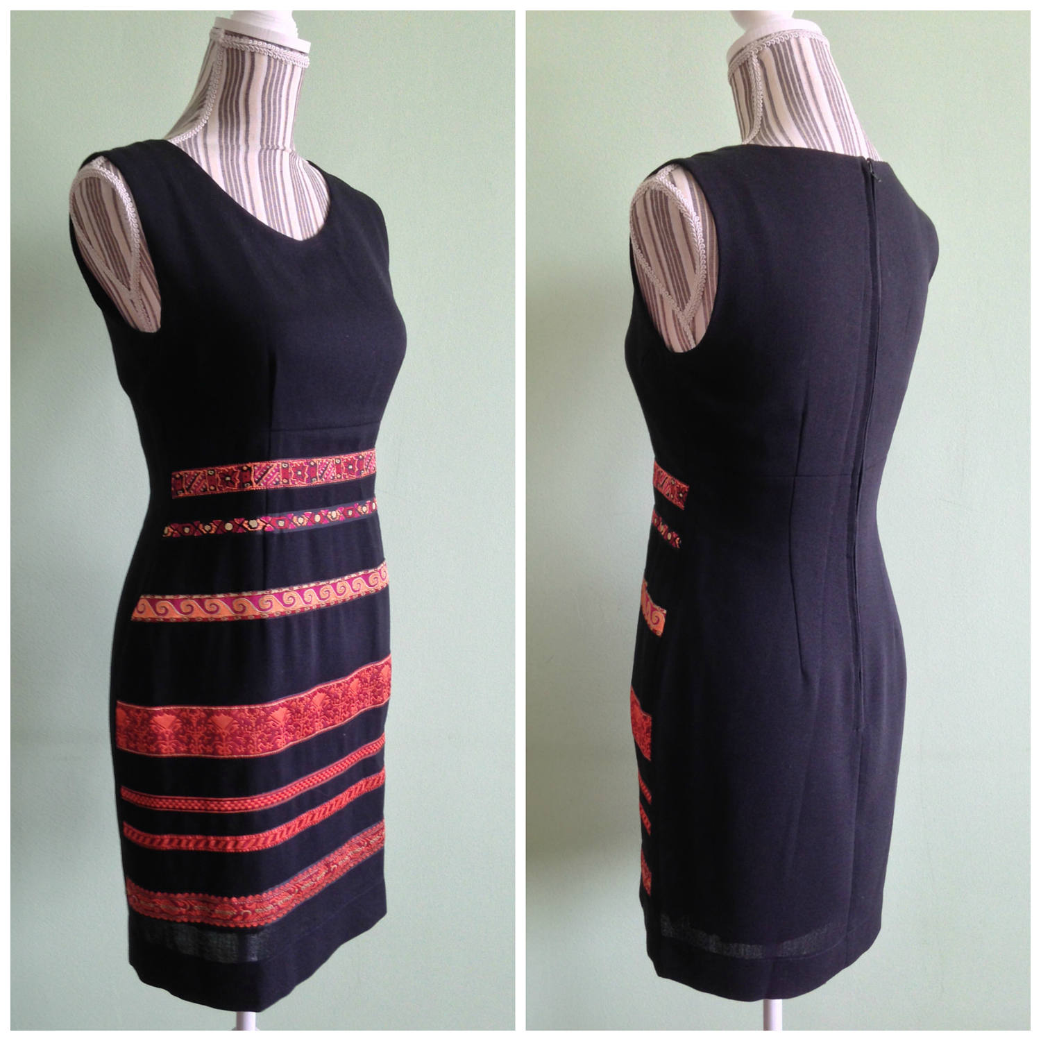 This is a vintage 90s black pencil dress with beautiful horizontal stripe applique decoration in ethno style. This black fitted dress has a simple plain back. There is a back zipper which allows you to easily slip it off. The size of this black evening dress marked on the label is EUR 38 which corresponds to US 8. There is a little fabric label inside which states that this dress was manufactured in France. The fabric type has not been marked on the label. This little black dress feels like it was made of polyester. It has no stretch to it. There is also polyester lining underneath, so this dress is not transparent at all.