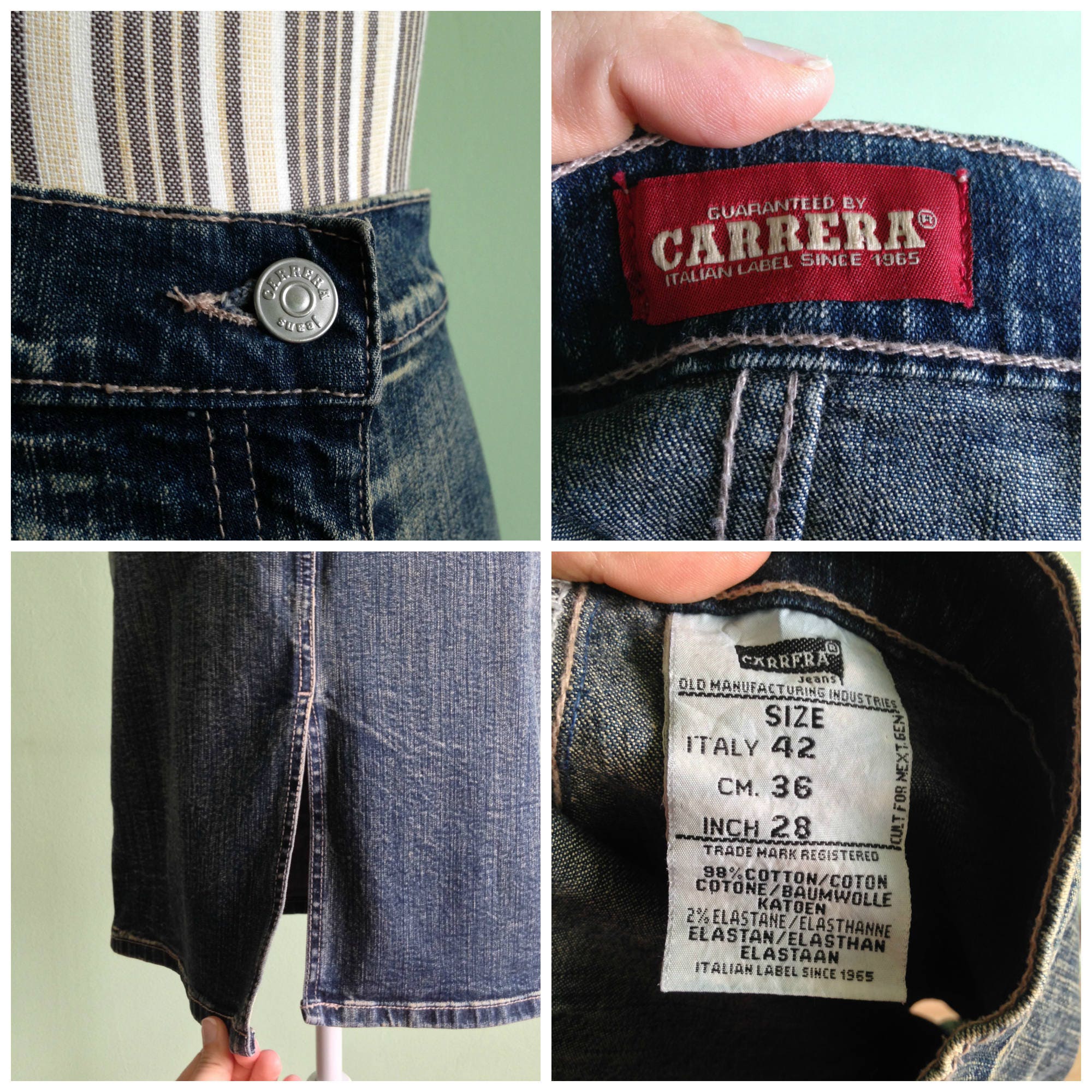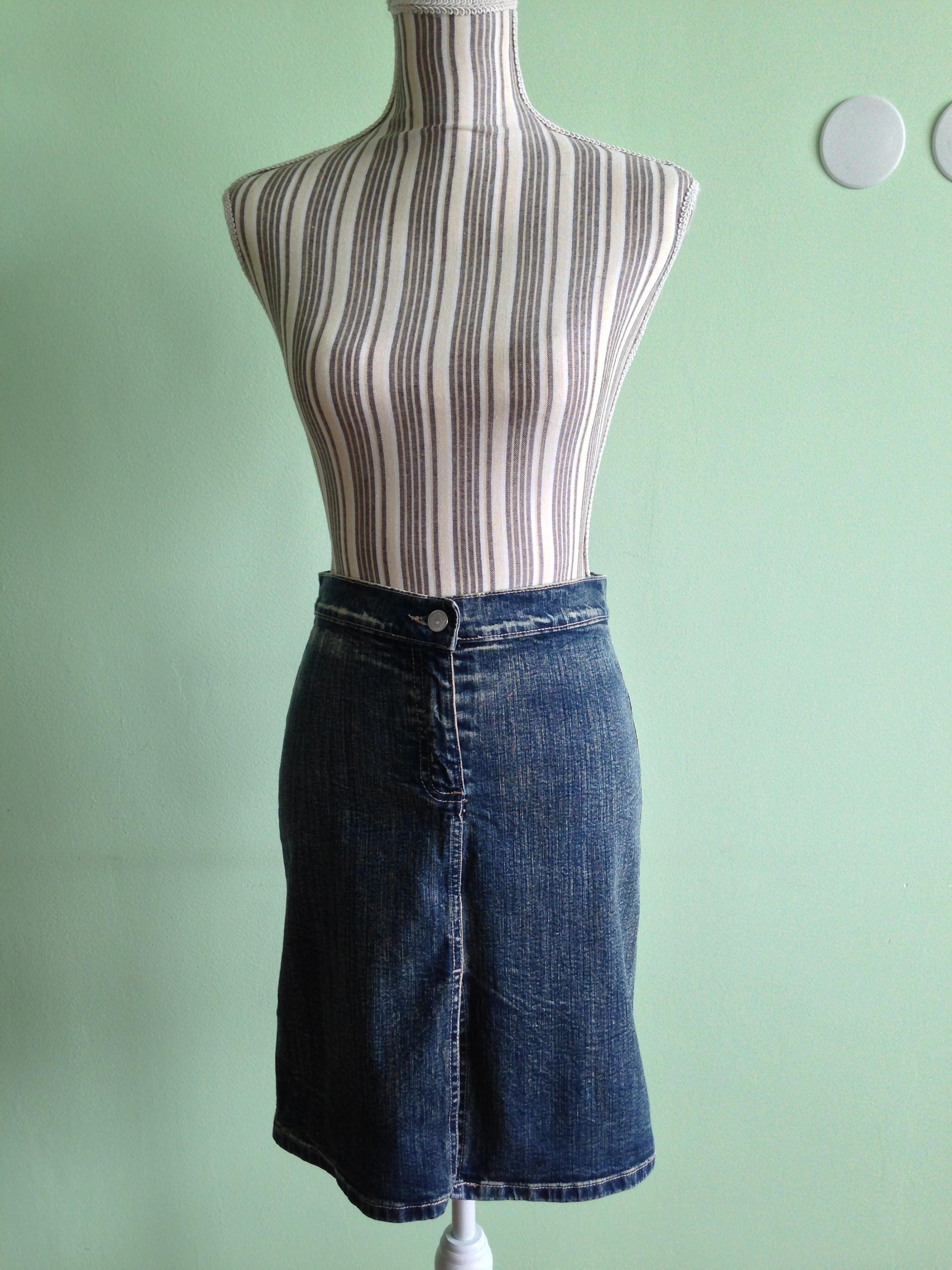 This is a front slit denim tulip skirt which has a bit of flare at the bottom and it fits tight at the top. This highwaisted denim skirt has a front zip and button closure. It falls to the middle of the knees. There is a front slit which gives this jean skirt a sexy wiggle effect. This bleached denim skirt is by the Italian brand Carrera. It was made in the 90s. The size marked on the label is 42 small, which corresponds to US 6, EUR 36. The materials of this midi skirt are 98% cotton and 2% elastane. This washed denim A line skirt has a nice stretch to it and it beautifully embraces your body. Great vintage gift for a hipster lover.