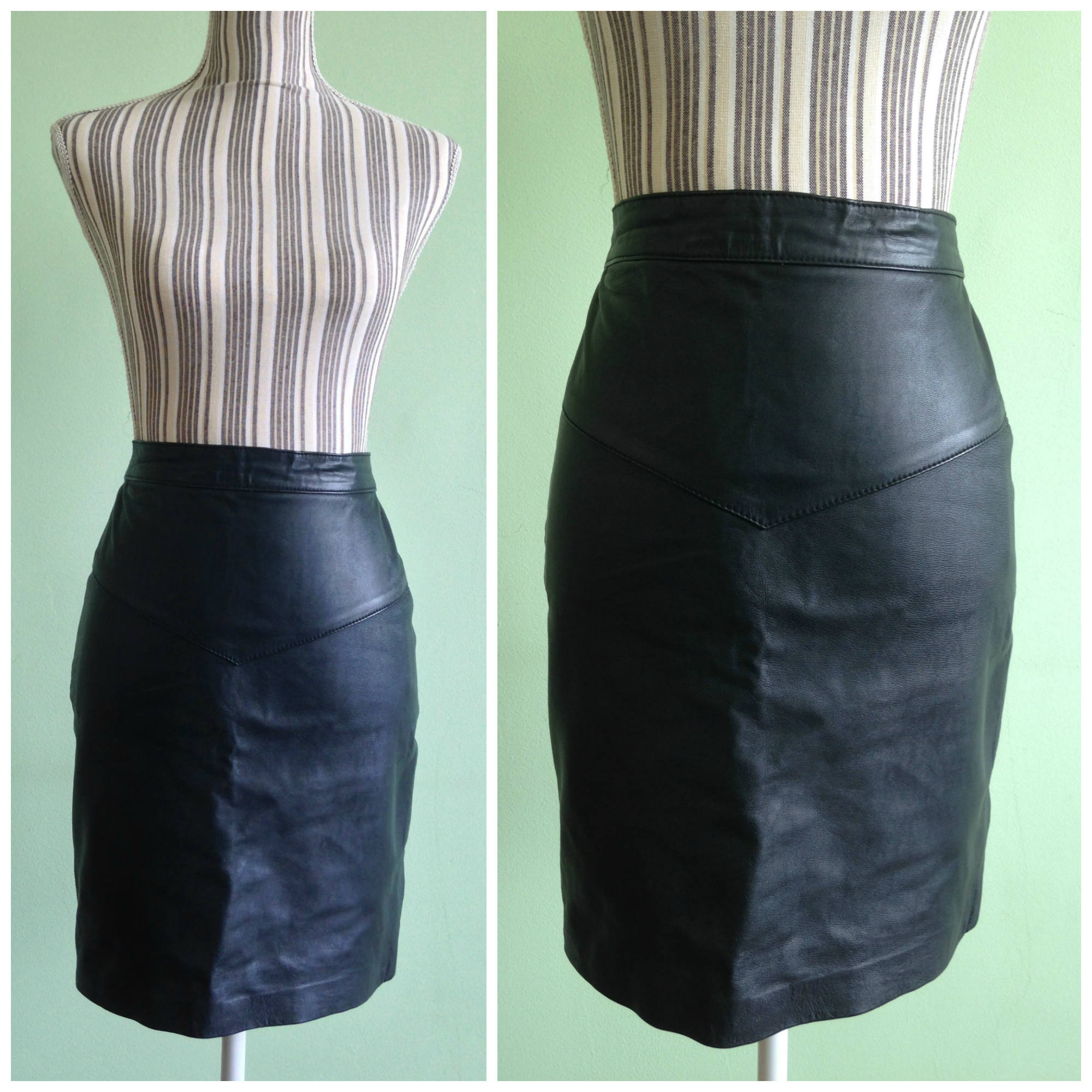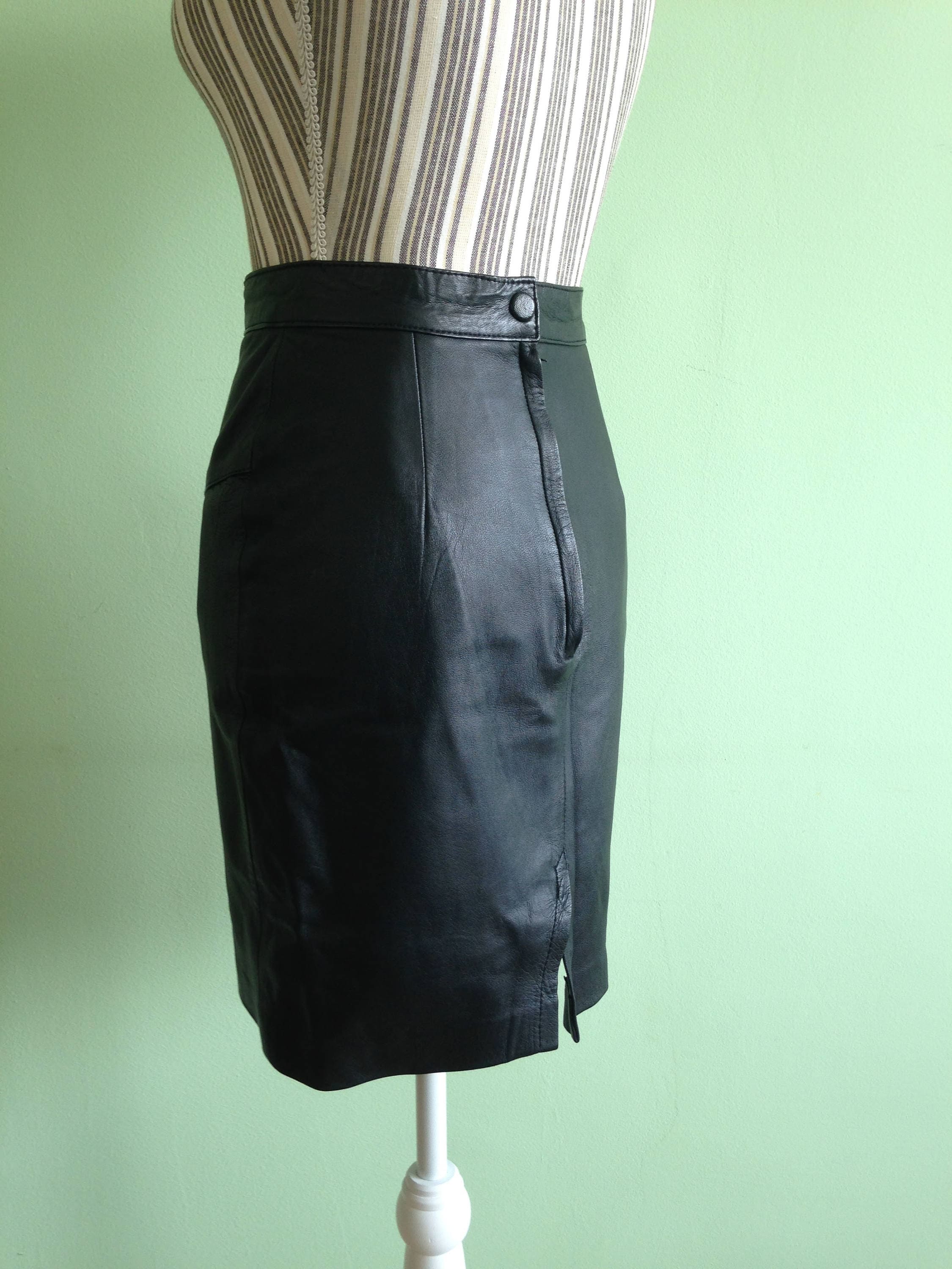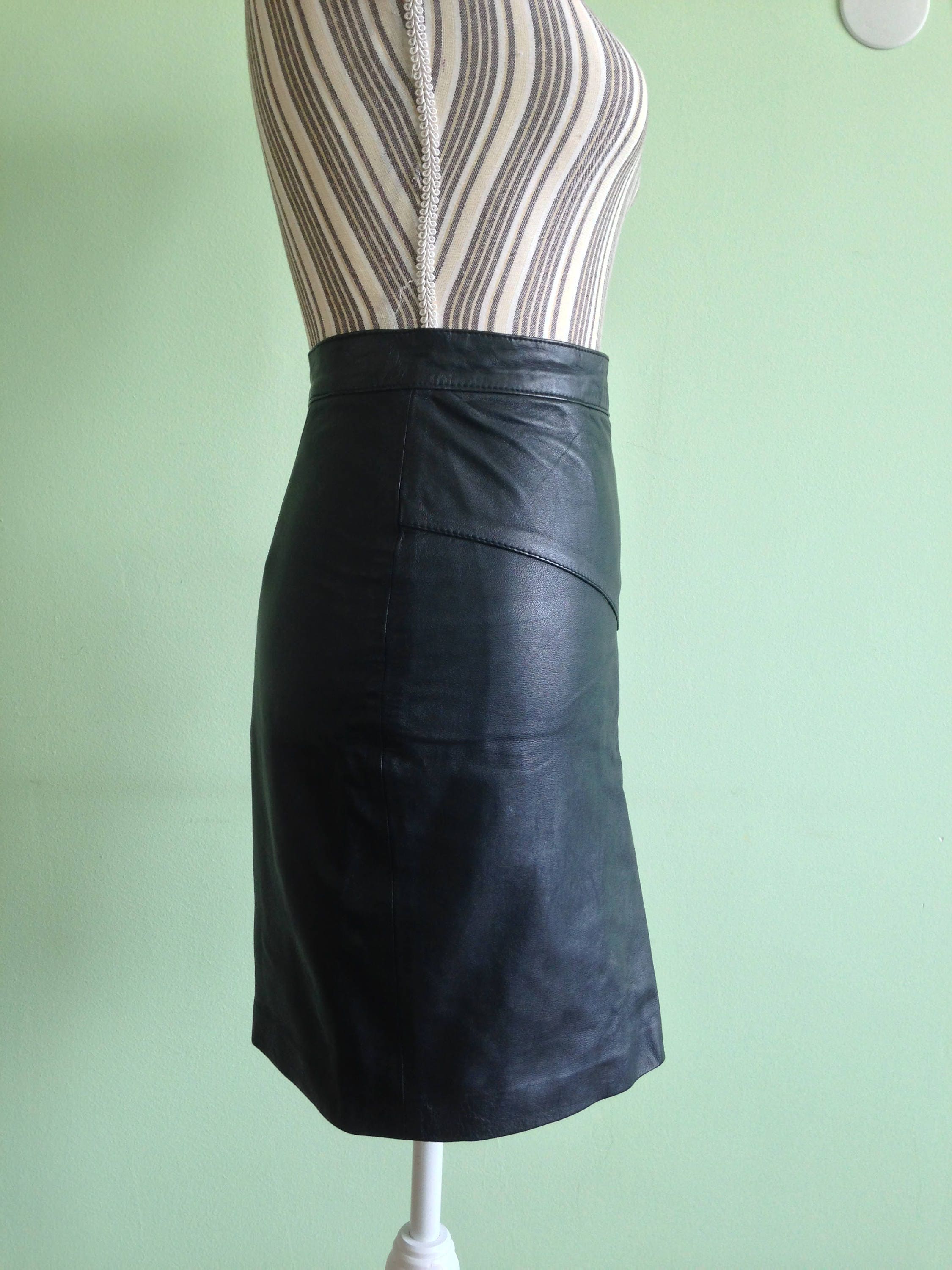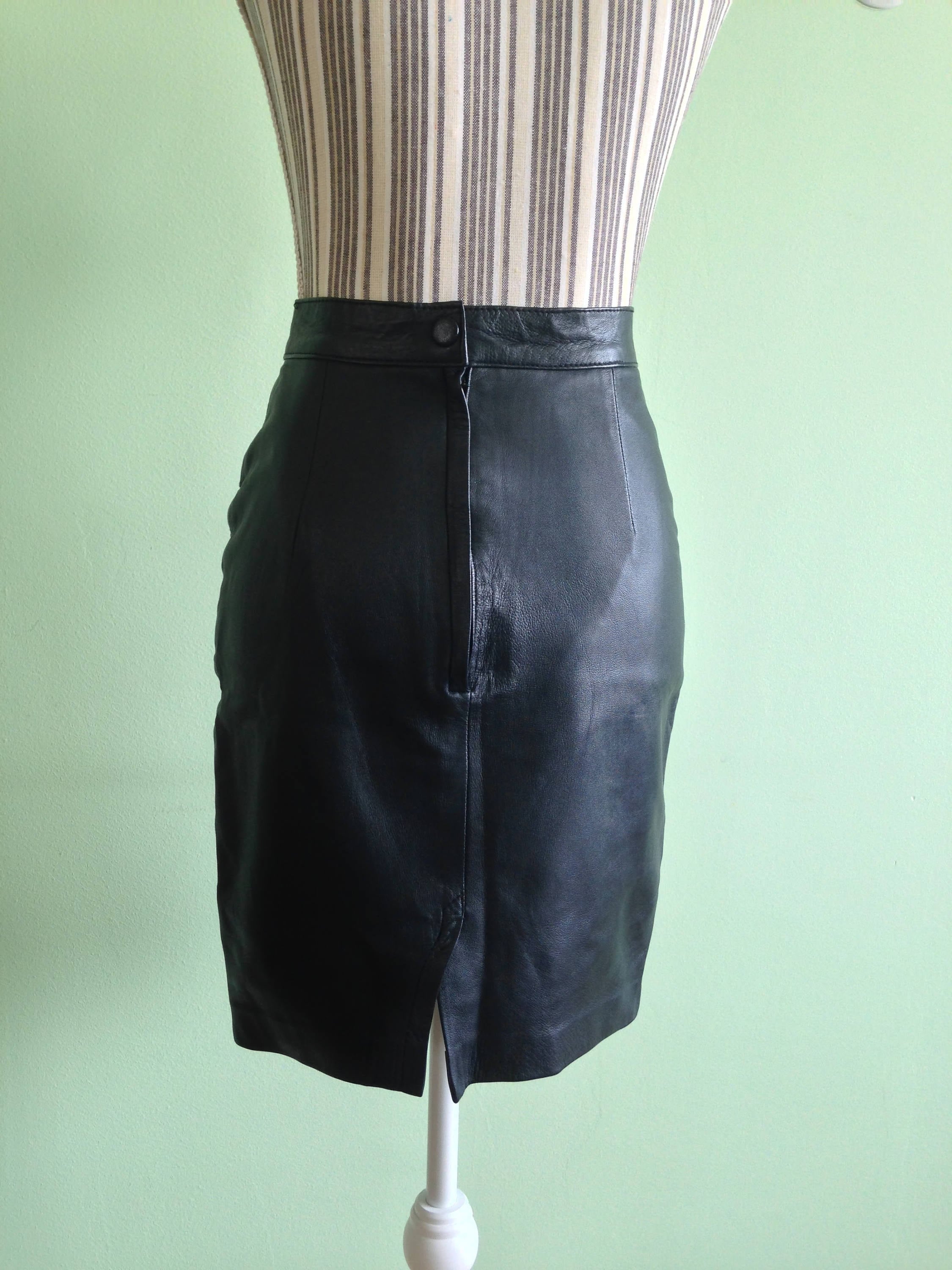 This is a sexy secretary skirt, made of soft genuine leather in jet black color. It has a black polyester lining. This vintage 90s pencil skirt has a fitted minimalist design. It has a back slit which gives you that stunning catwalk. This cure rocker skirt has the potential to be dressed up or down so you can wear it any way you like. Pair it with a simple white tee for a more casual look, or dress it up with a spaghetti strap cocktail top to enjoy the party. This biker skirt will shape your body, making you look even more amazing. This black leather skirt is size small, it fits like EUR 36, US 6,
