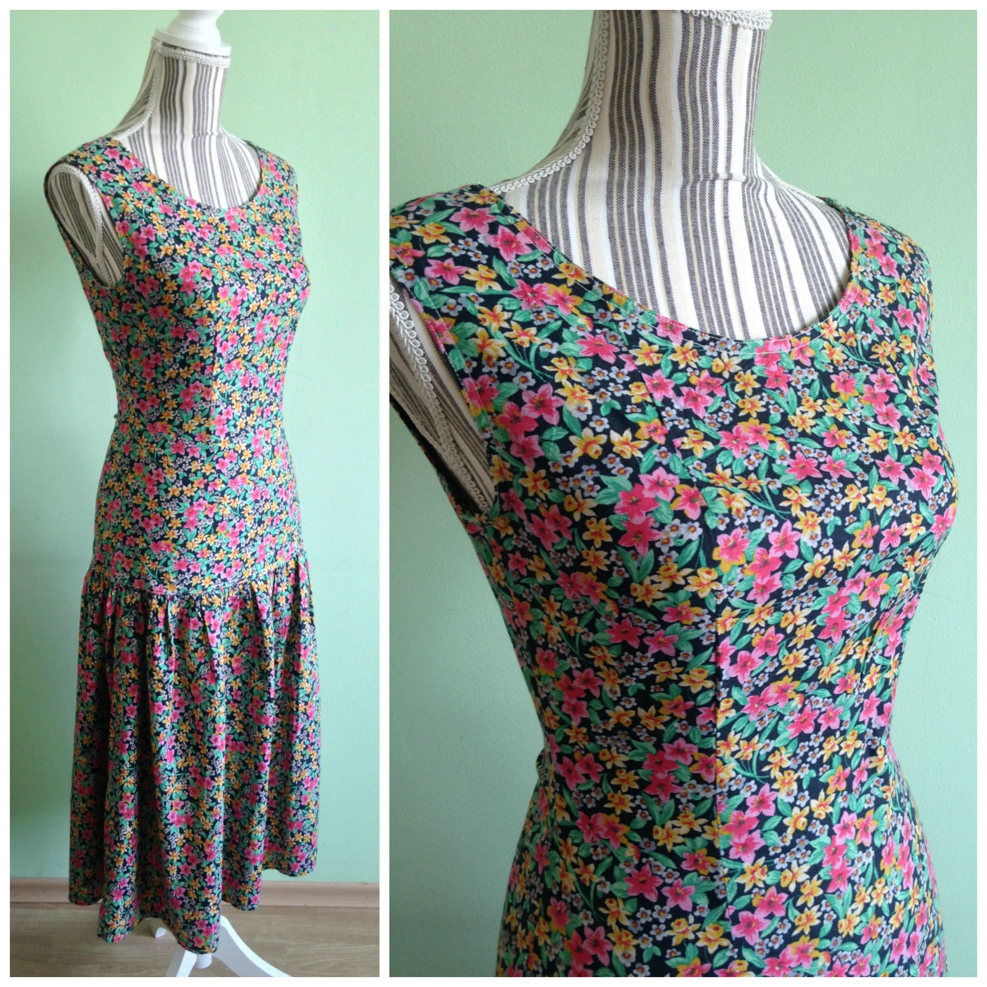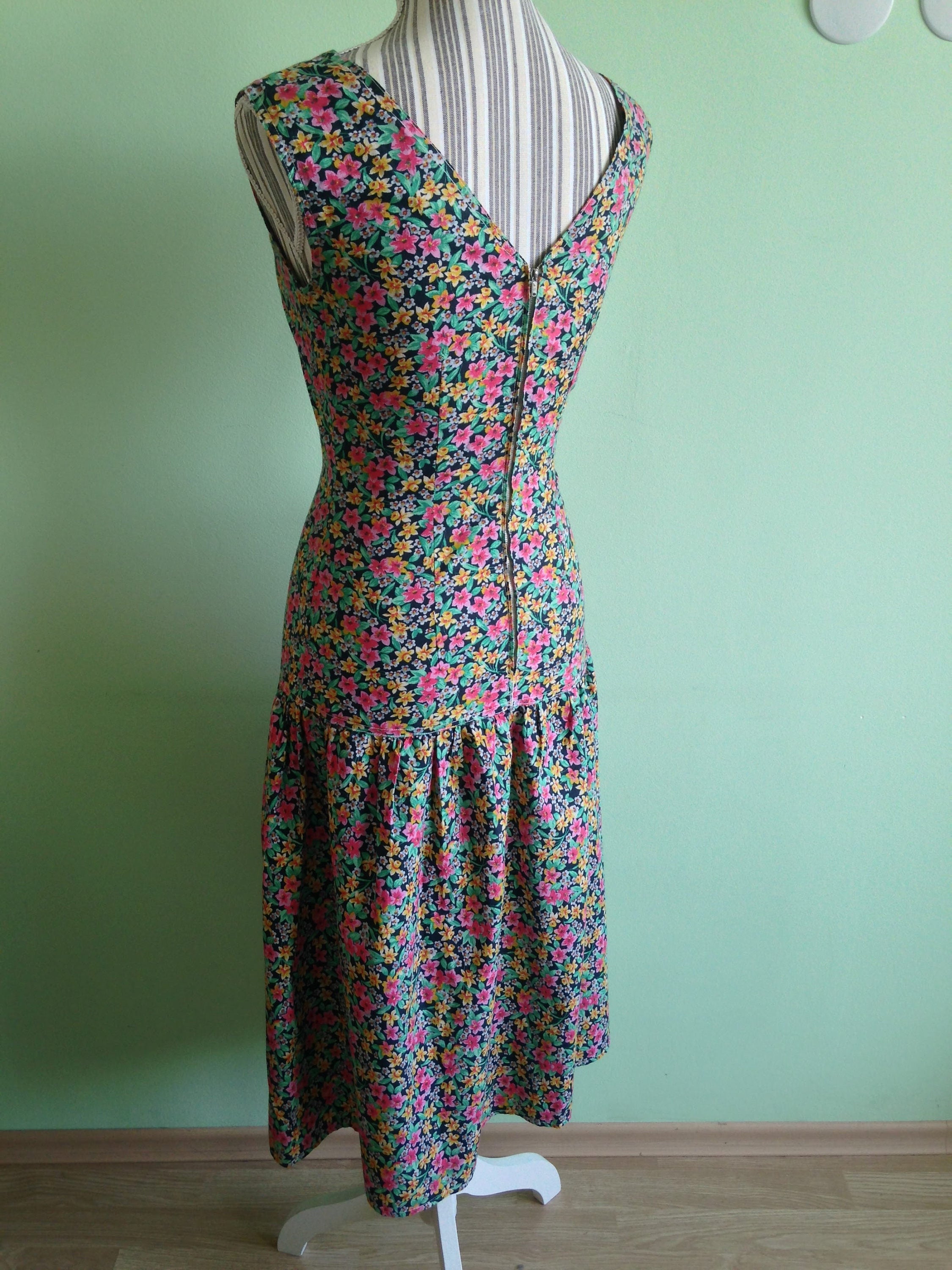 This is a wonderful floral midi dress with drop waist and loose fit style. This cute sleeveless dress has an open v back which opens with a brass zipper. This 70s dress is made of cotton fabric with adorable flowers sprinkled all over it in bright colors - pink, green, yellow and red in black base. This sleeveless dress will make the perfect summer tea dress for any occasion. It has no lining and it is ideal for the hot summer days. You will feel like a real sexy pin up housewife while wearing this incredible piece of vintage clothing.