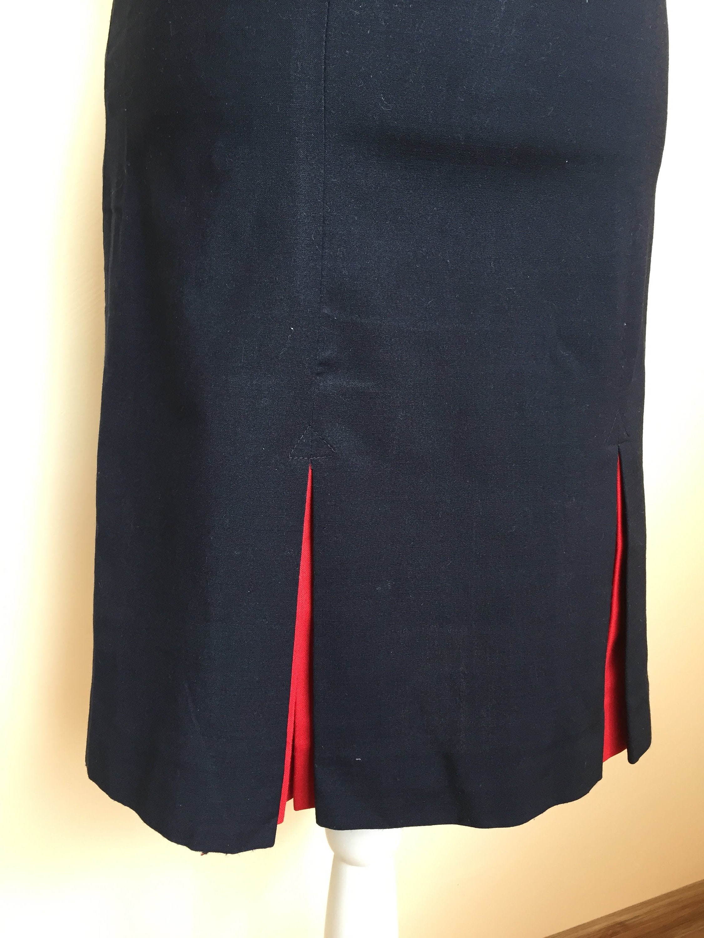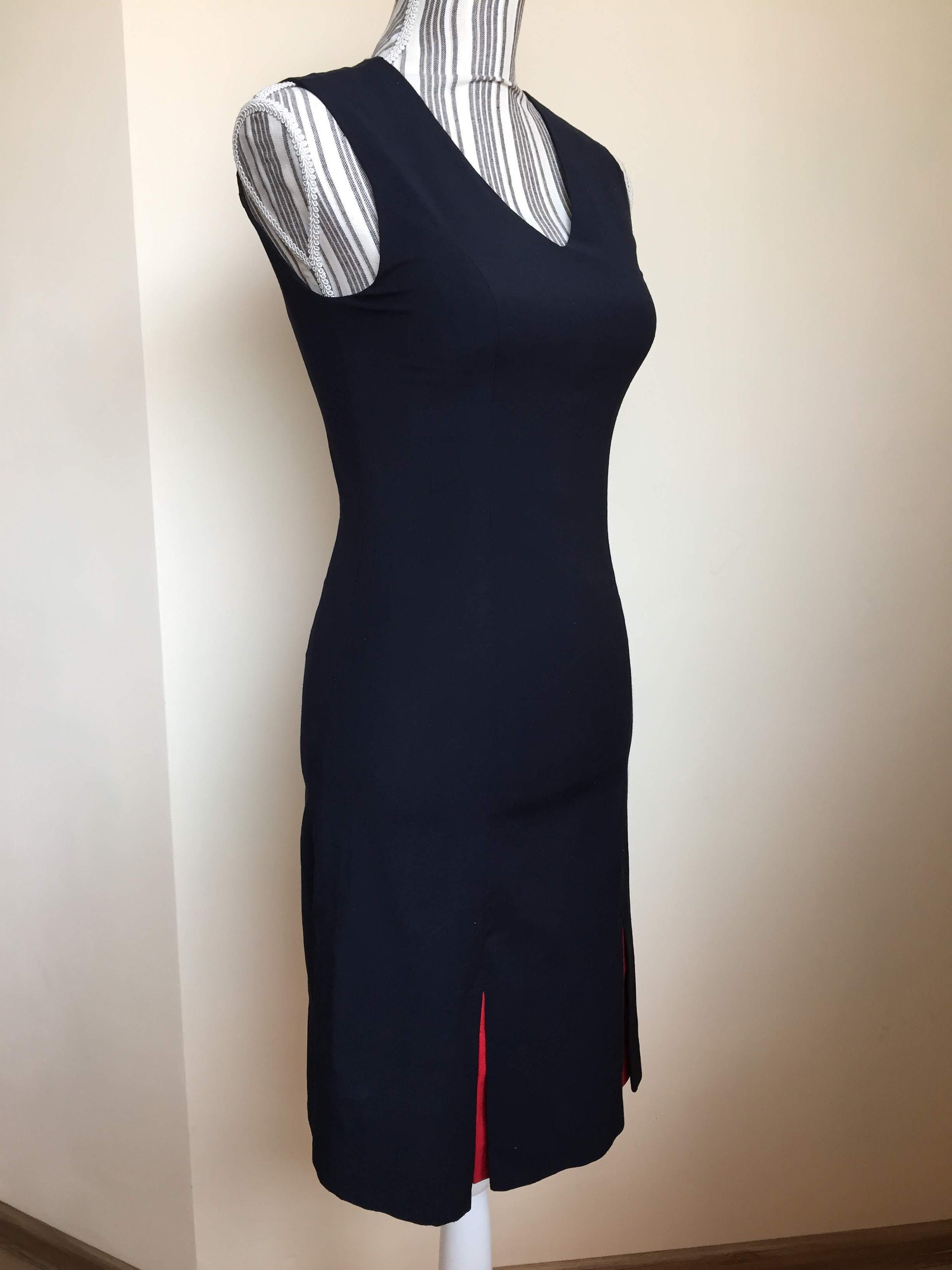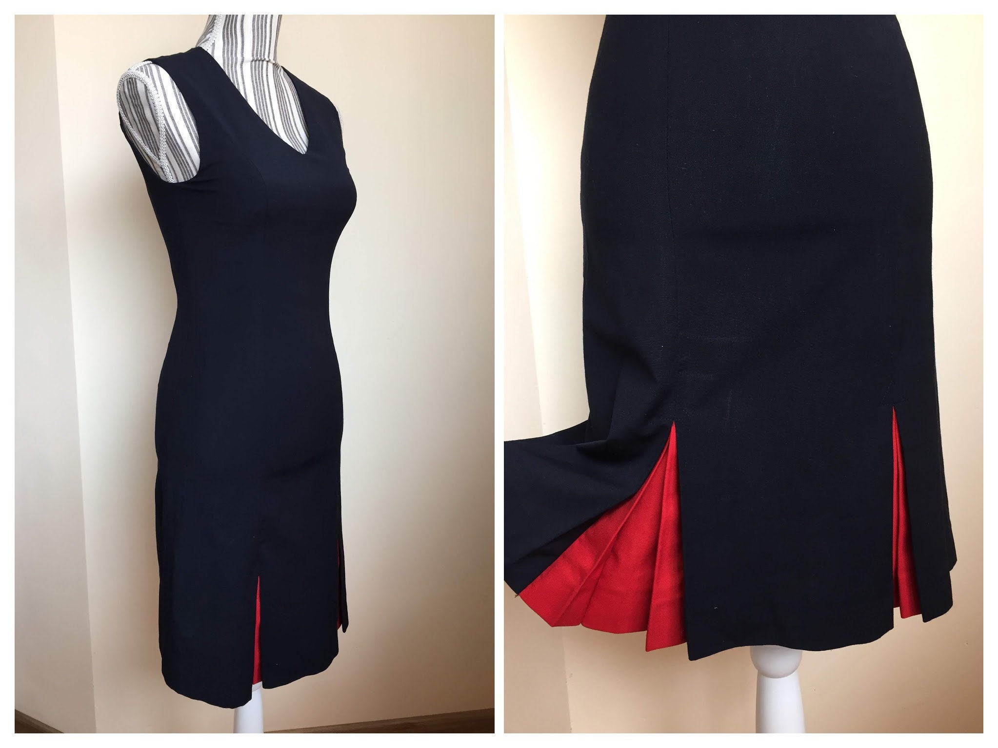 Adorable minimalist sexy bodycon dress in navy blue color with red front slit detailing and zipper at the back. This pretty 80s midi dress has a v neck and tulip skirt. This cute simple dress is perfect for the office or any party or special event. This little dress was designed by the Greek designer Makis Tselios. It will embrace your body showing off all your curves. It is made of cotton fabric and has polyester lining. There is a bit of stretch to the fabric. The size marked on the label is 40, however it fits like XS or S, it would fit well if you wear size US 4 or 6, but do check the measurements below.