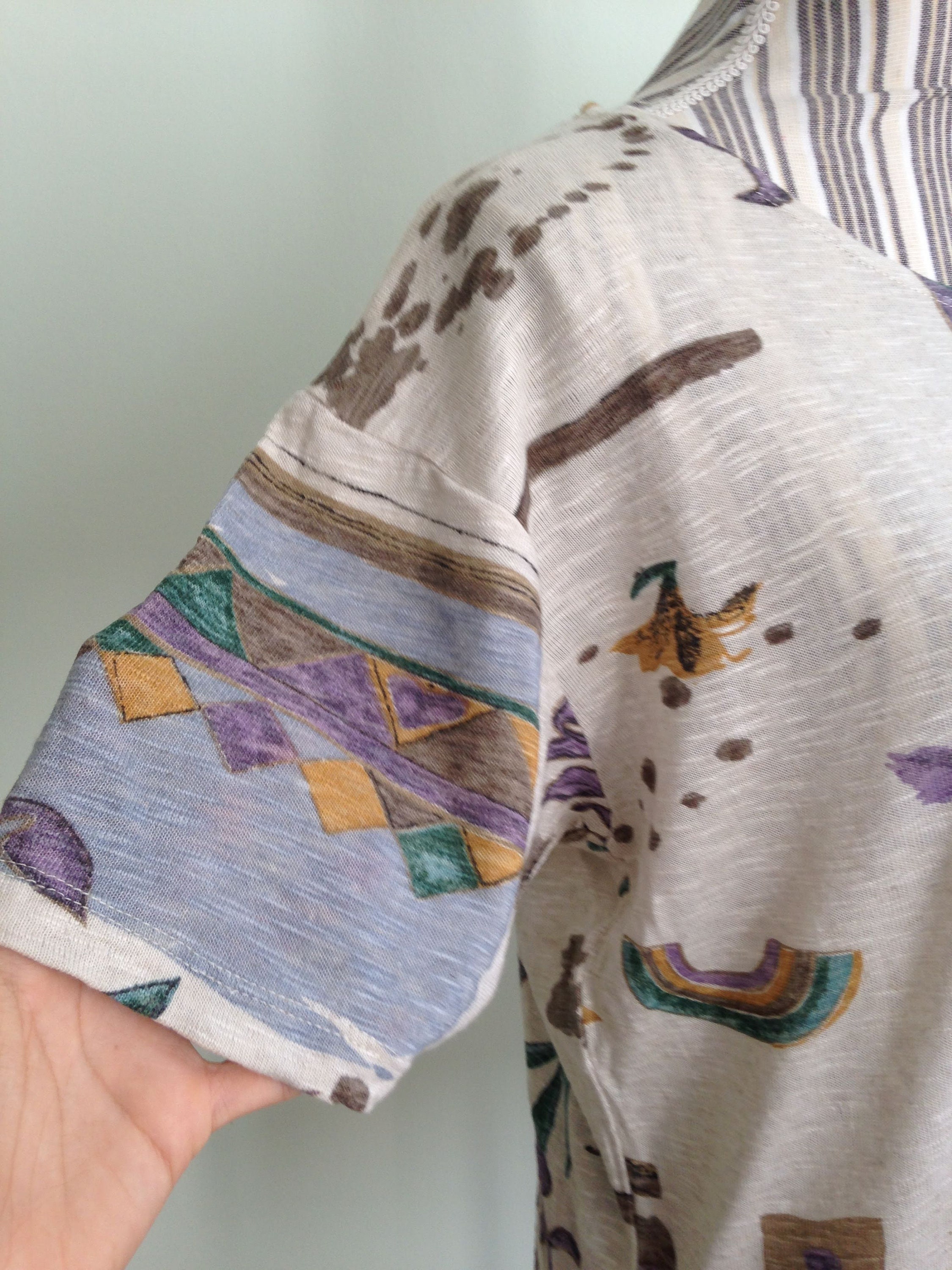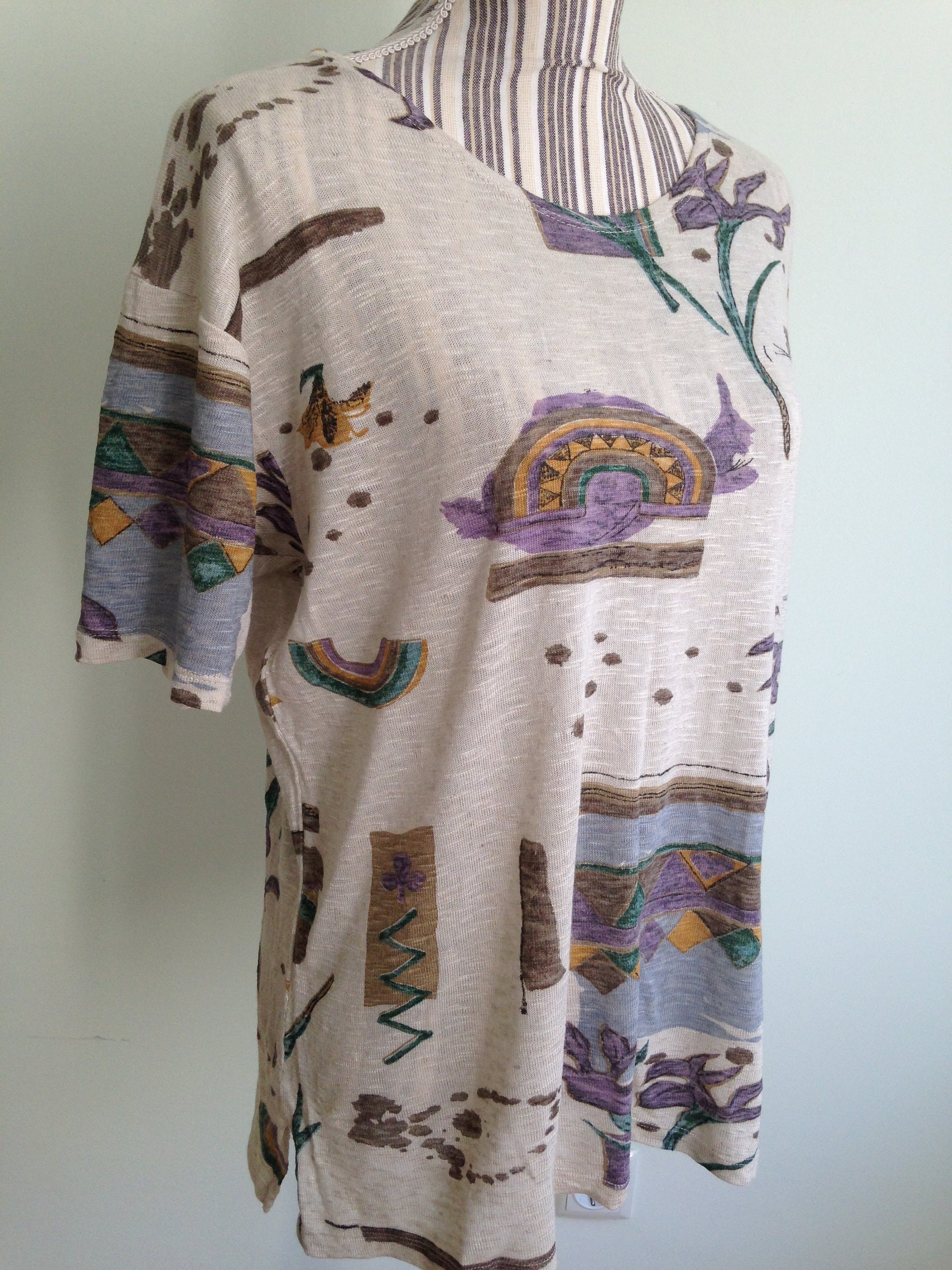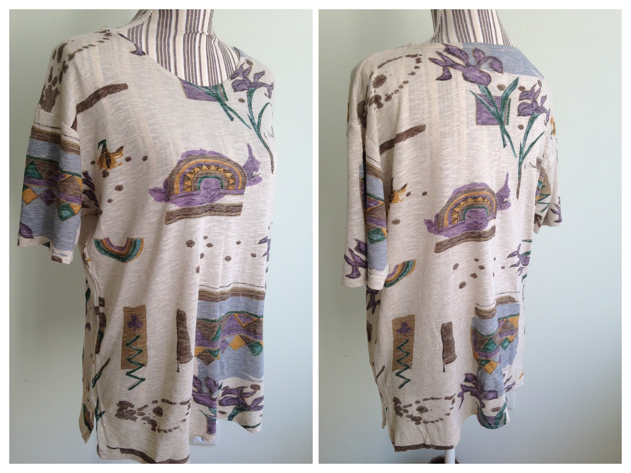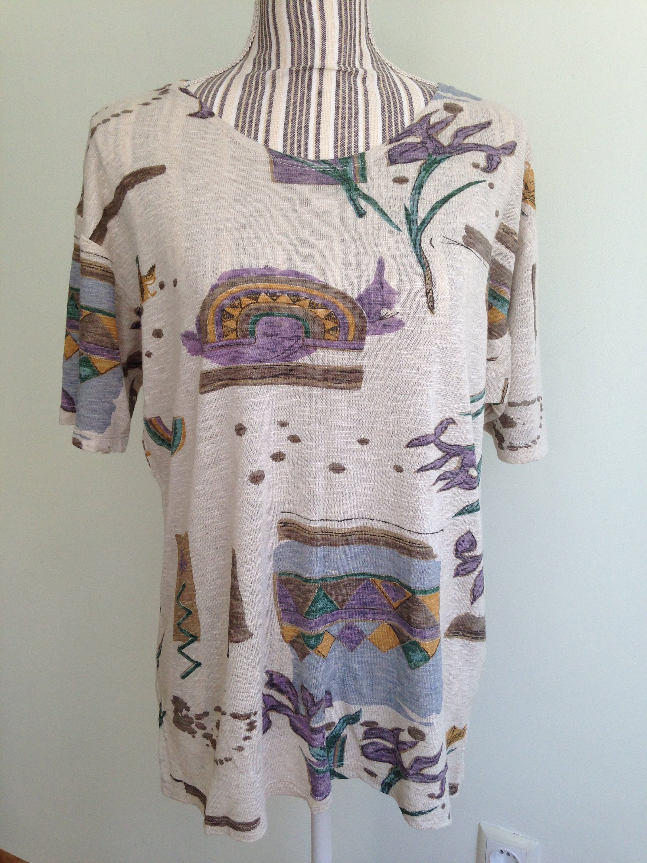 This is cute aztec print women t-shirt which is semi see-through. It is perfect for the summer. This baggy graphic tee is made of 70% viscose and 30% linen. The fabric has the texture of a linen tee and you can almost see through it. The beautiful tribal print is a mixture of mustard, brown, blue and green colors over beige base. This vintage graphic tee is perfect to pair with jeans or nice leather or denim skirt. It will look cool with block heel sandals or suede boots. It is size large.