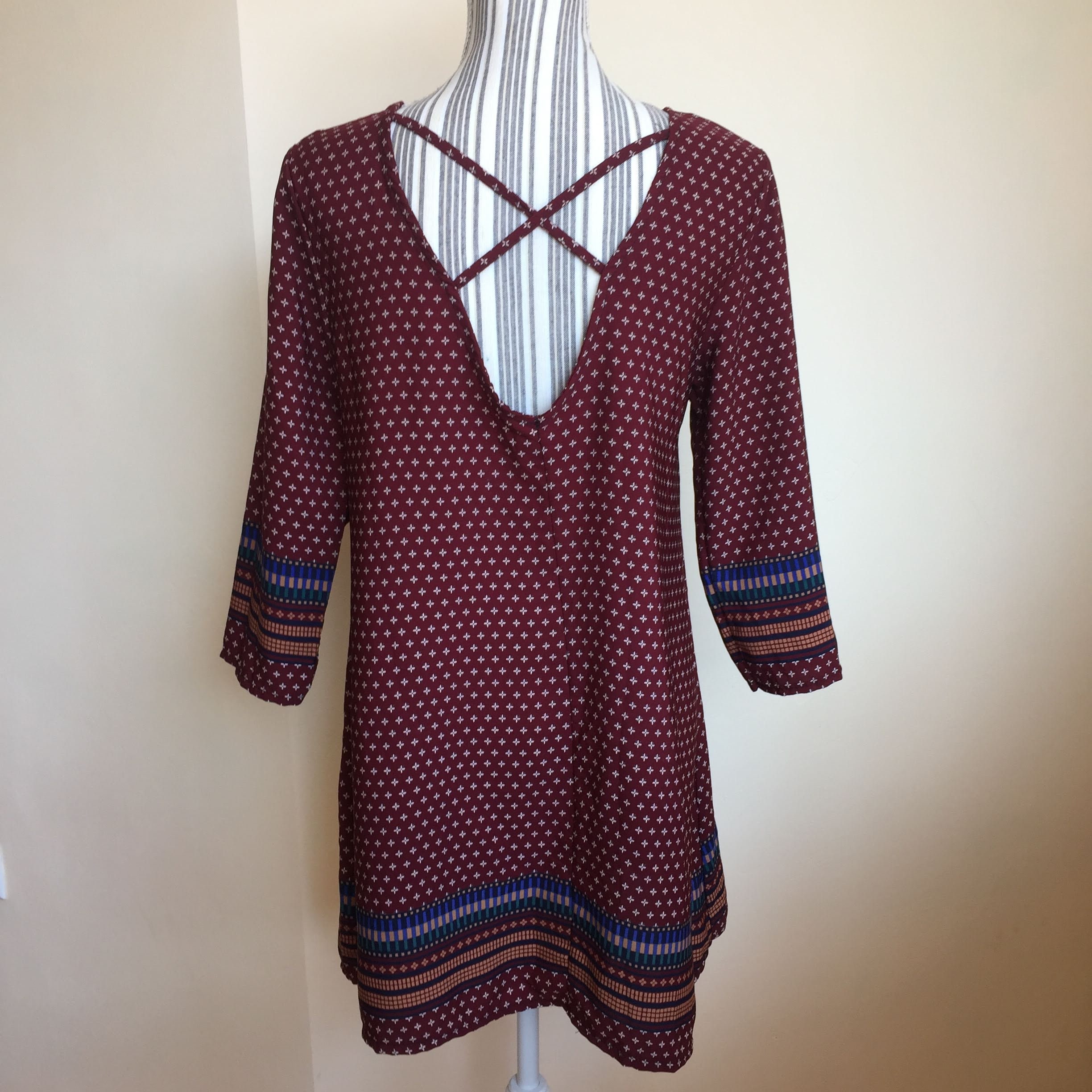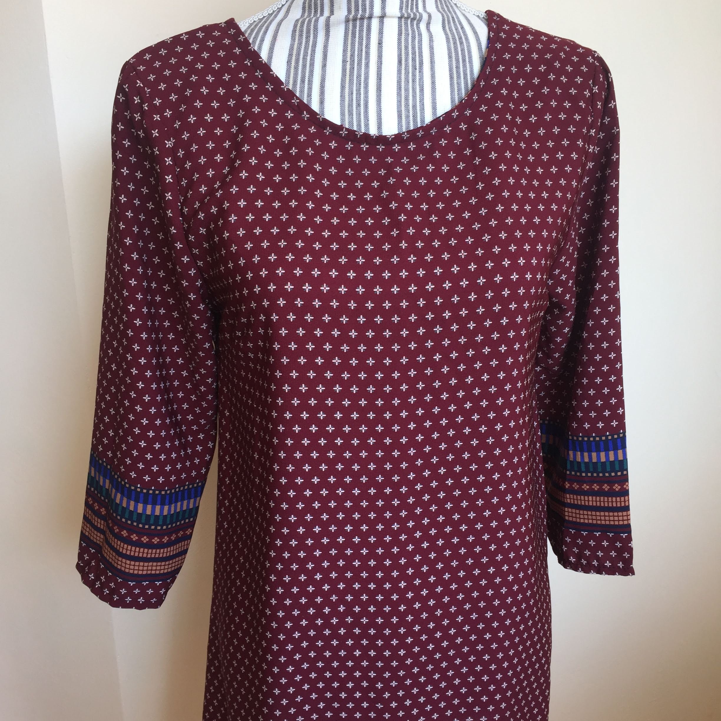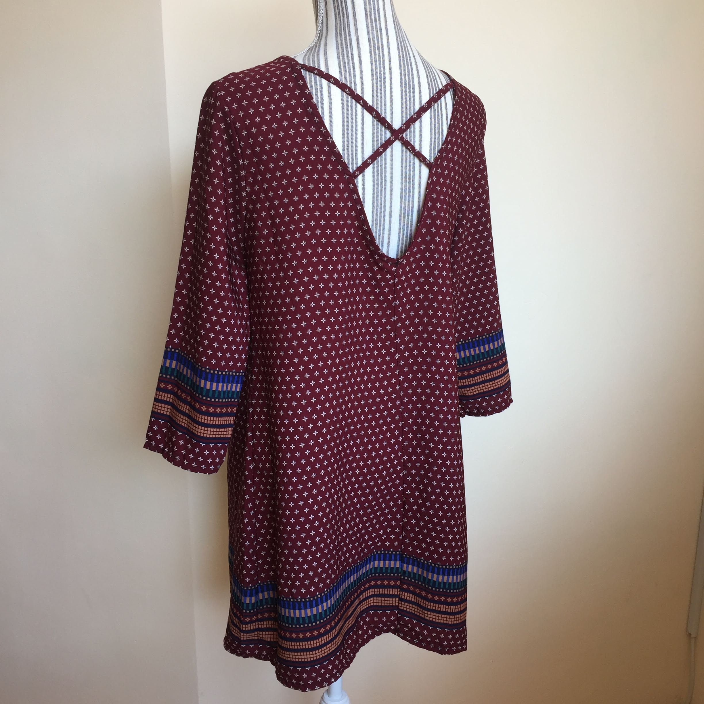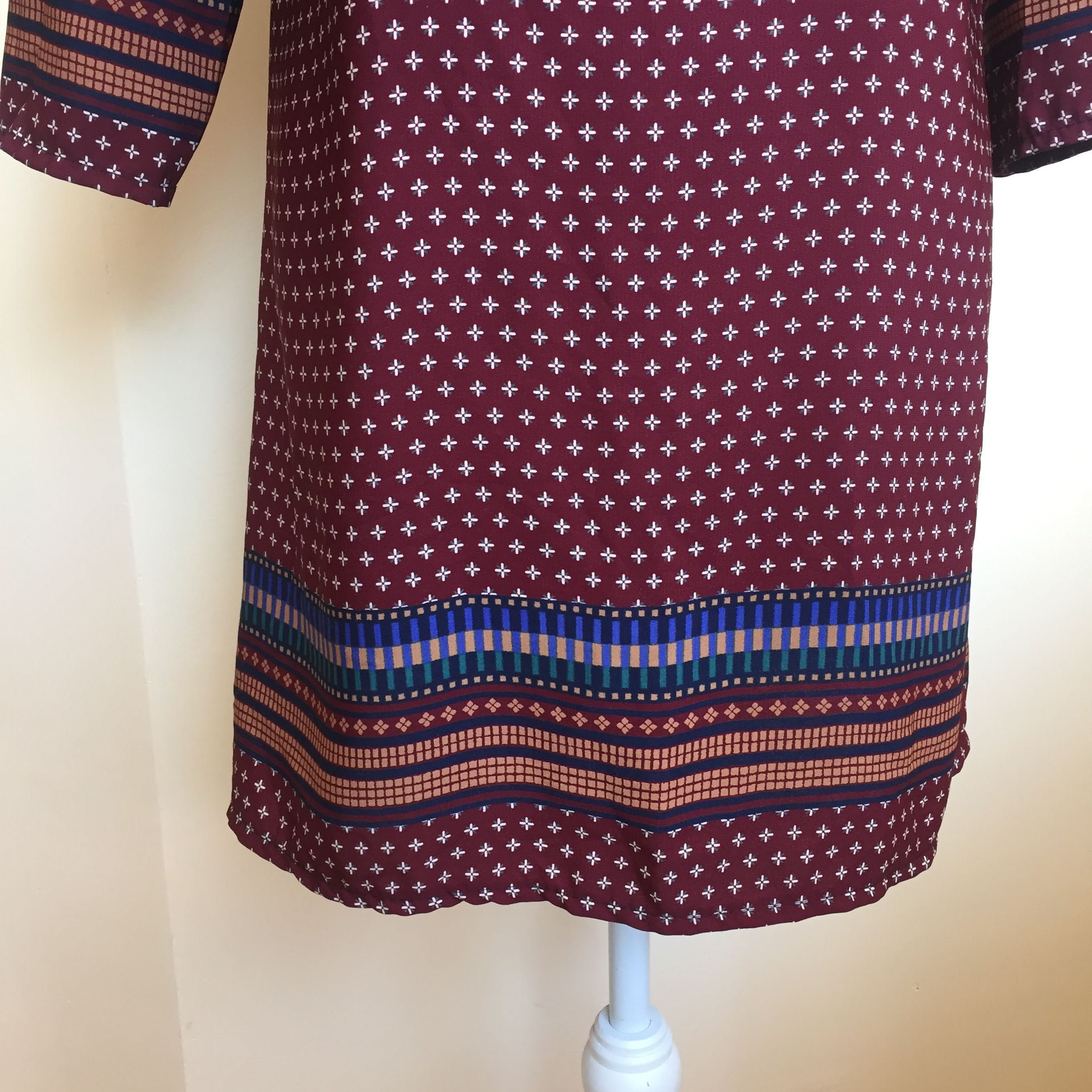 This is a beautiful vintage 90s tunic dress with lovely geometric print on oxblood base. This pretty a line tunic has three quarter length loose sleeves. It has a scooped neck and open back with criss cross straps. This free dress is made of polyester fabric, very light and flowy, making it perfect for the spring/ summer season. This vintage dress is size small and it falls right above the knees. It was made in Italy.
