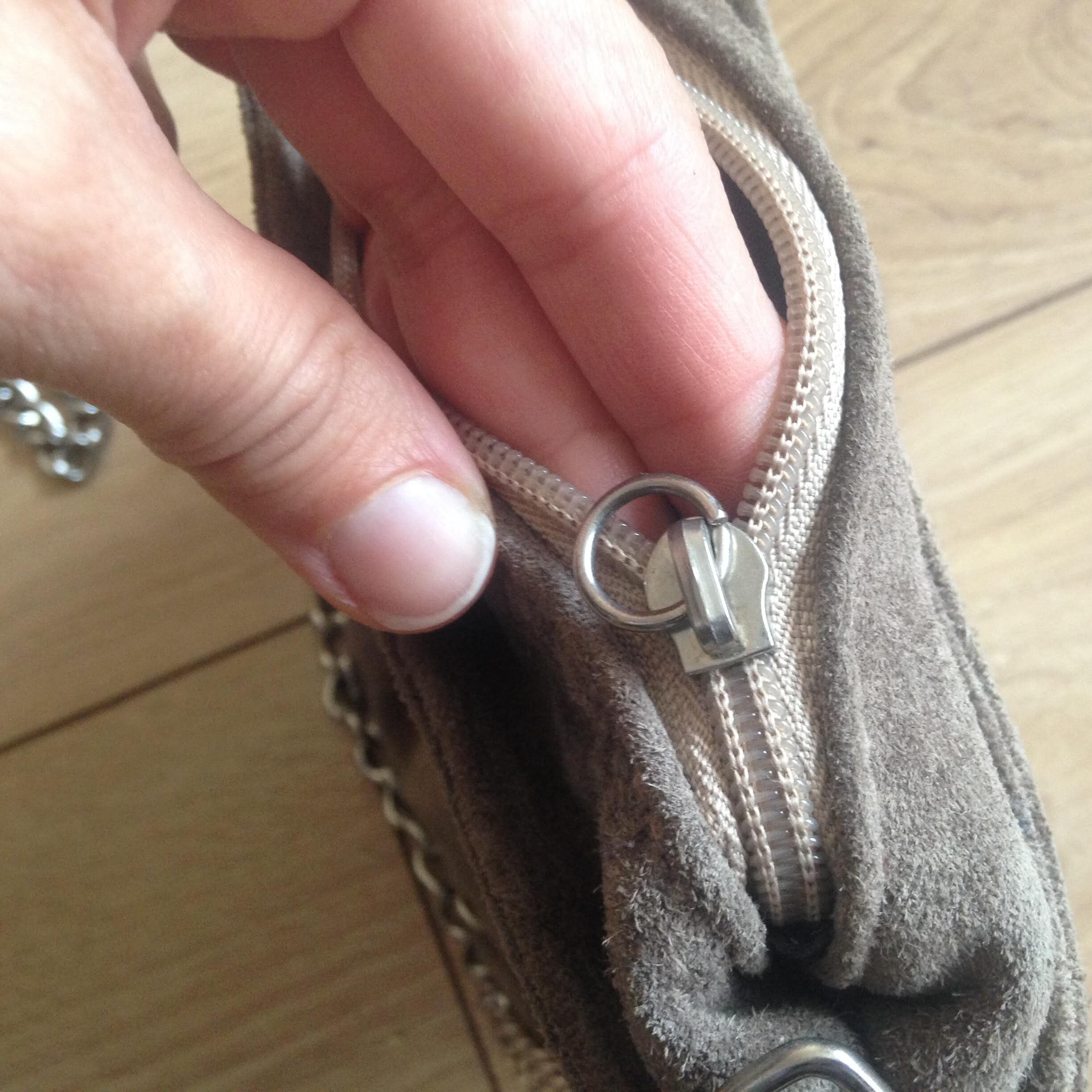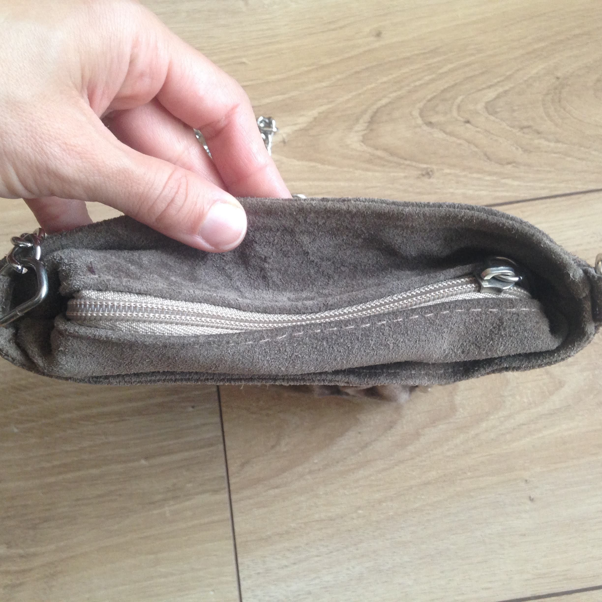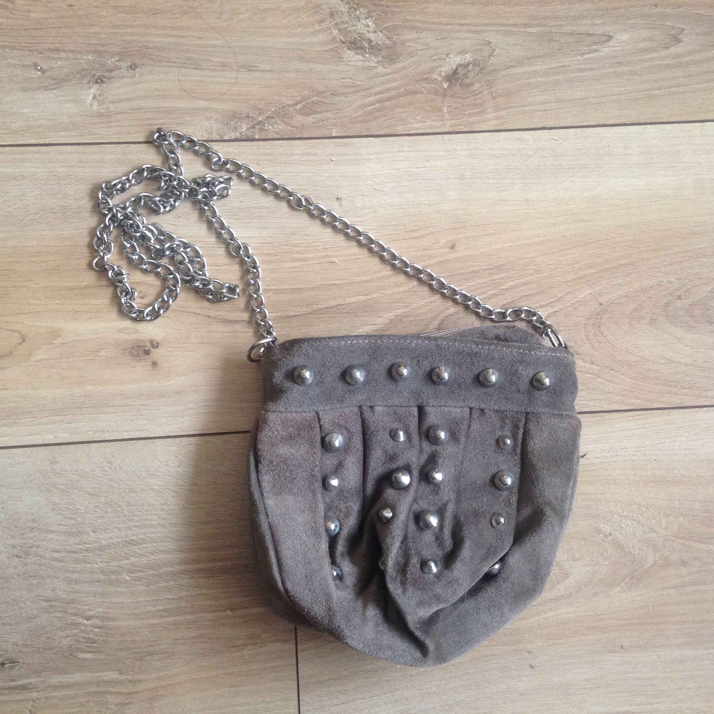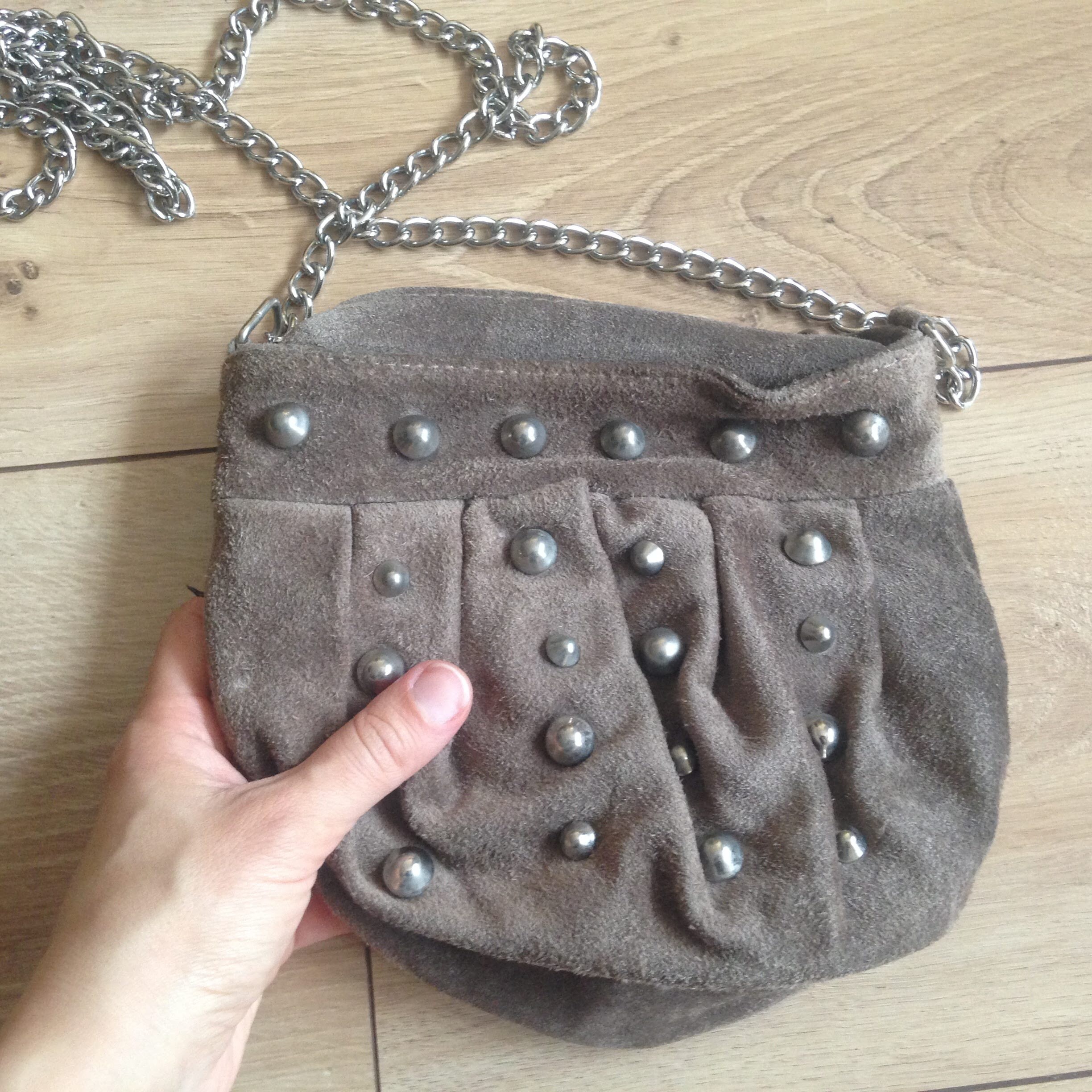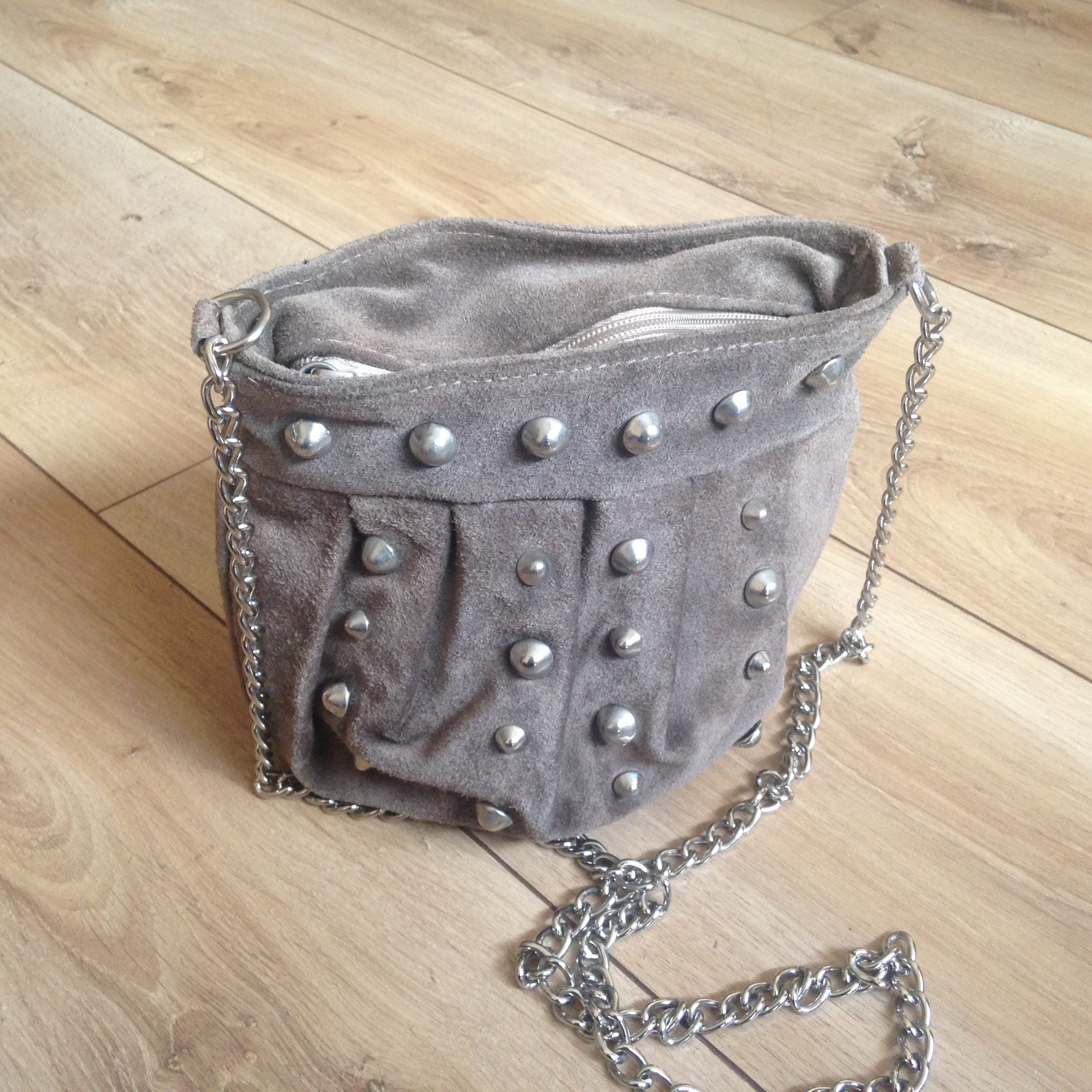 This is a small studded crossbody purse with chain strap. This genuine leather purse is made of grey suede leather and silver tone studs. It has a top zip closure. There is one compartment. The interior is lined in black polyester fabric.
