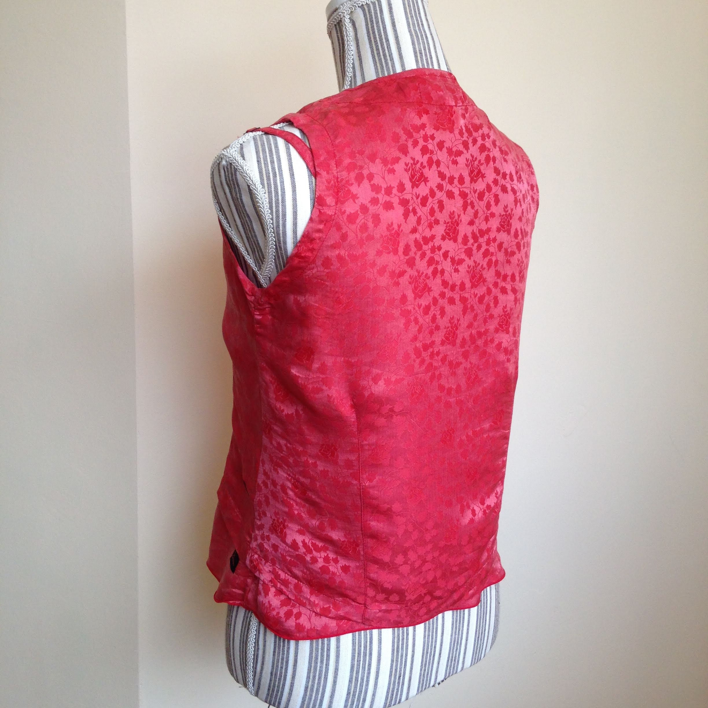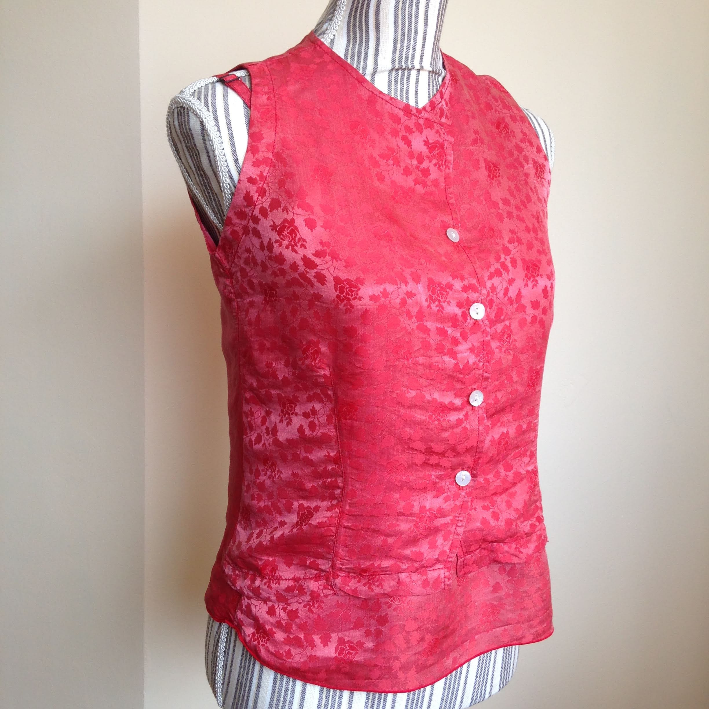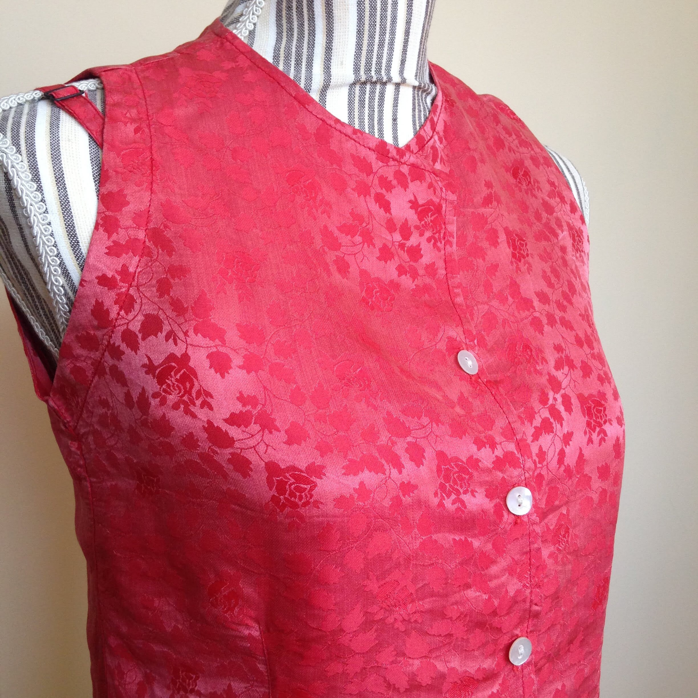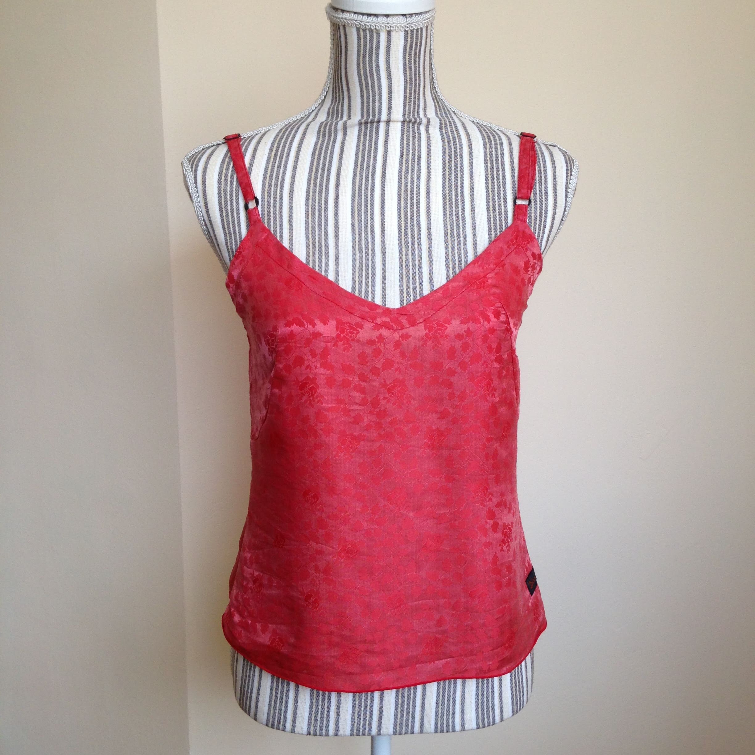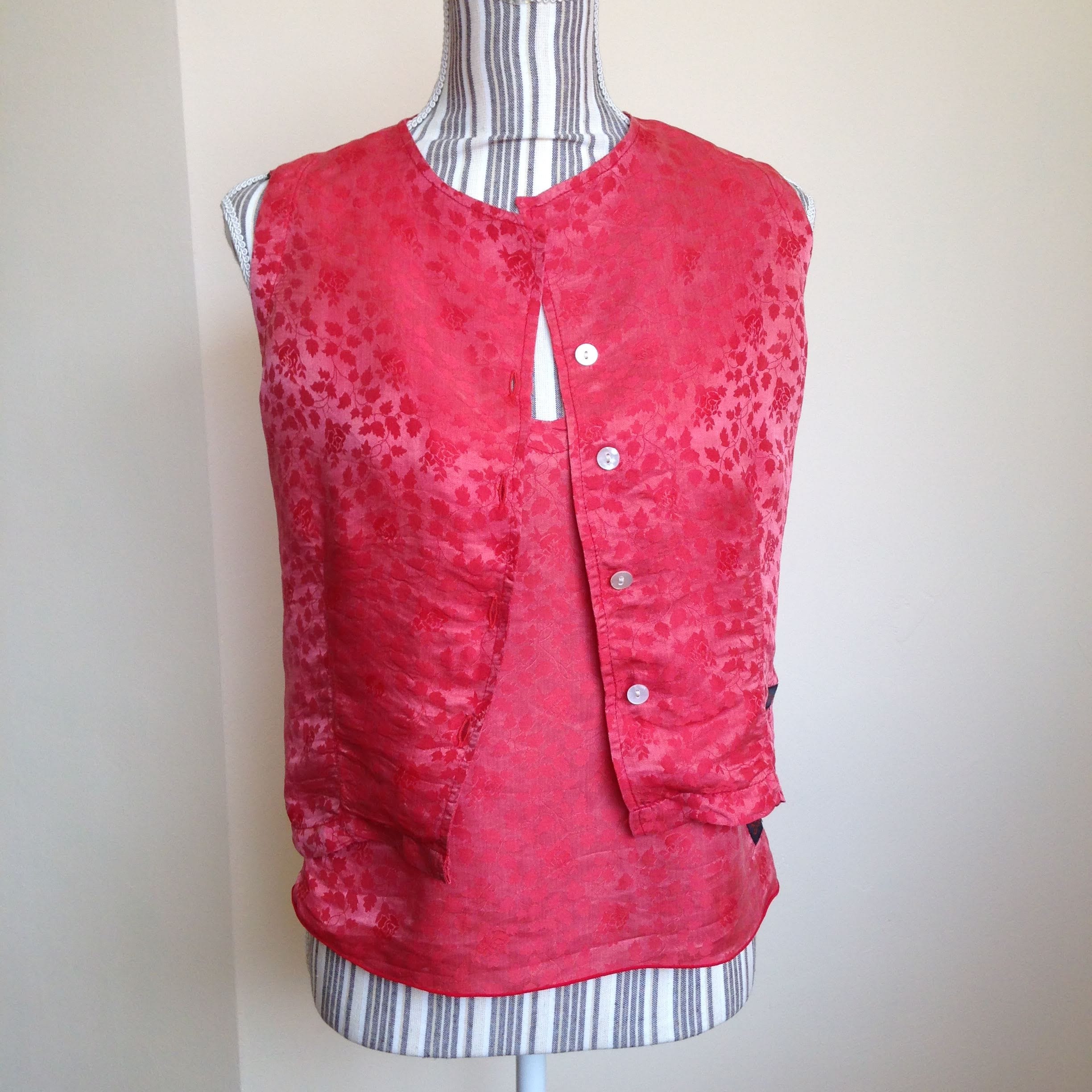 This is a vintage 80s two piece set which includes slim strap top with adjustable straps and a button up vest made of light silk and viscose fabric in salmon color. The set is by the brand Diva and is size small. It is made of 30% silk and 70% viscose.