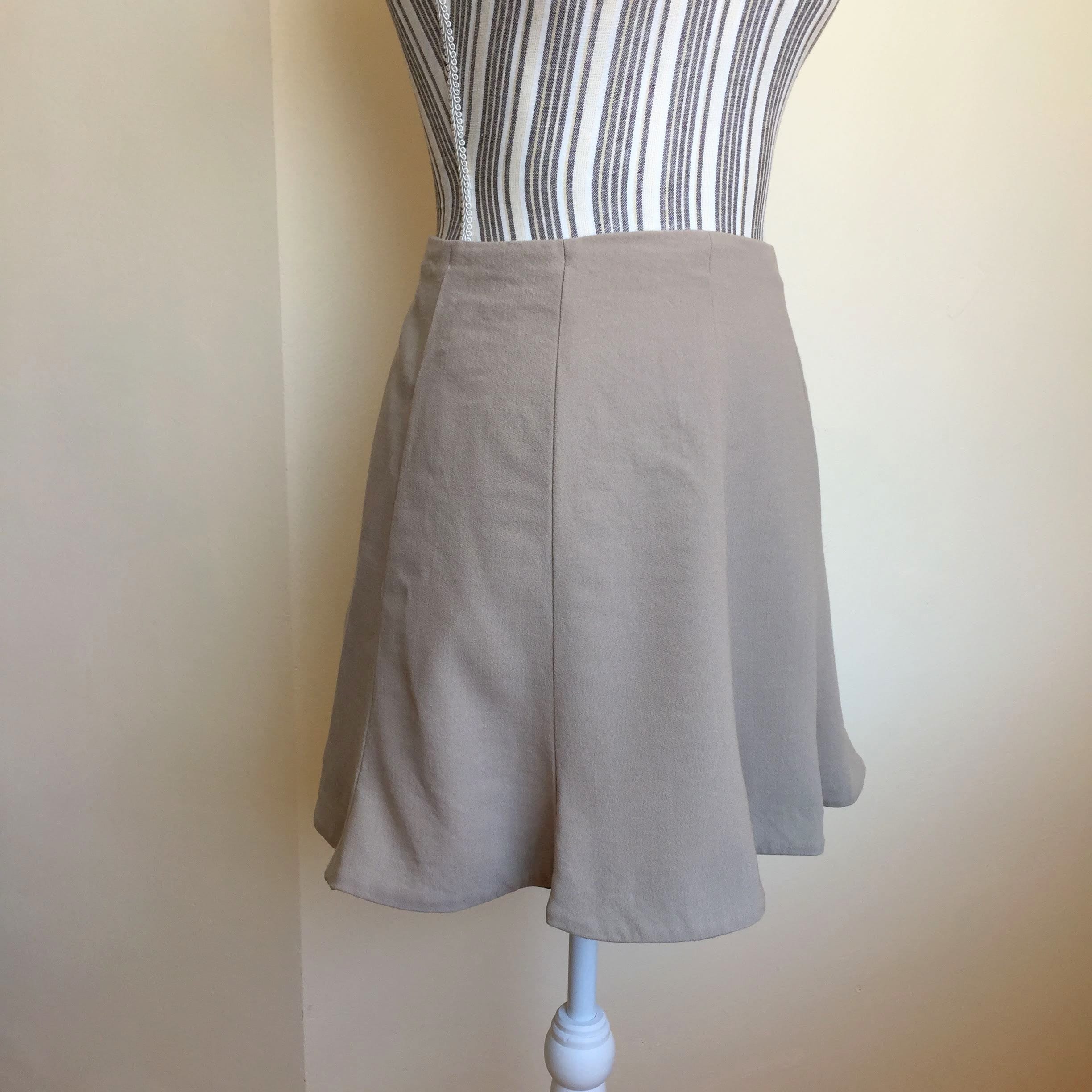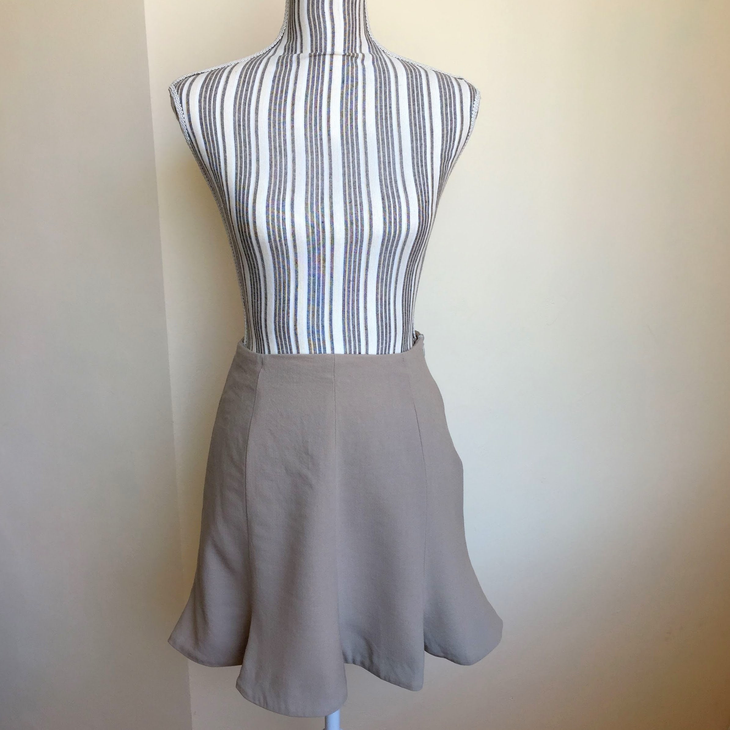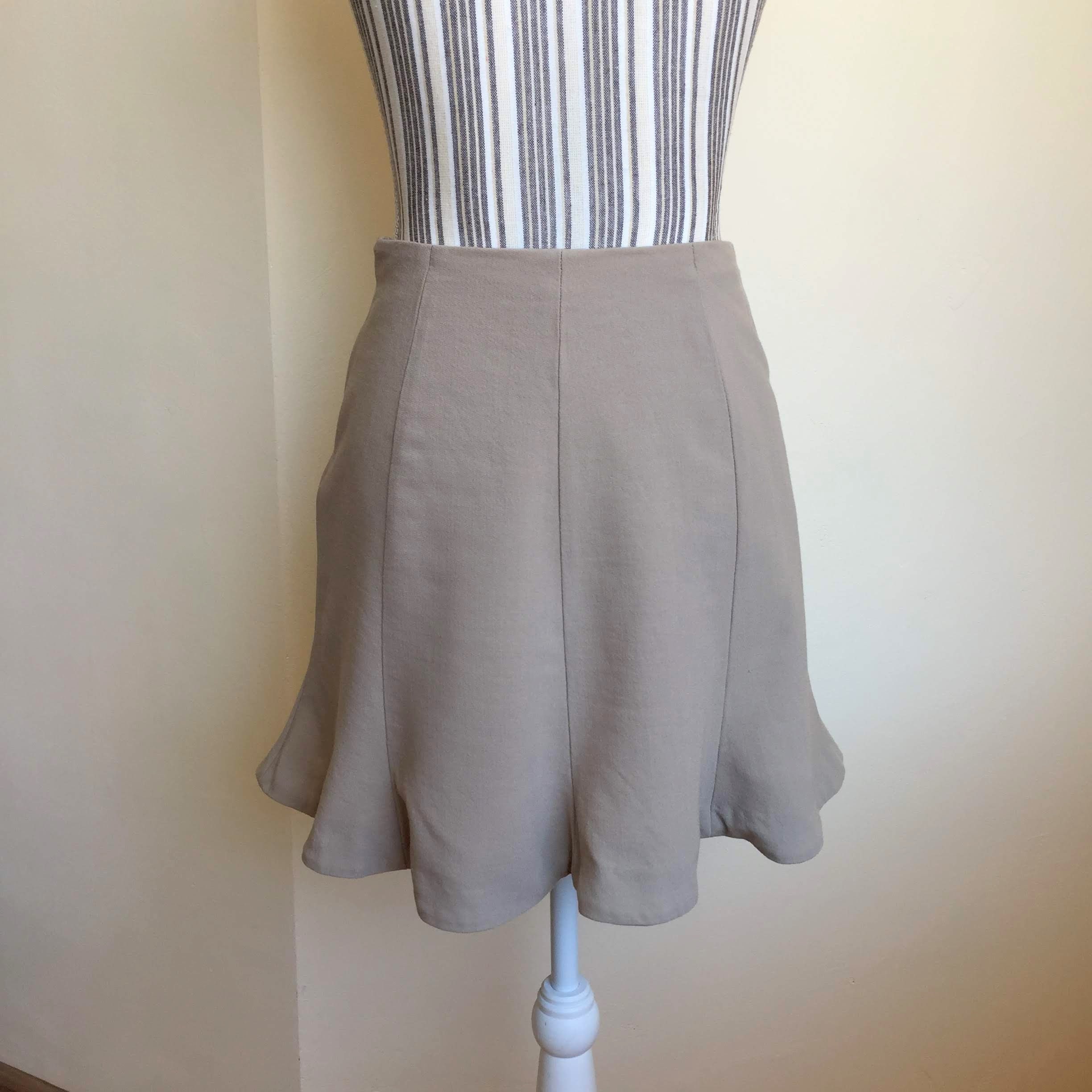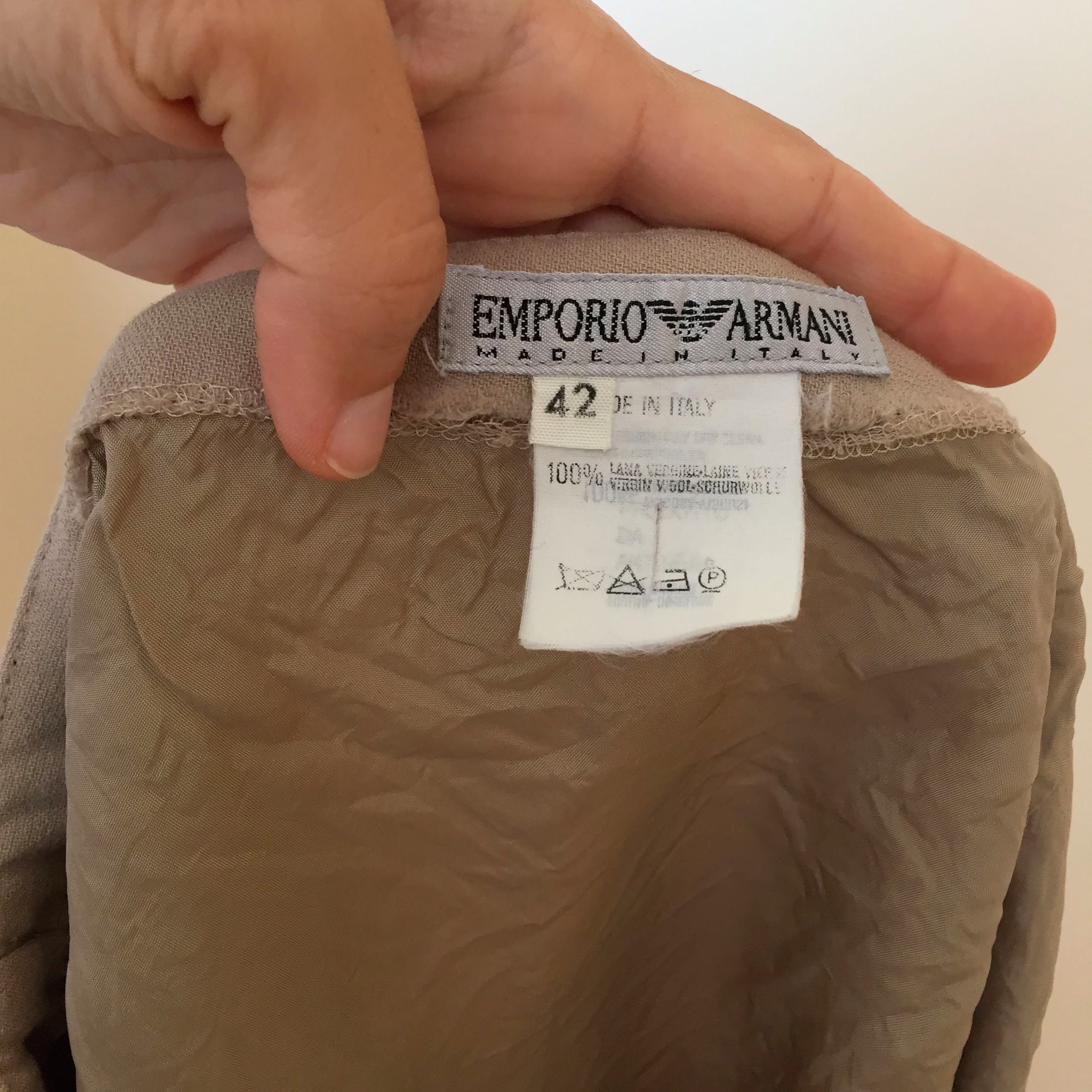 This is a short tulip skirt made of thin wool fabric with fit and flare silhouette. This mini trumpet skirt is by the brand Emporio Armani. It was made in Italy. The size marked on the label is 42 which fits like S.