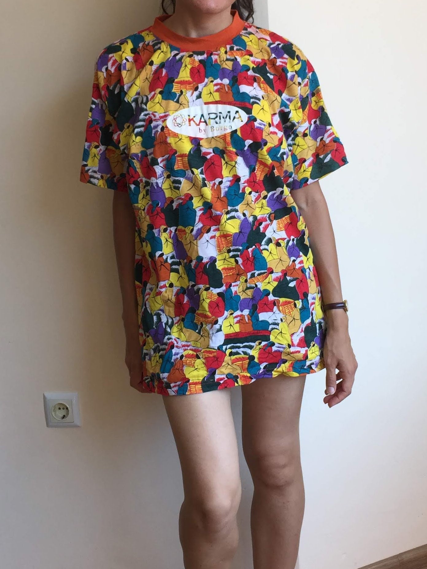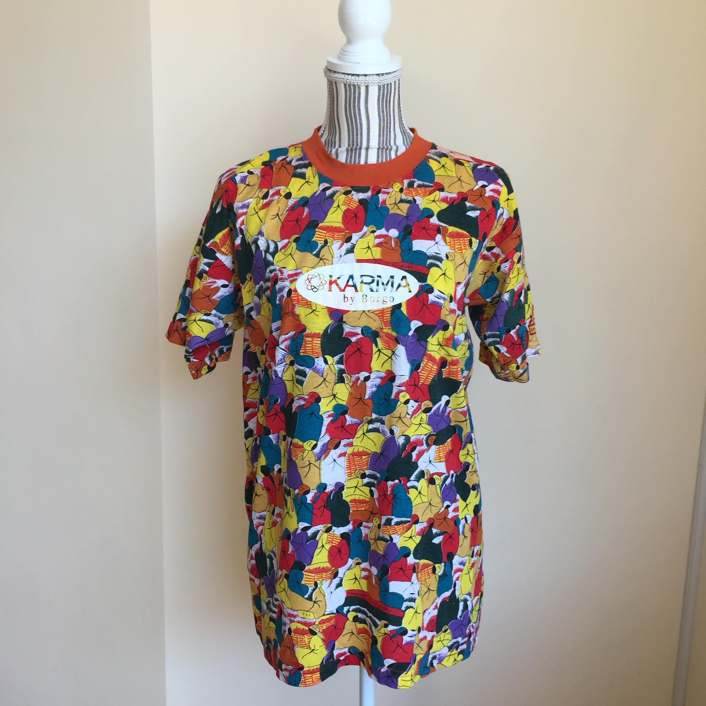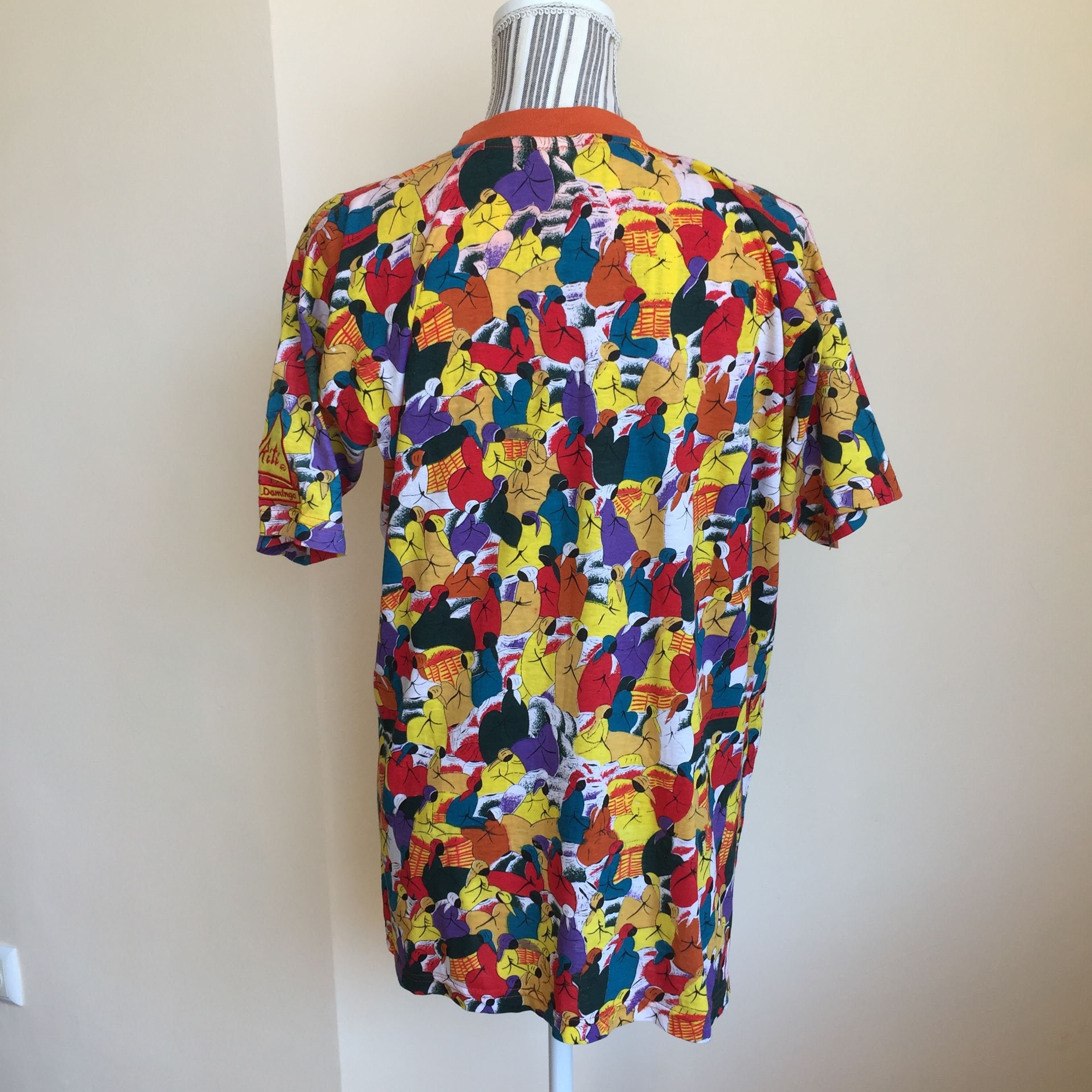 This is a bright colorful vintage 90s unisex t-shirt. It is made of 100% cotton fabric. The size marked on the label is mens M, yet this cool vintage t-shirt is suitable for both men and women. It can be worn as an oversized women's tee as well.
