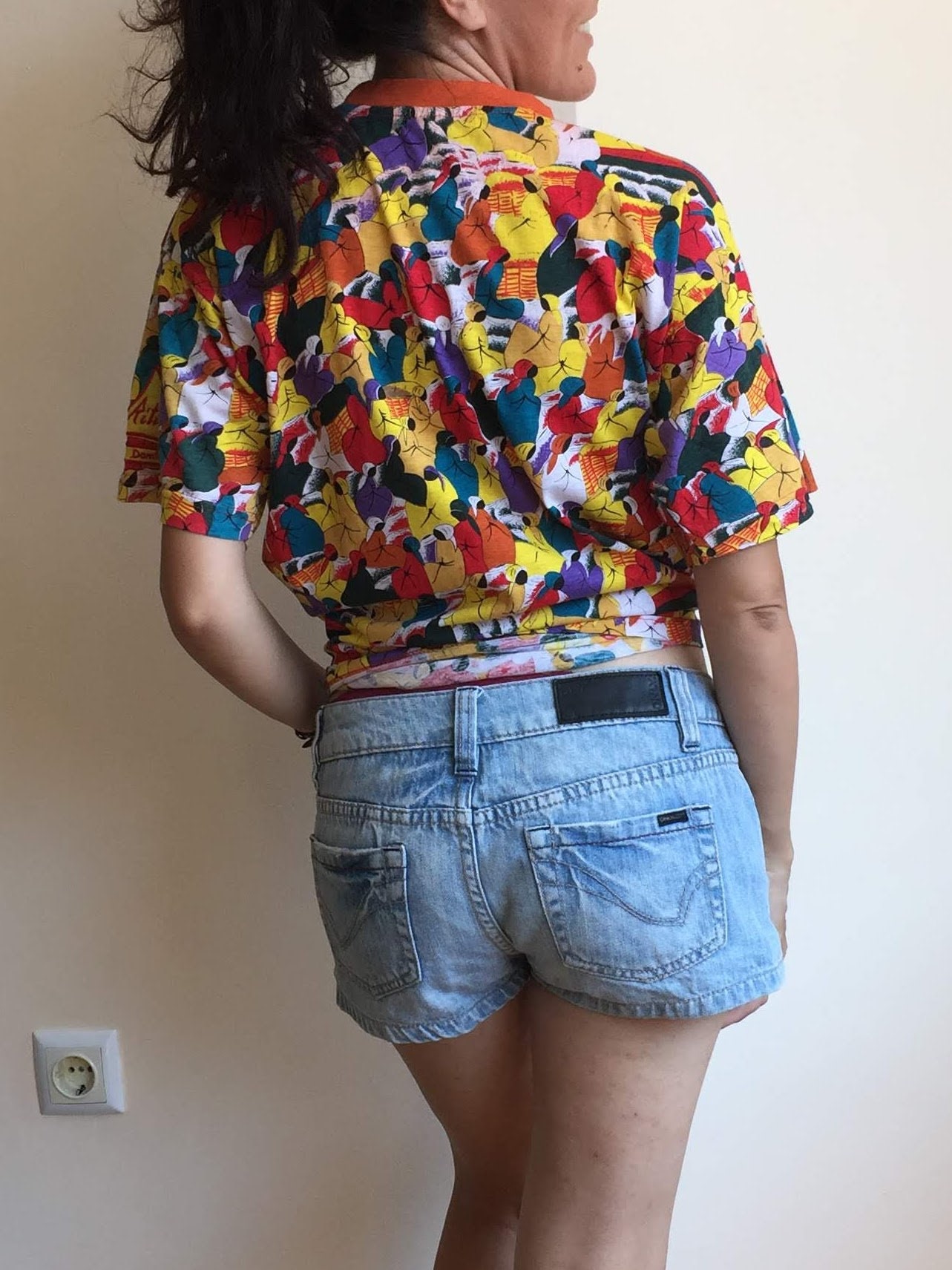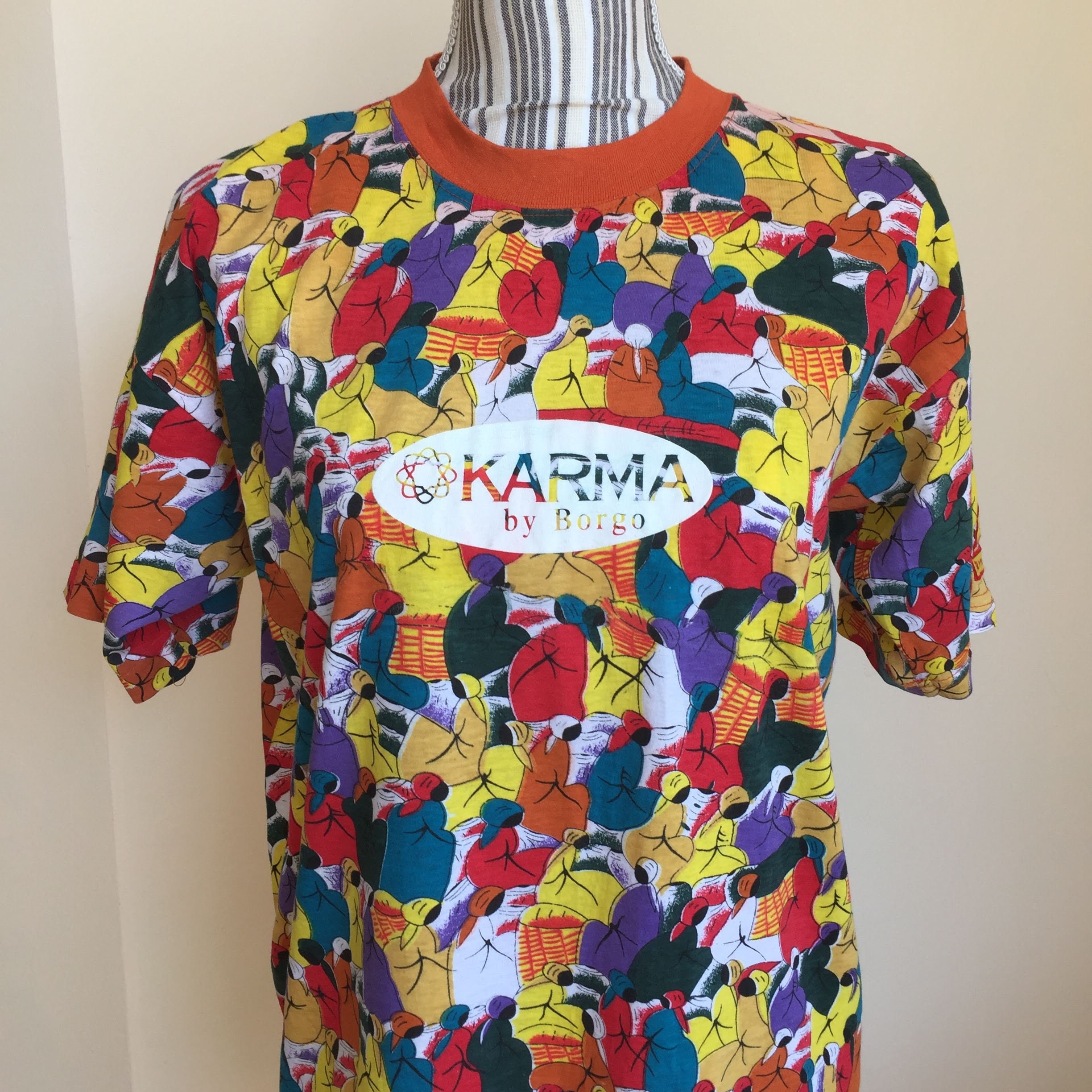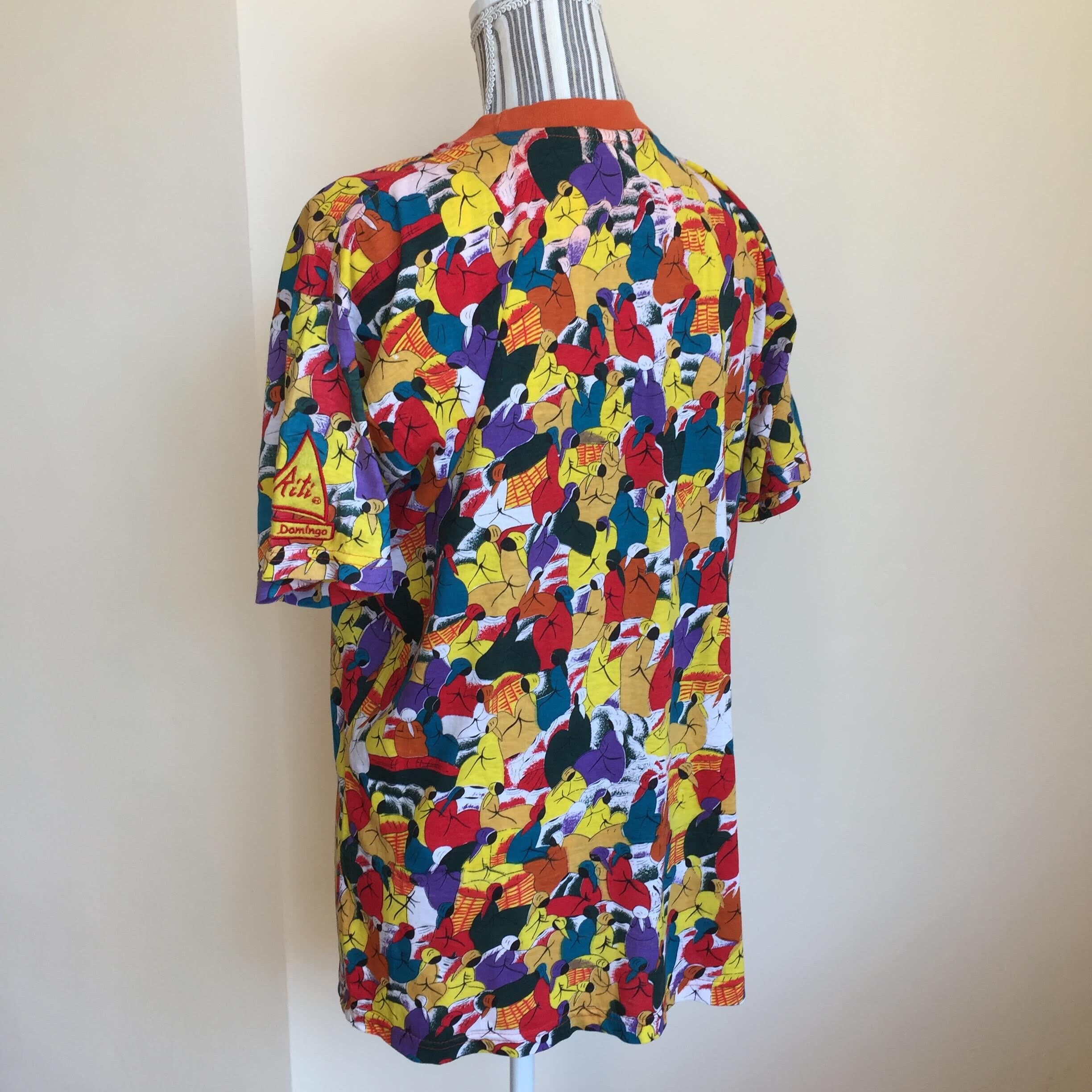 This is a bright colorful vintage 90s unisex t-shirt. It is made of 100% cotton fabric. The size marked on the label is mens M, yet this cool vintage t-shirt is suitable for both men and women. It can be worn as an oversized women's tee as well.